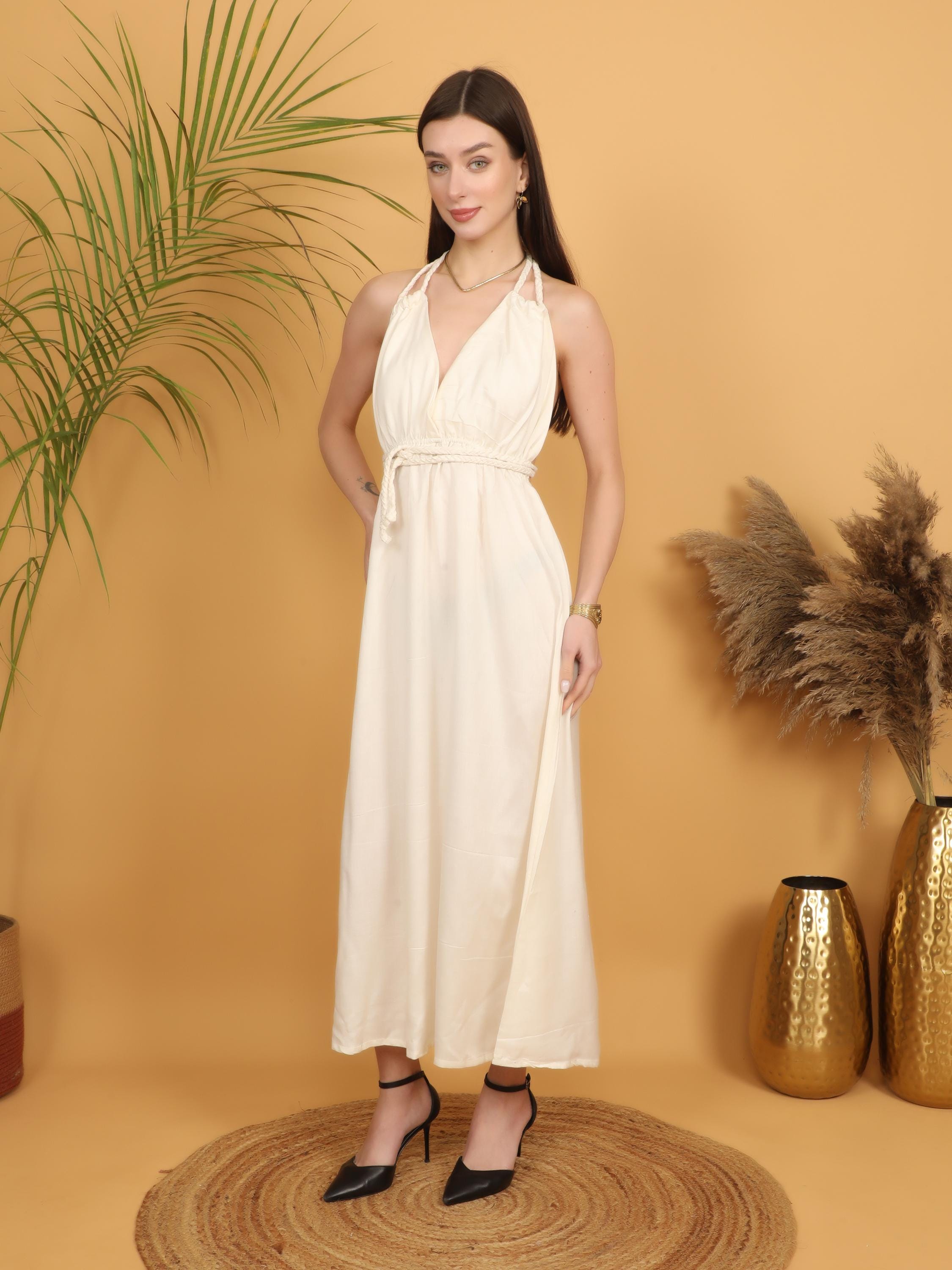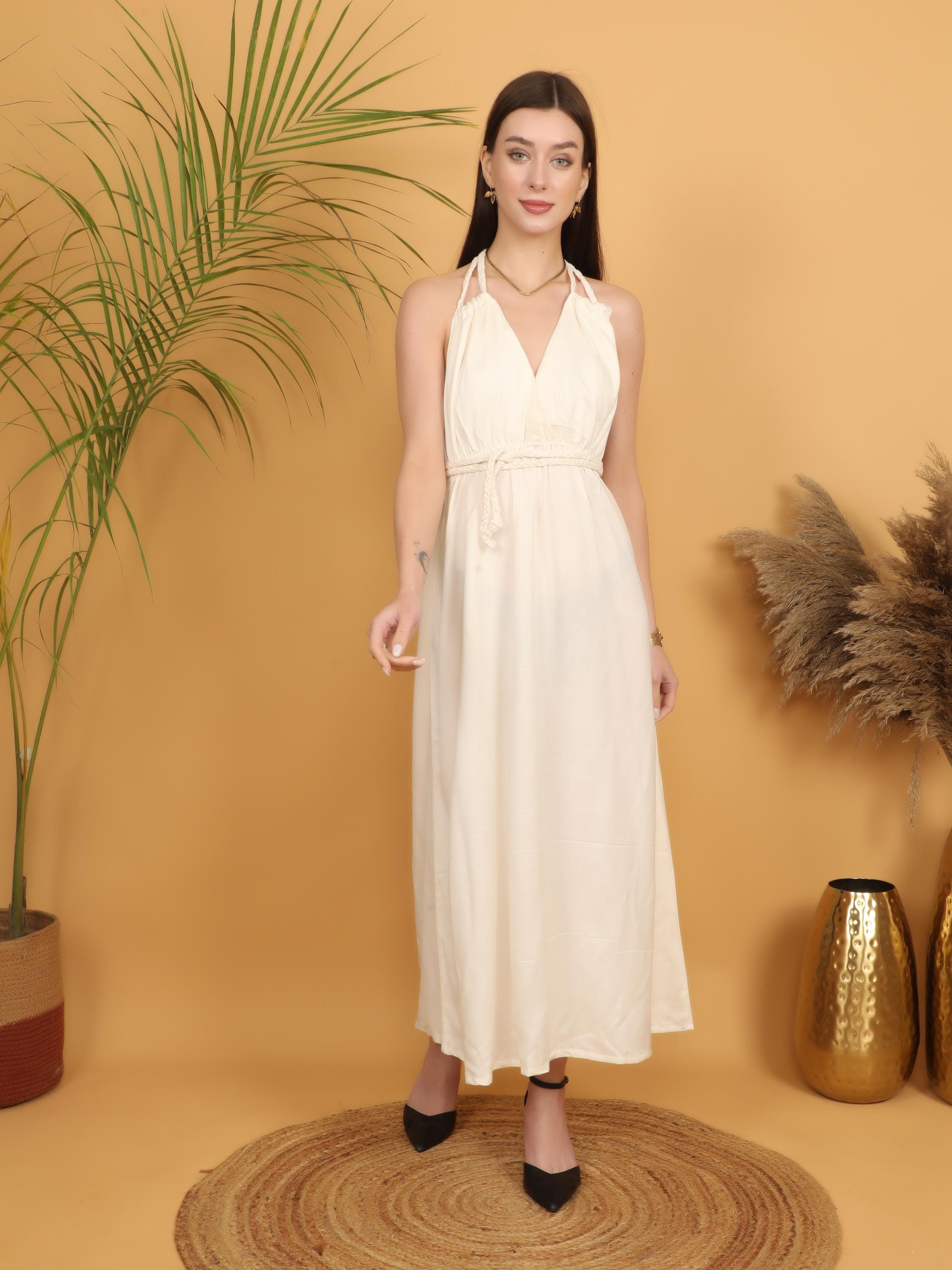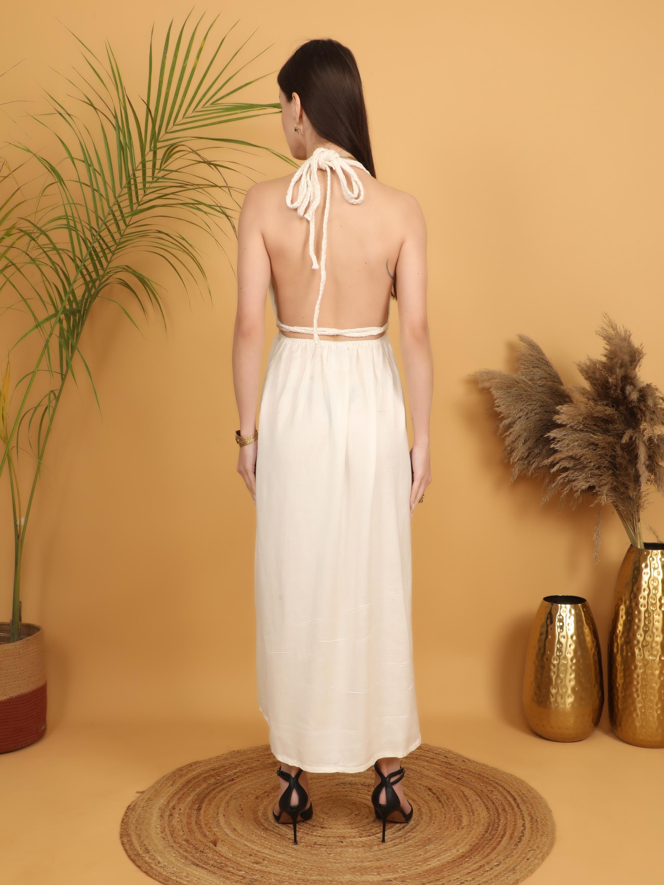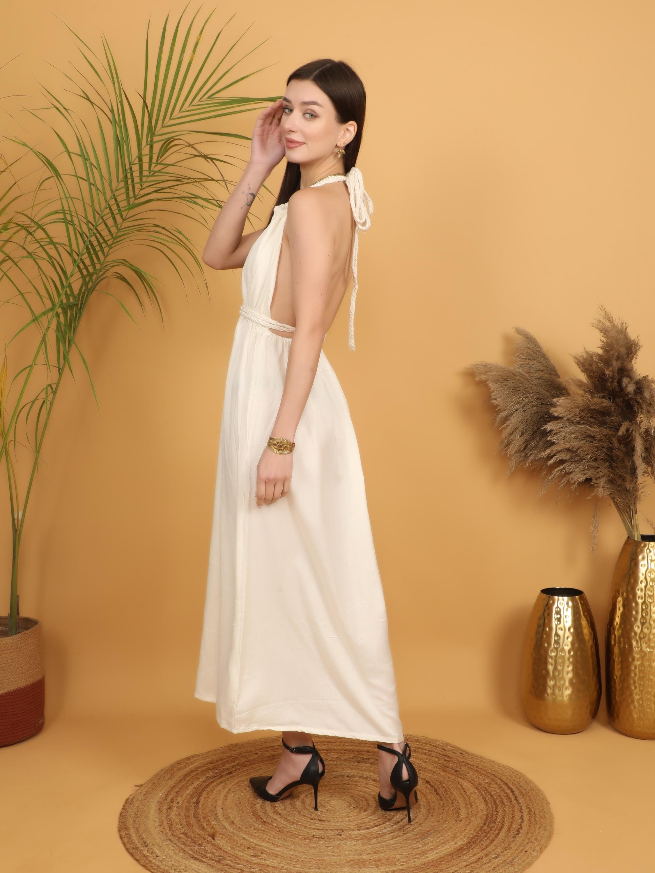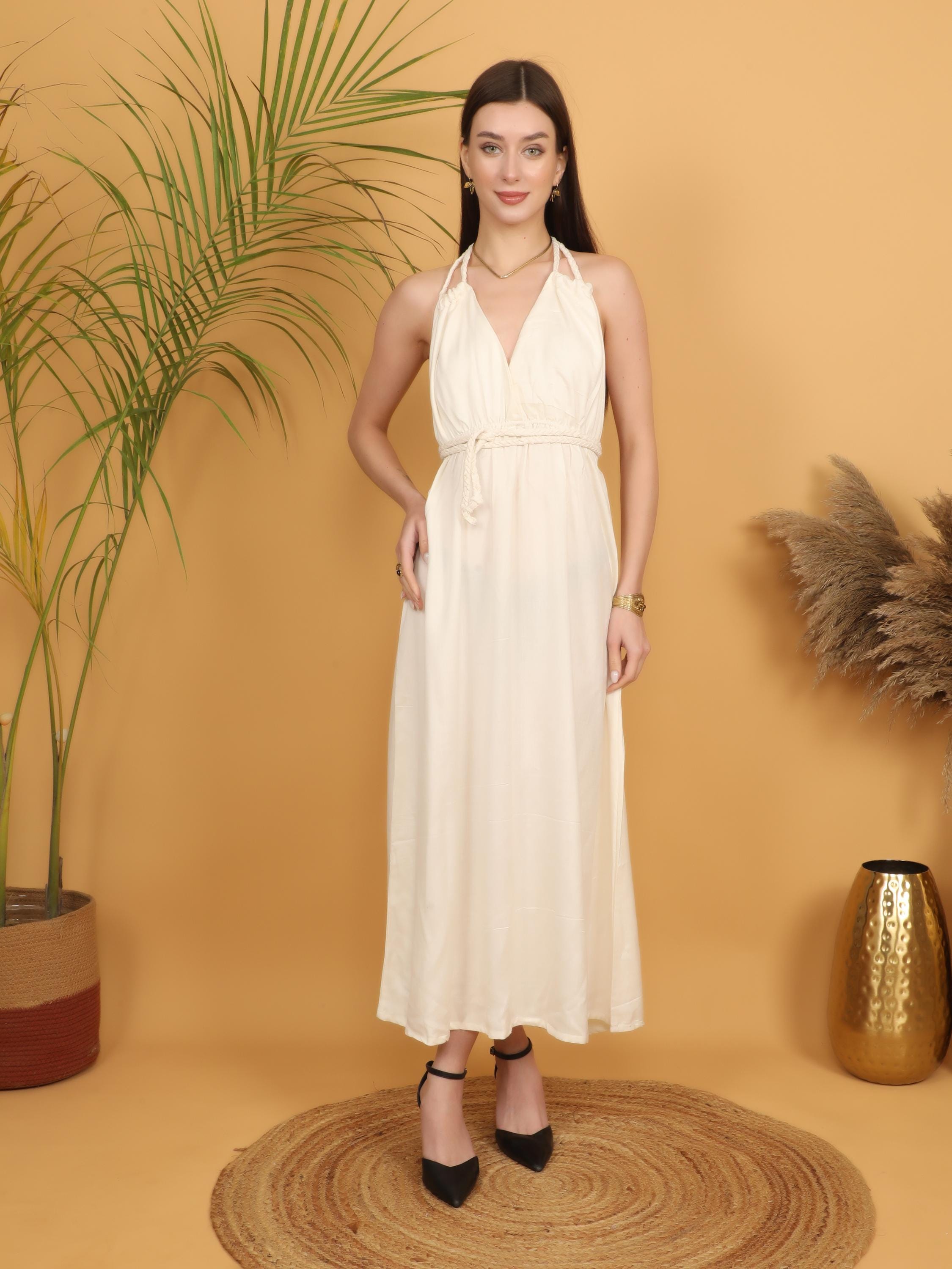 The color is a soft off white — more subtle than bright white — giving the dress a natural, earthy tone that complements bohemian styling perfectly. It feels pure yet warm, making it easy to style with gold accessories, woven textures, or minimalist accents.