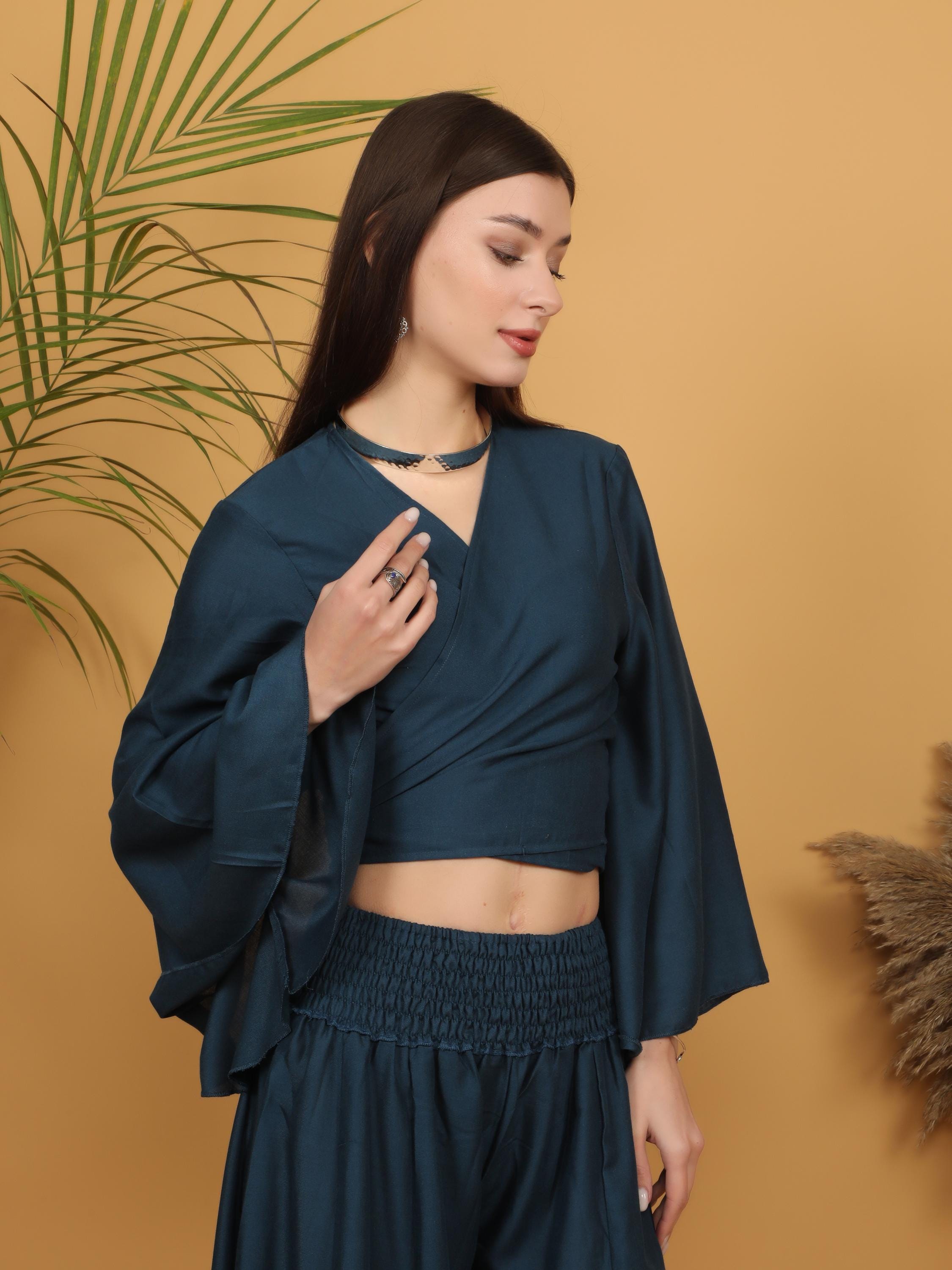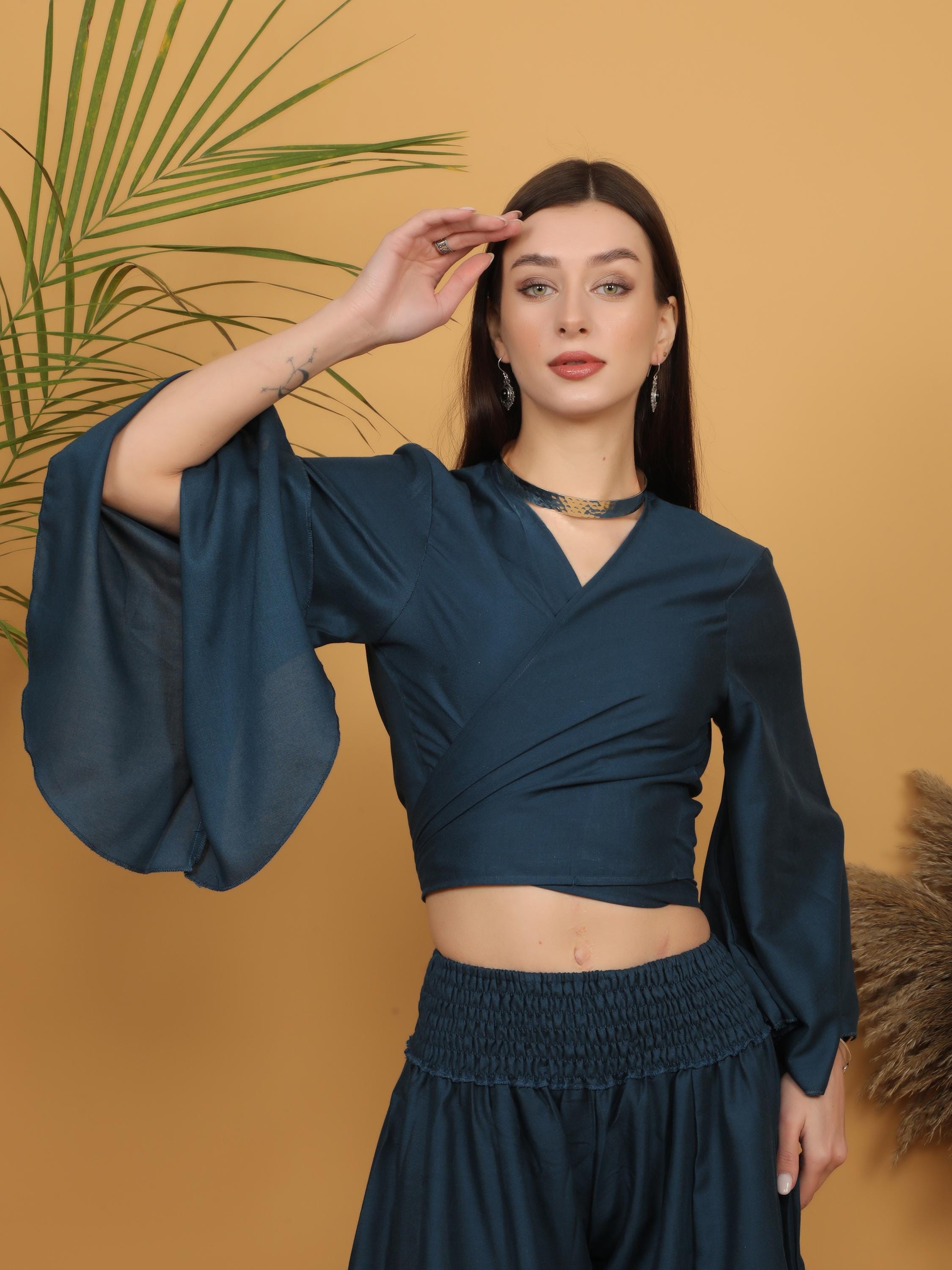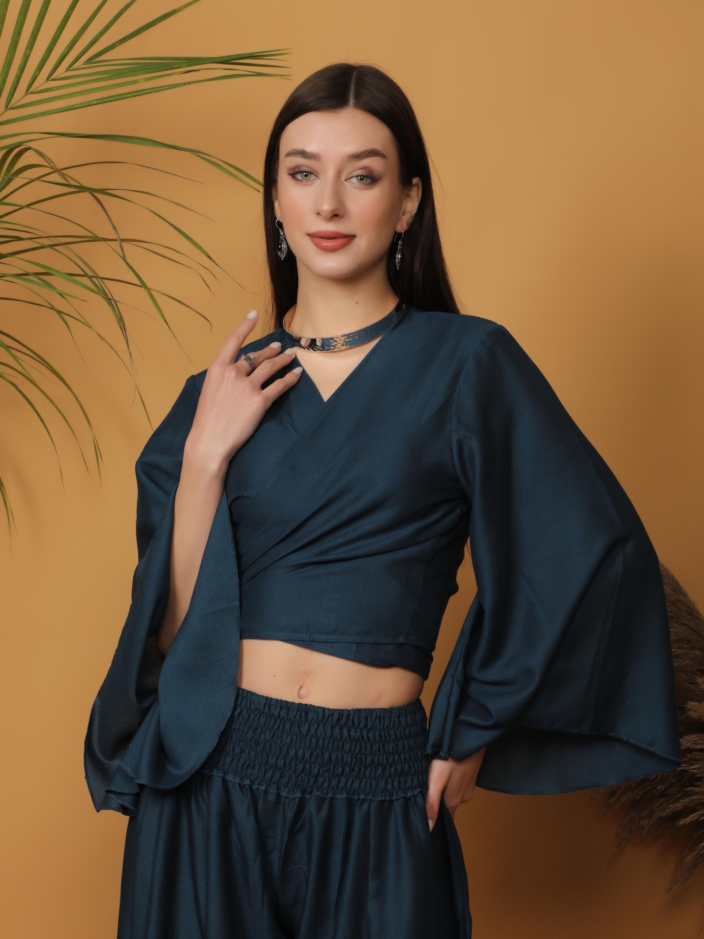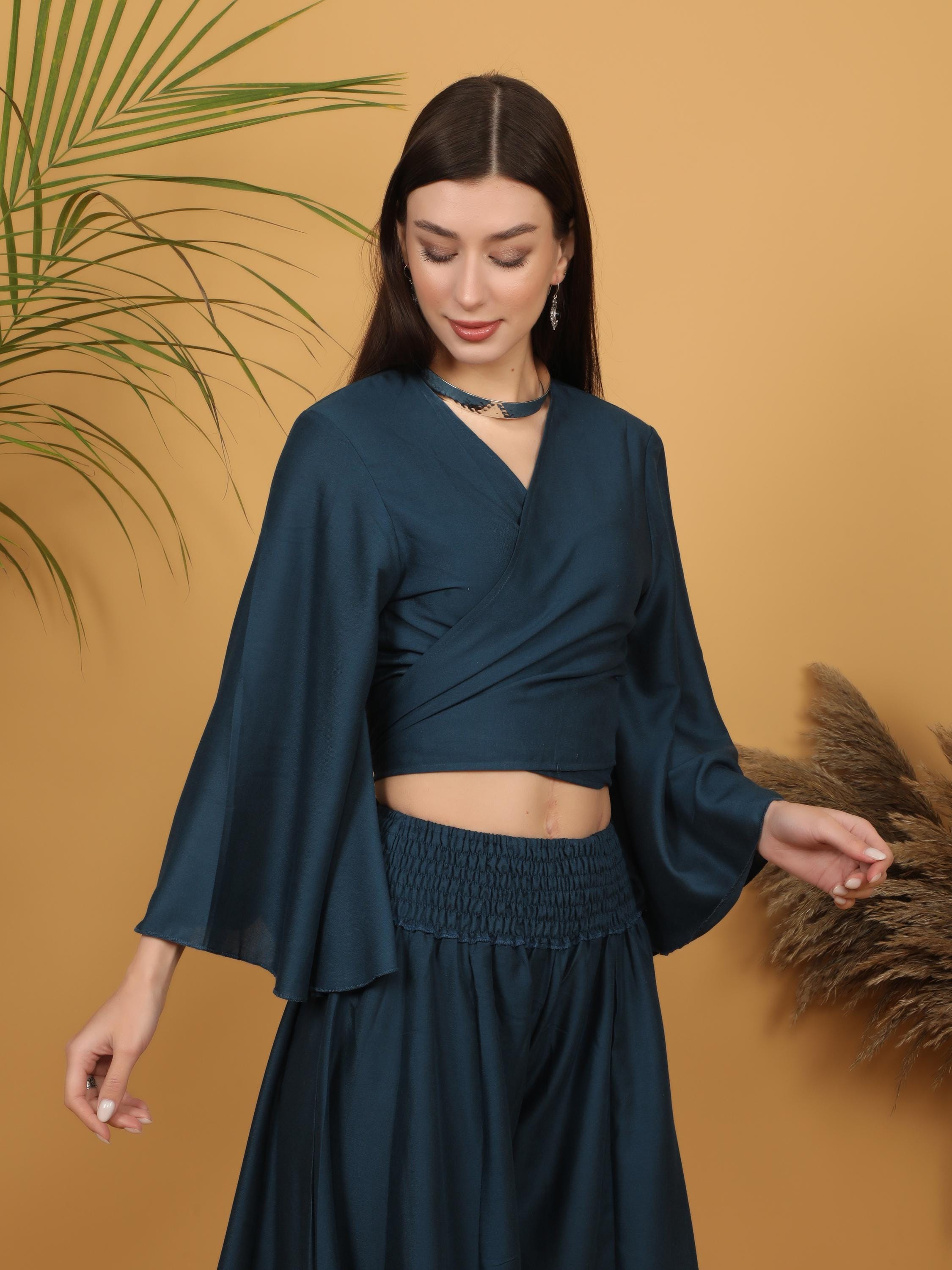 Sophisticated with a free-spirited touch, this deep teal wrap crop top blends modern elegance with bohemian charm.