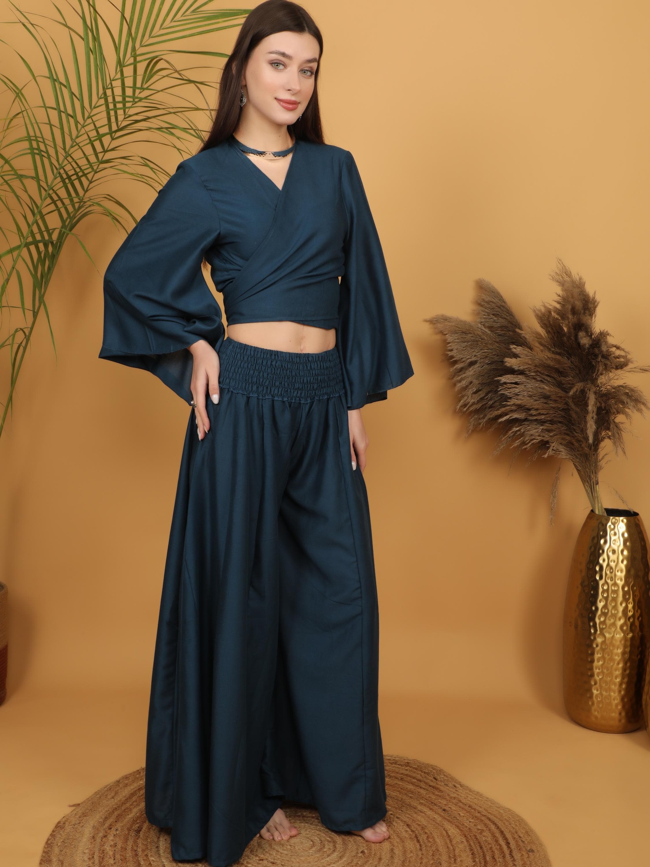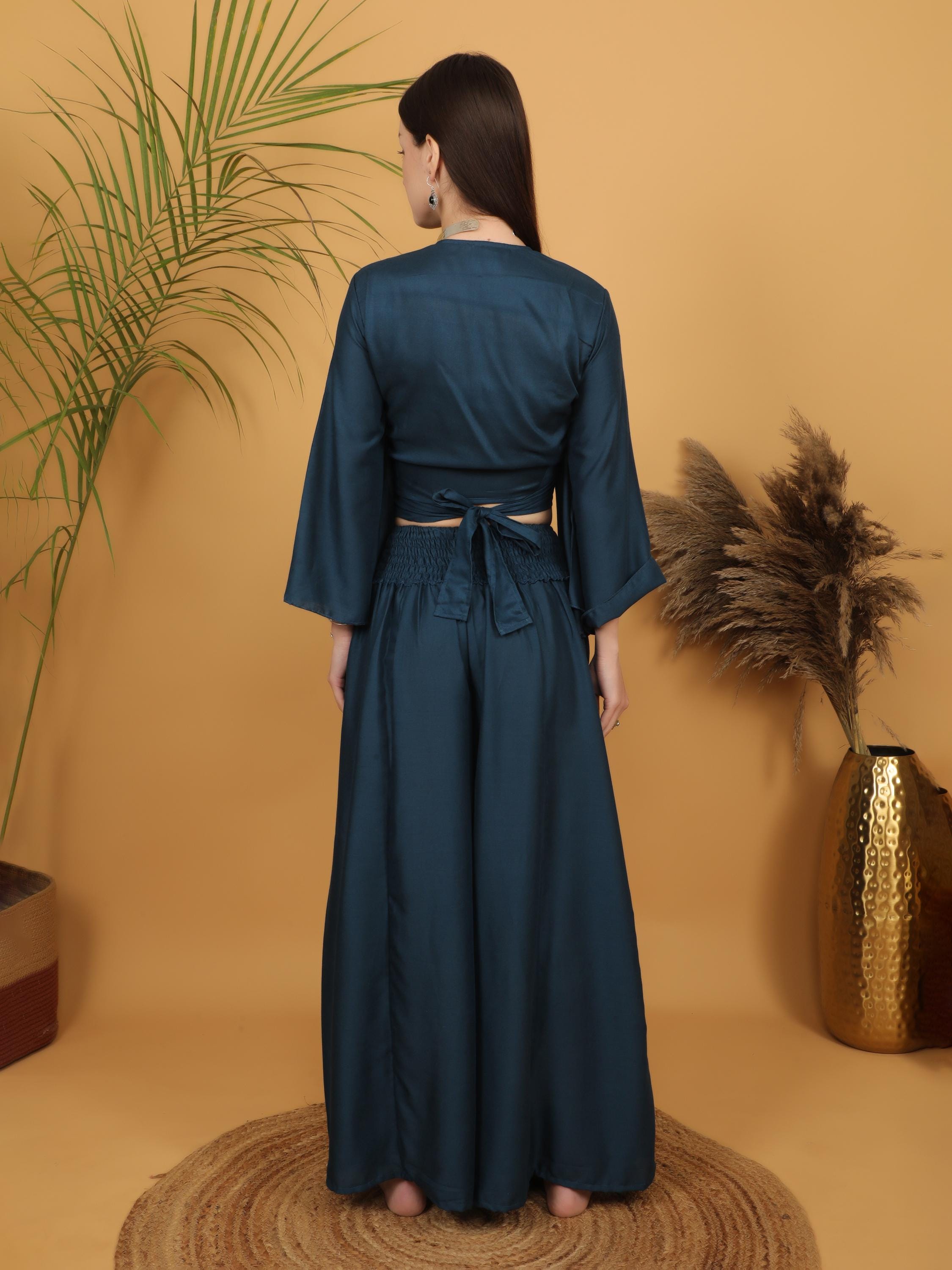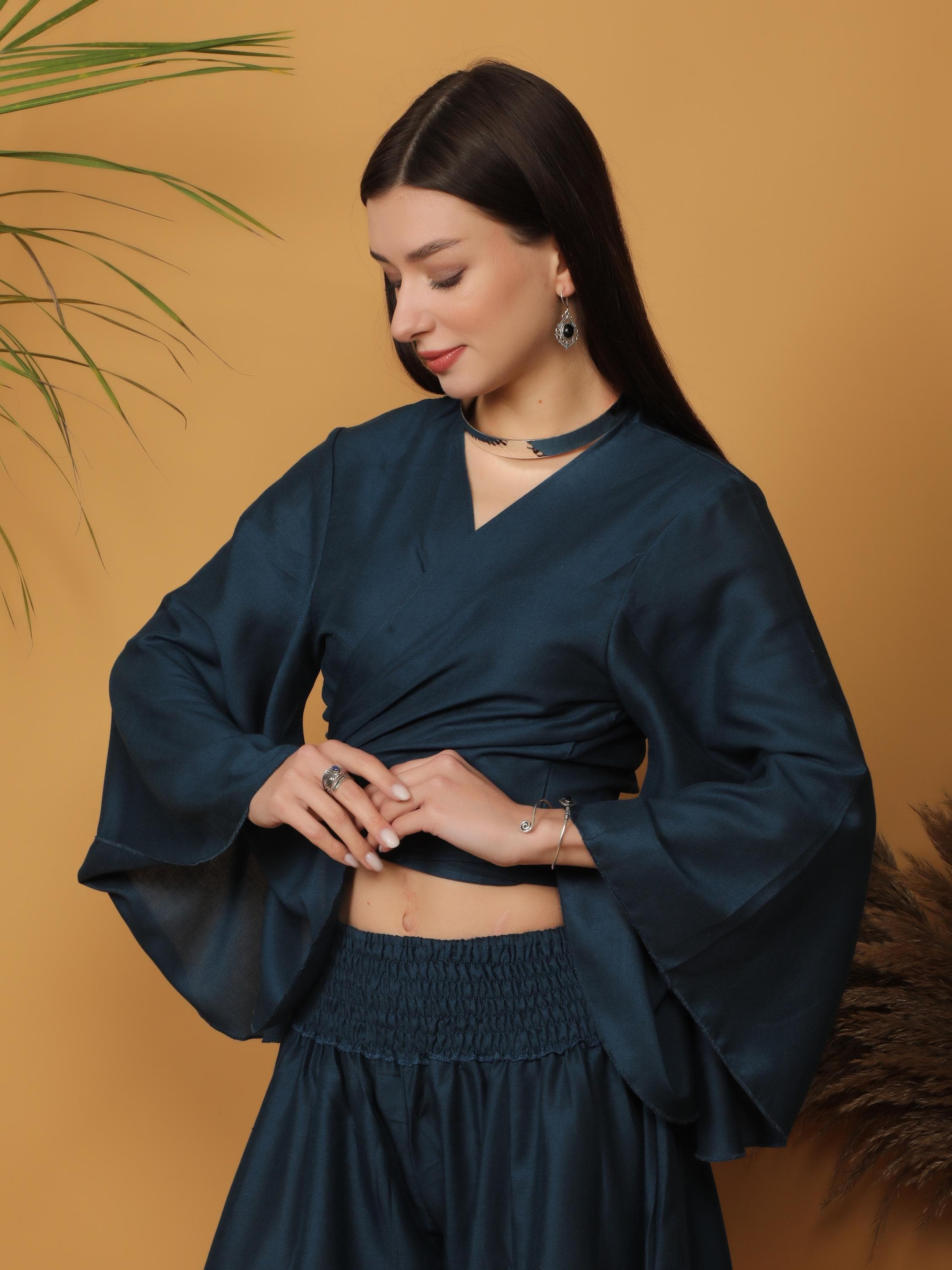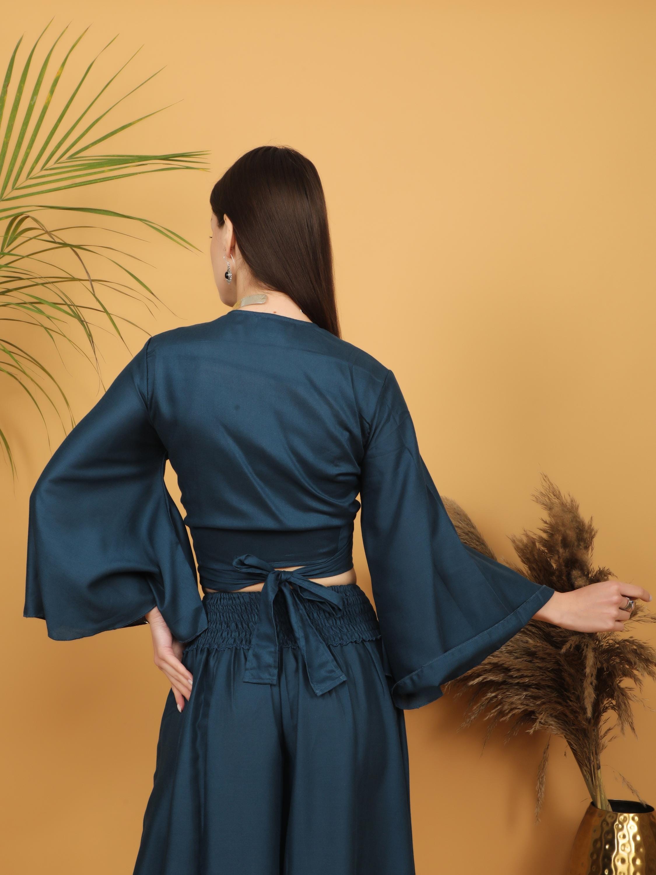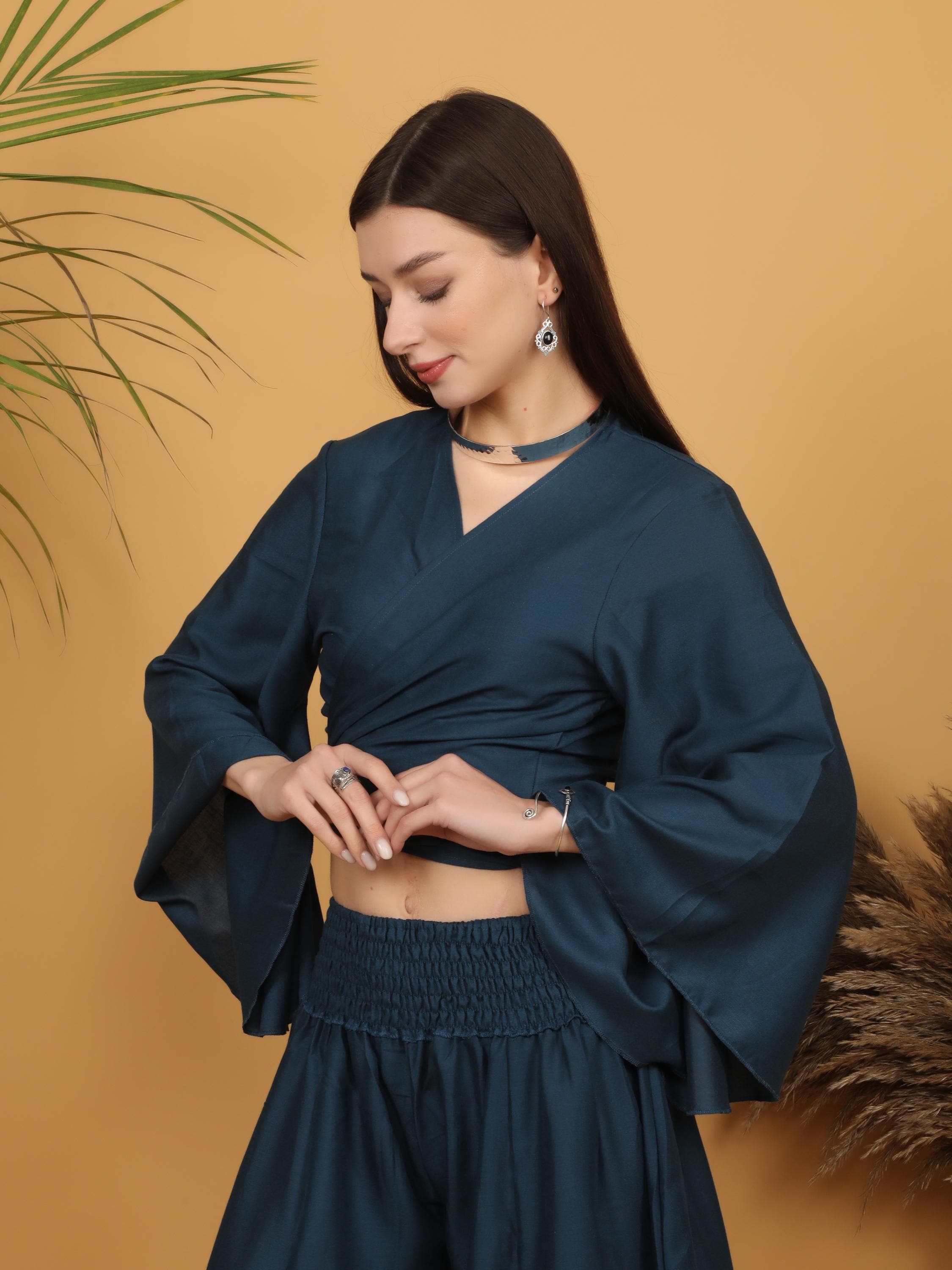 Sophisticated with a free-spirited touch, this deep teal wrap crop top blends modern elegance with bohemian charm.