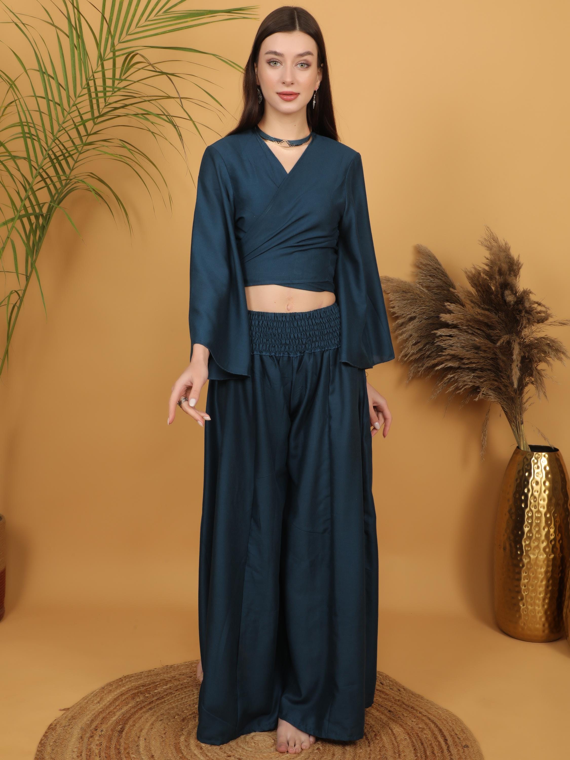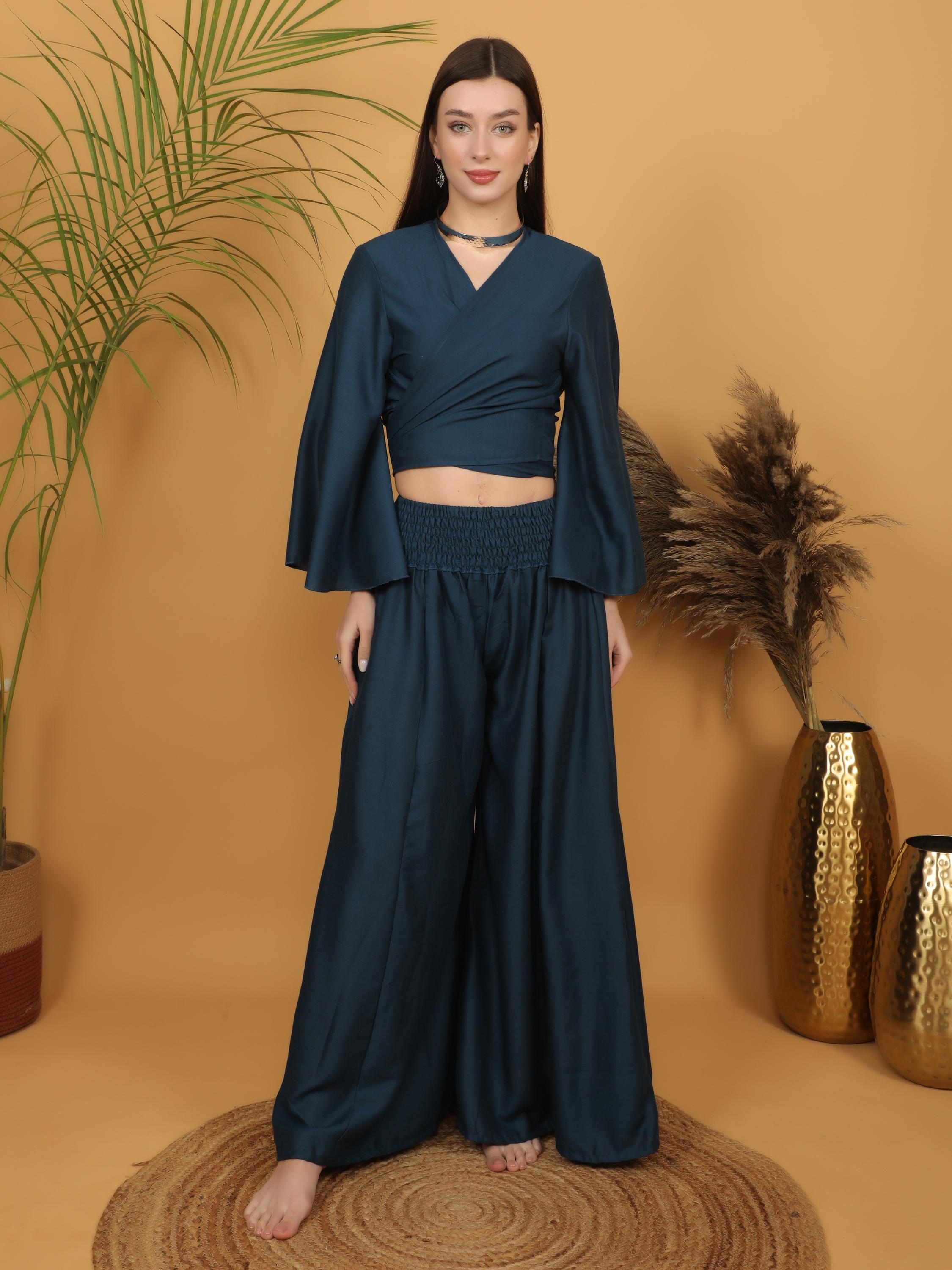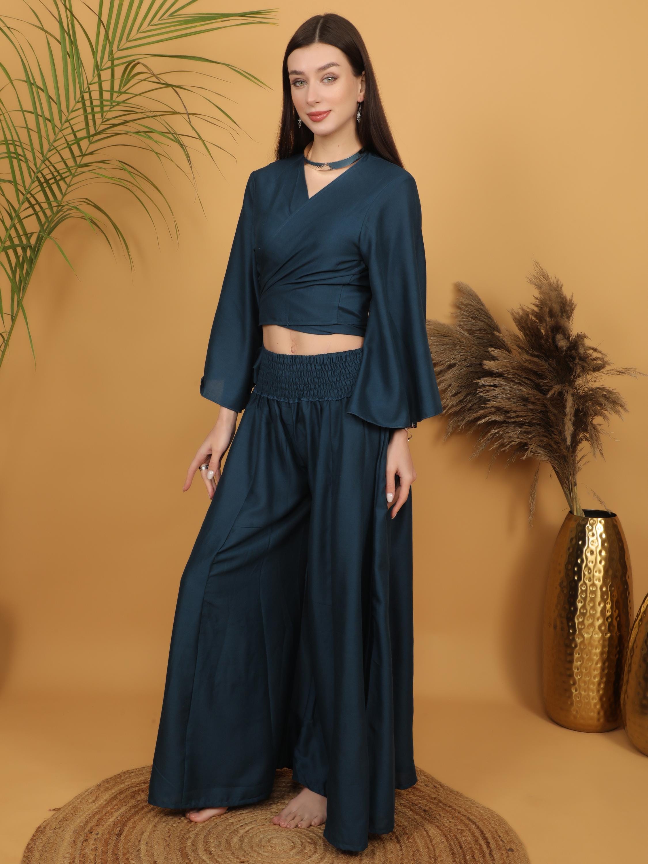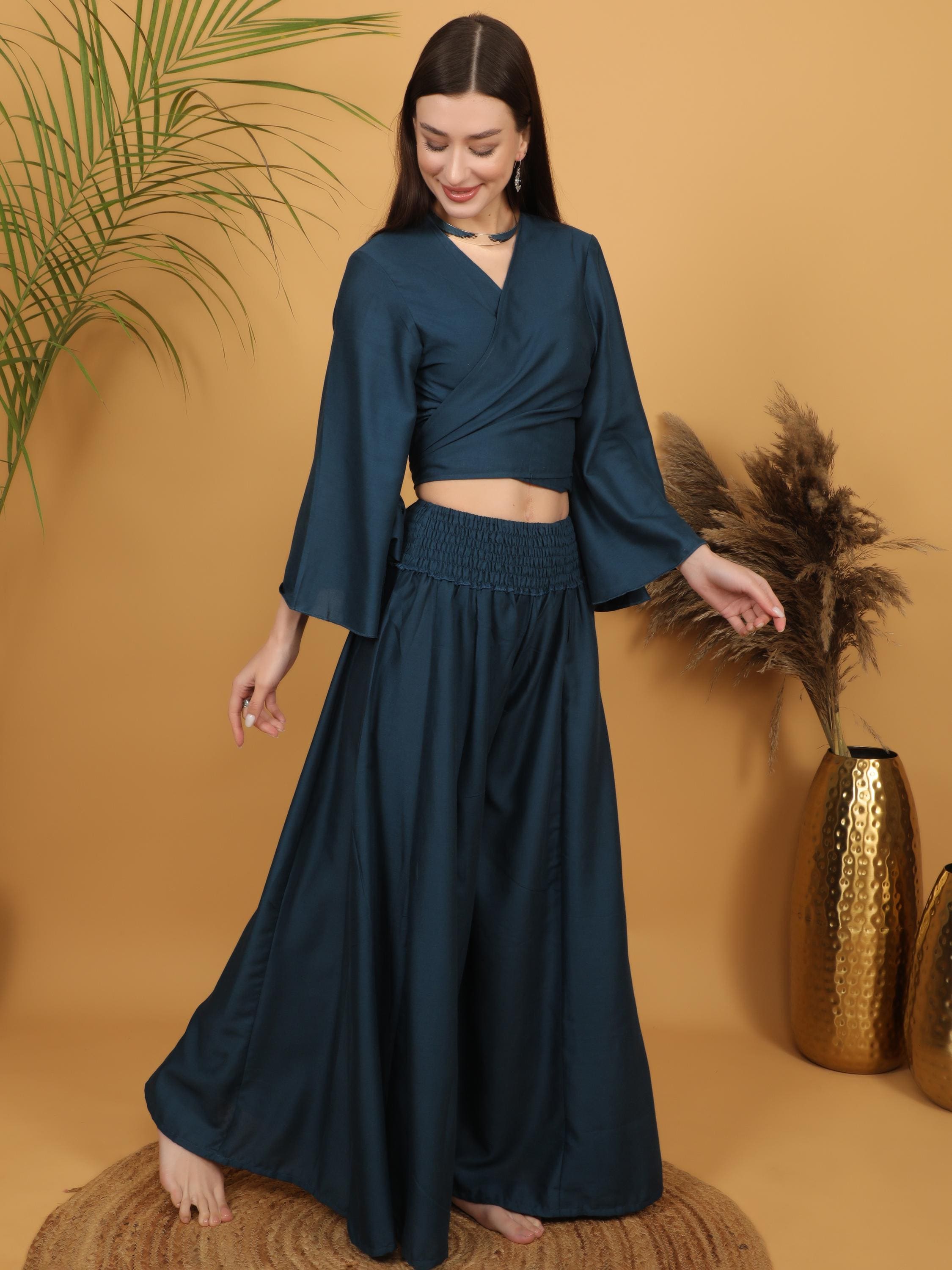 Sophisticated with a free-spirited touch, this deep teal wrap crop top blends modern elegance with bohemian charm.
