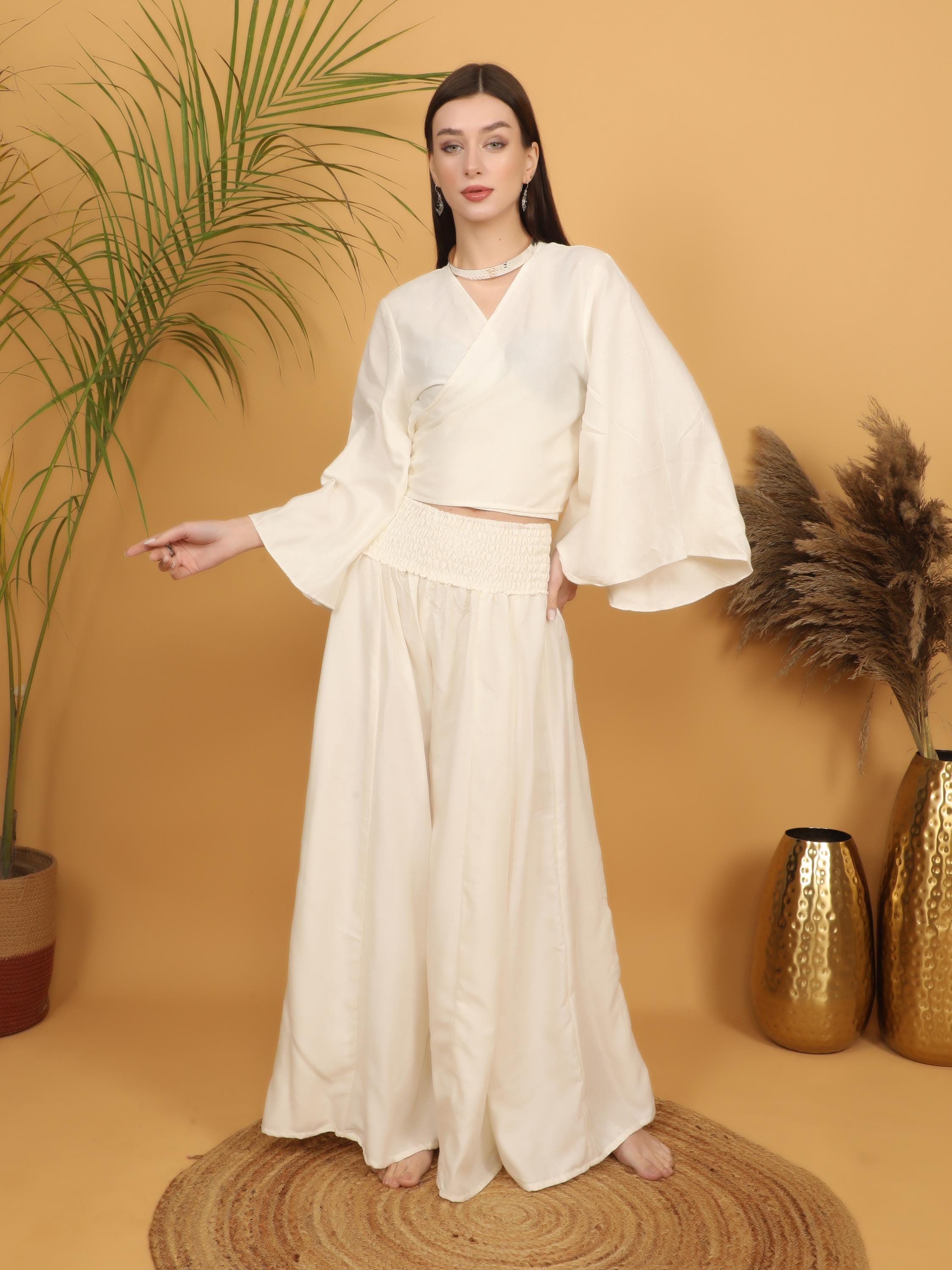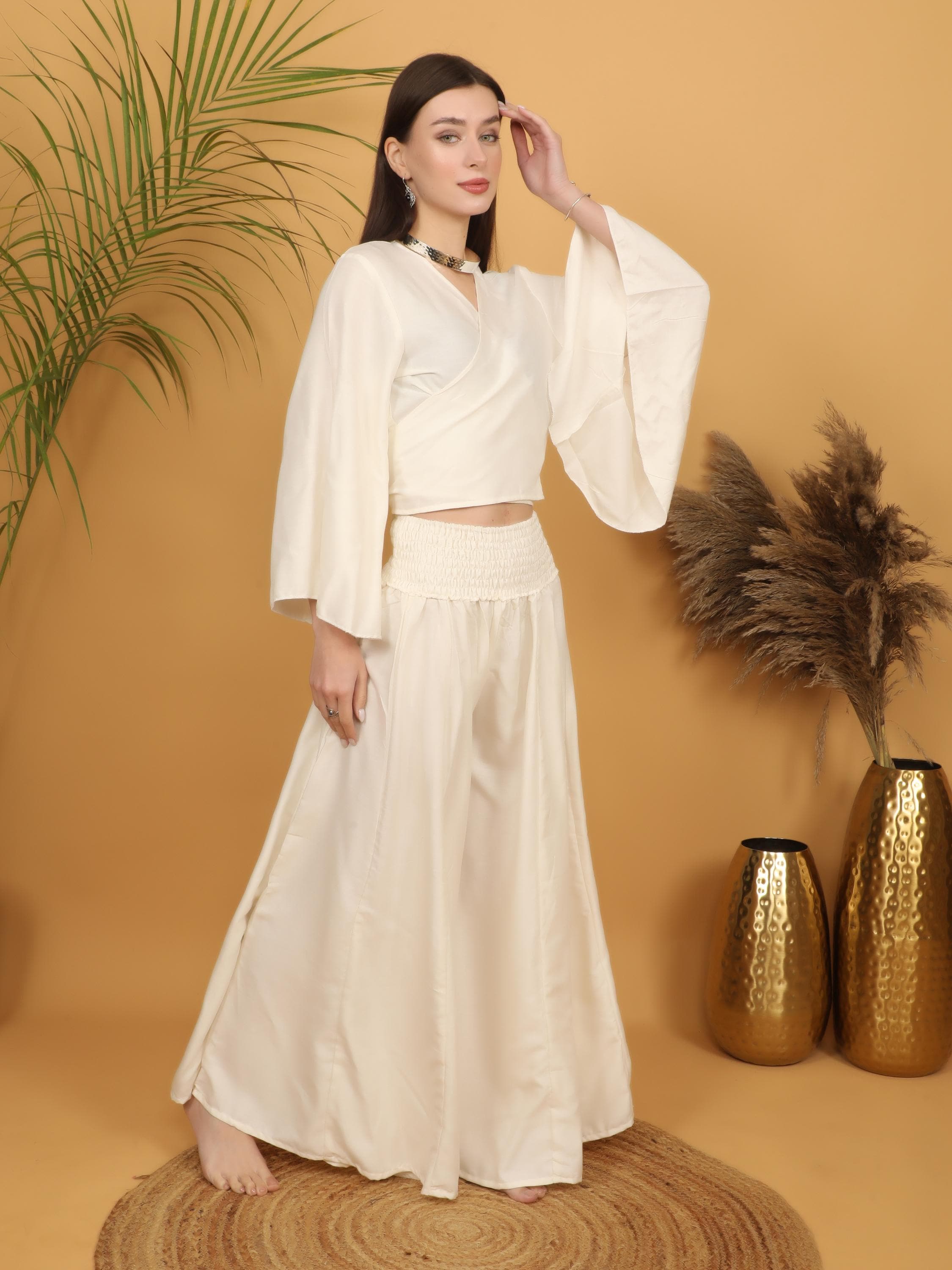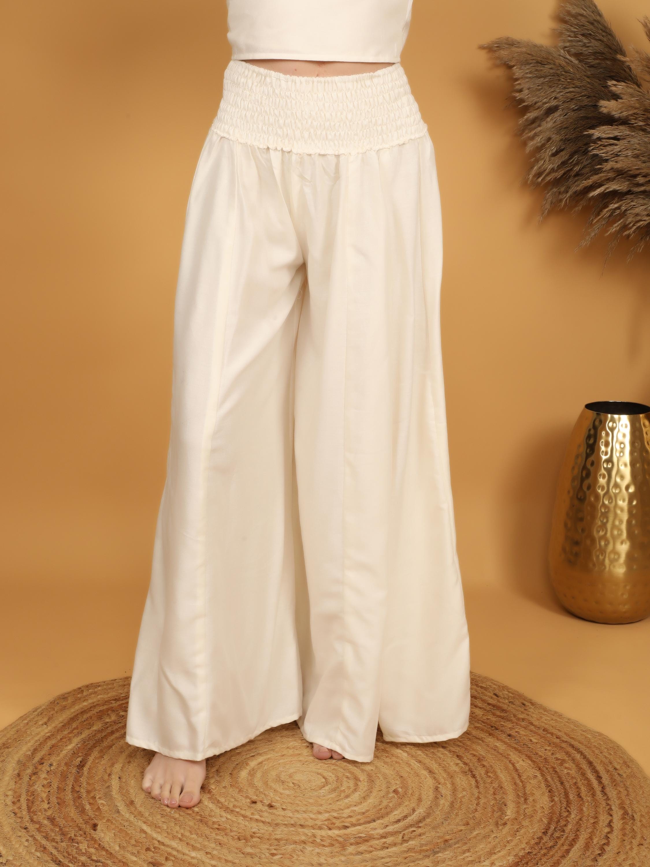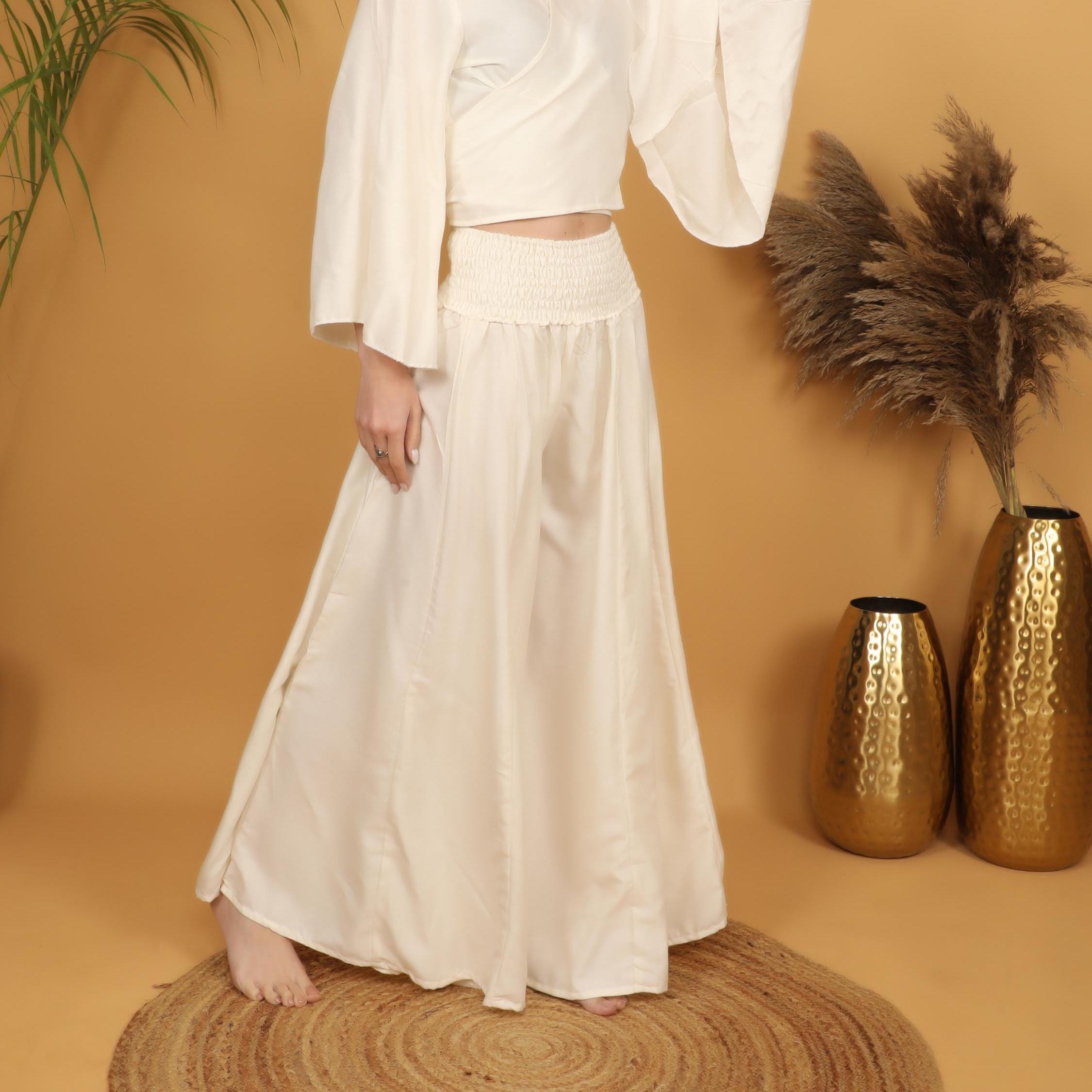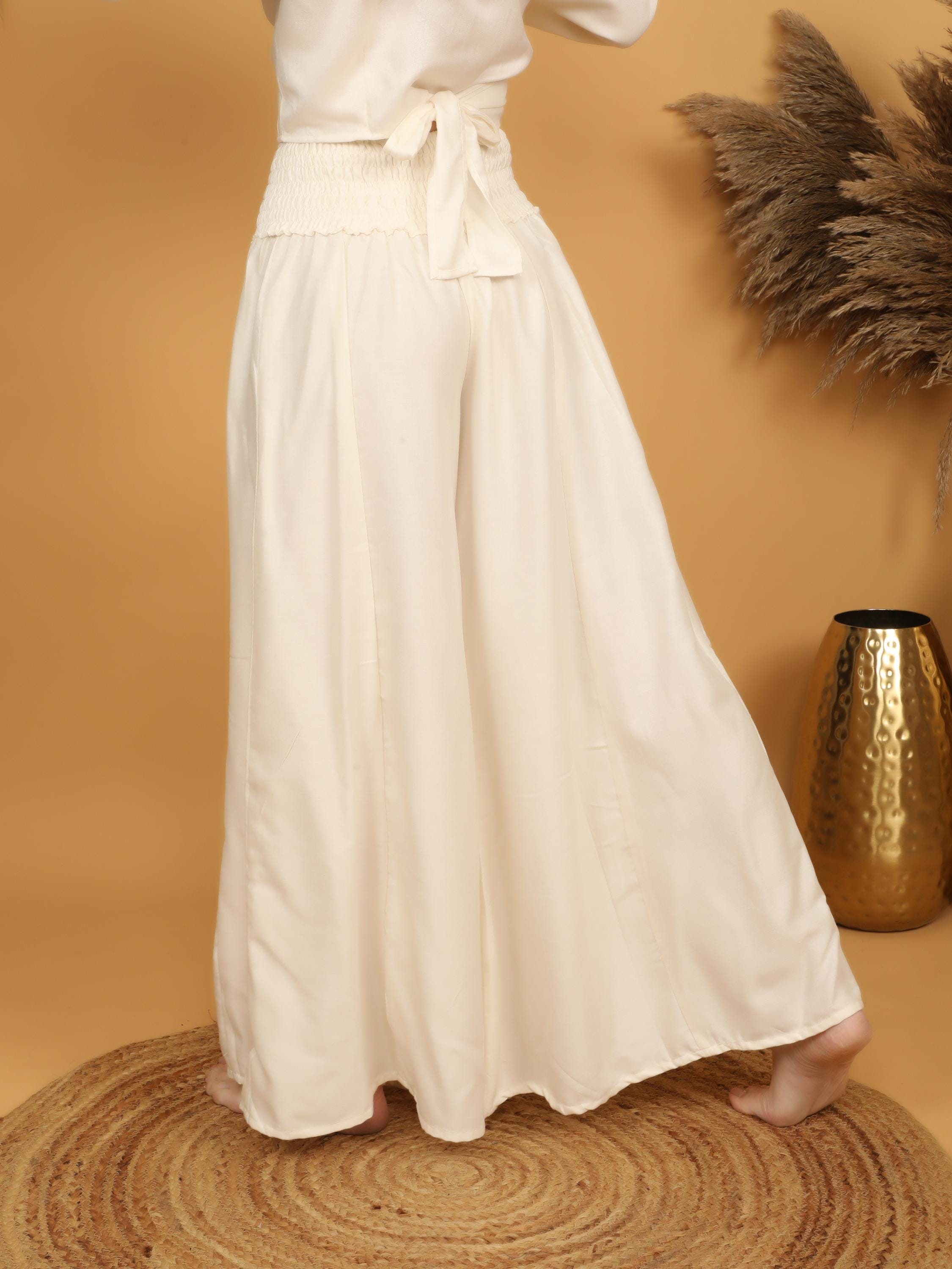 Elegant off white boho wide leg pants crafted from soft, lightweight viscose with a smooth and fluid drape. The fabric flows beautifully with movement, creating an airy and refined silhouette that feels effortless and feminine.