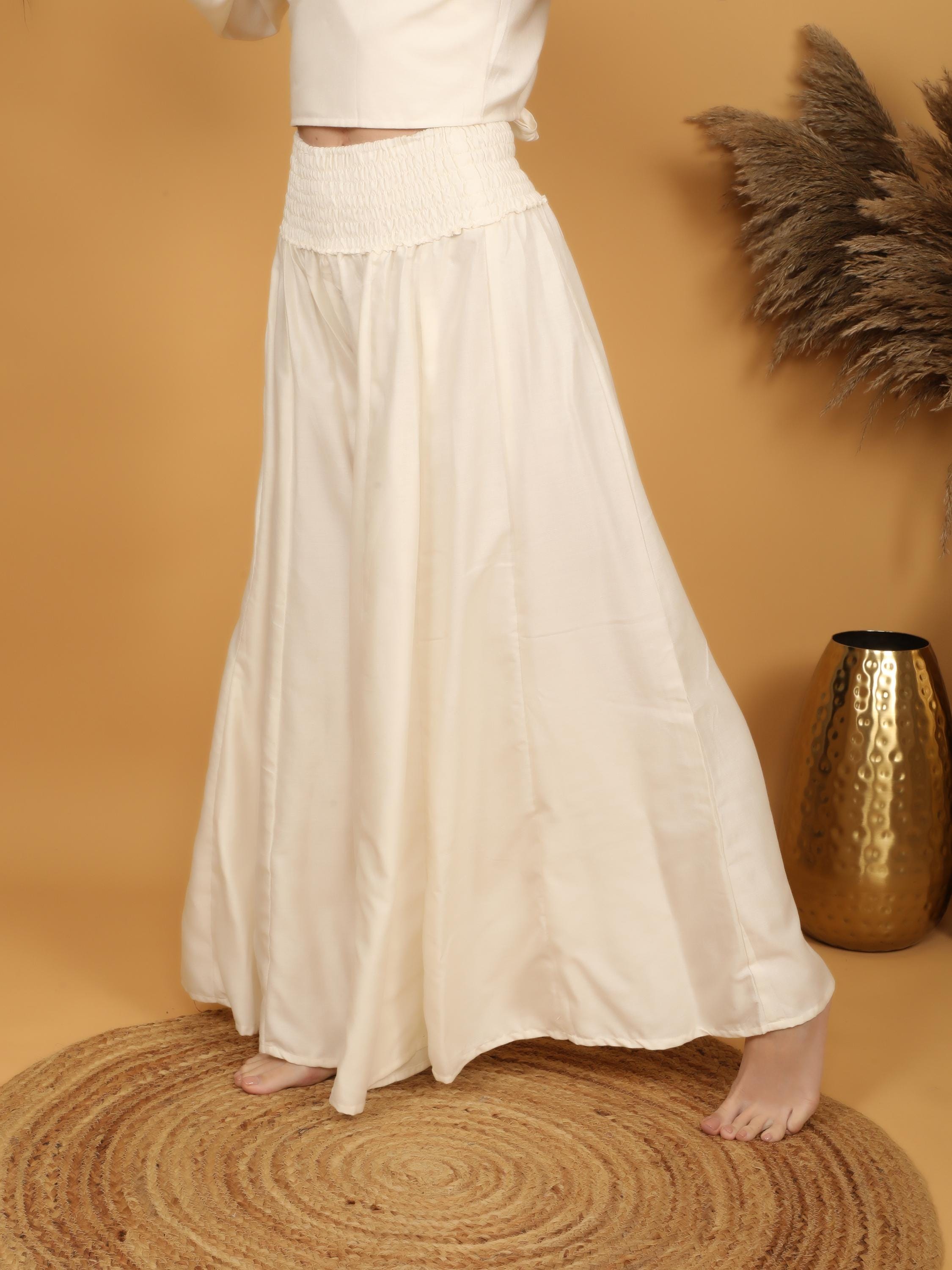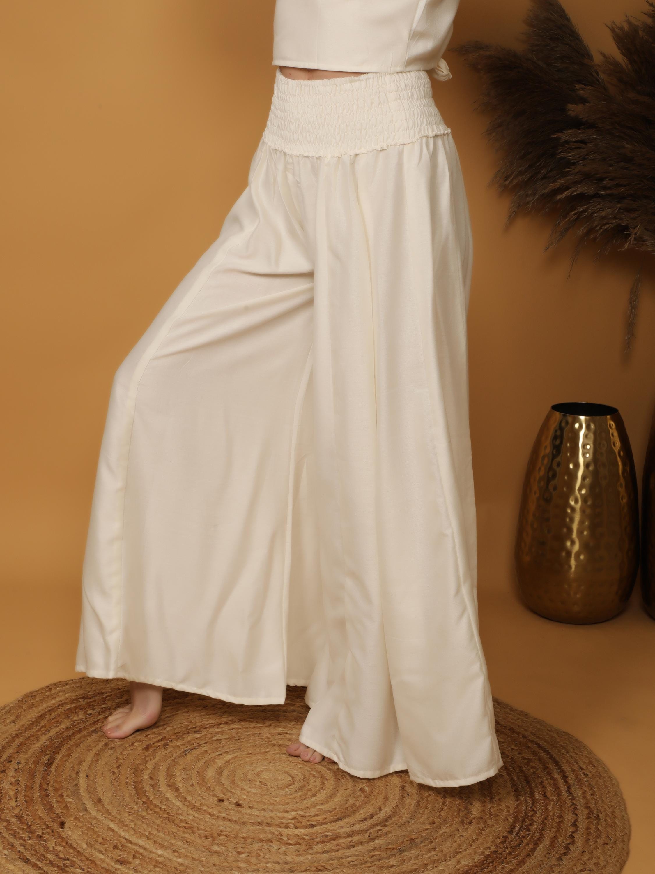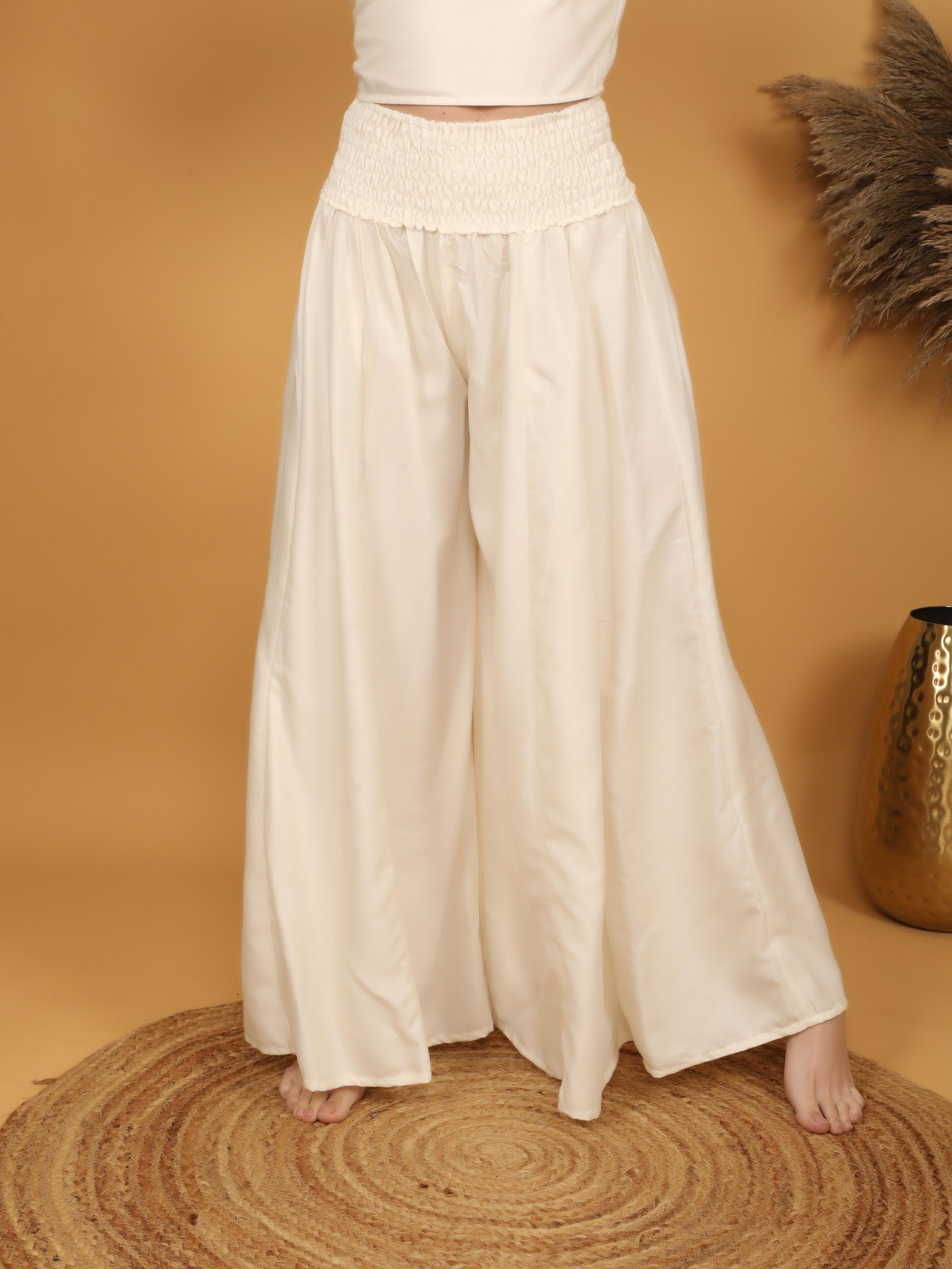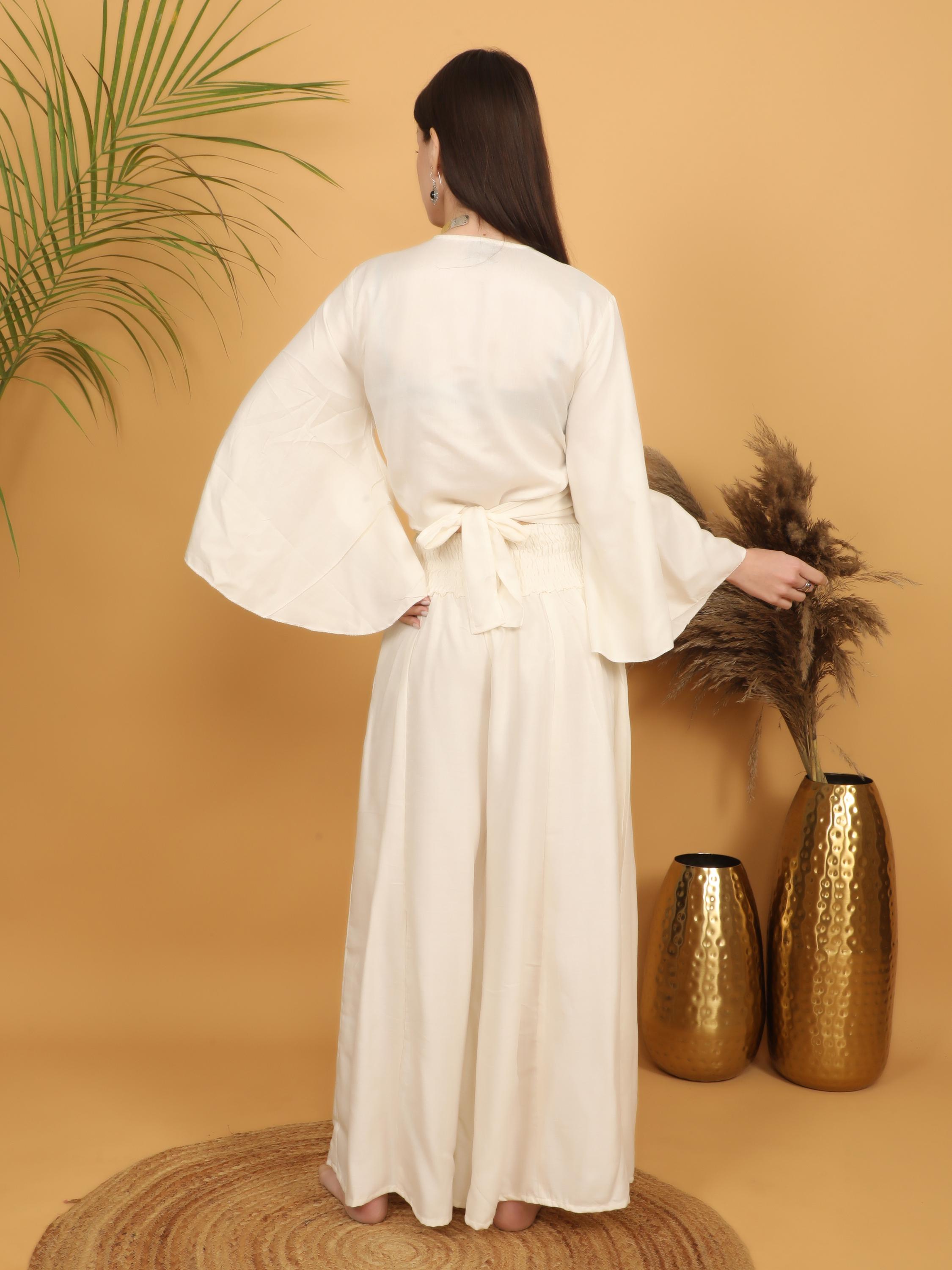 Elegant off white boho wide leg pants crafted from soft, lightweight viscose with a smooth and fluid drape. The fabric flows beautifully with movement, creating an airy and refined silhouette that feels effortless and feminine.