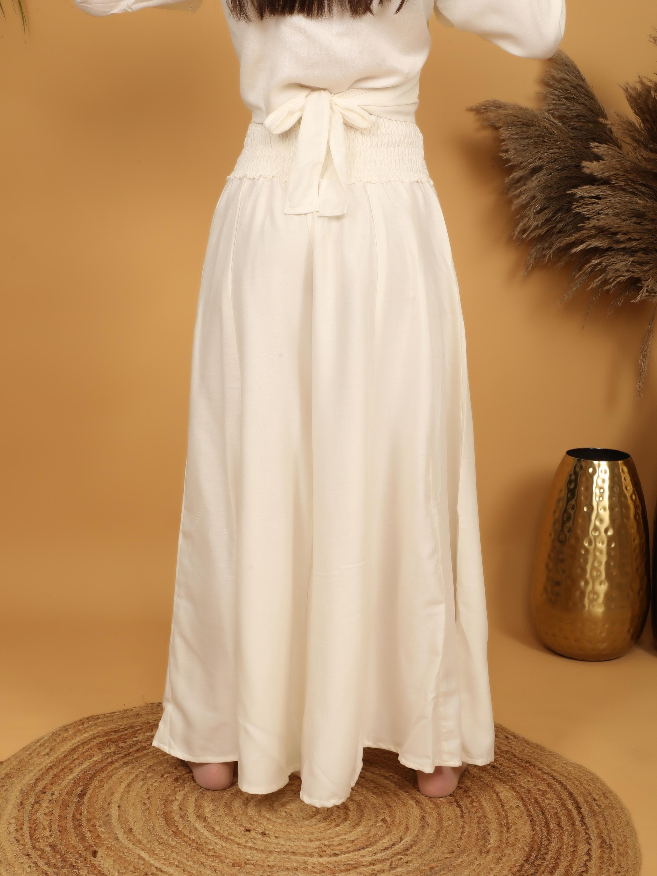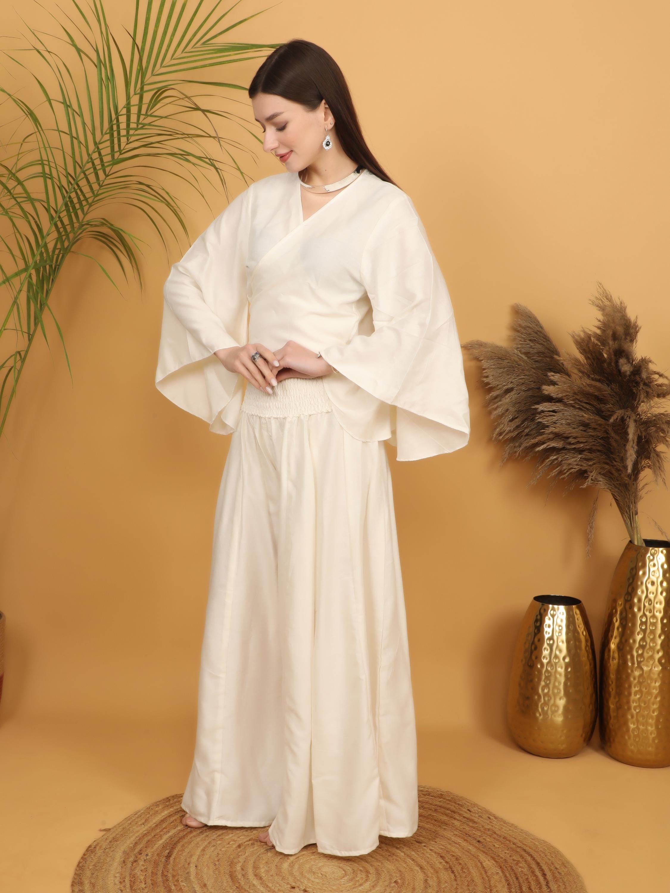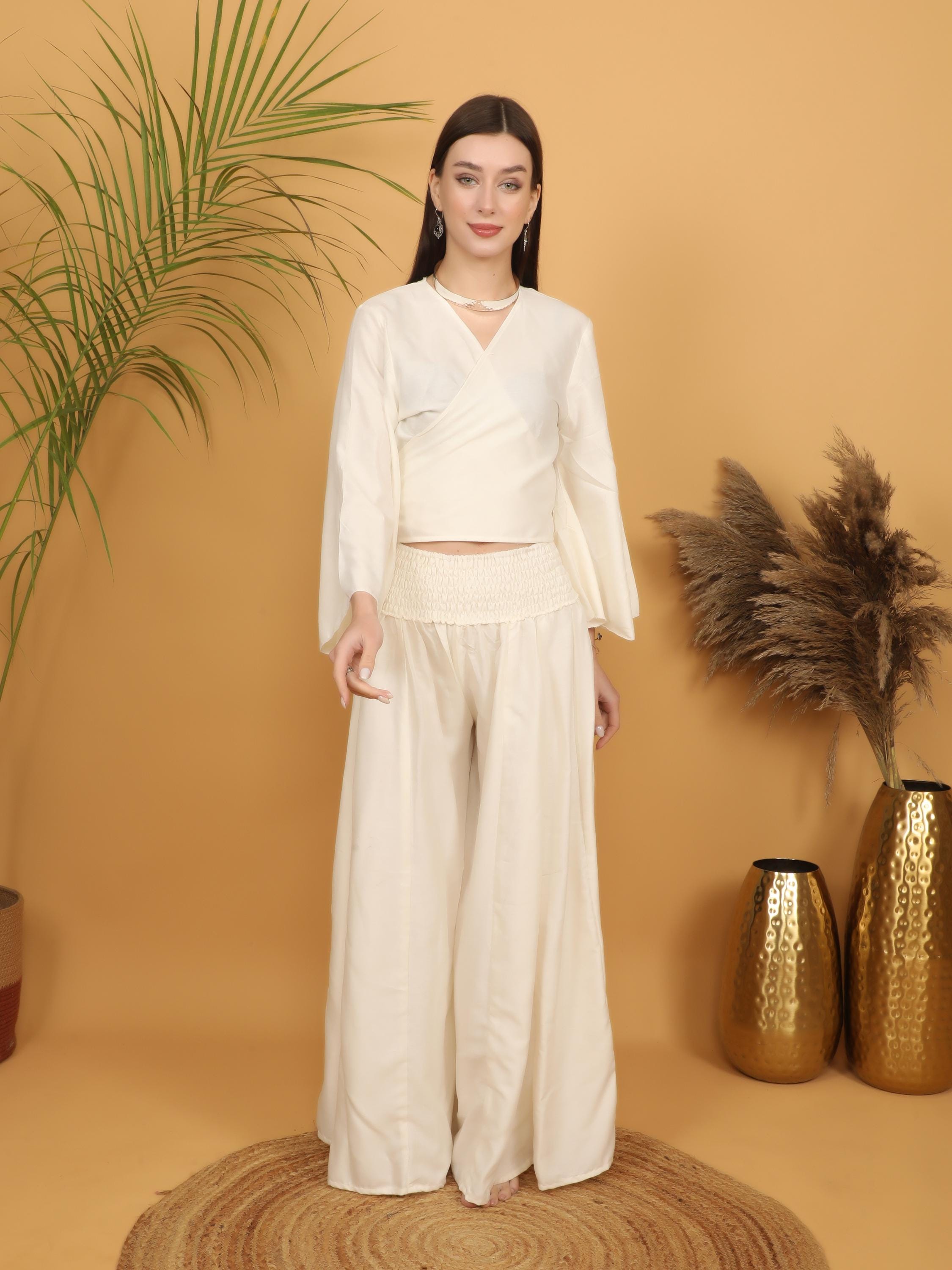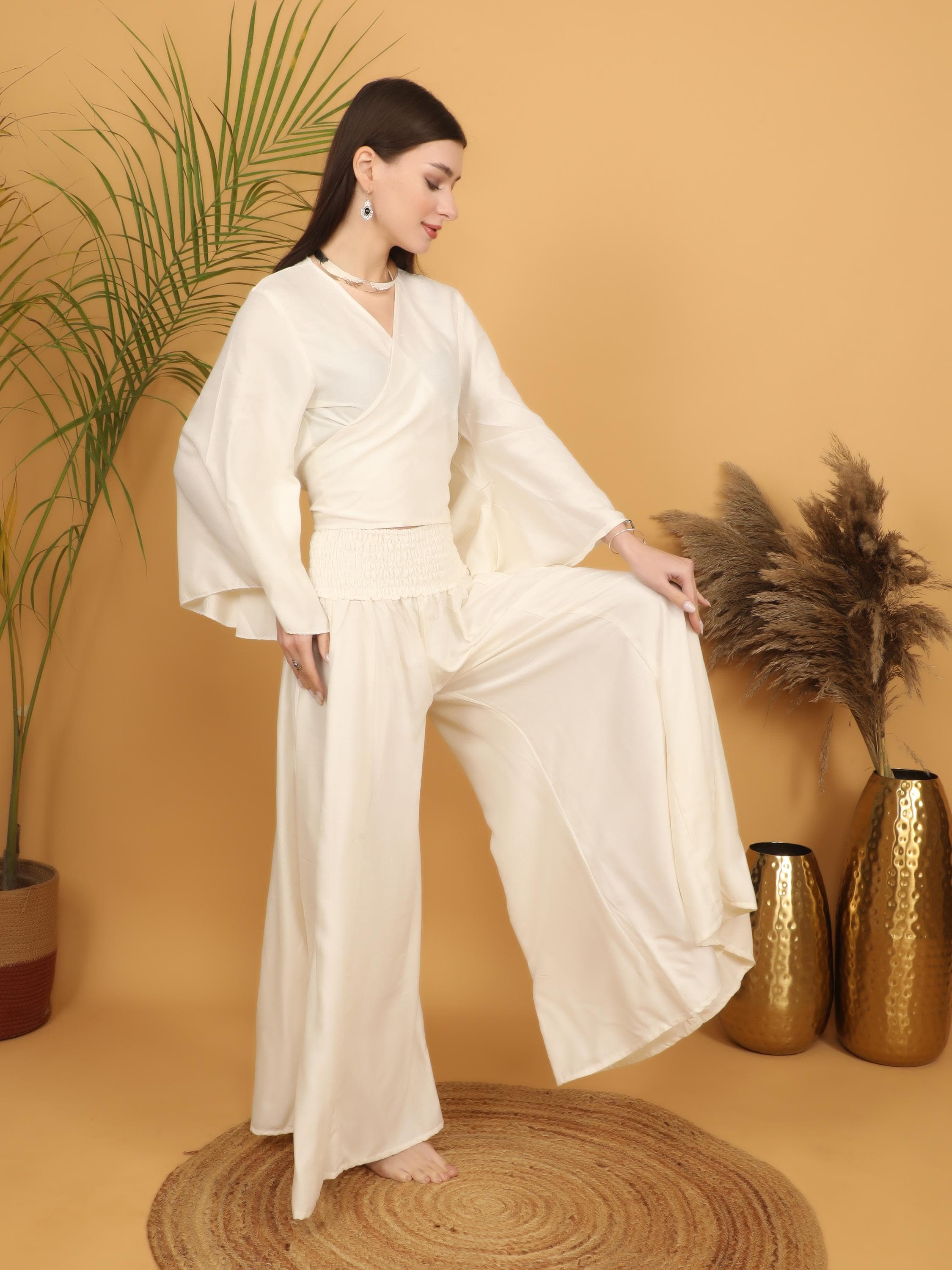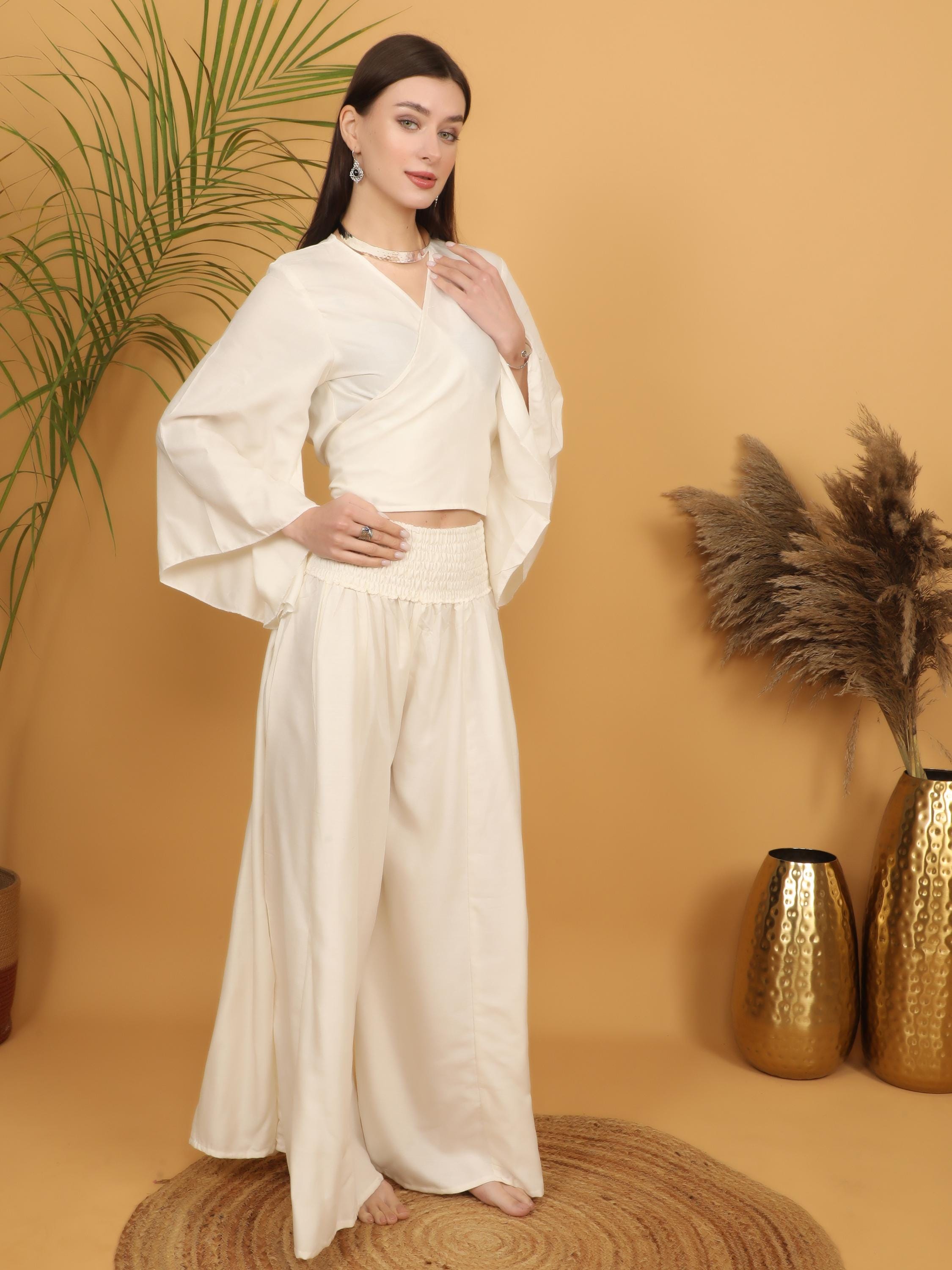 Elegant off white boho wide leg pants crafted from soft, lightweight viscose with a smooth and fluid drape. The fabric flows beautifully with movement, creating an airy and refined silhouette that feels effortless and feminine.