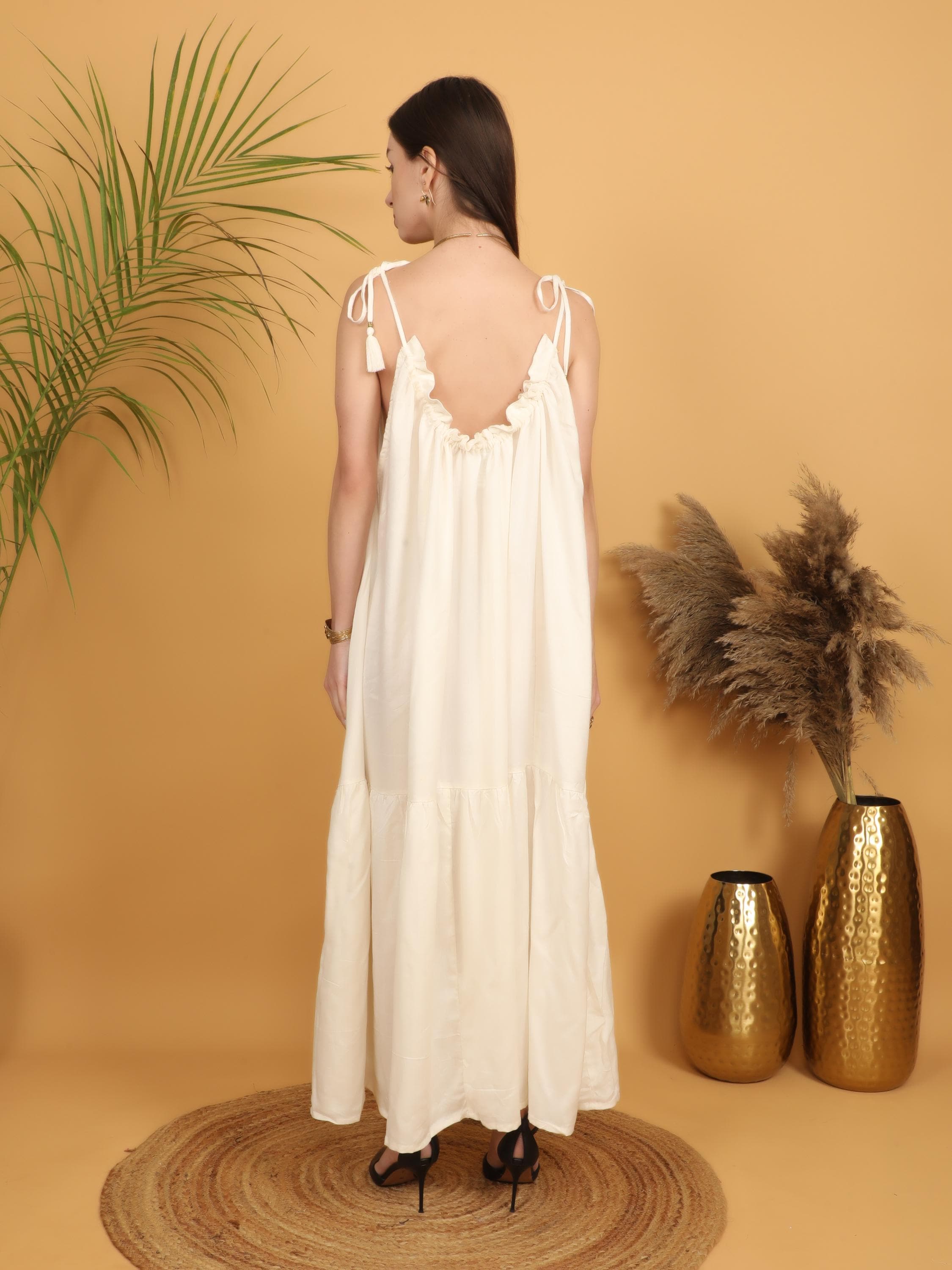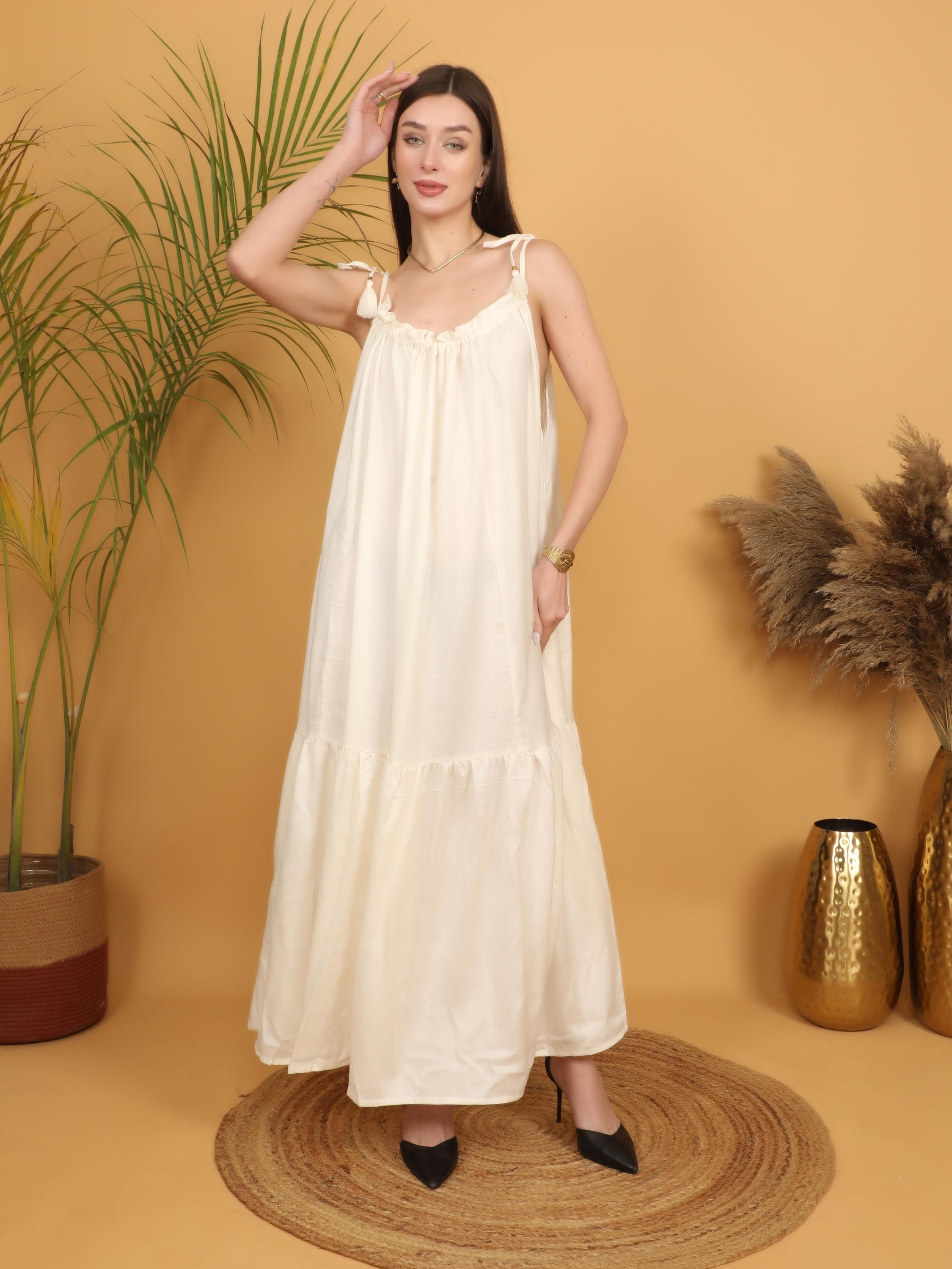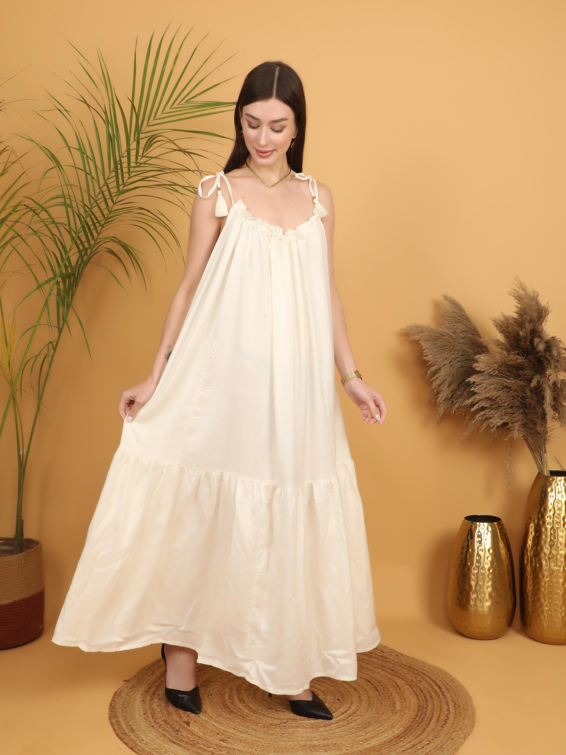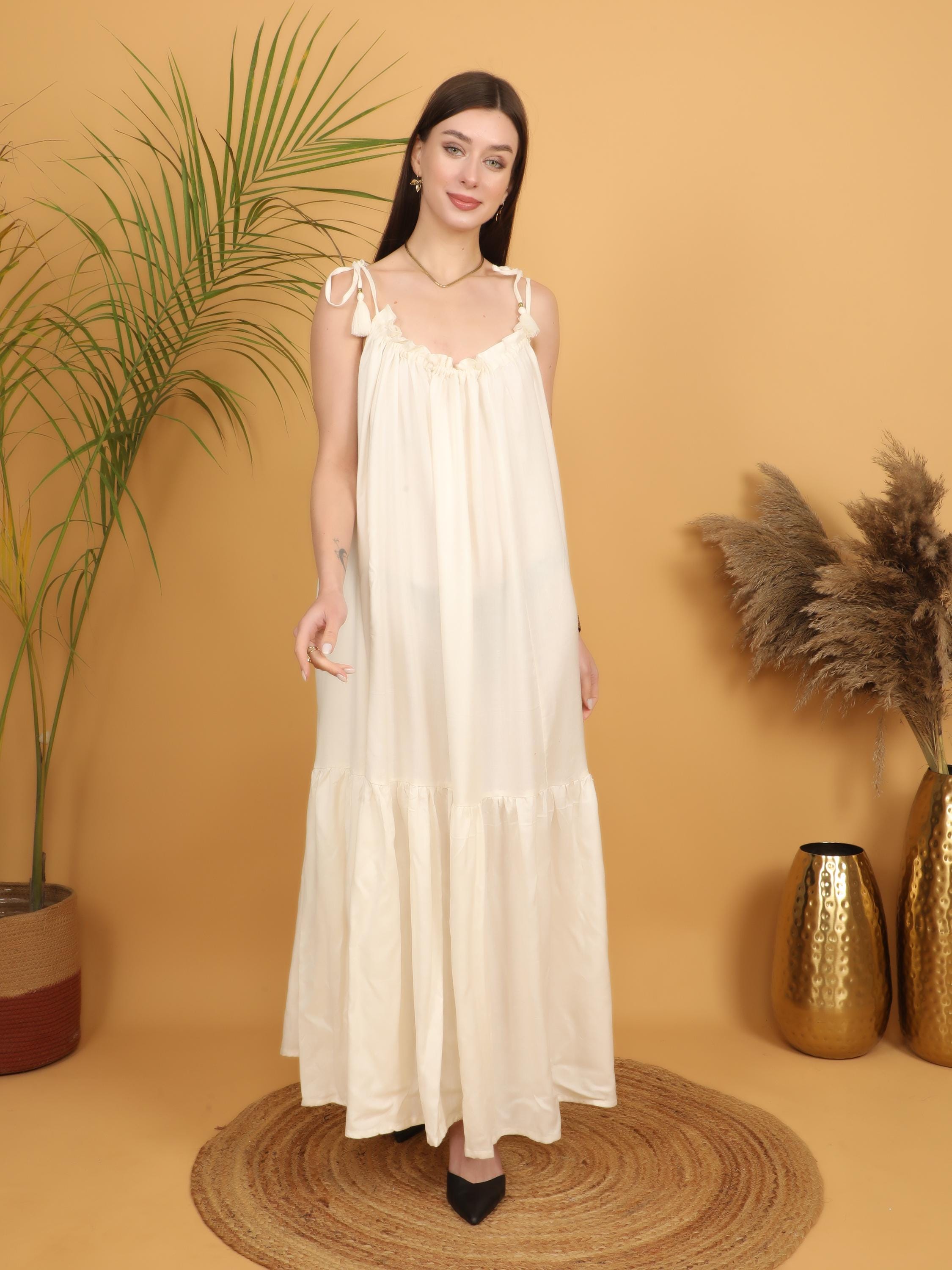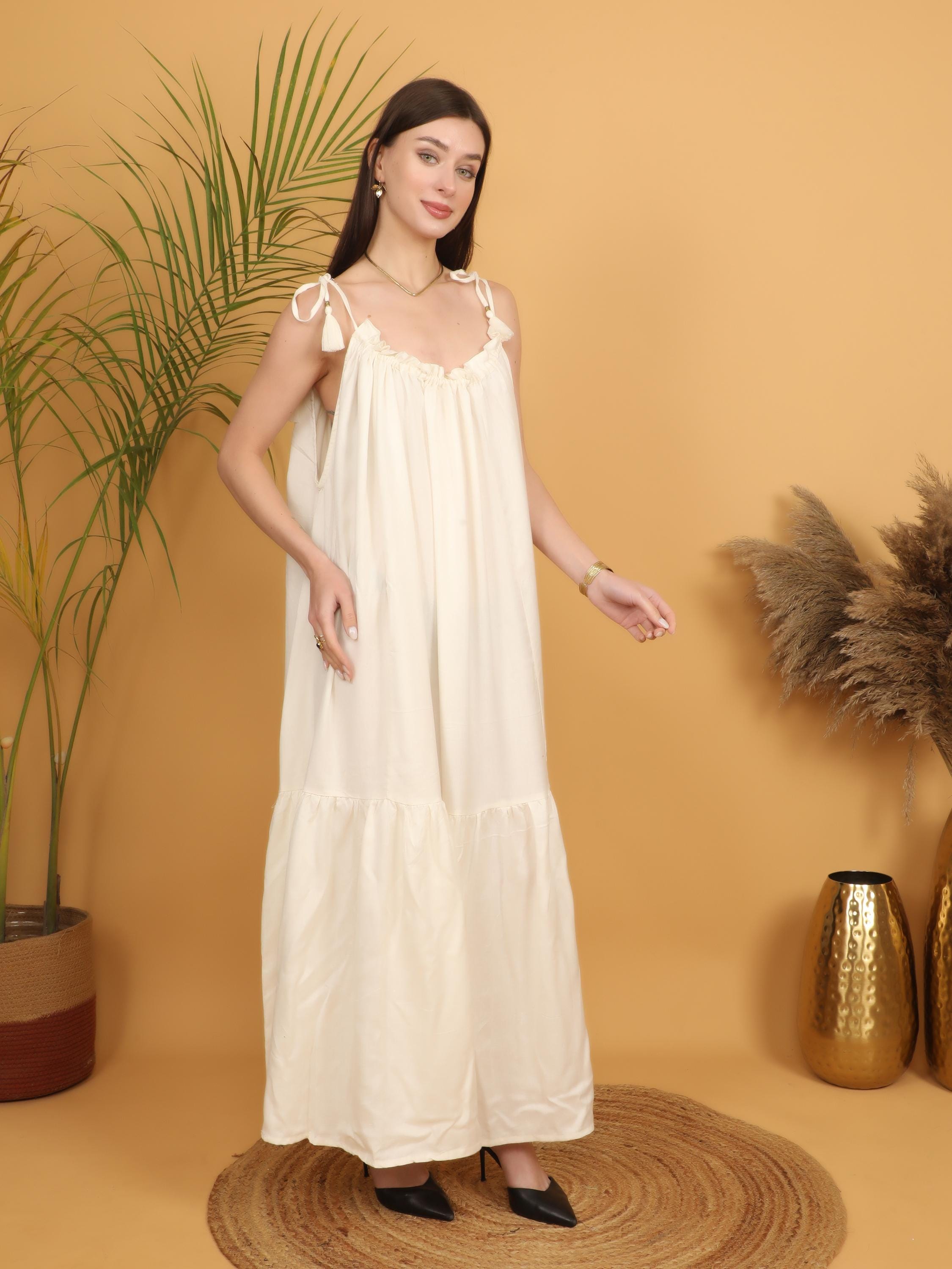 The design features a softly gathered neckline with delicate adjustable tie straps finished with subtle tassel details, adding an artisanal touch to the silhouette. The loose, flowing cut falls gracefully from the bust into a full-length skirt with a gentle tiered hem, creating natural movement and an effortlessly feminine shape. The relaxed fit allows all-day comfort while maintaining a flattering drape that enhances the bohemian aesthetic.