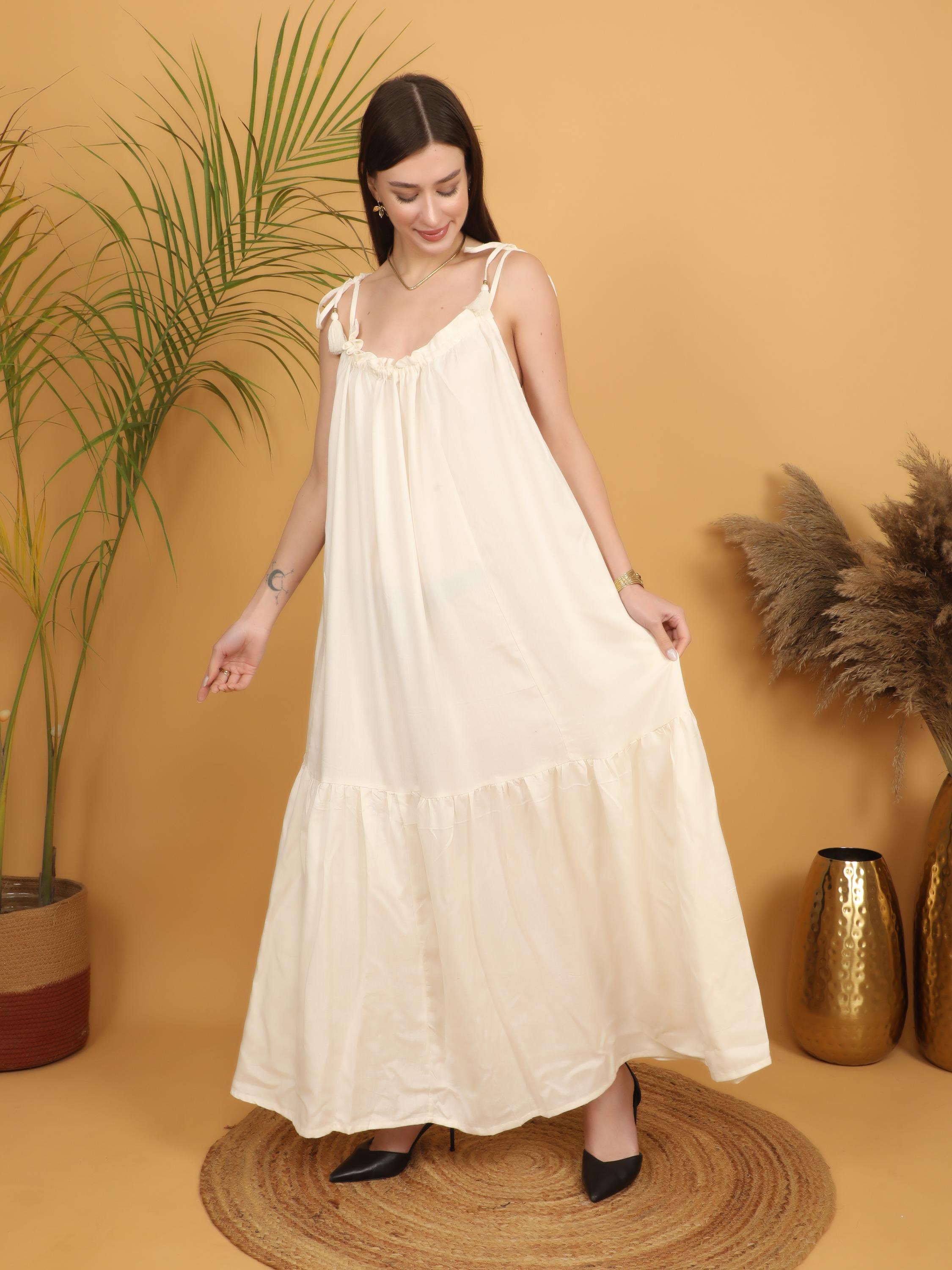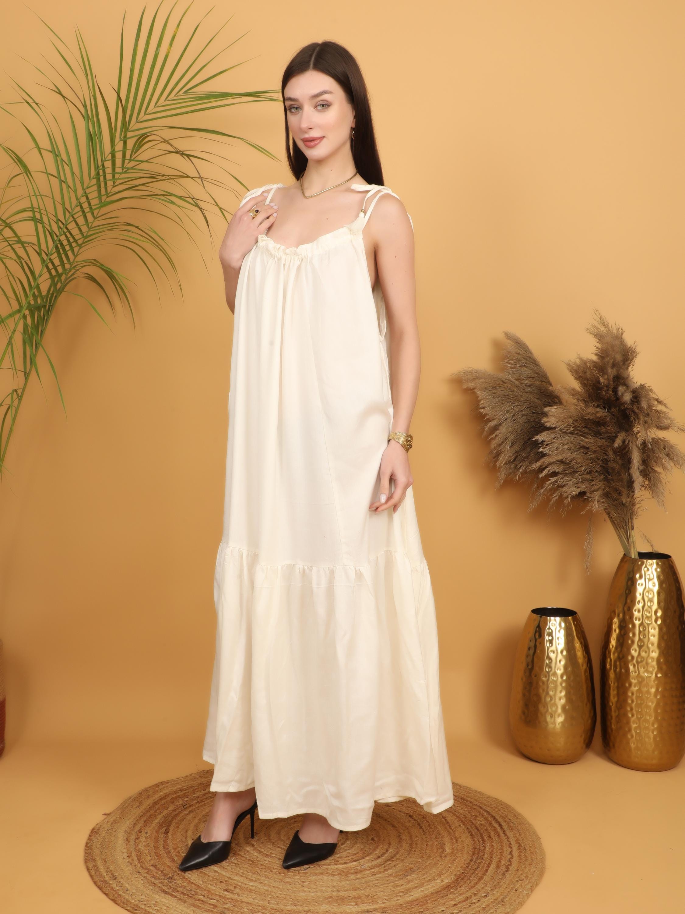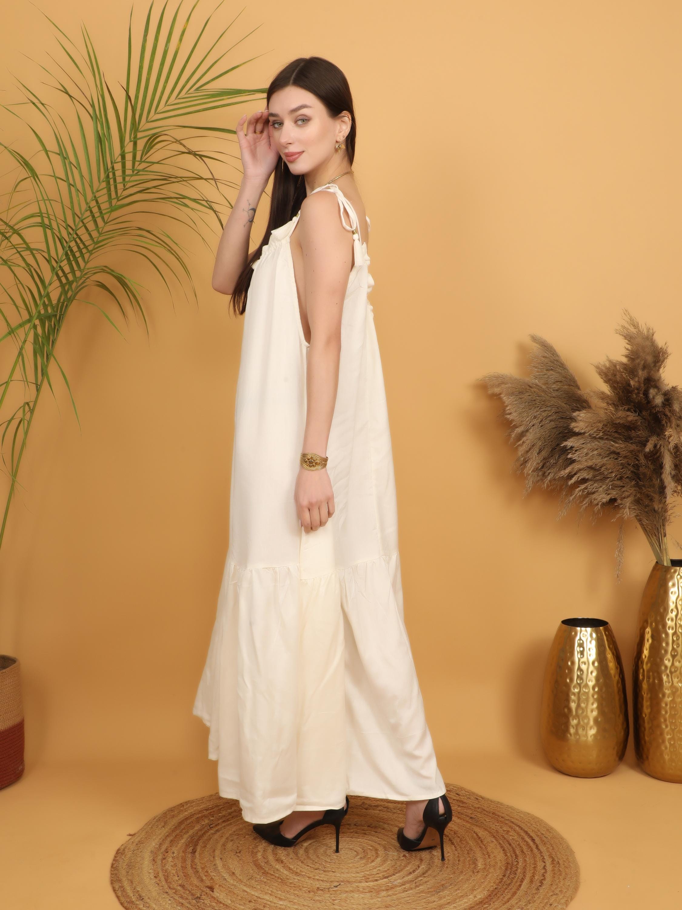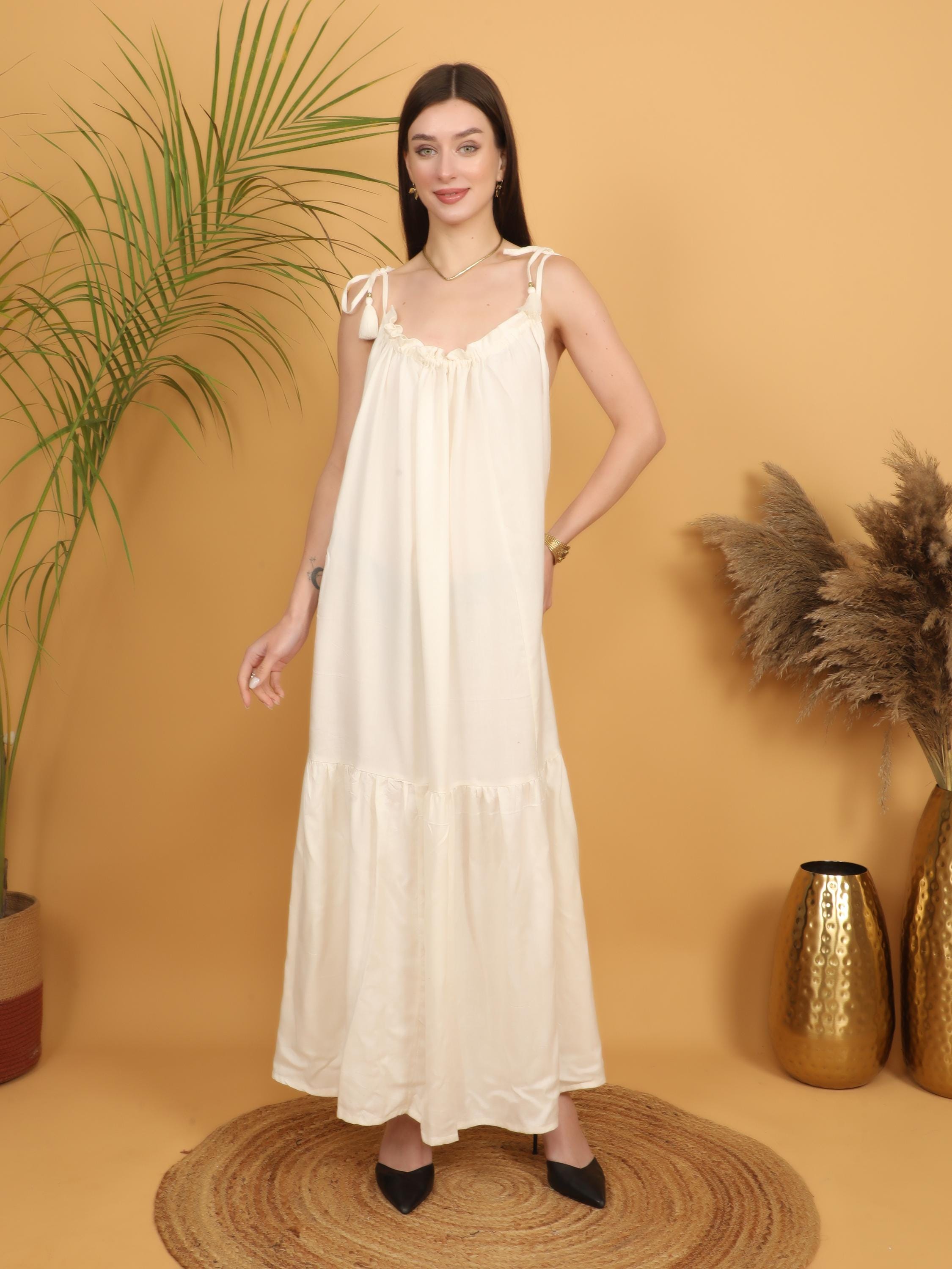 Soft, romantic, and effortlessly bohemian, this off white maxi dress is designed for the modern free spirit who values comfort and timeless elegance. Crafted from lightweight viscose, the fabric feels breathable and smooth against the skin while offering a fluid drape that moves beautifully with every step. Perfect for warm days, summer gatherings, and relaxed evening styling, this dress blends airy comfort with refined boho charm.