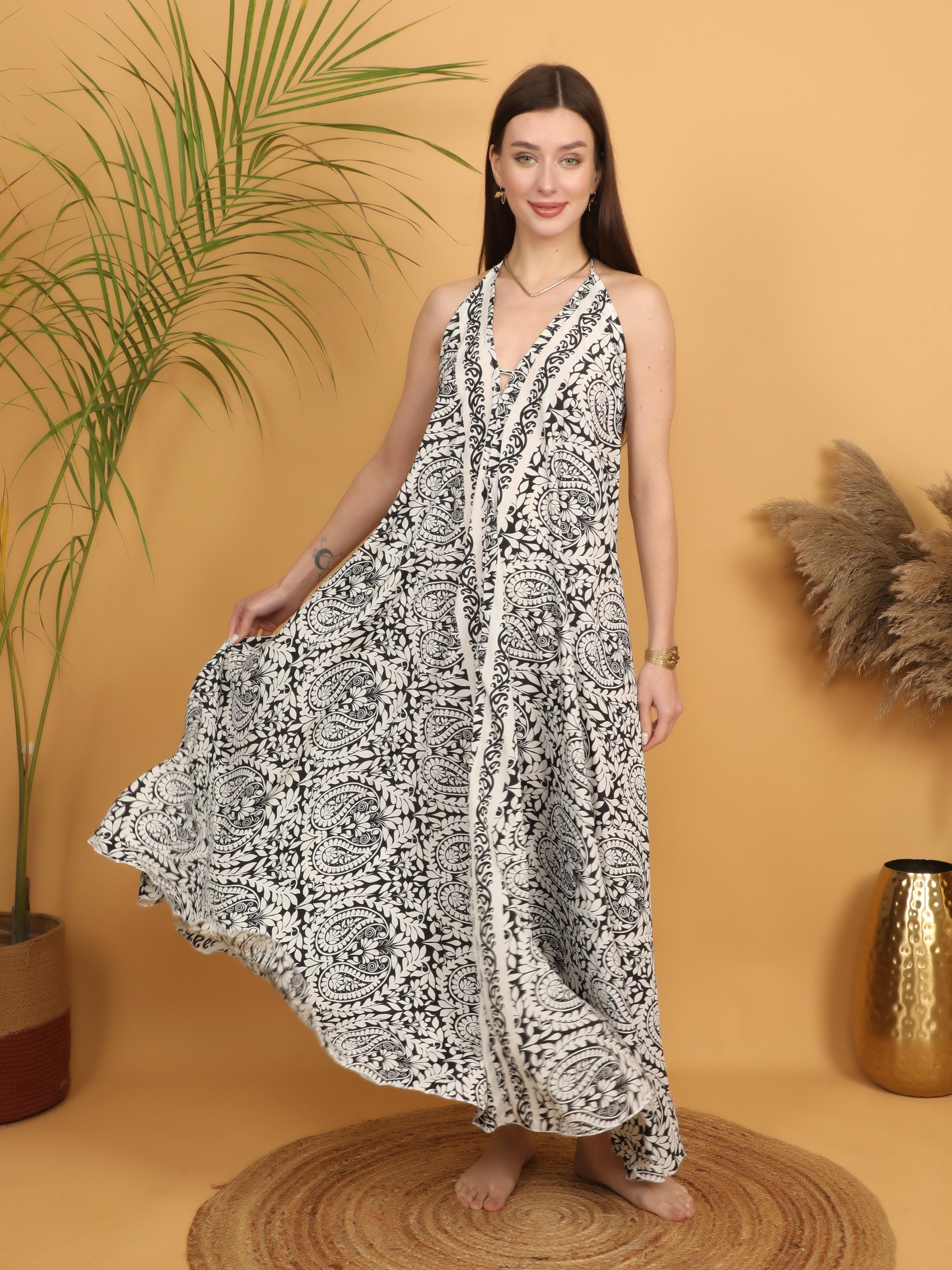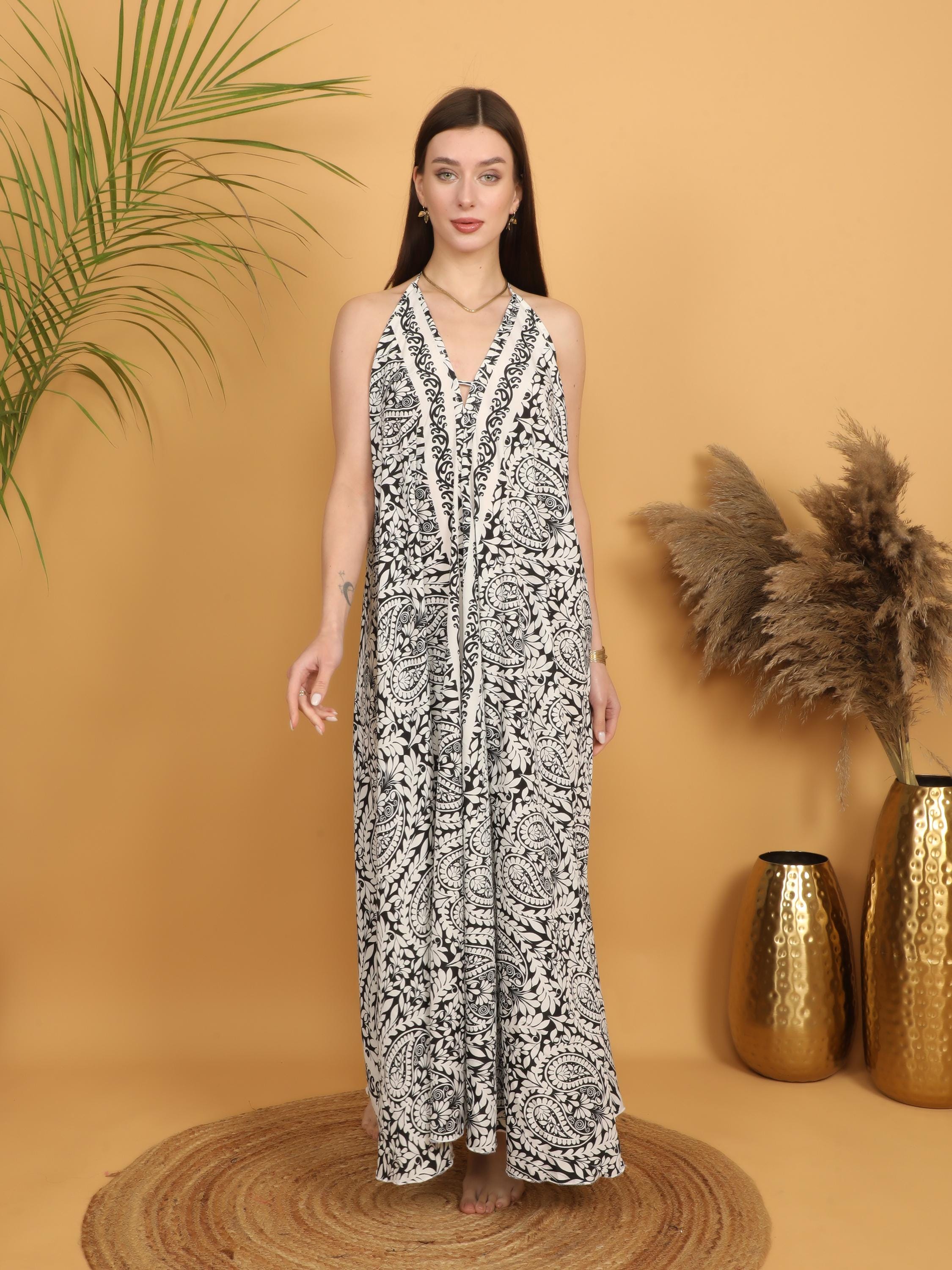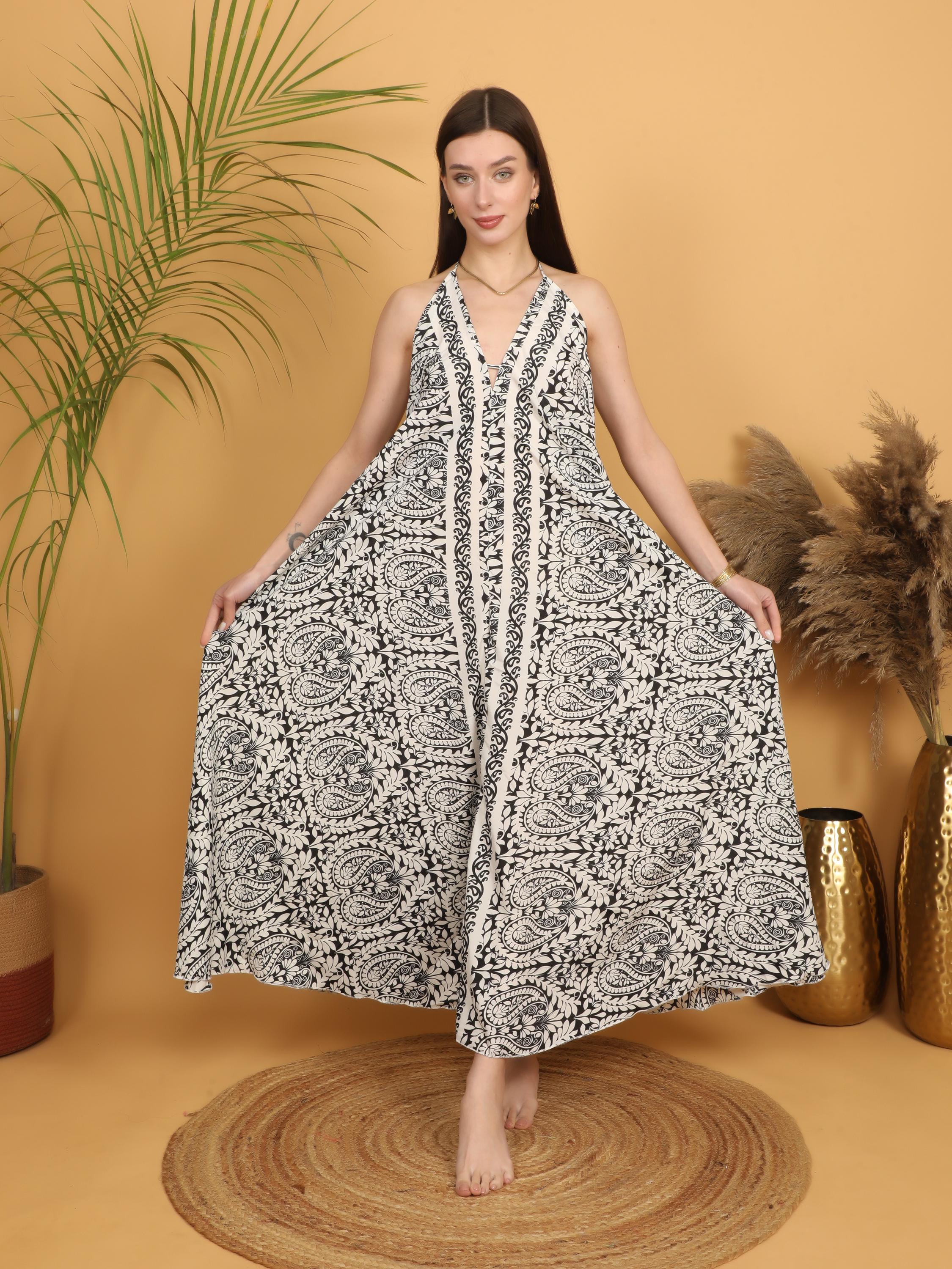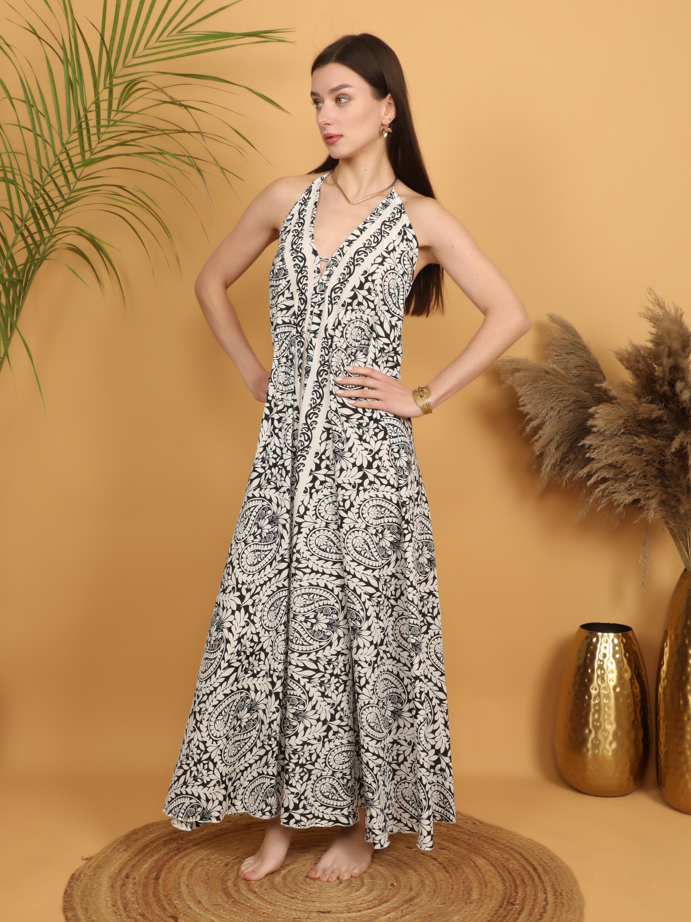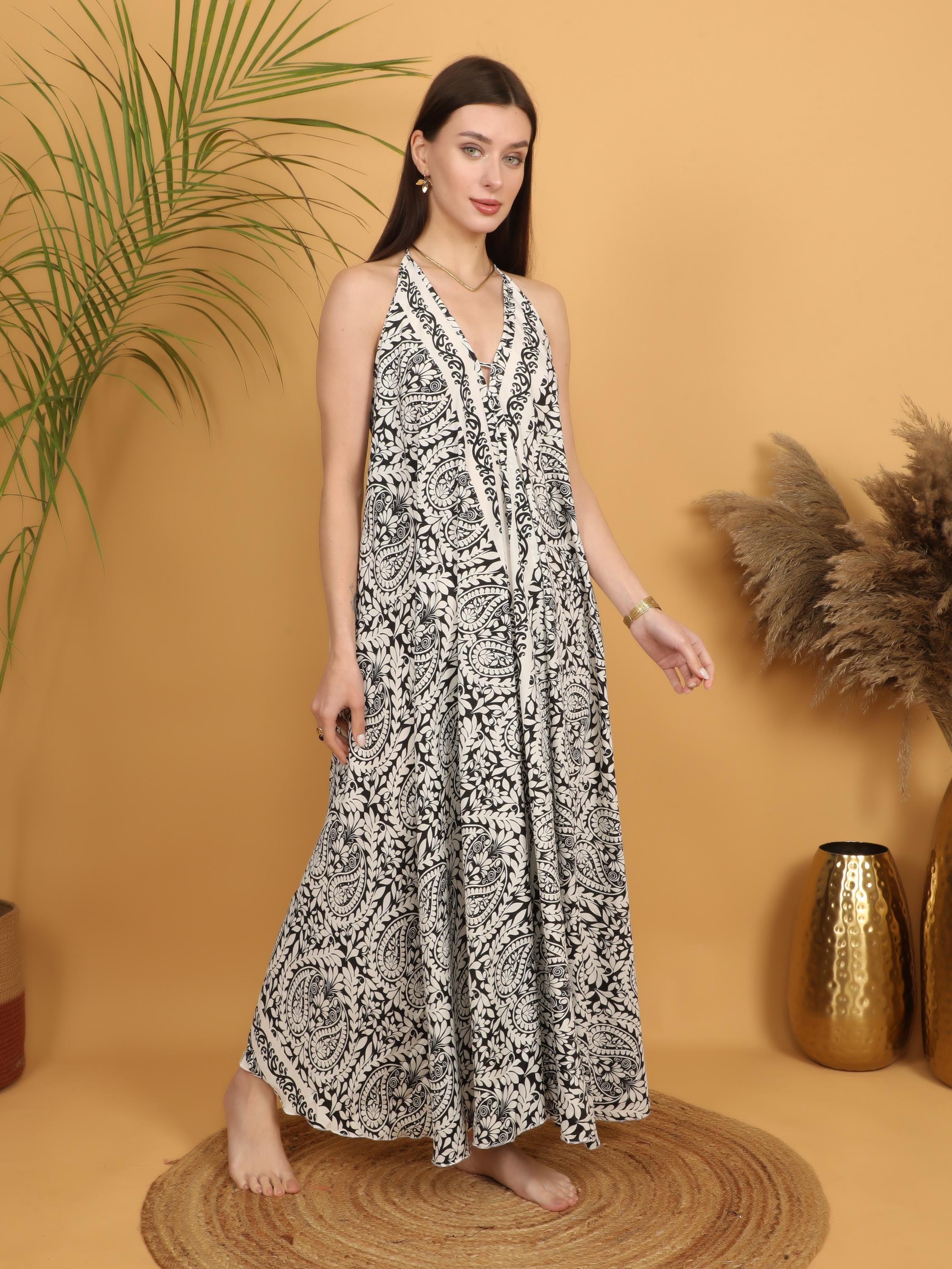 Designed with a flattering halter neckline and a deep V front, this maxi dress highlights the neckline while maintaining an easy, relaxed fit through the body. The full-length hemline moves beautifully, creating an elegant statement with minimal effort. Whether styled with sandals for a casual daytime look or dressed up with accessories for an evening gathering, this off white and black paisley maxi dress offers timeless versatility with a modern bohemian spirit.