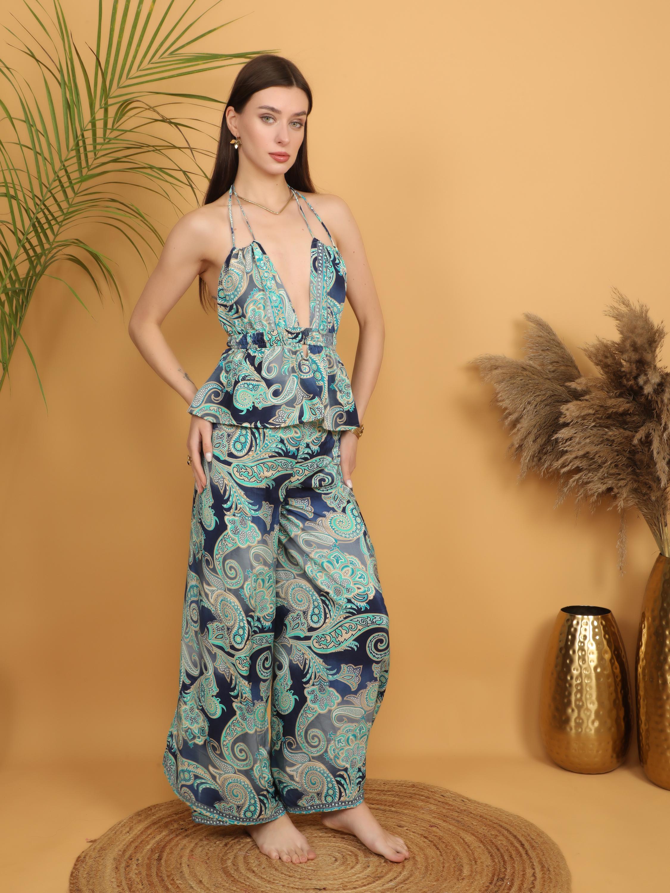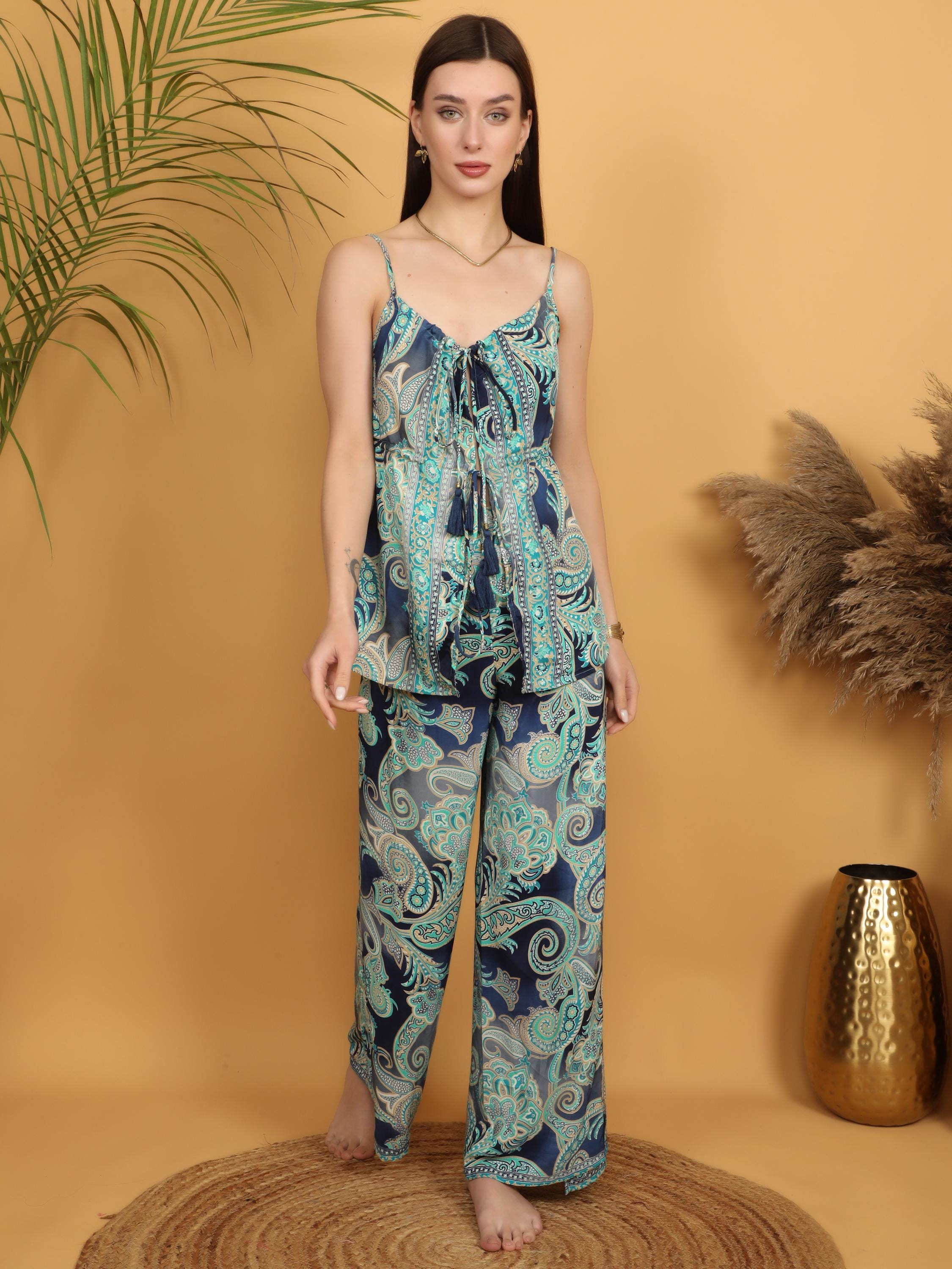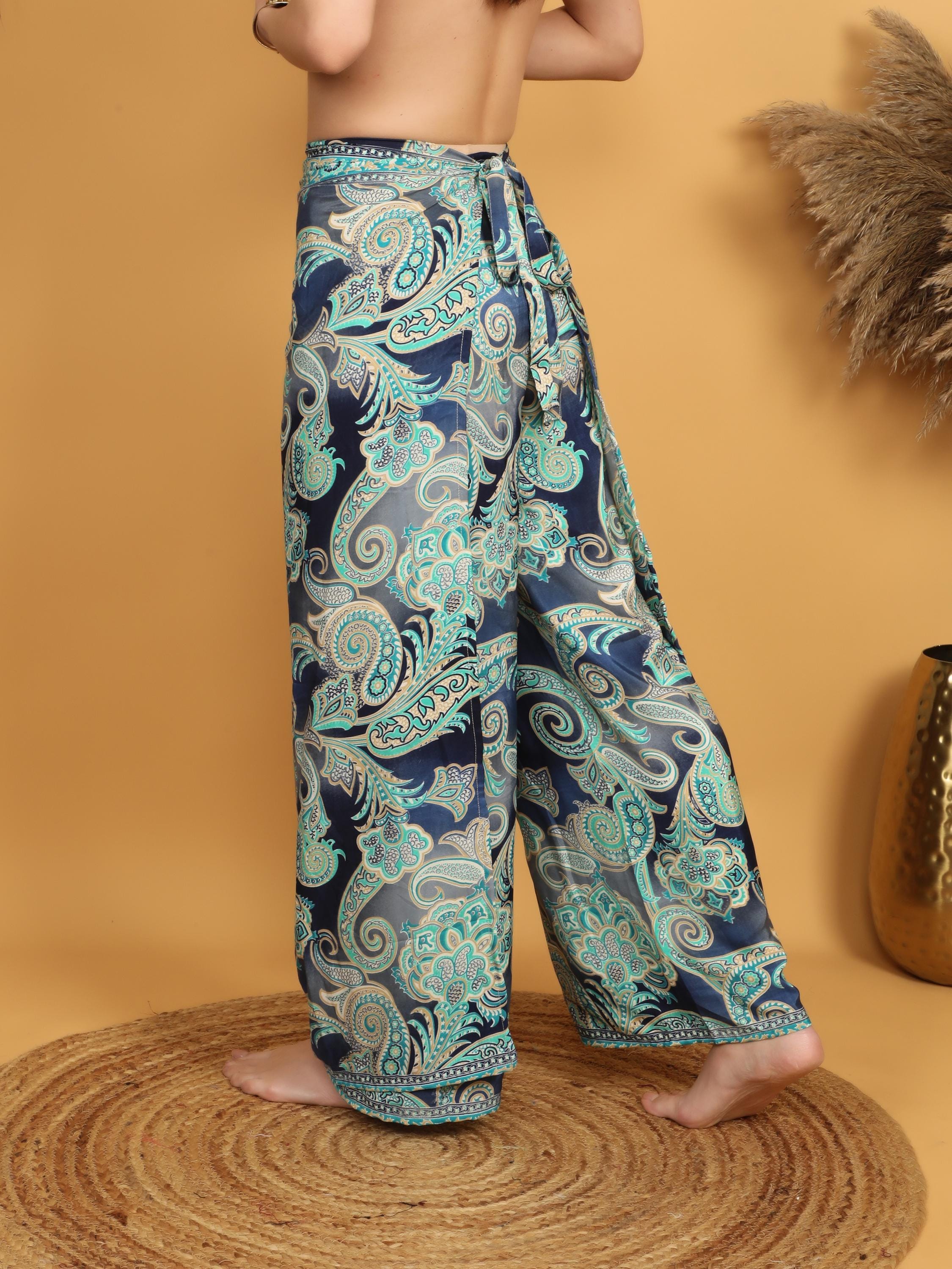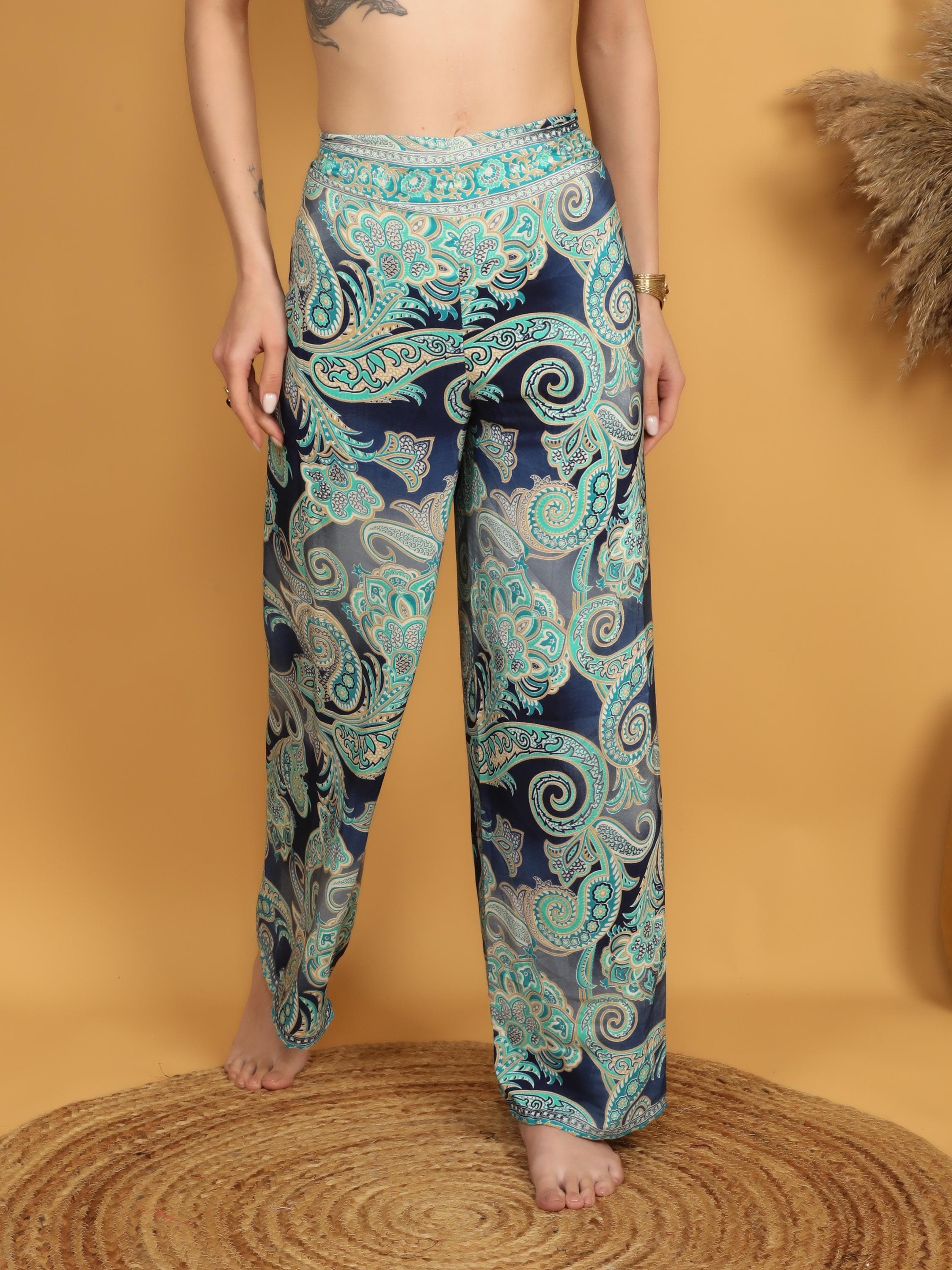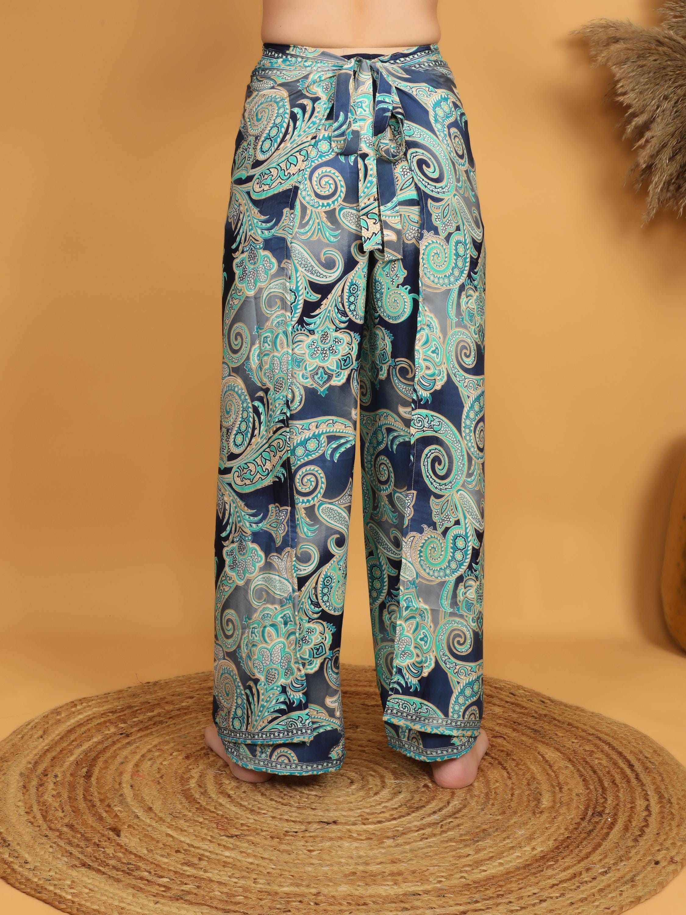 Versatile and eye-catching, these paisley pareo pants pair effortlessly with fitted tops, cropped blouses, or simple tanks for a balanced boho look. Whether styled casually or dressed up with accessories, they deliver movement, comfort, and timeless bohemian charm in one standout piece.
