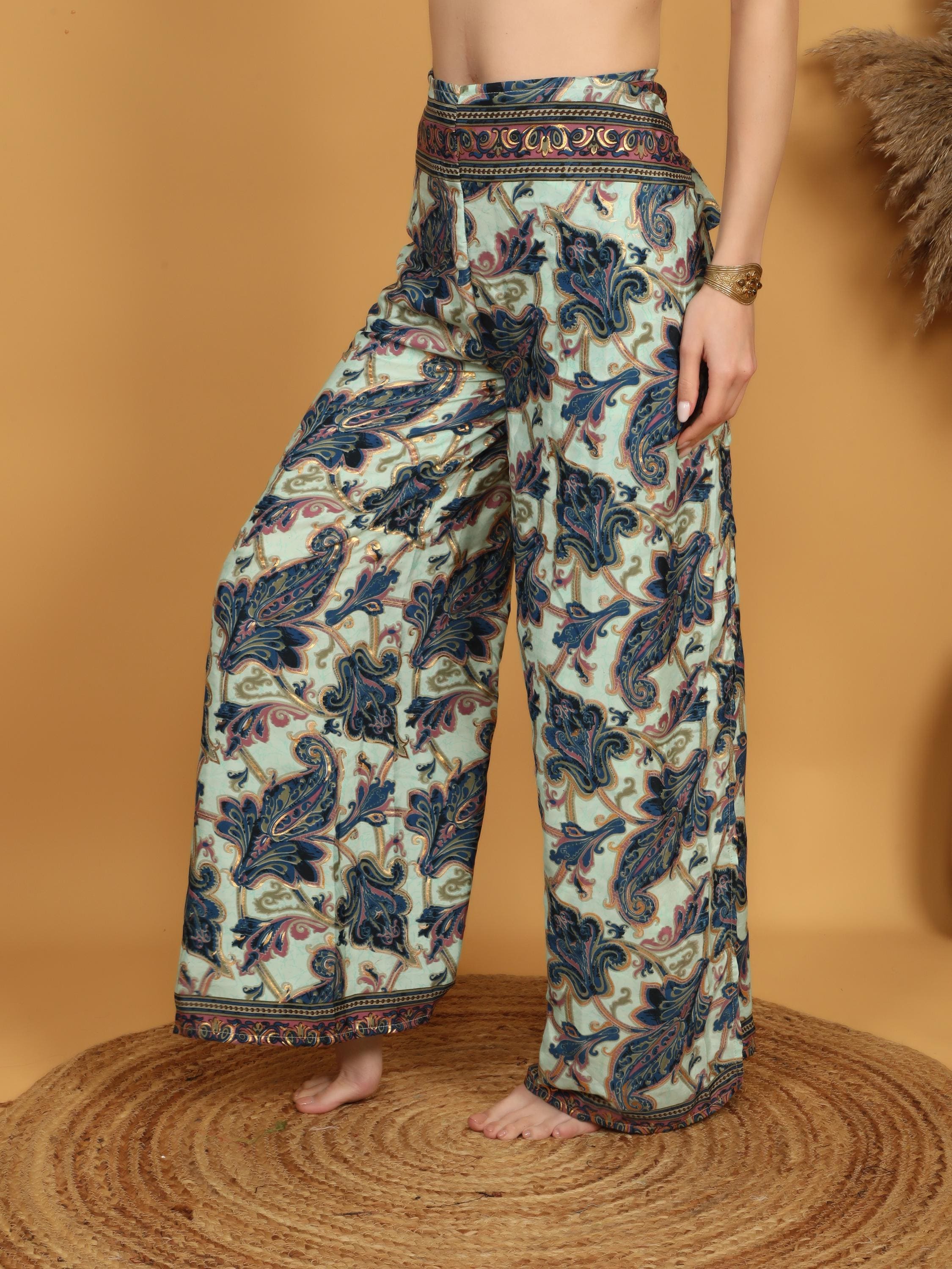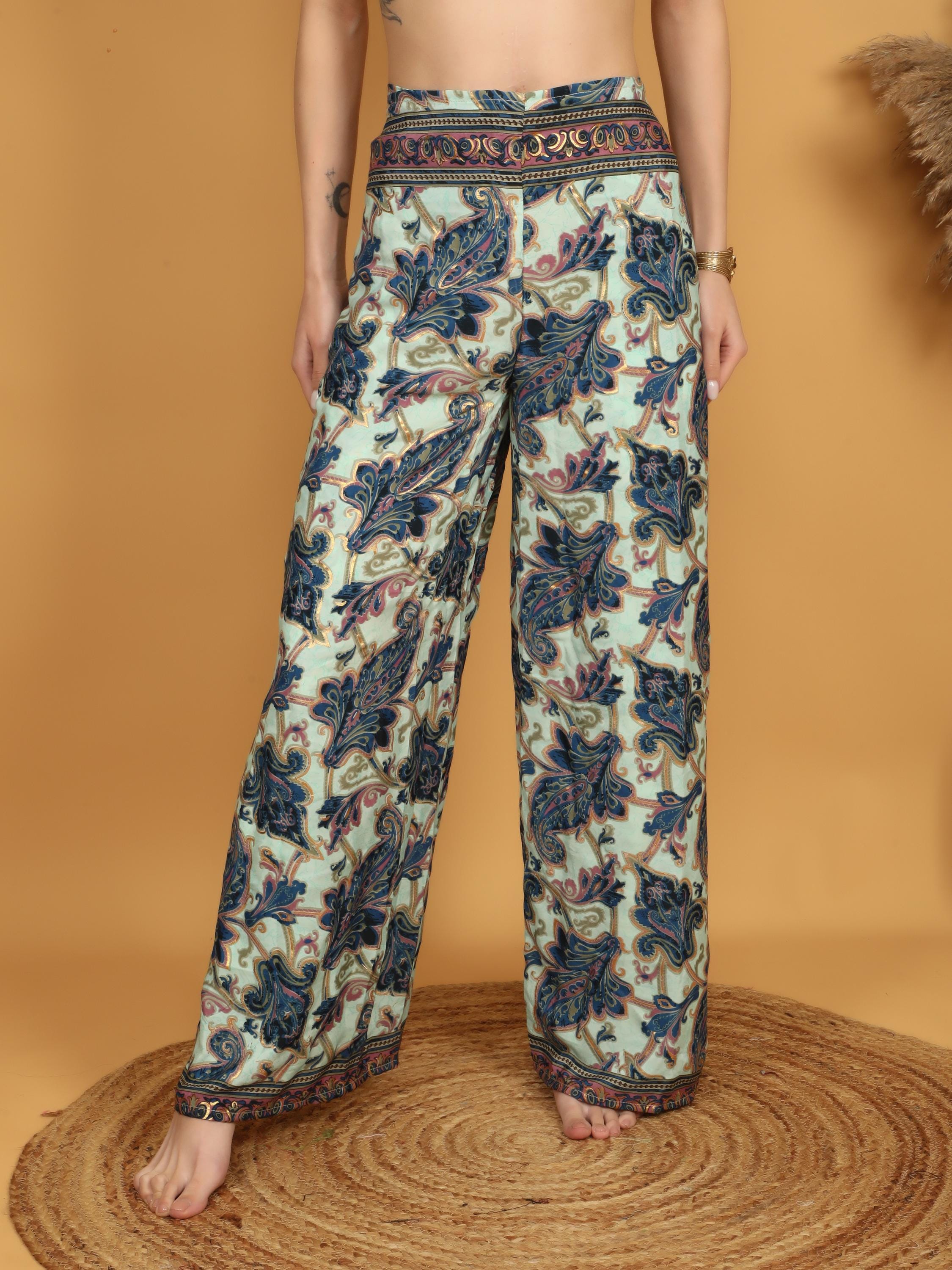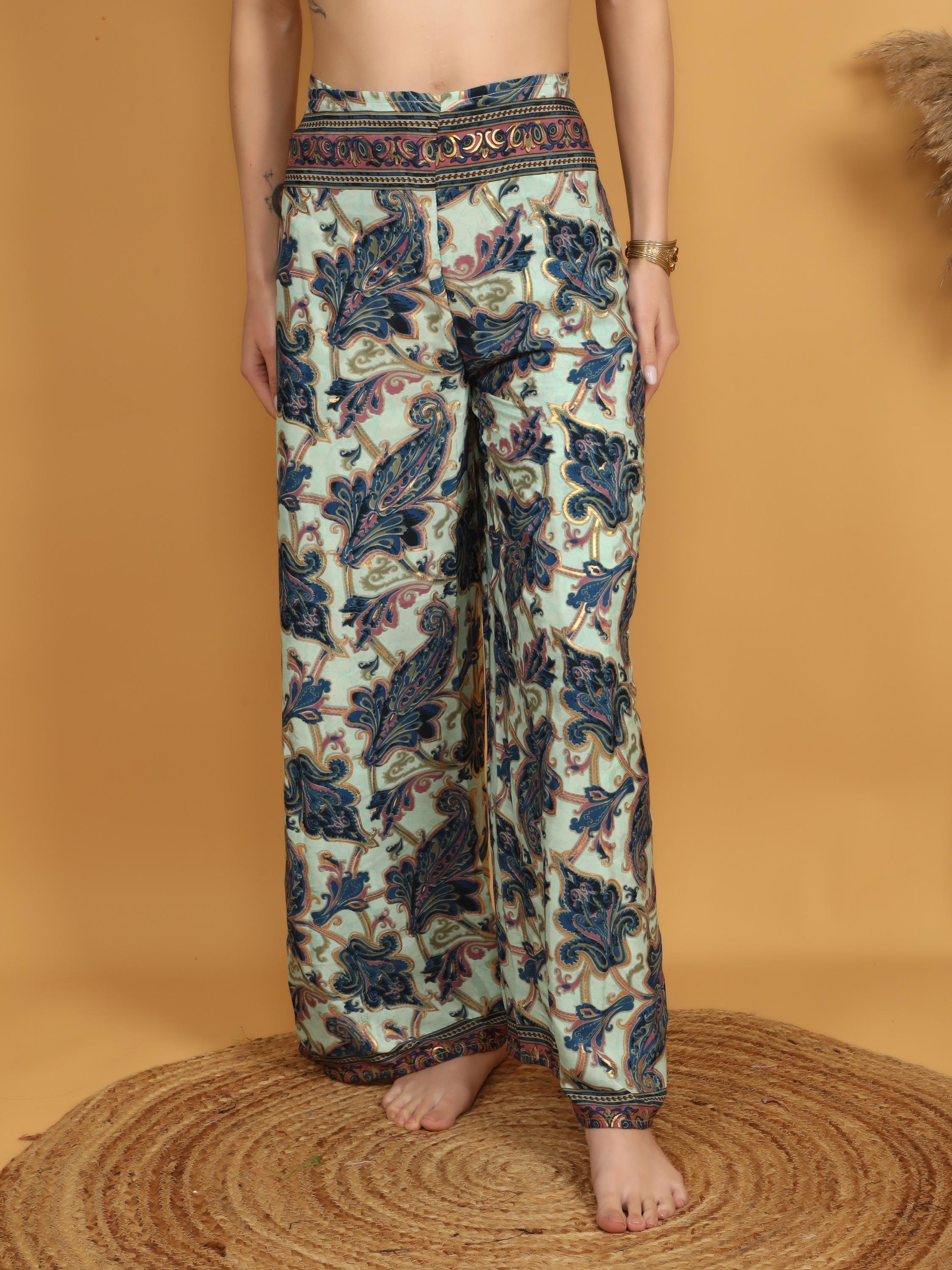 The print features large ornamental paisley and floral motifs flowing across the fabric in an artistic, symmetrical composition. Decorative border details at the waistband and hem frame the design beautifully, giving the pants a polished yet expressive finish. The wide leg cut enhances movement, allowing the fabric to flow effortlessly with every step.