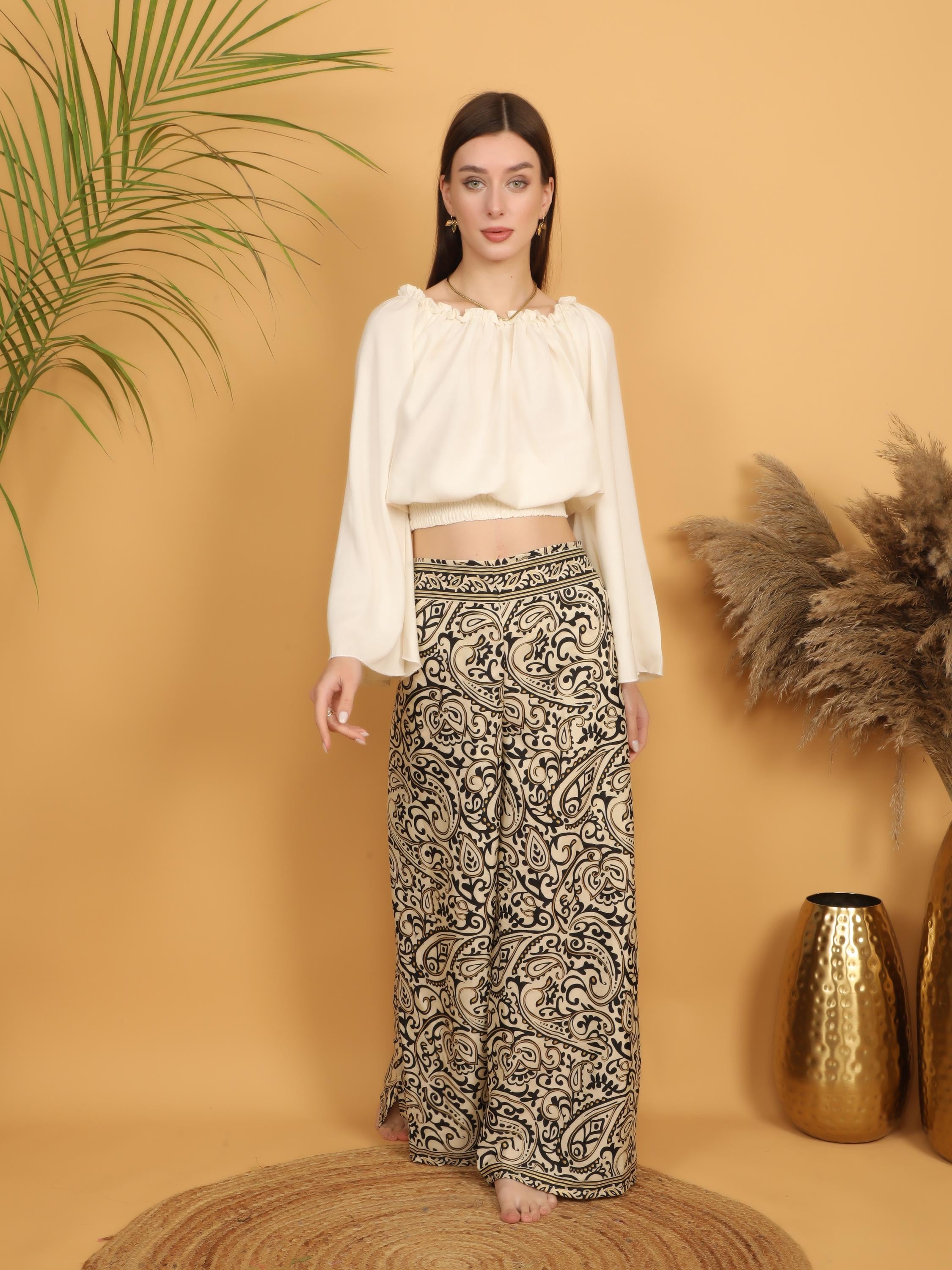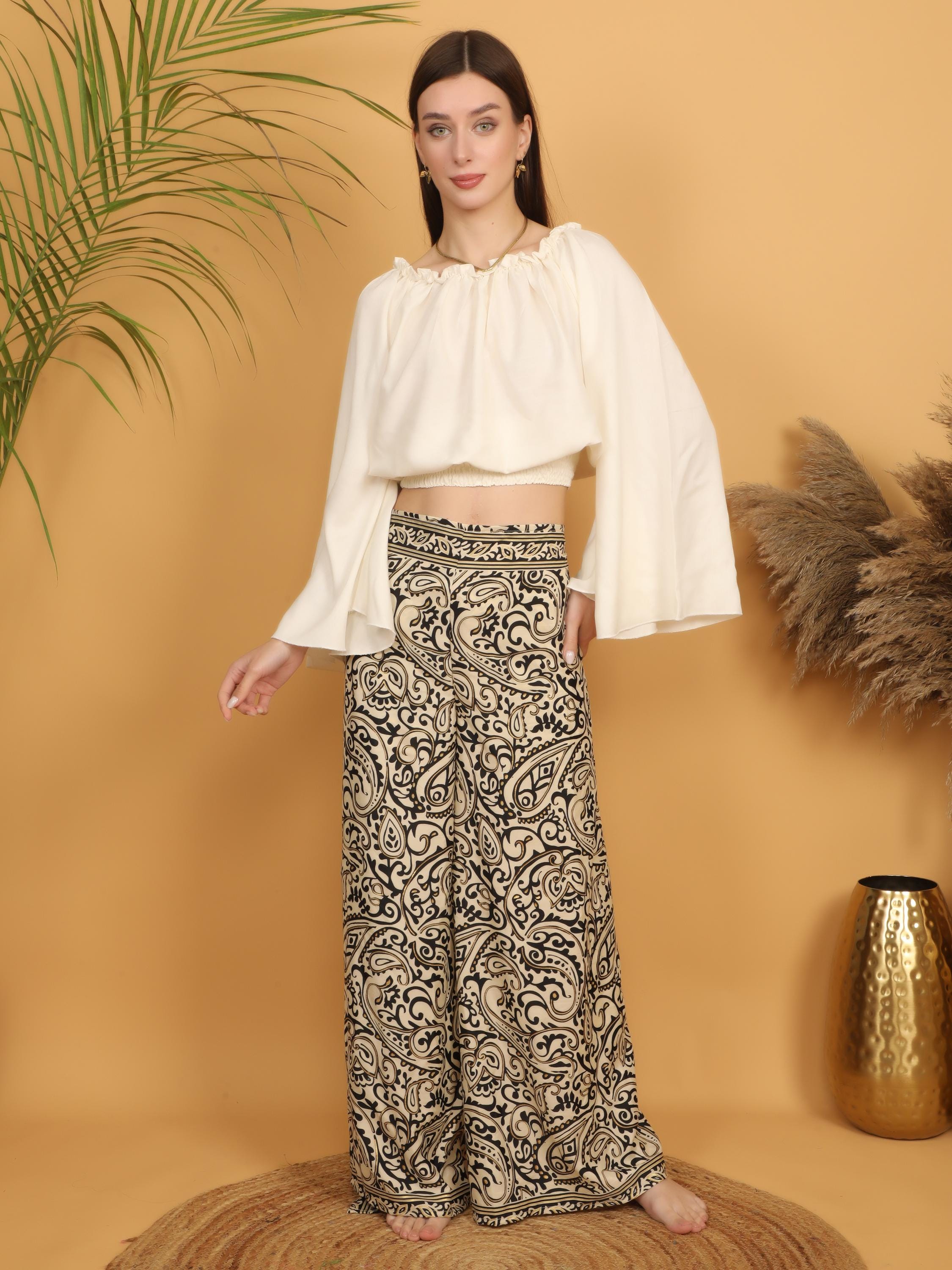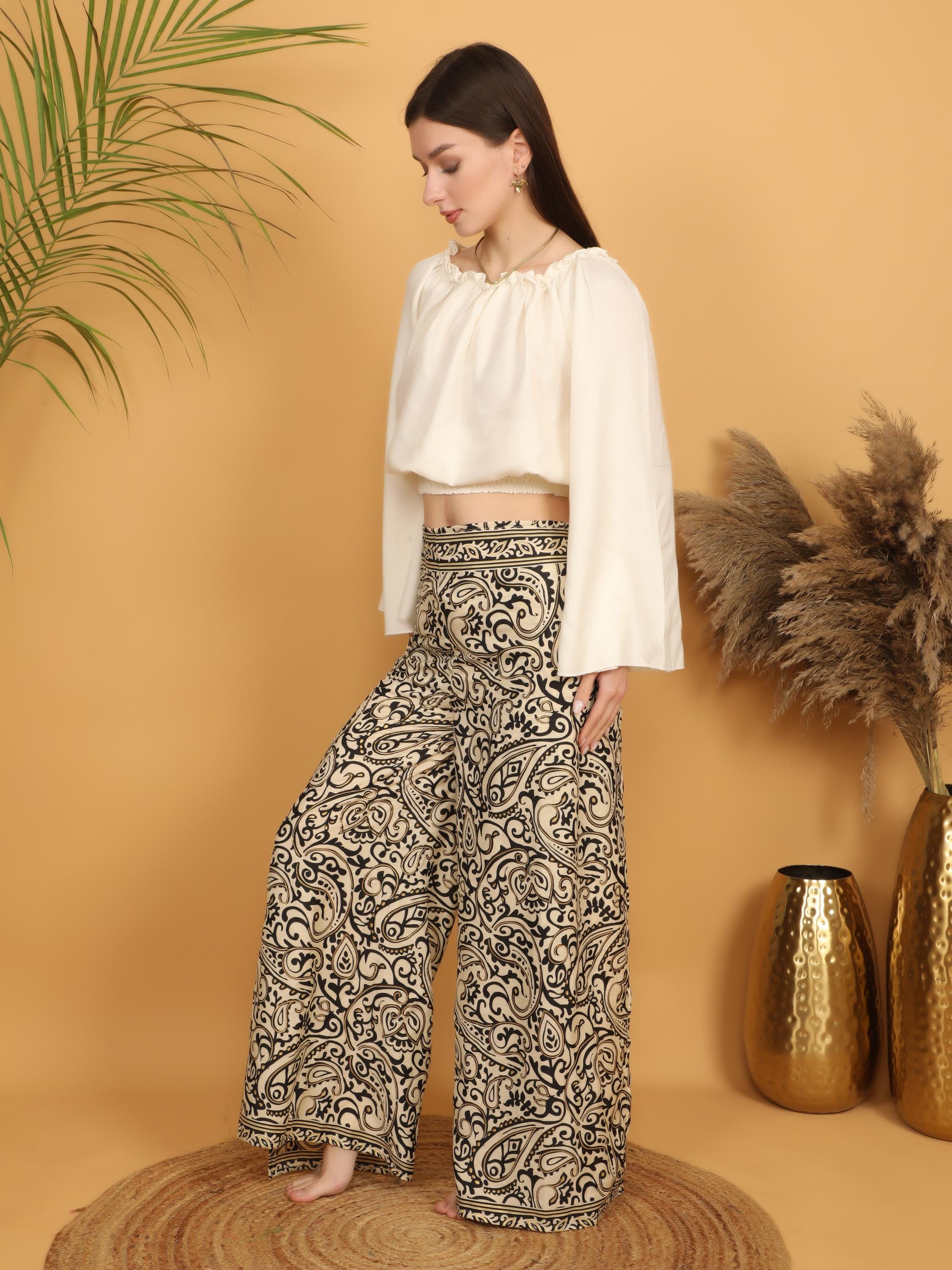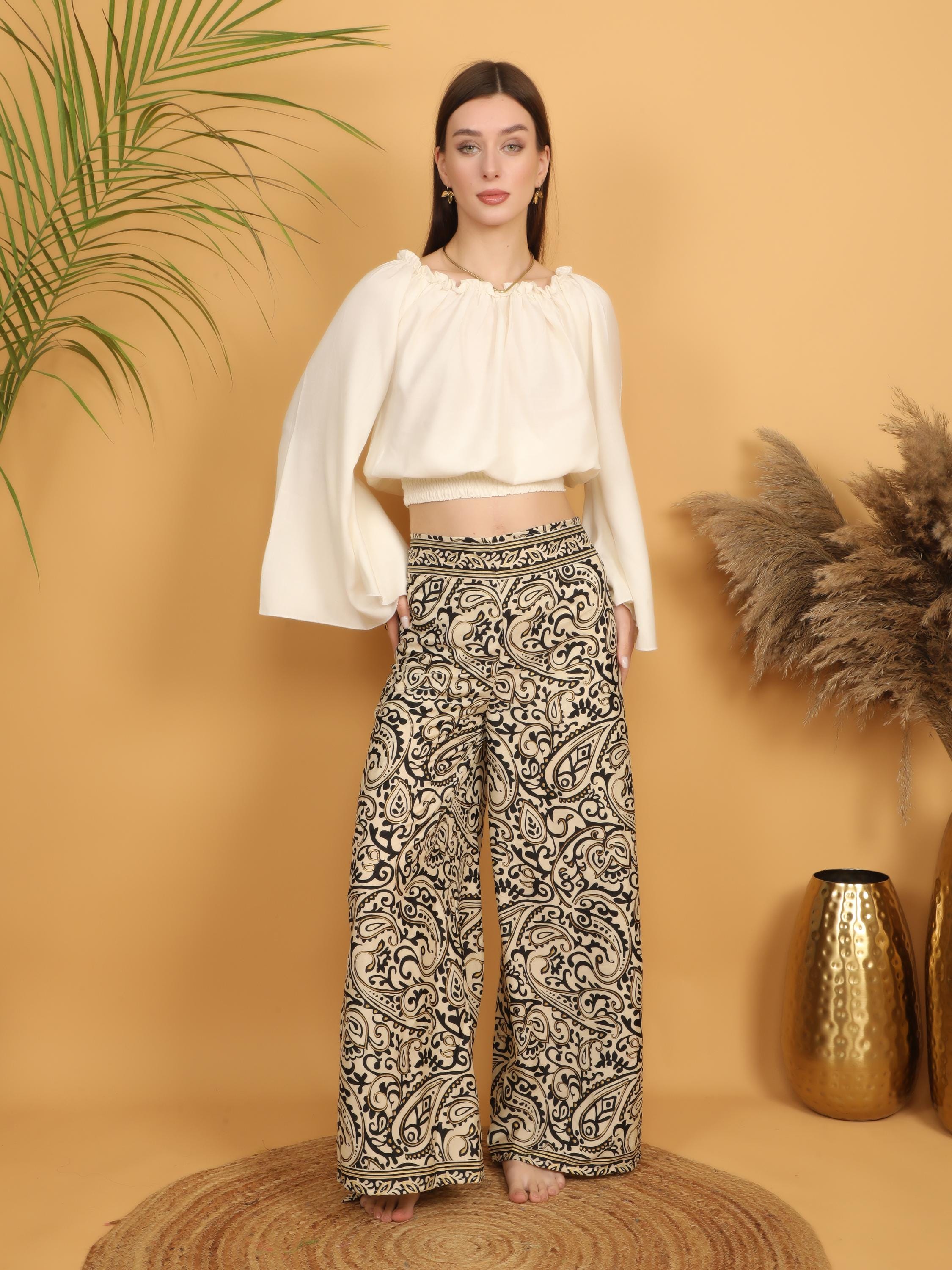 Perfect for creating effortless statement outfits, these boho wrap trousers pair beautifully with cropped tops, flowy blouses, or layered jewelry for a confident, free-spirited look. Whether styled casually or dressed up, they bring artistic charm and individuality to any wardrobe.