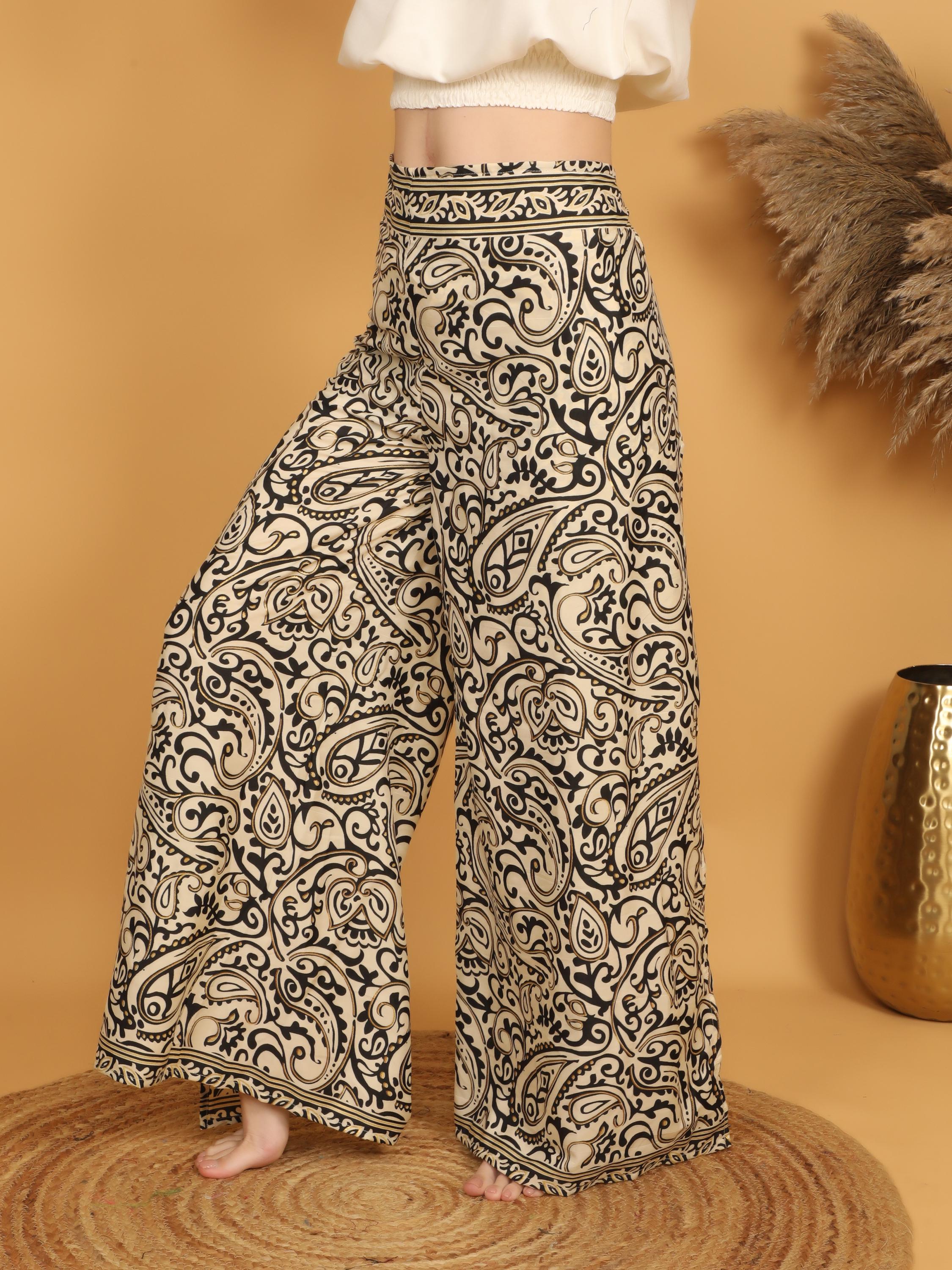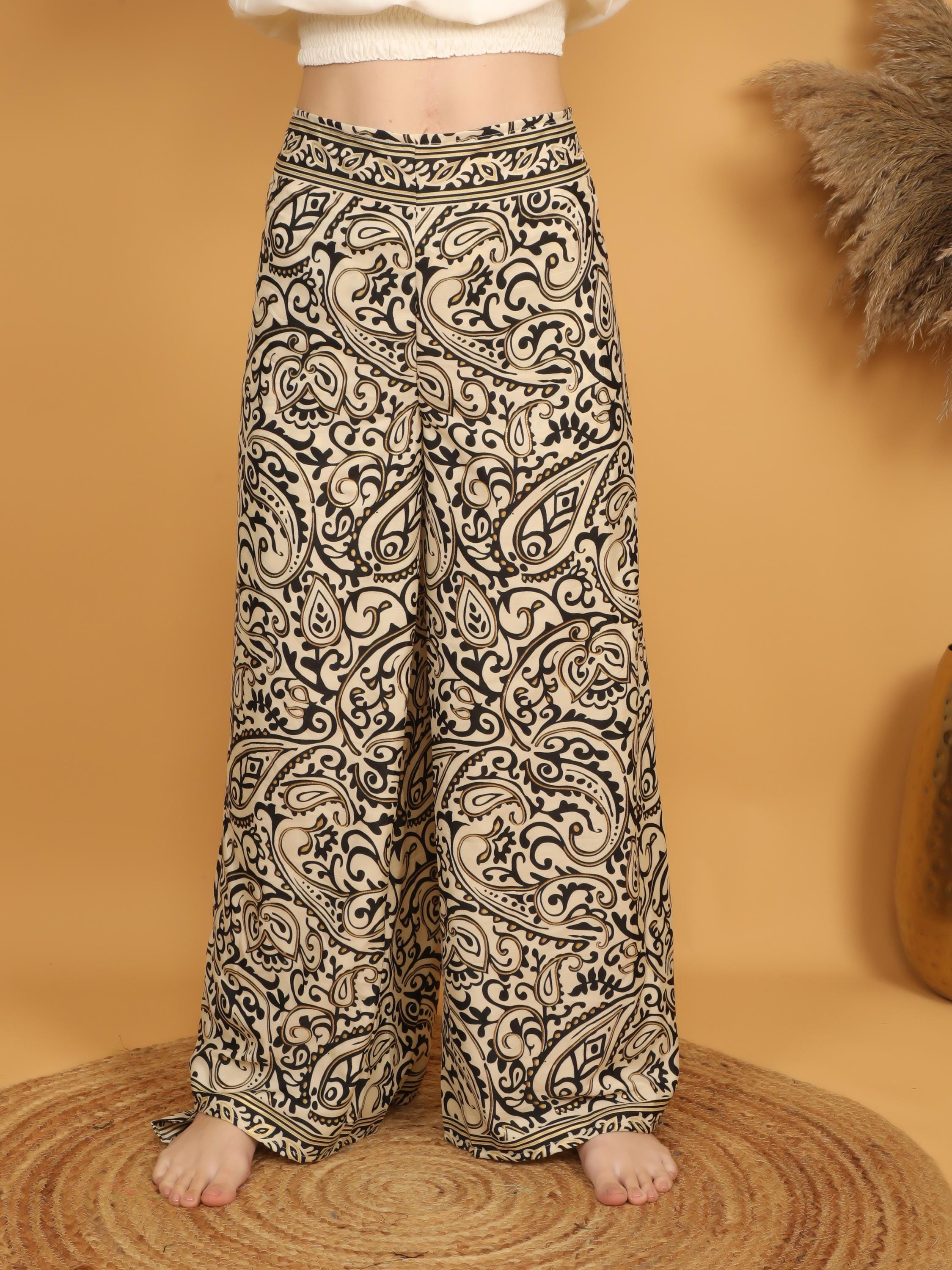 The paisley design is rich and expressive, filled with swirling ornamental details and artistic flourishes that embody authentic boho style. Decorative border accents at the waistband and hem frame the trousers beautifully, giving them a polished and intentional look. The wide leg cut adds fluidity and elongates the silhouette, making these pants both comfortable and visually striking.
