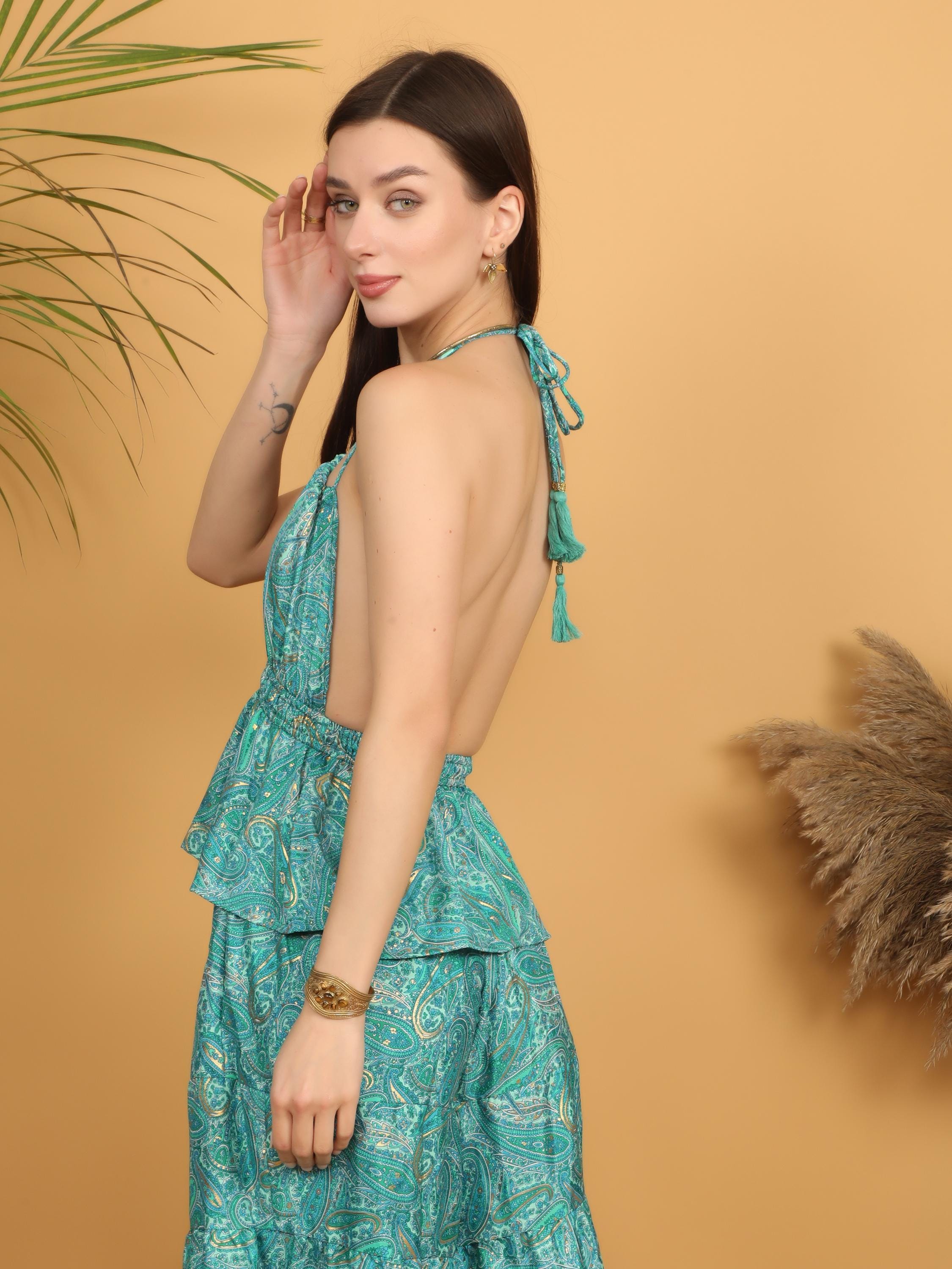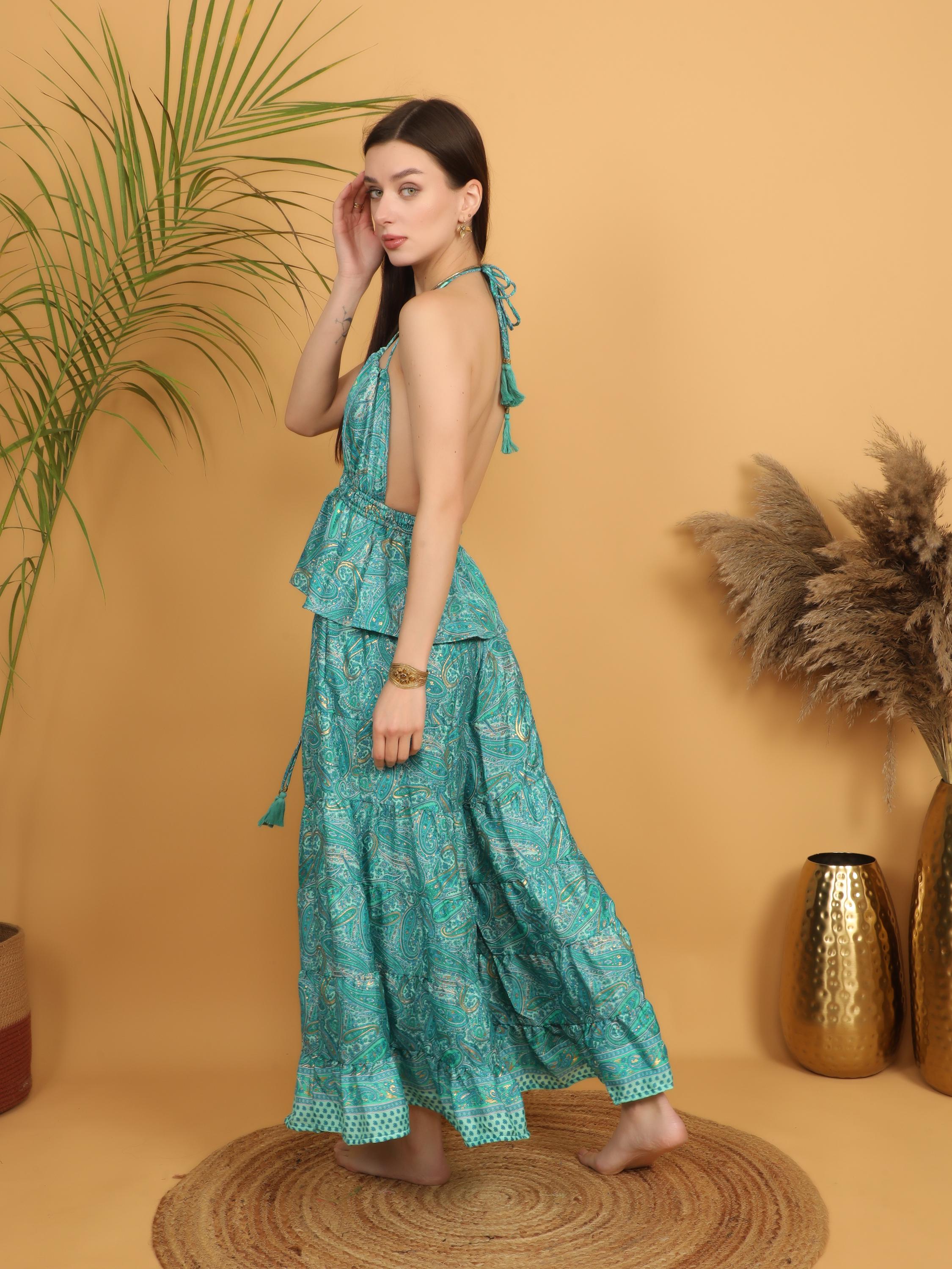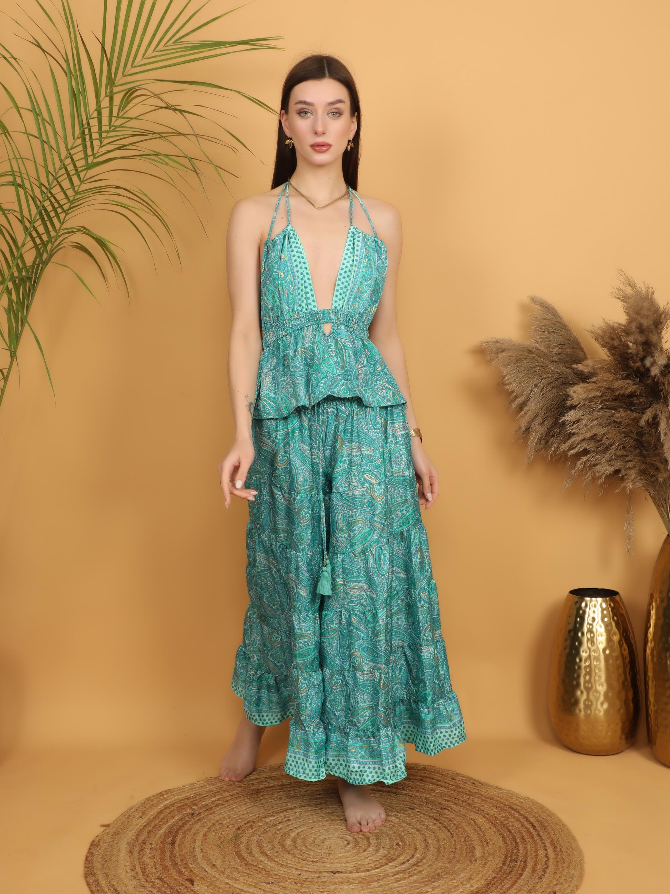 This stunning turquoise paisley halter top is made for true boho lovers who appreciate rich details and effortless elegance. The vibrant turquoise green base is enhanced with intricate paisley motifs featuring subtle golden highlights woven into the print, adding a soft luminous touch that catches the light beautifully.