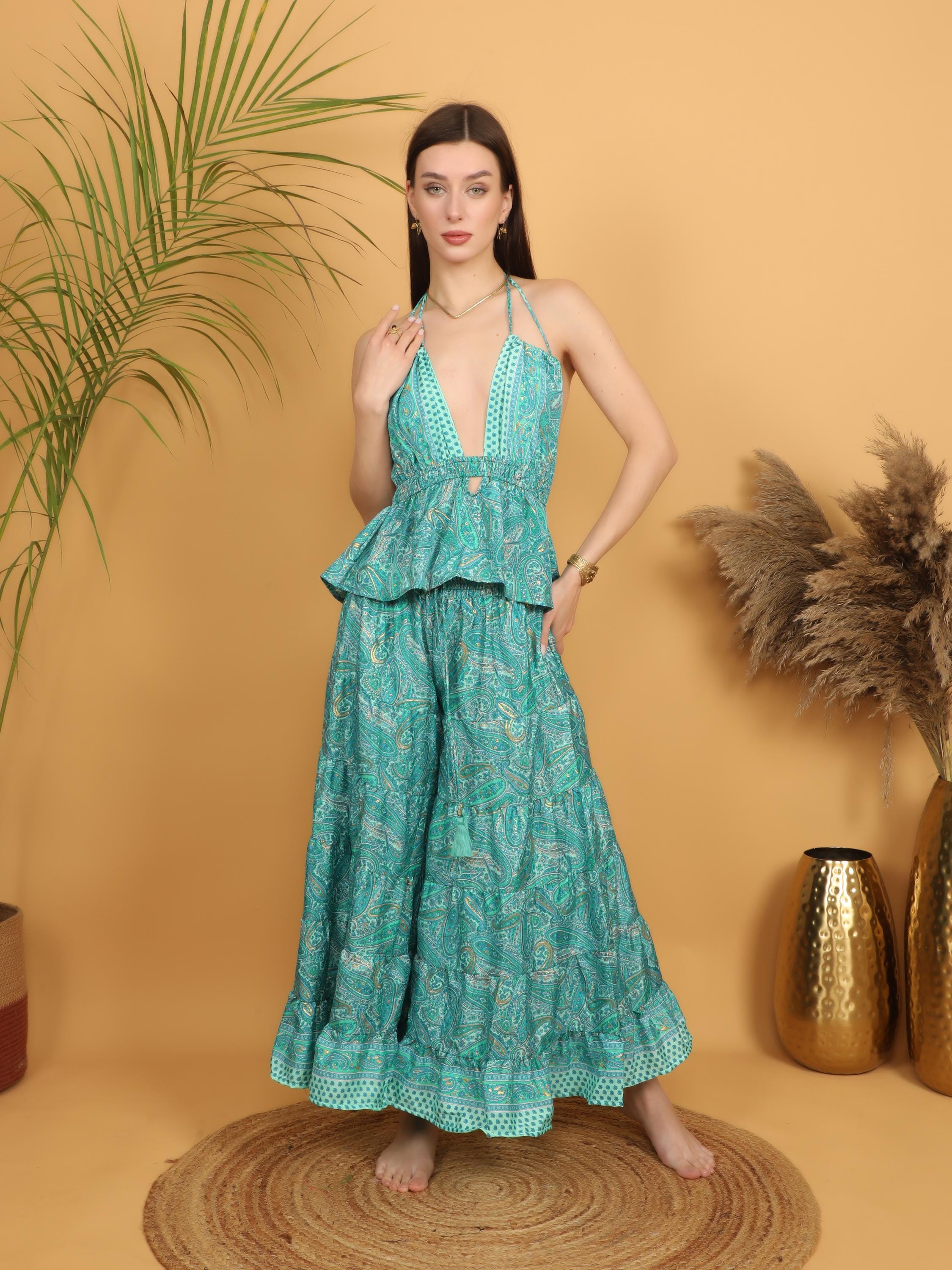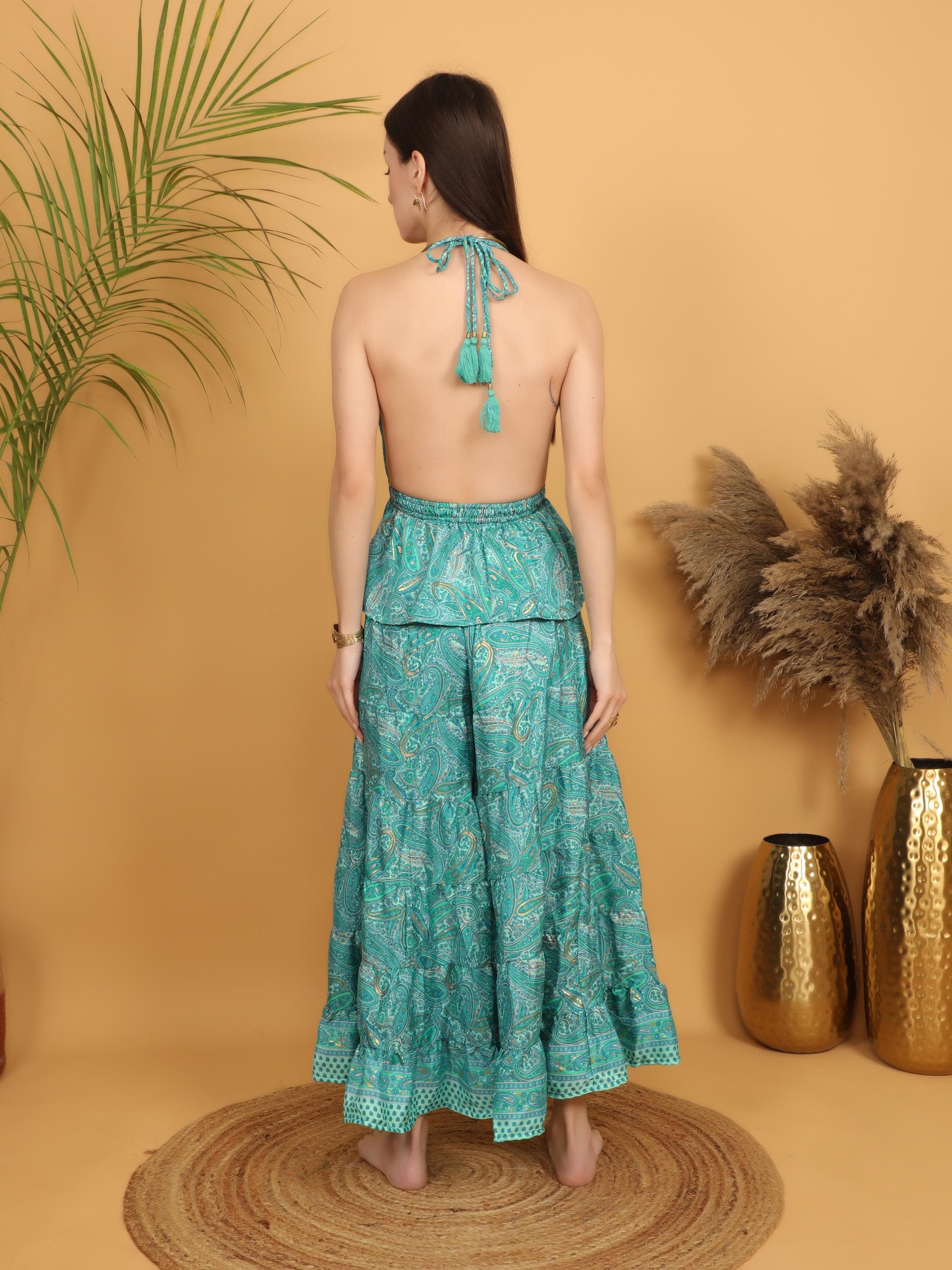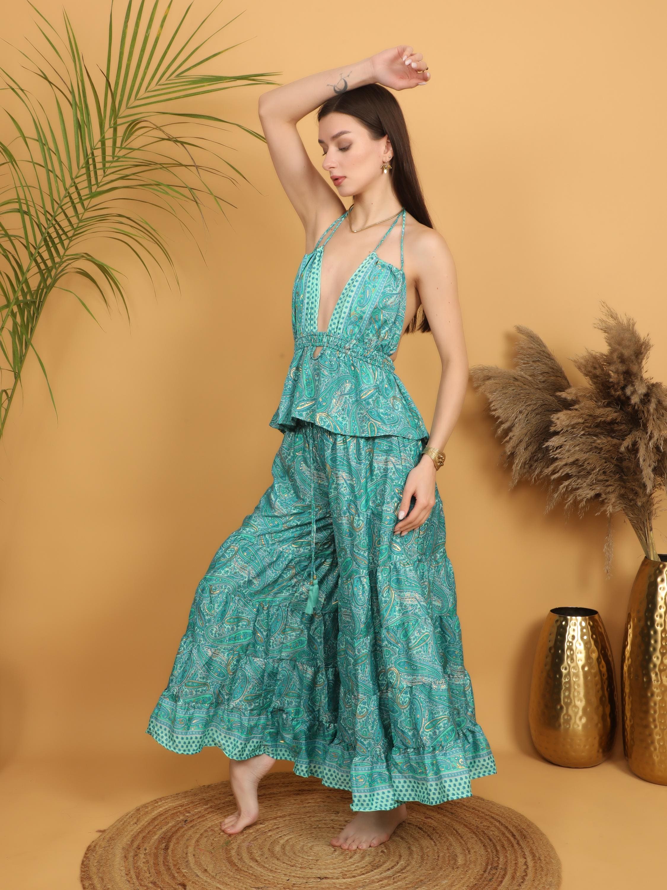This stunning turquoise paisley halter top is made for true boho lovers who appreciate rich details and effortless elegance. The vibrant turquoise green base is enhanced with intricate paisley motifs featuring subtle golden highlights woven into the print, adding a soft luminous touch that catches the light beautifully.