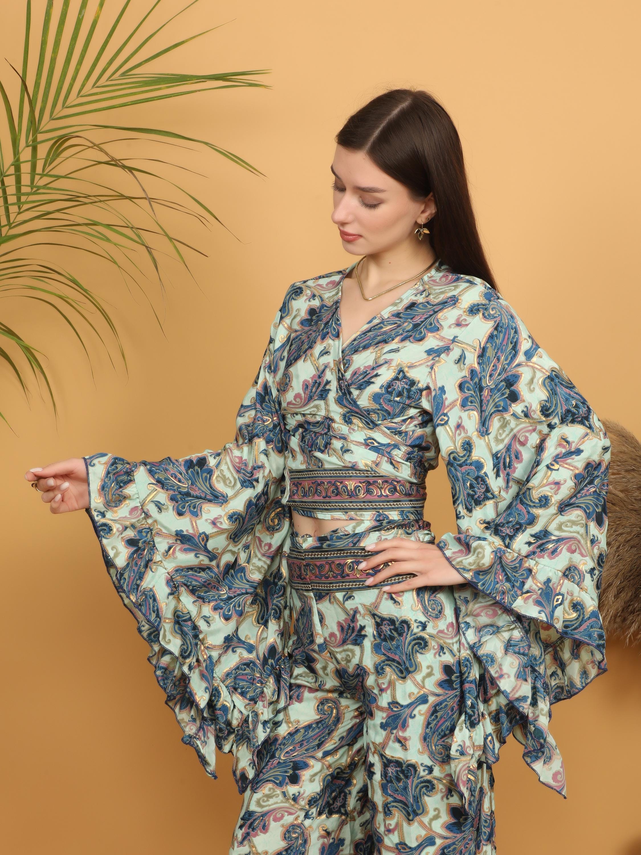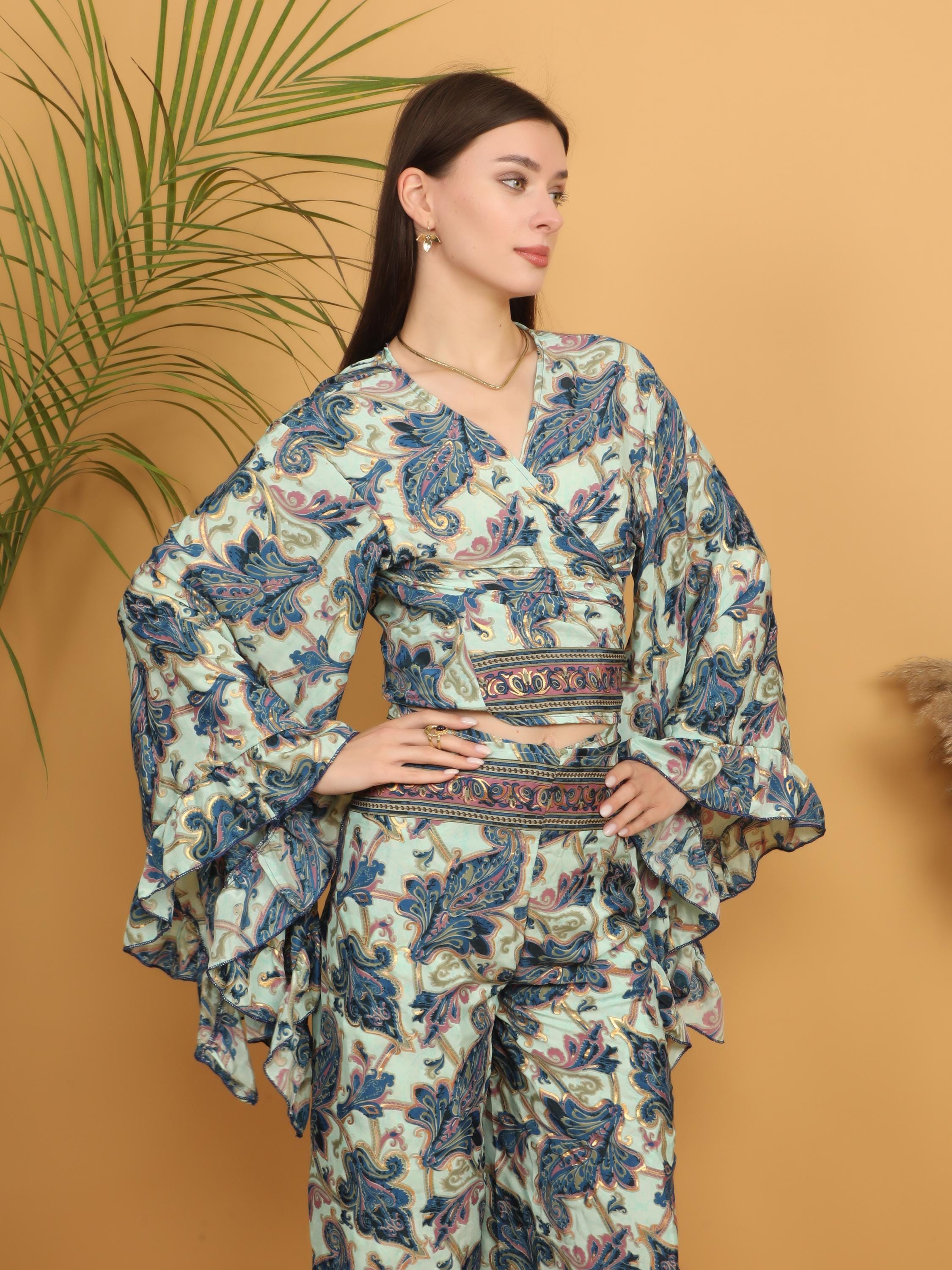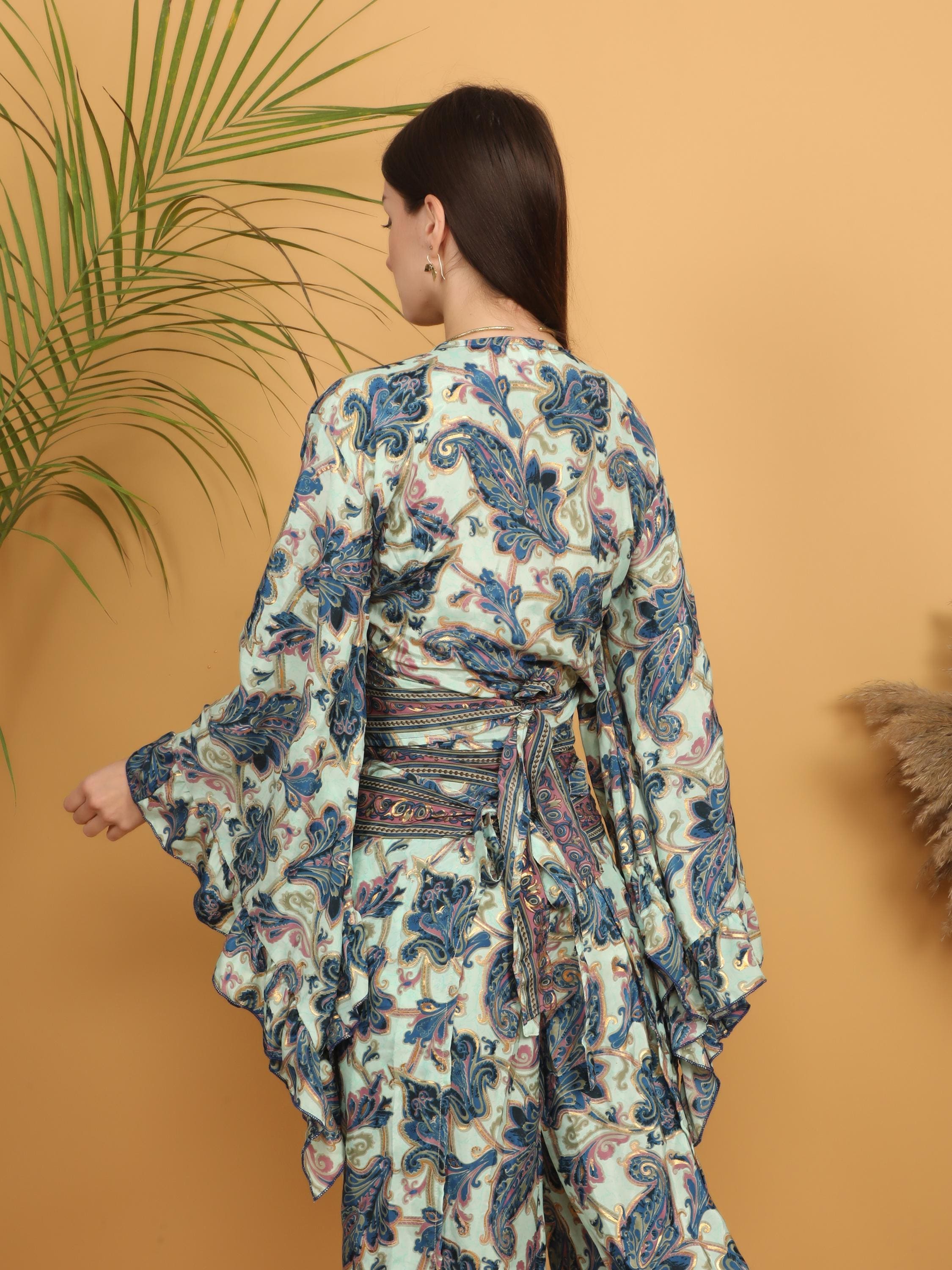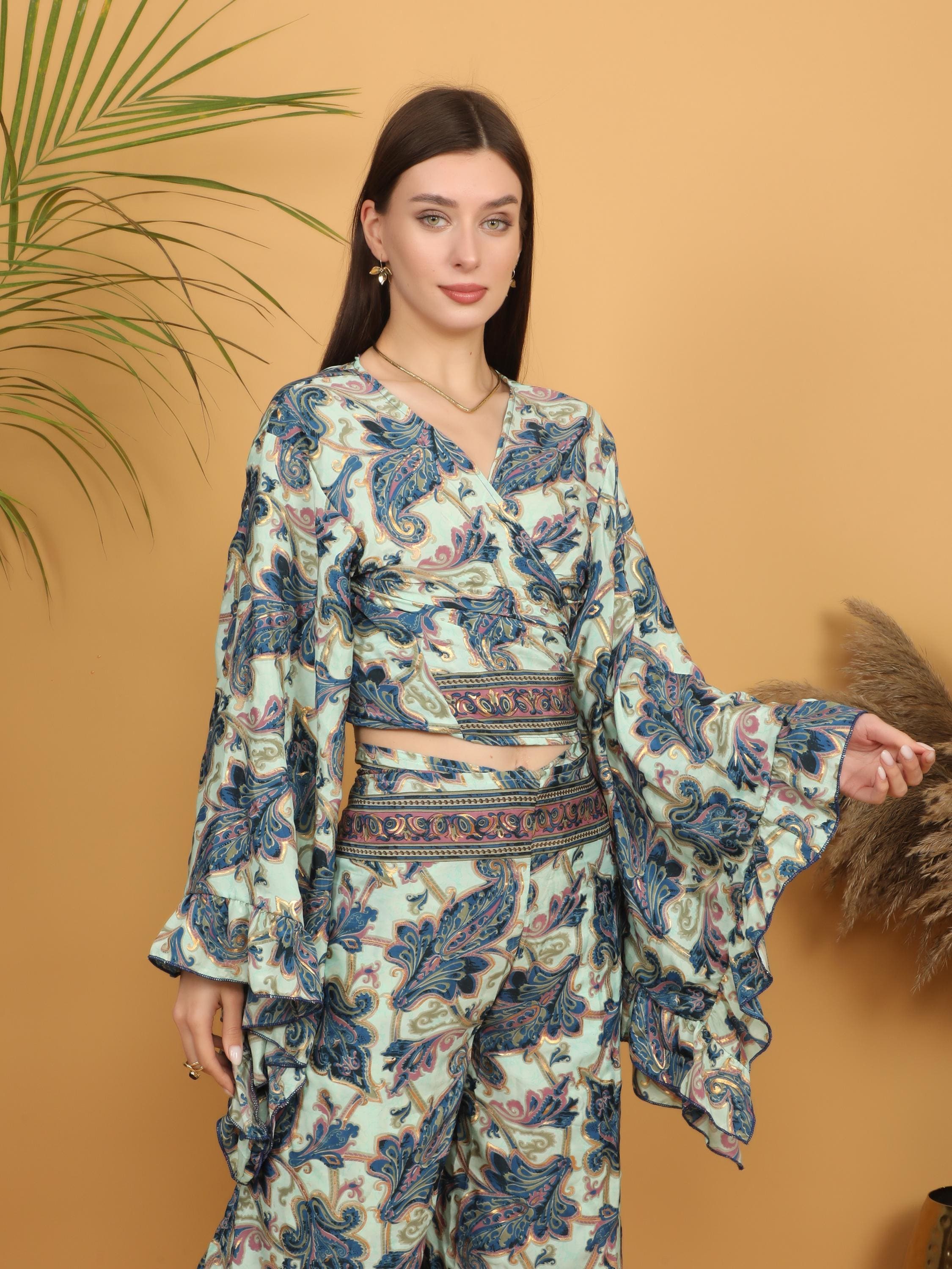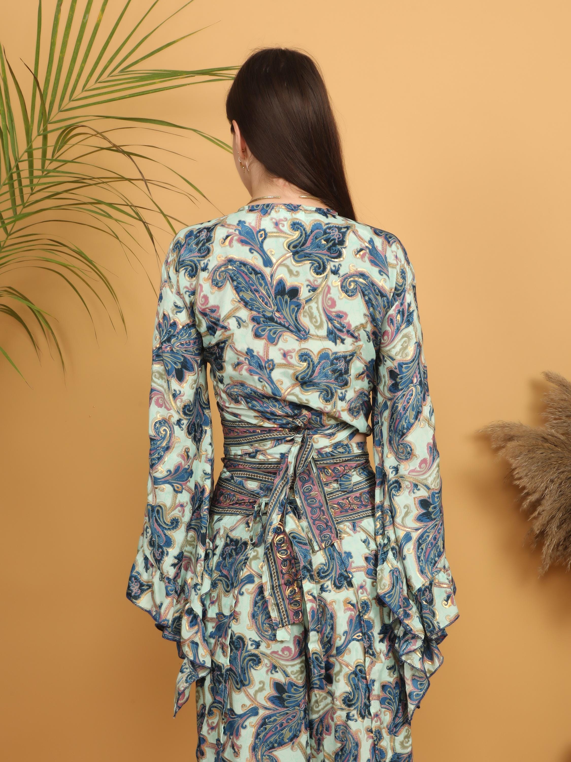 This stunning boho wrap top features an intricate paisley print beautifully enhanced with subtle golden highlights that softly catch the light and give the fabric a refined, luminous touch. The soft aqua base is enriched with deep blue and muted rose paisley motifs, delicately accented with gold throughout the design for an elevated bohemian feel.
