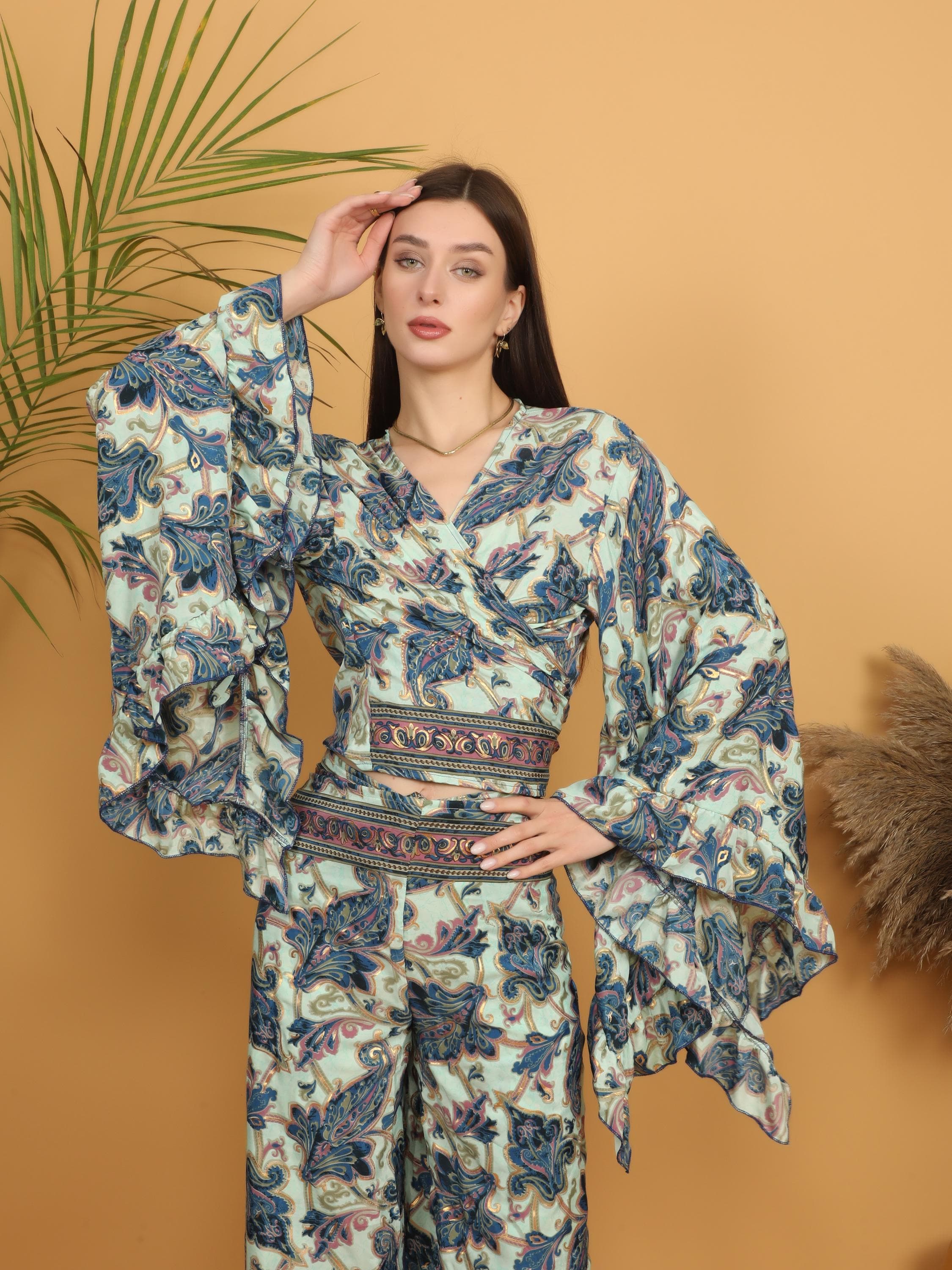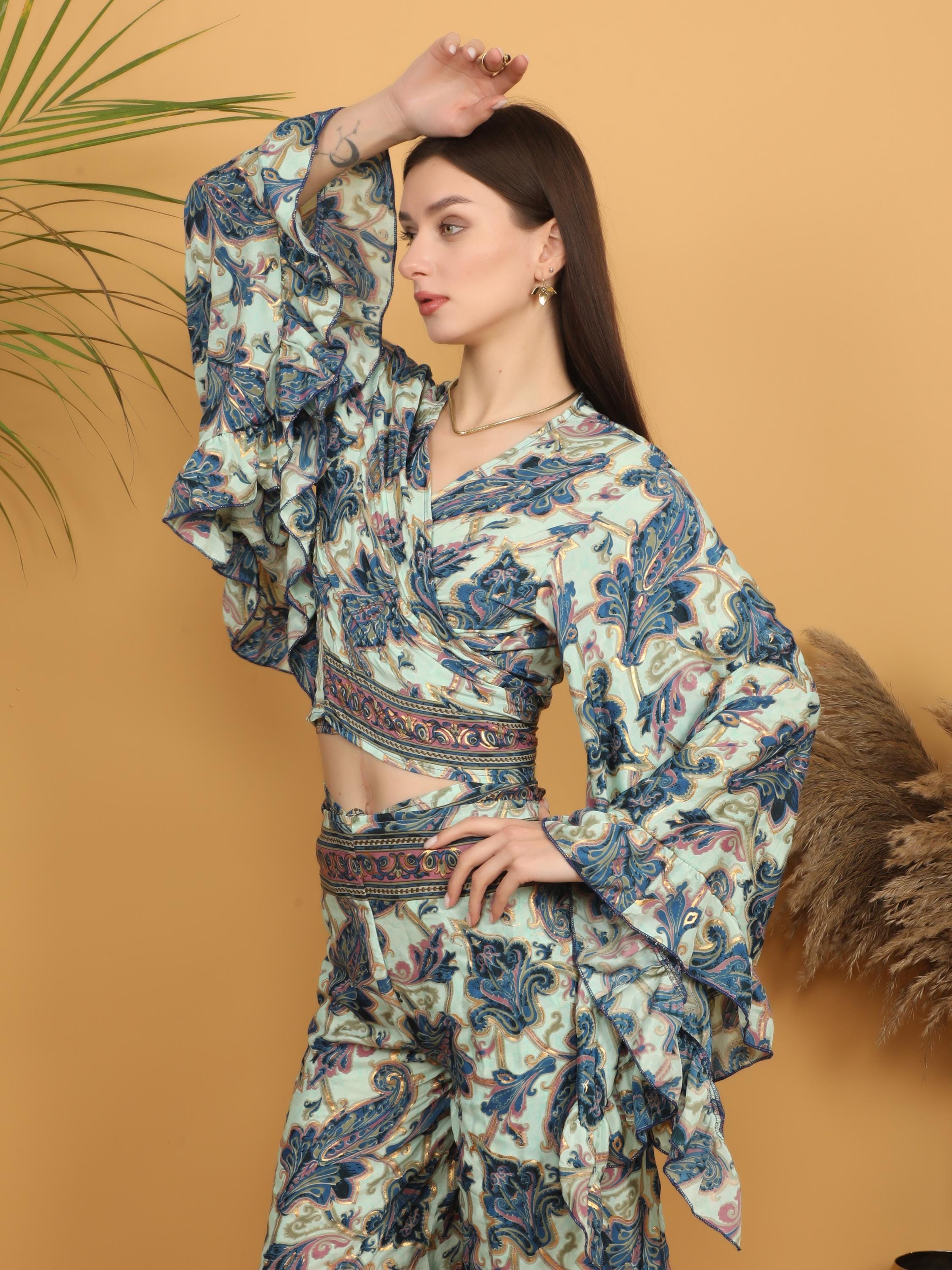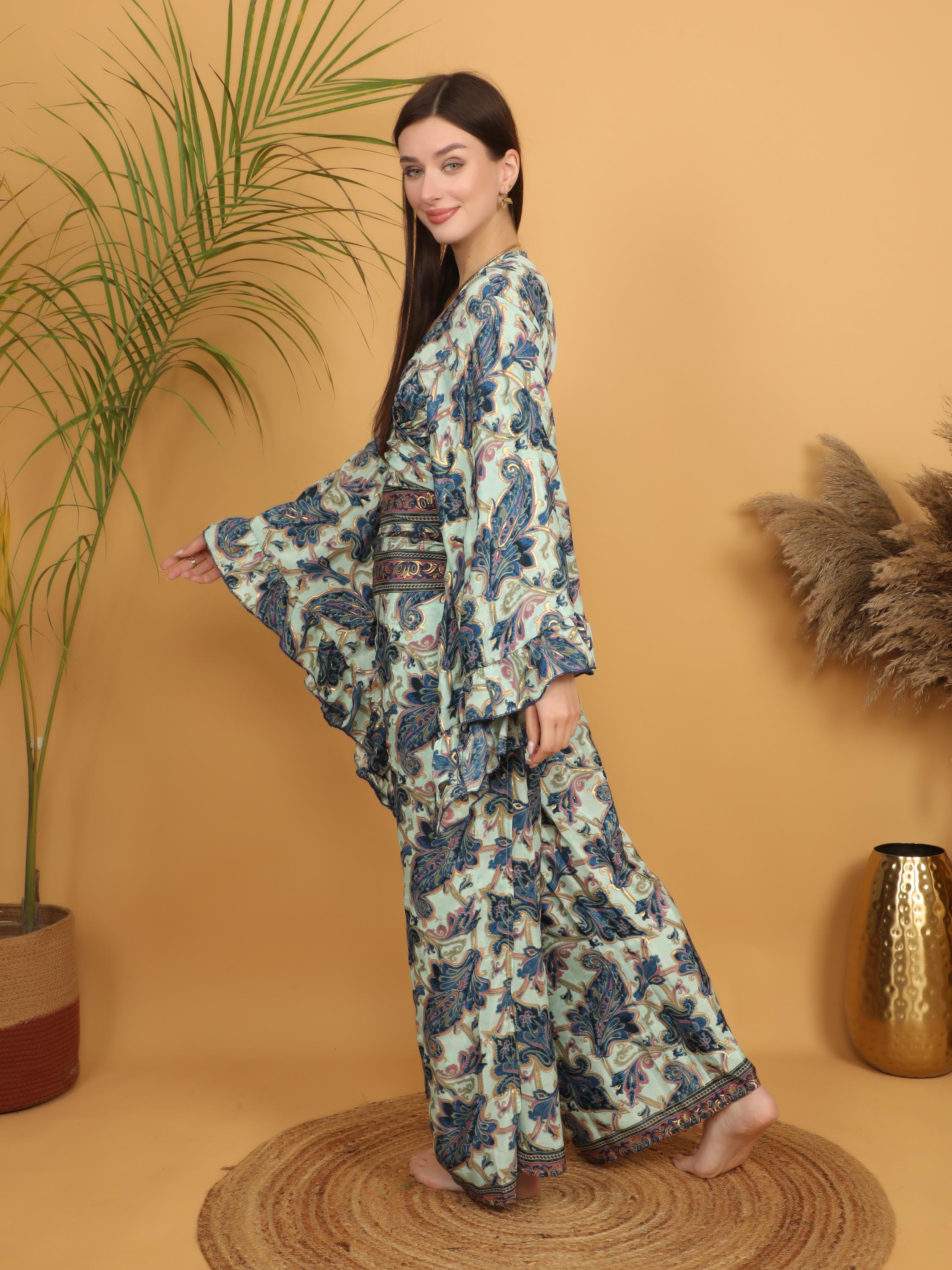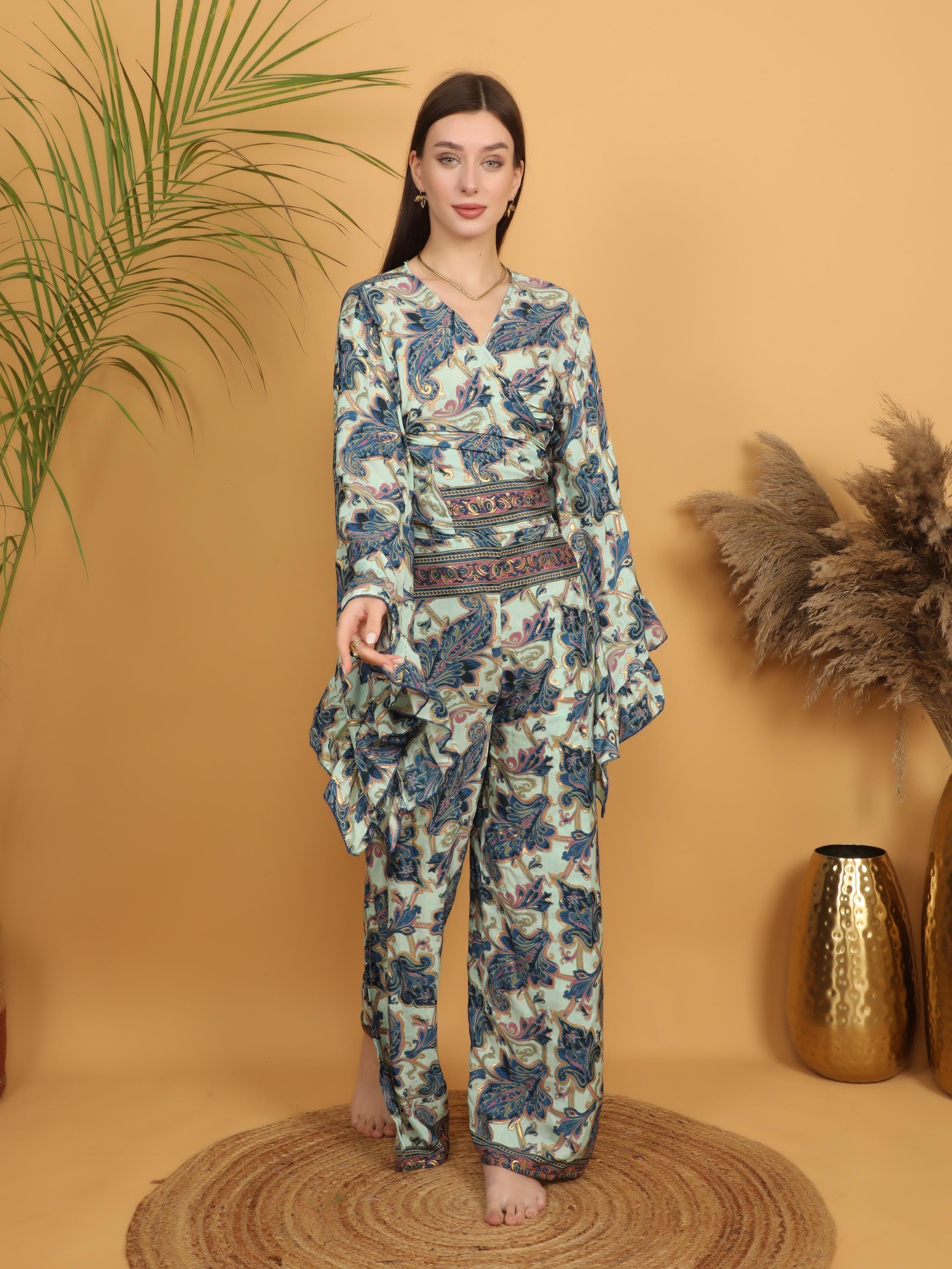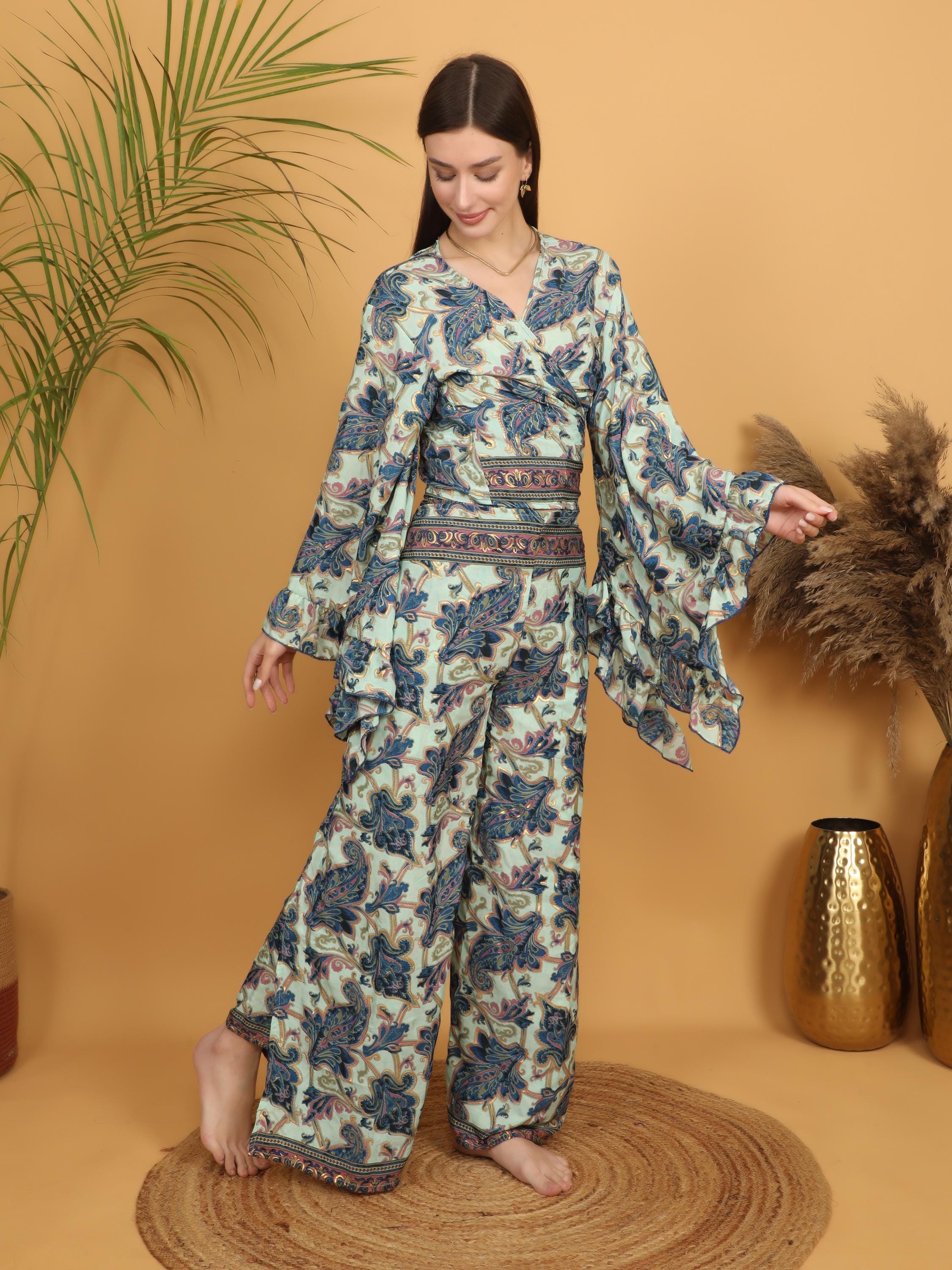 This stunning boho wrap top features an intricate paisley print beautifully enhanced with subtle golden highlights that softly catch the light and give the fabric a refined, luminous touch. The soft aqua base is enriched with deep blue and muted rose paisley motifs, delicately accented with gold throughout the design for an elevated bohemian feel.
