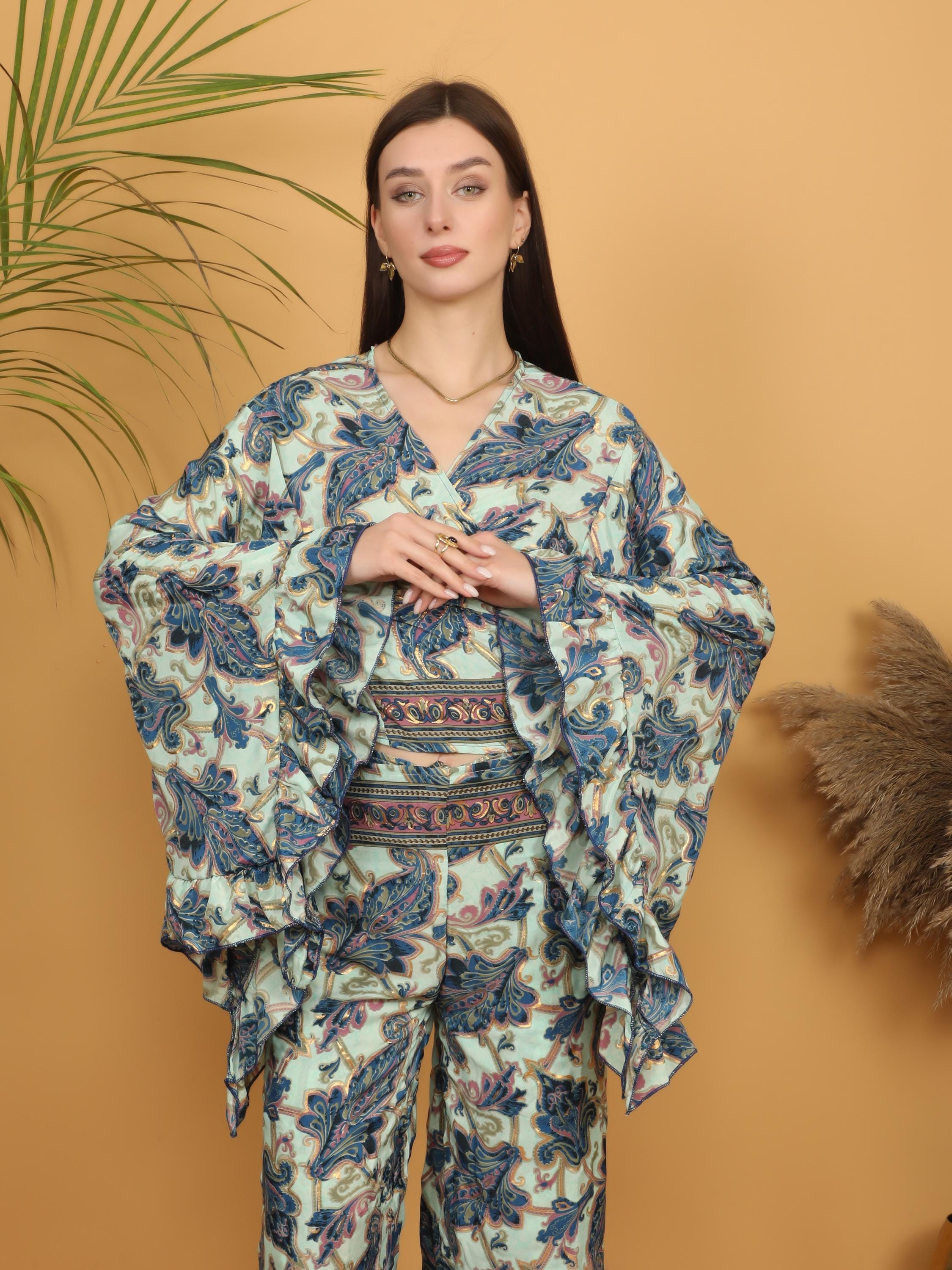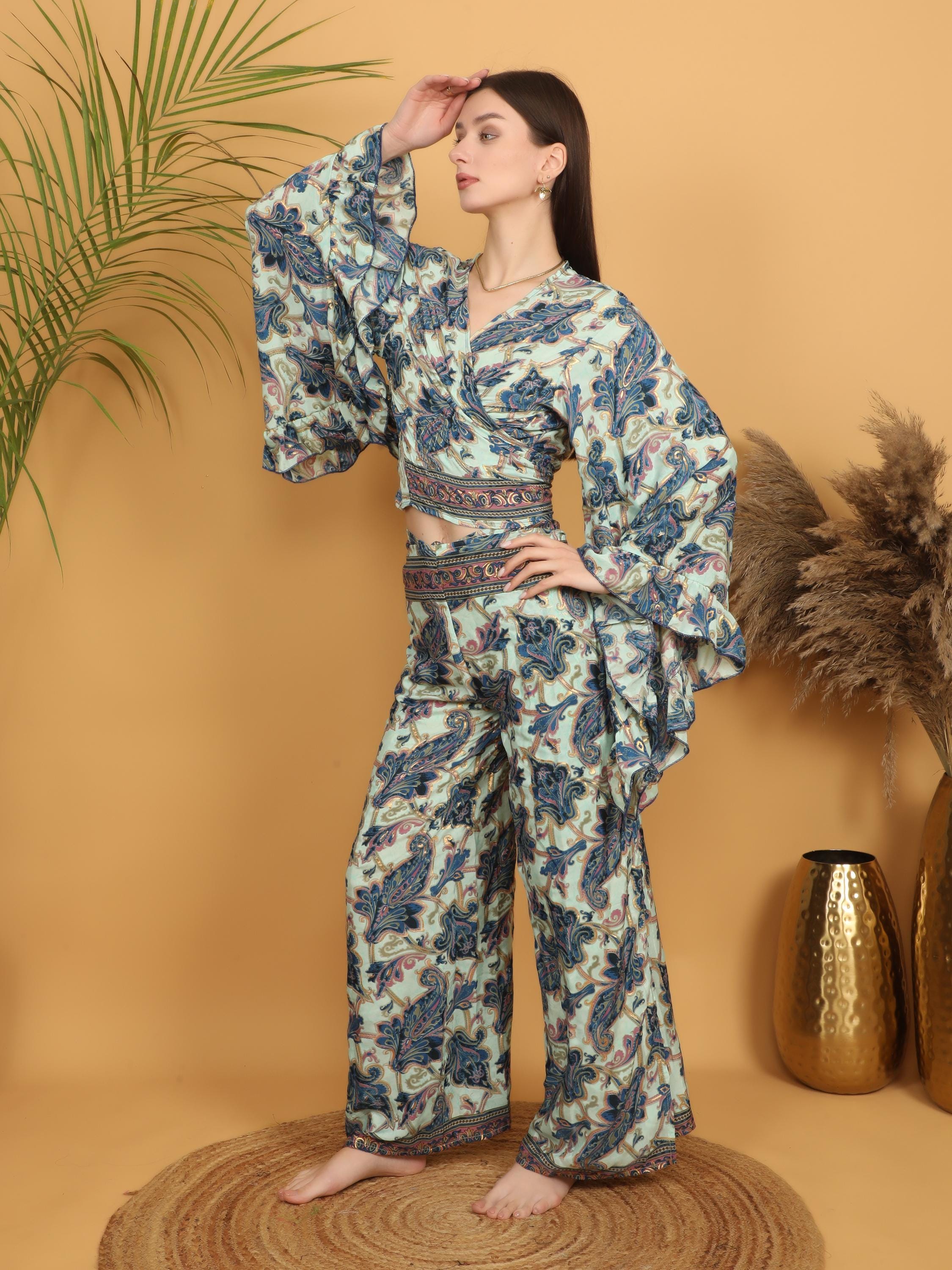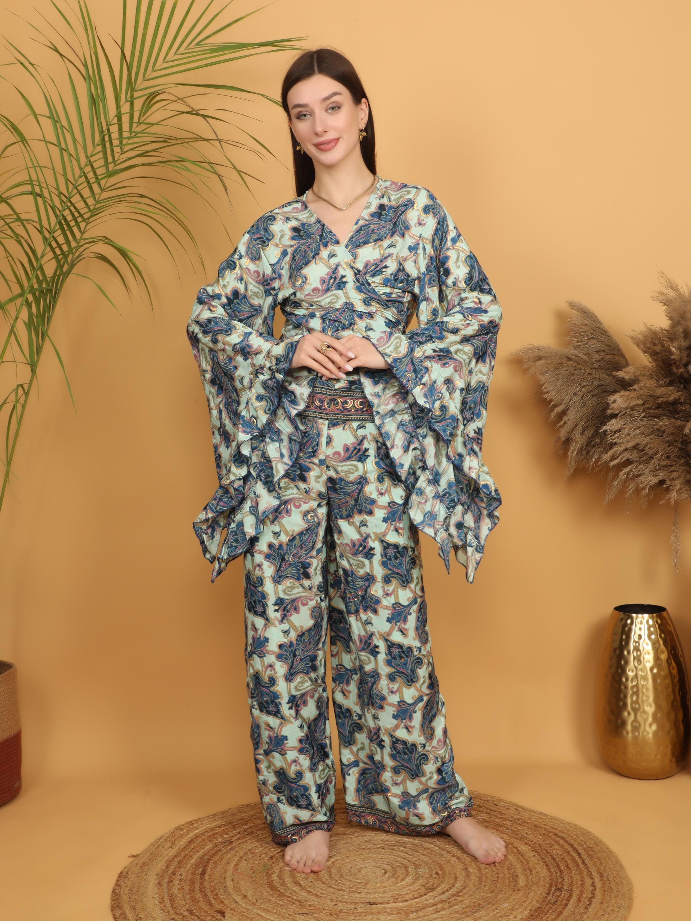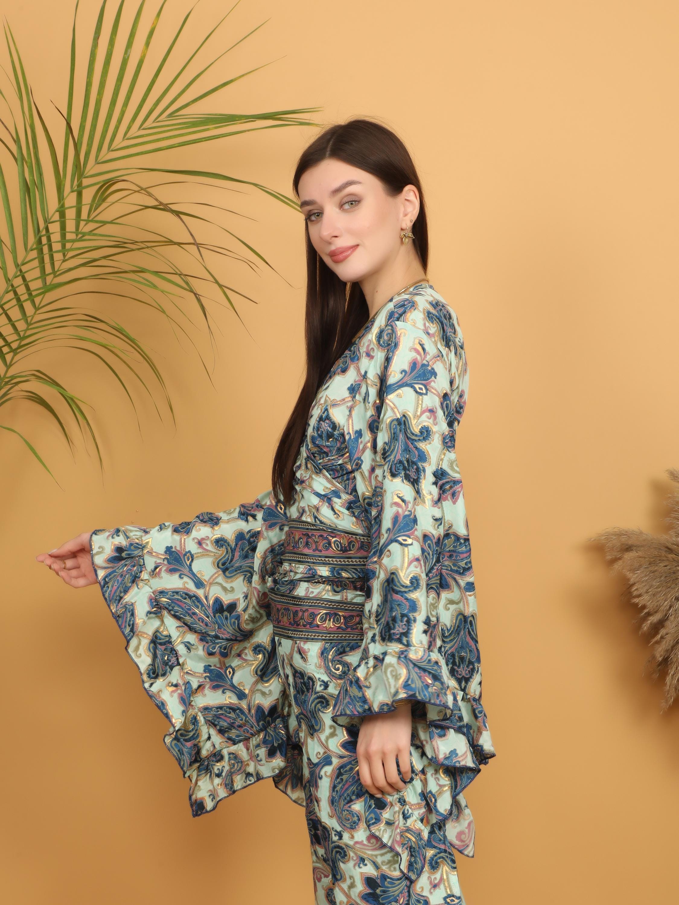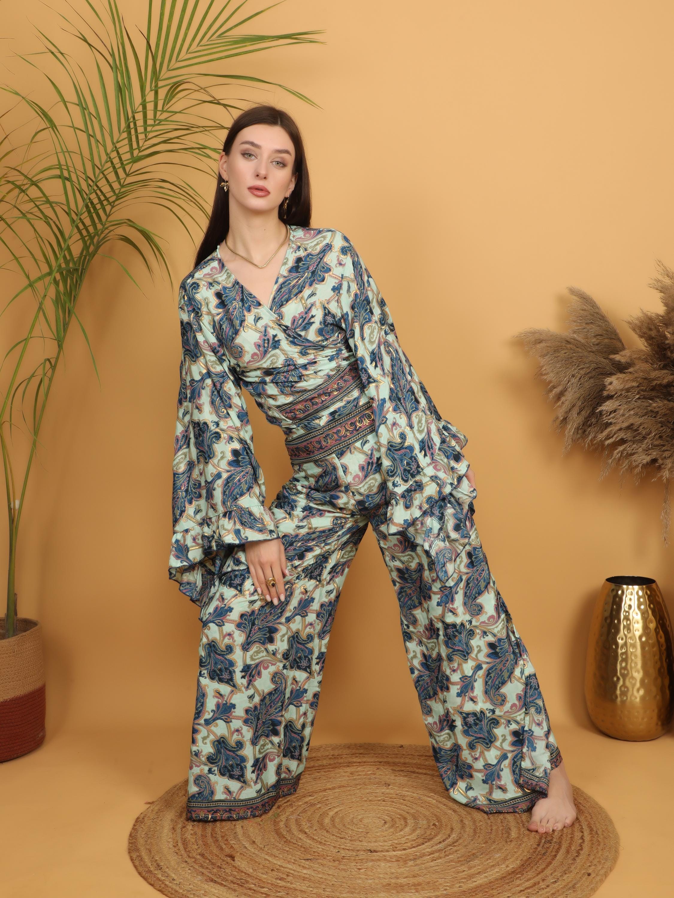 This stunning boho wrap top features an intricate paisley print beautifully enhanced with subtle golden highlights that softly catch the light and give the fabric a refined, luminous touch. The soft aqua base is enriched with deep blue and muted rose paisley motifs, delicately accented with gold throughout the design for an elevated bohemian feel.