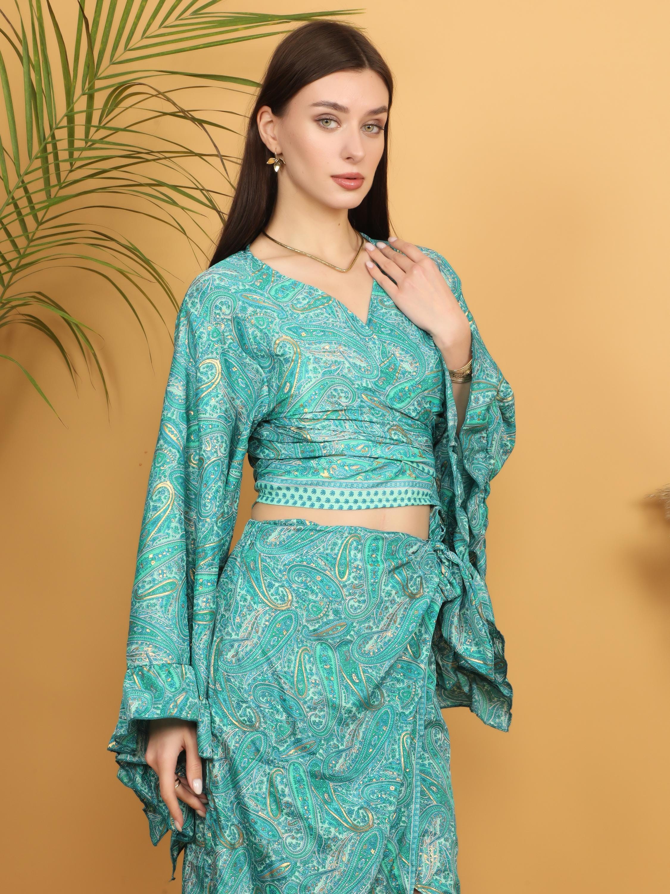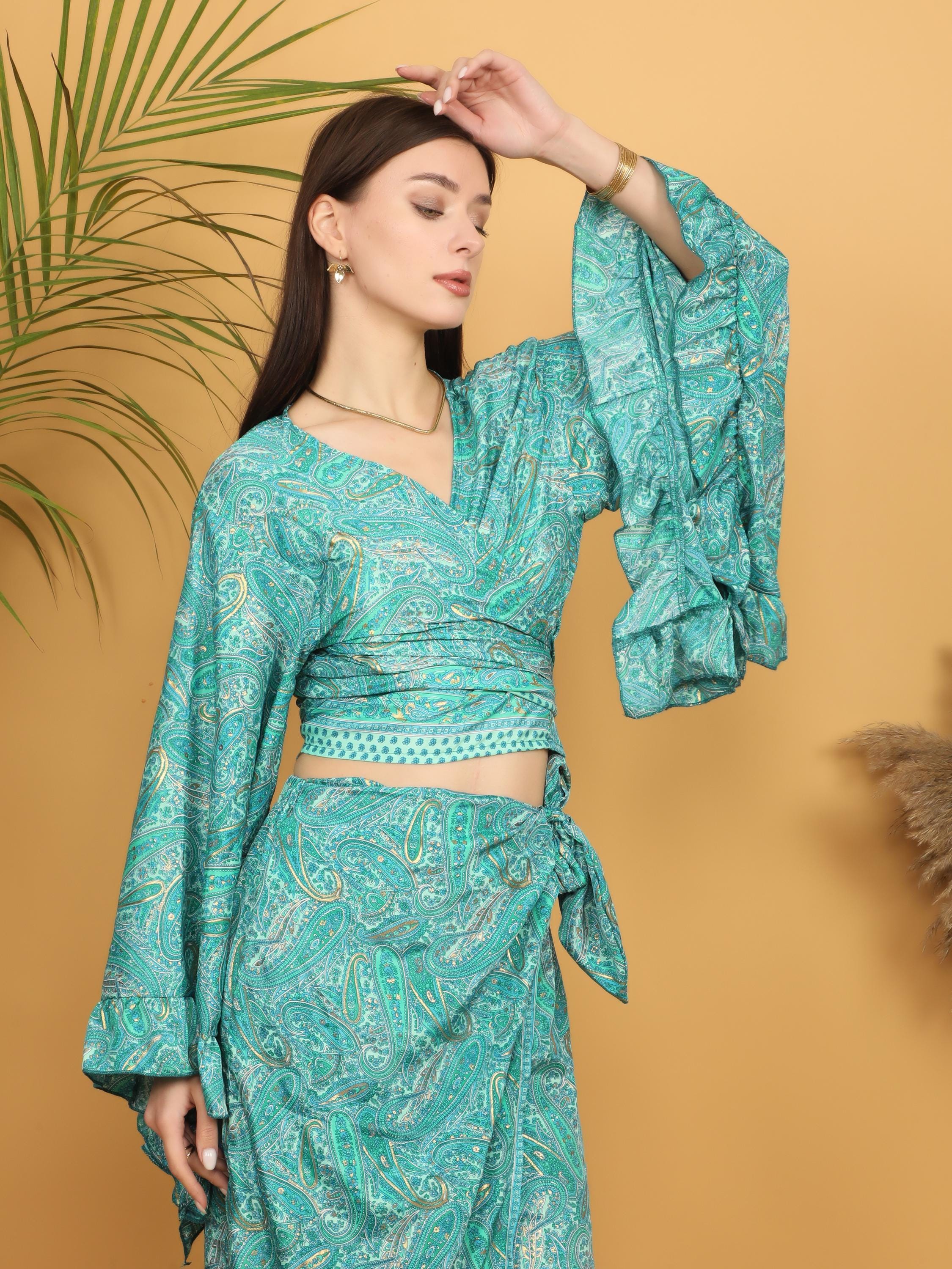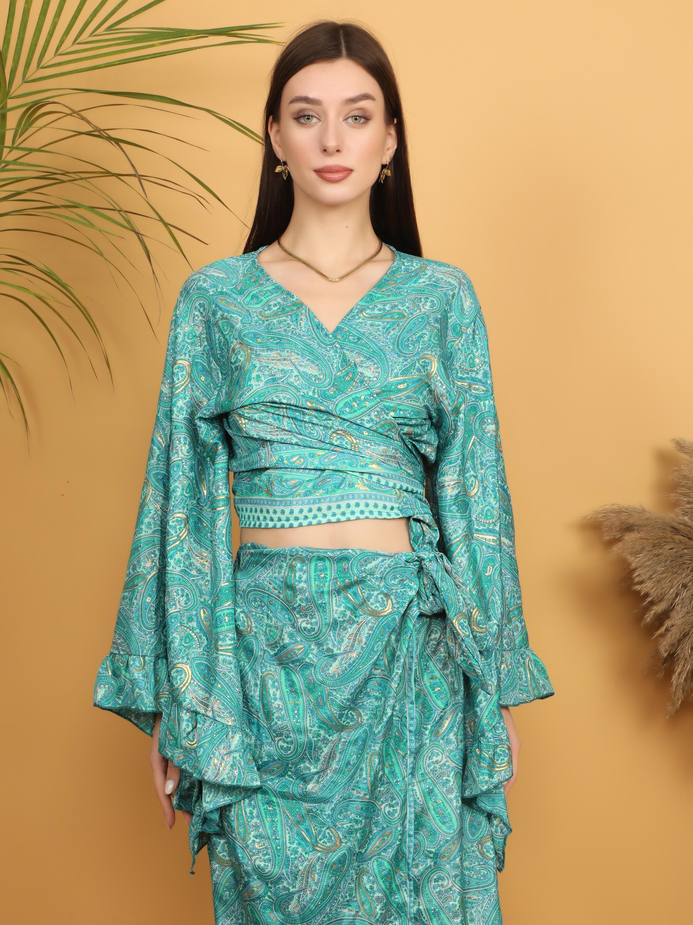 Make a bold bohemian statement with this stunning turquoise paisley wrap top, beautifully highlighted with delicate golden accents throughout the print. The rich turquoise base gives the piece a vibrant yet elegant presence, while the subtle gold detailing adds depth, dimension, and a soft luminous effect when it catches the light.