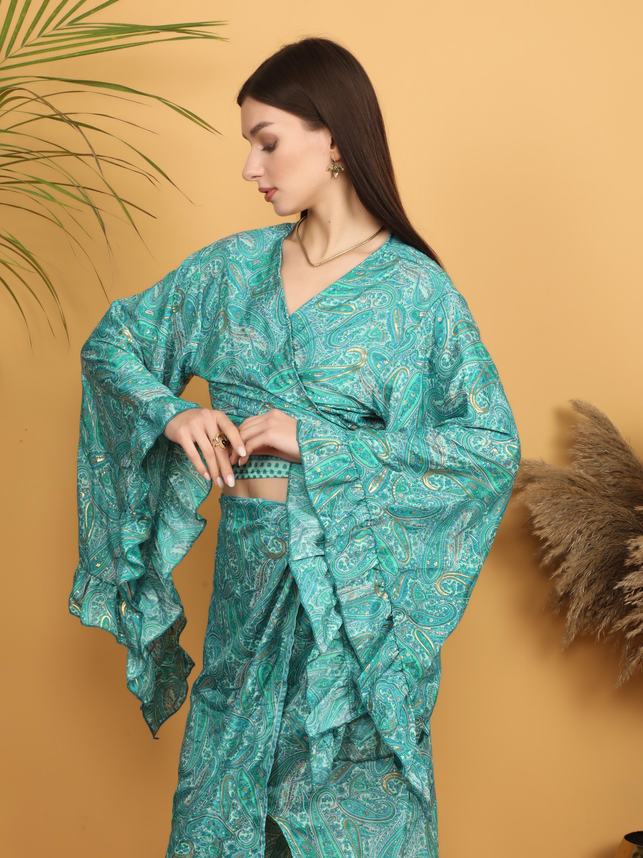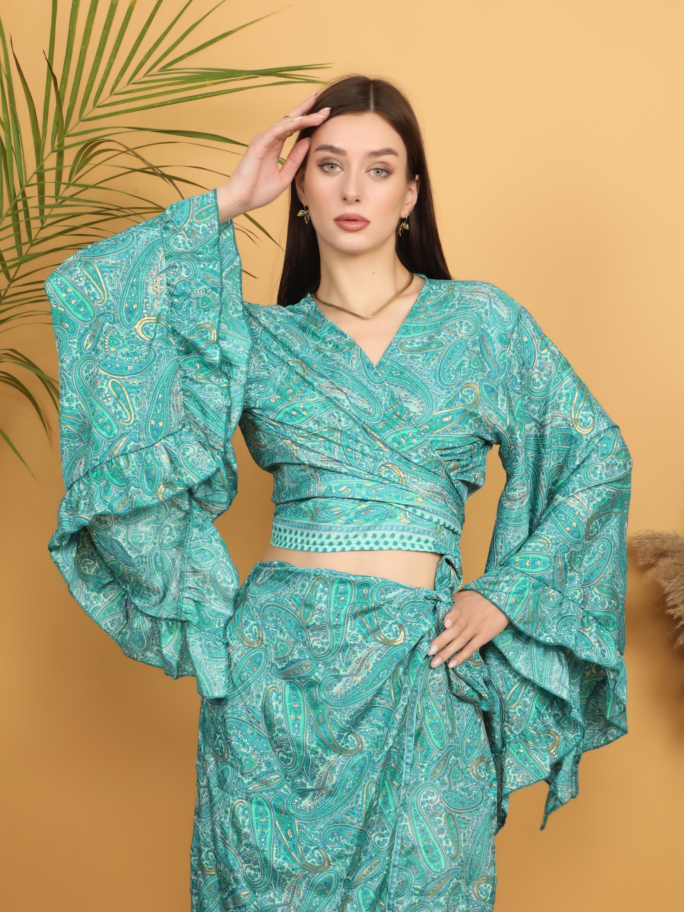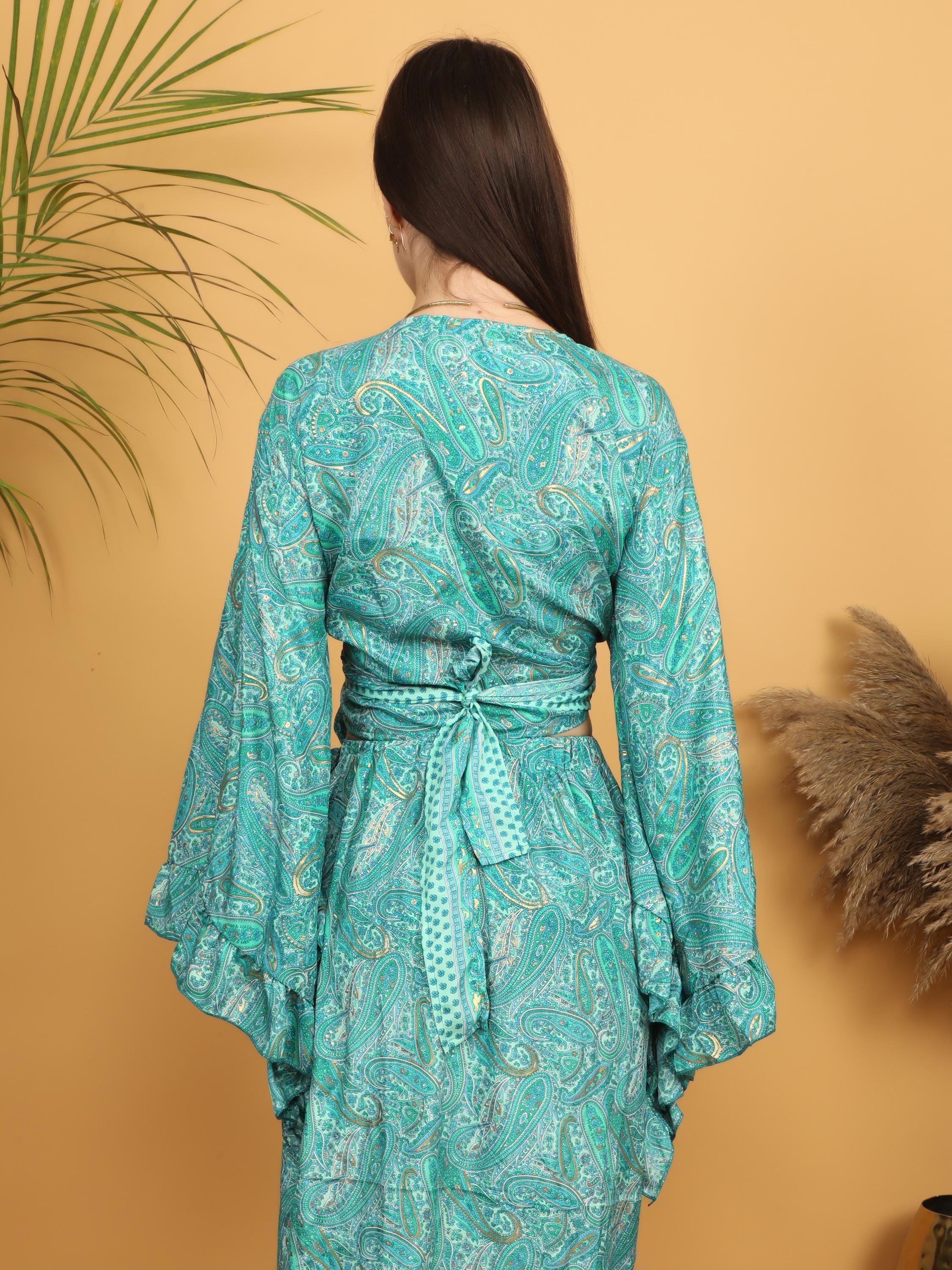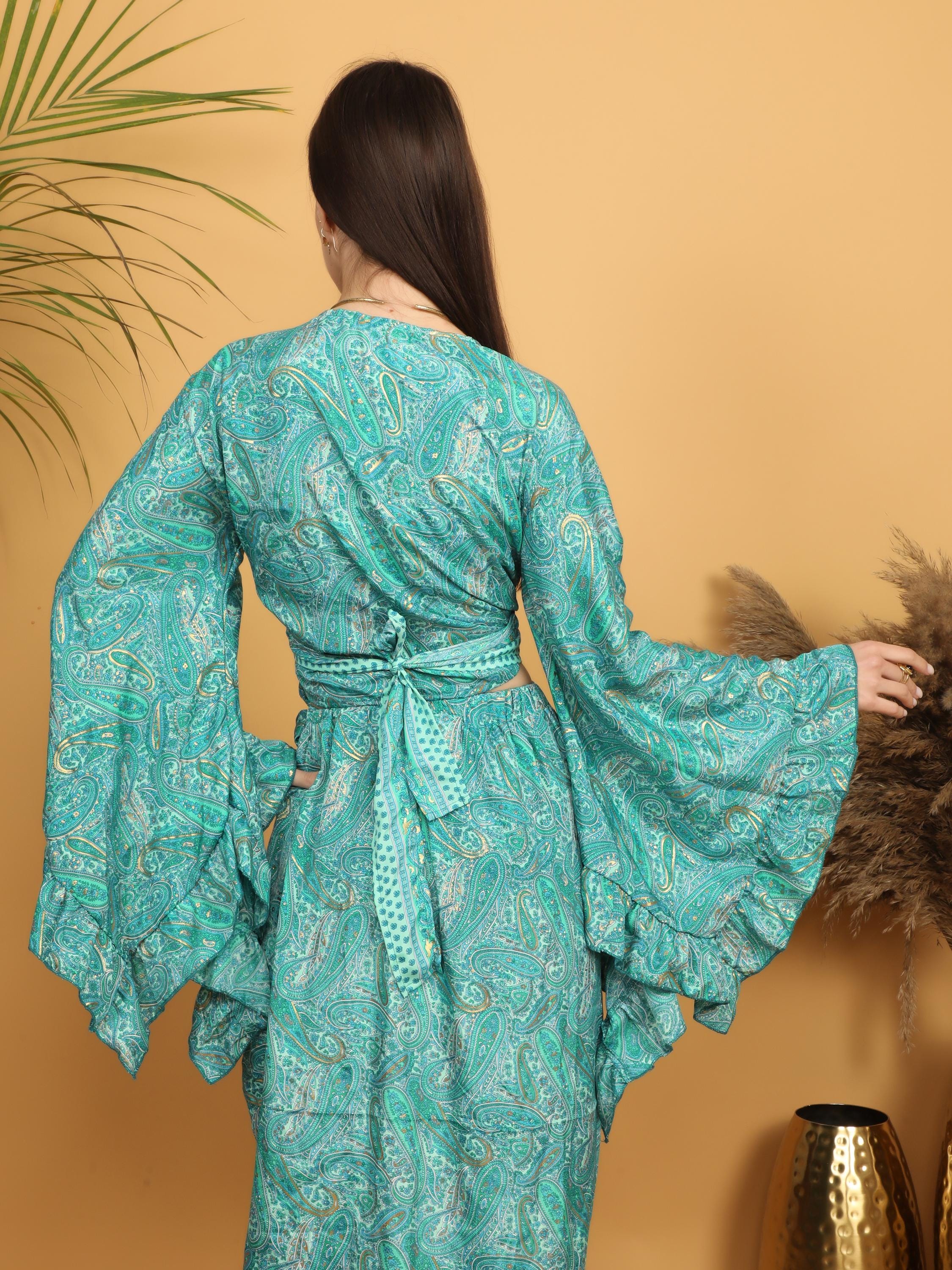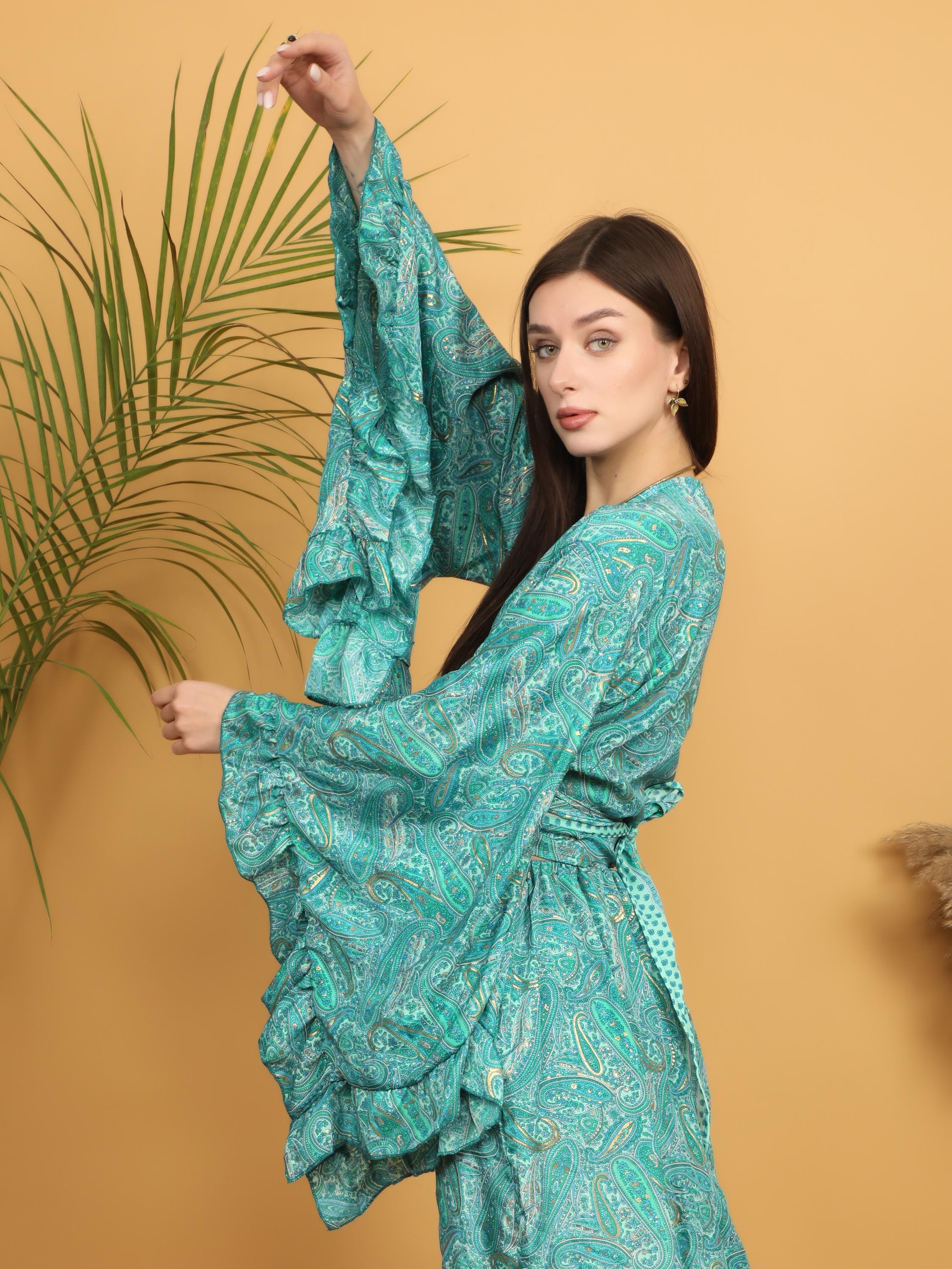 The dramatic layered ruffle sleeves create beautiful volume and movement, adding a romantic and artistic flair. The wrap style allows you to adjust the fit at the waist, naturally enhancing the figure while keeping a relaxed boho look. The deep V neckline adds femininity, and the intricate paisley pattern gives it a timeless free-spirited charm.