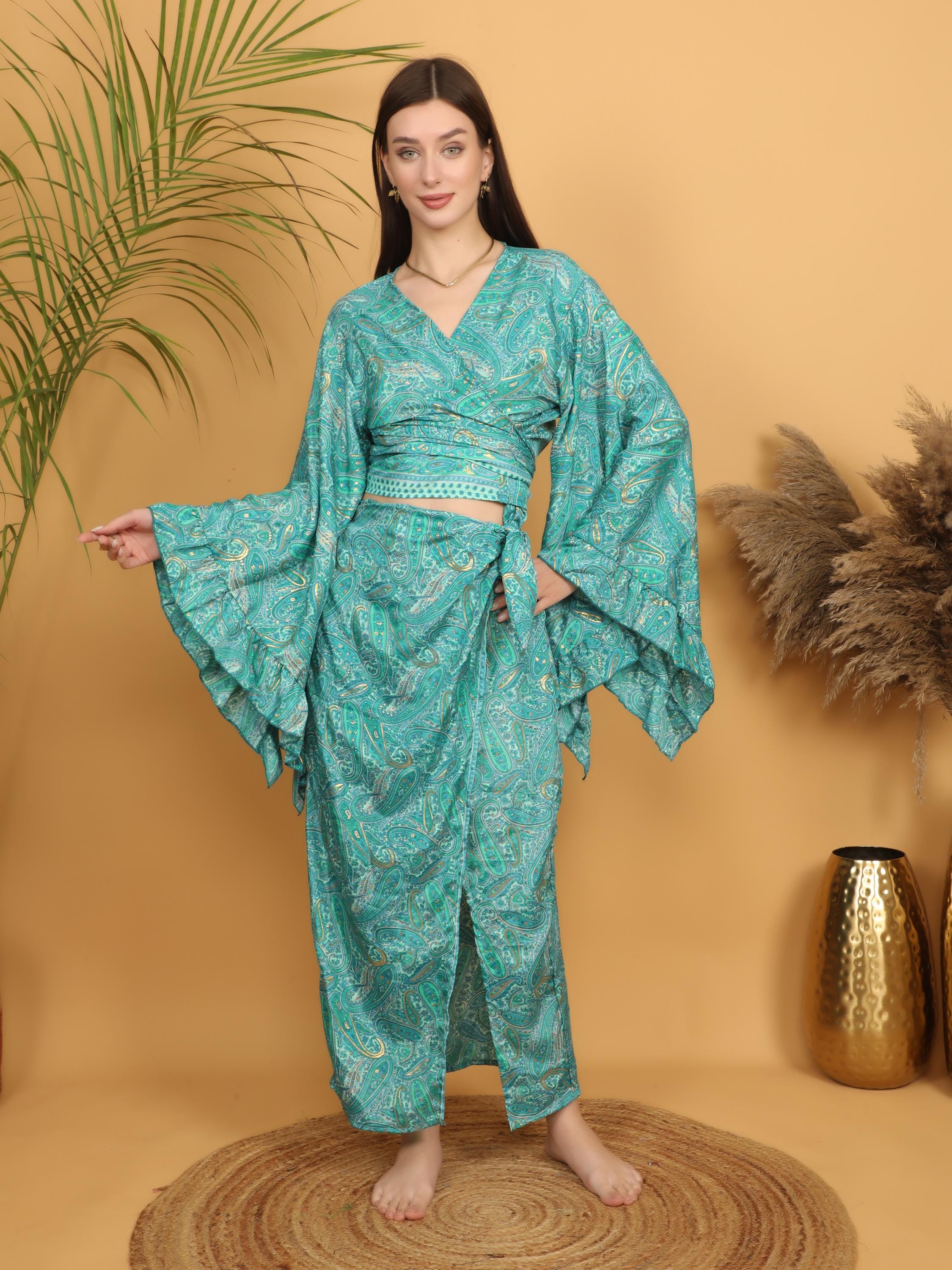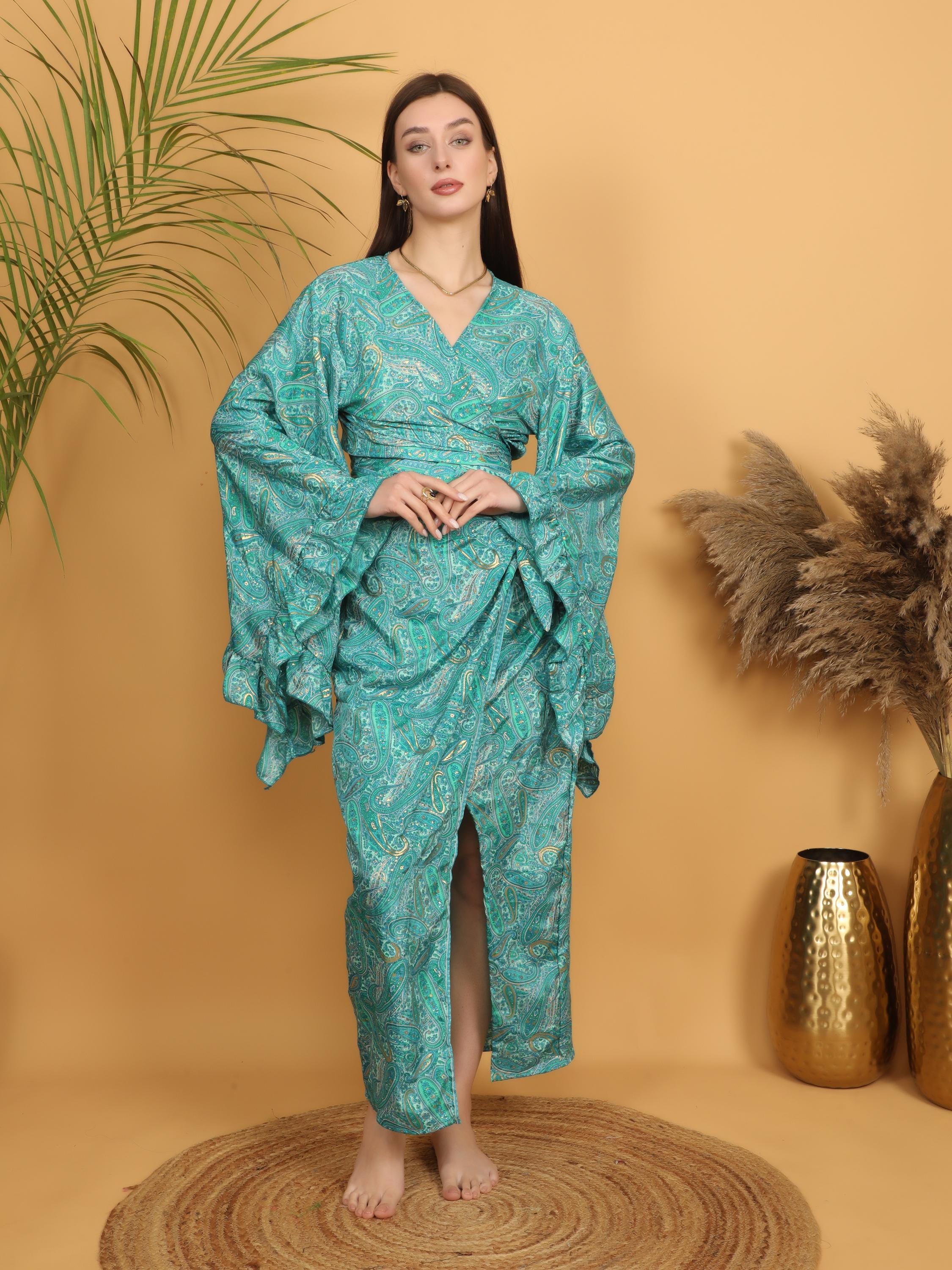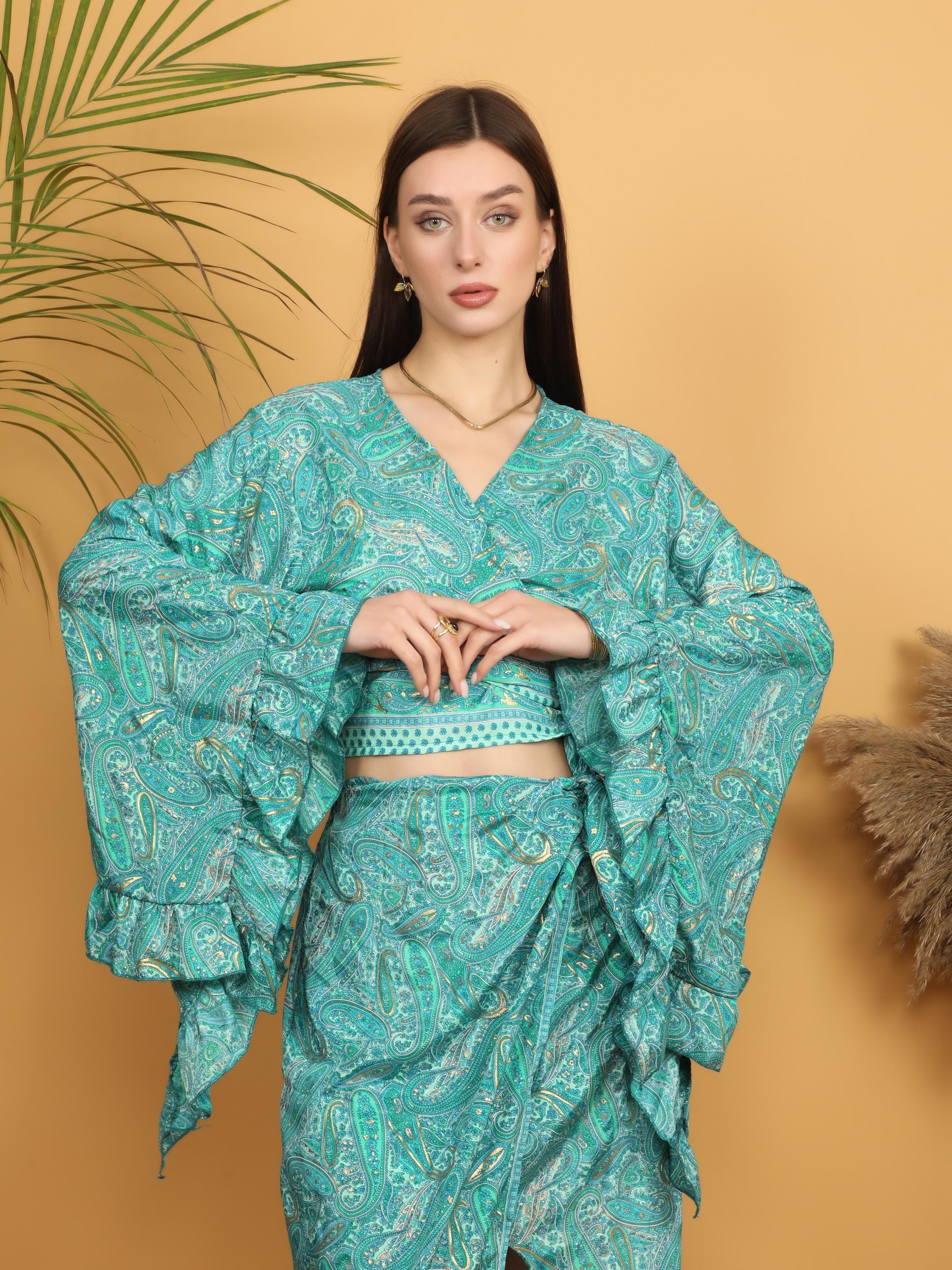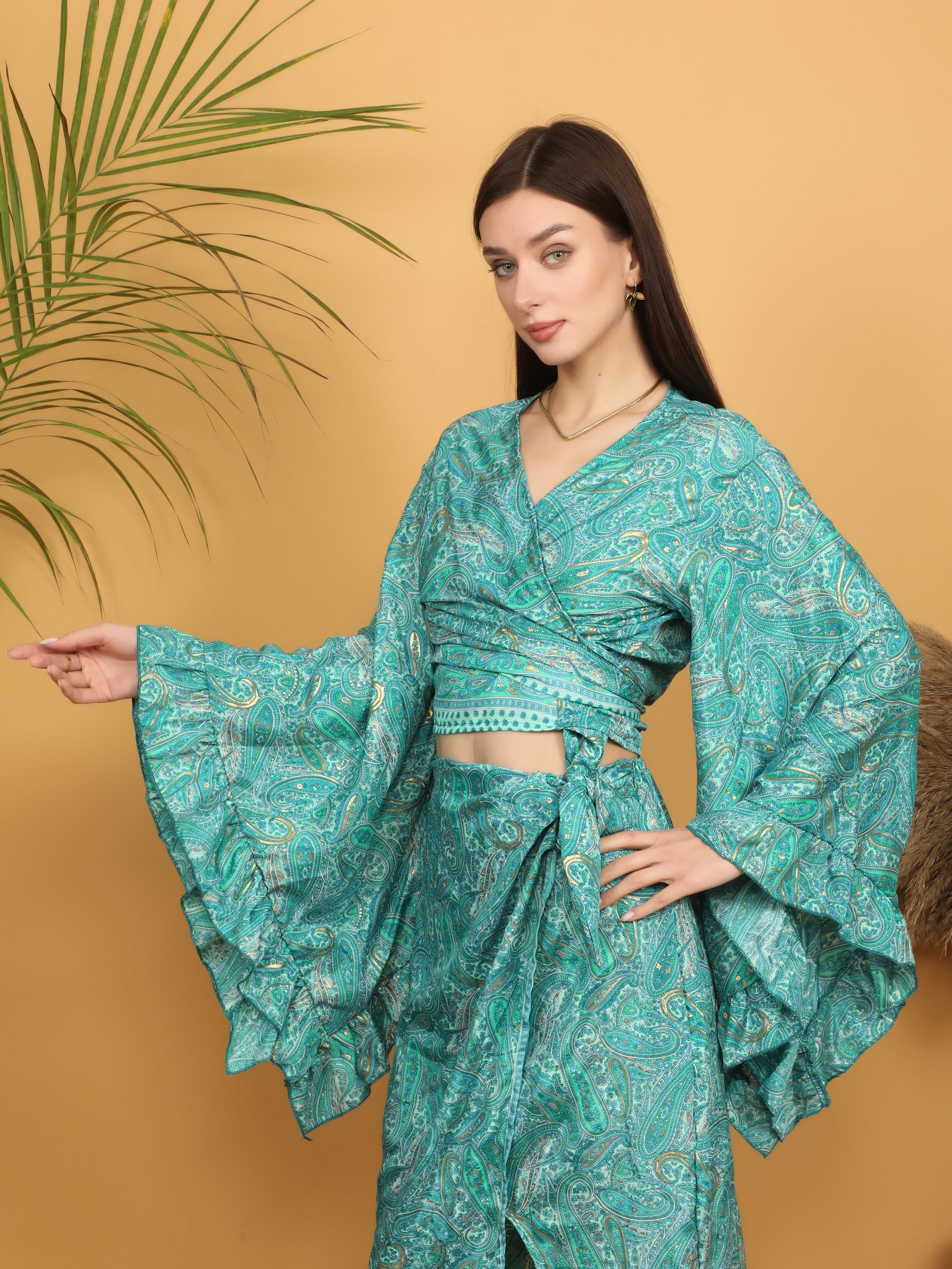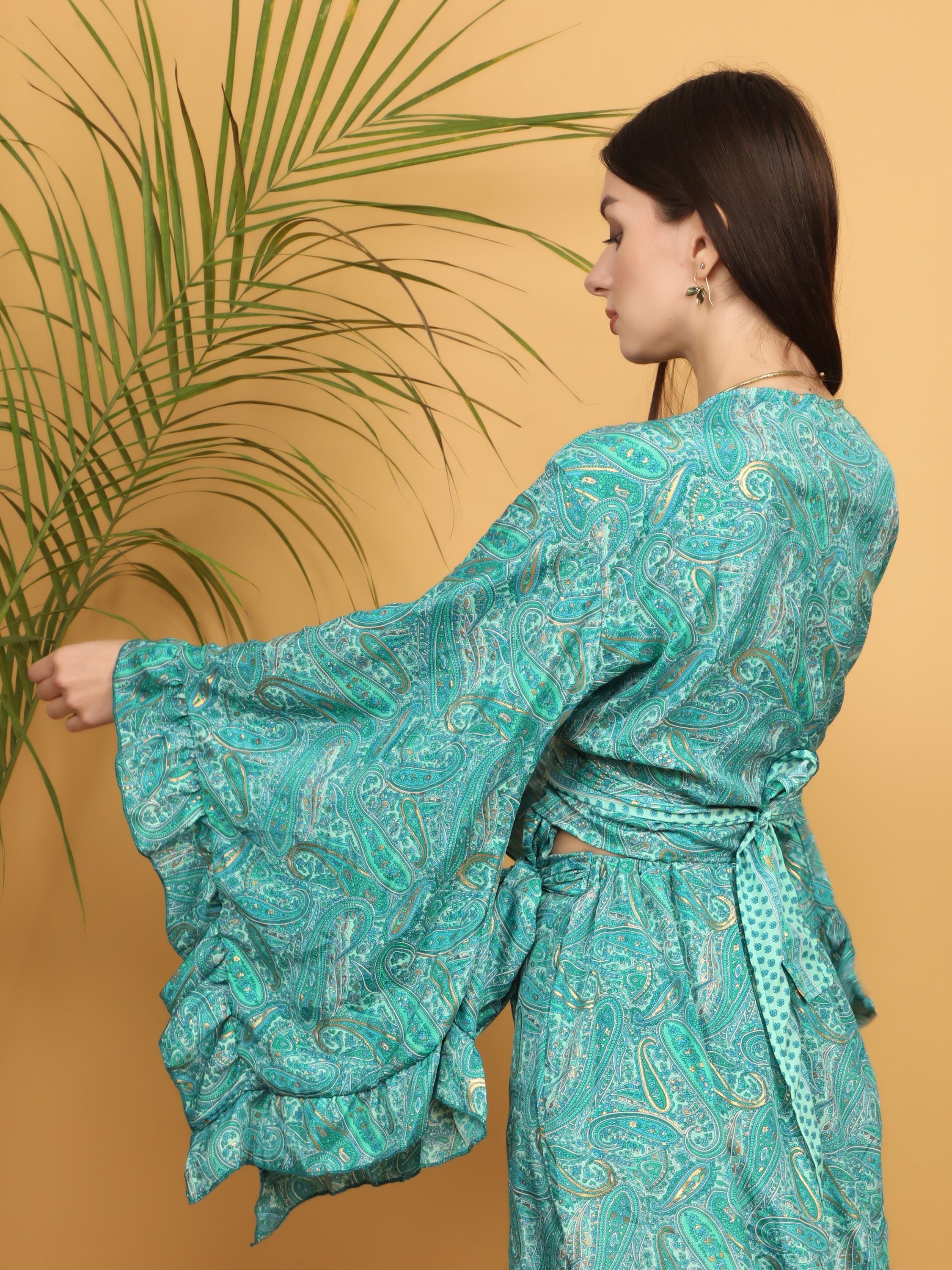 The dramatic layered ruffle sleeves create beautiful volume and movement, adding a romantic and artistic flair. The wrap style allows you to adjust the fit at the waist, naturally enhancing the figure while keeping a relaxed boho look. The deep V neckline adds femininity, and the intricate paisley pattern gives it a timeless free-spirited charm.