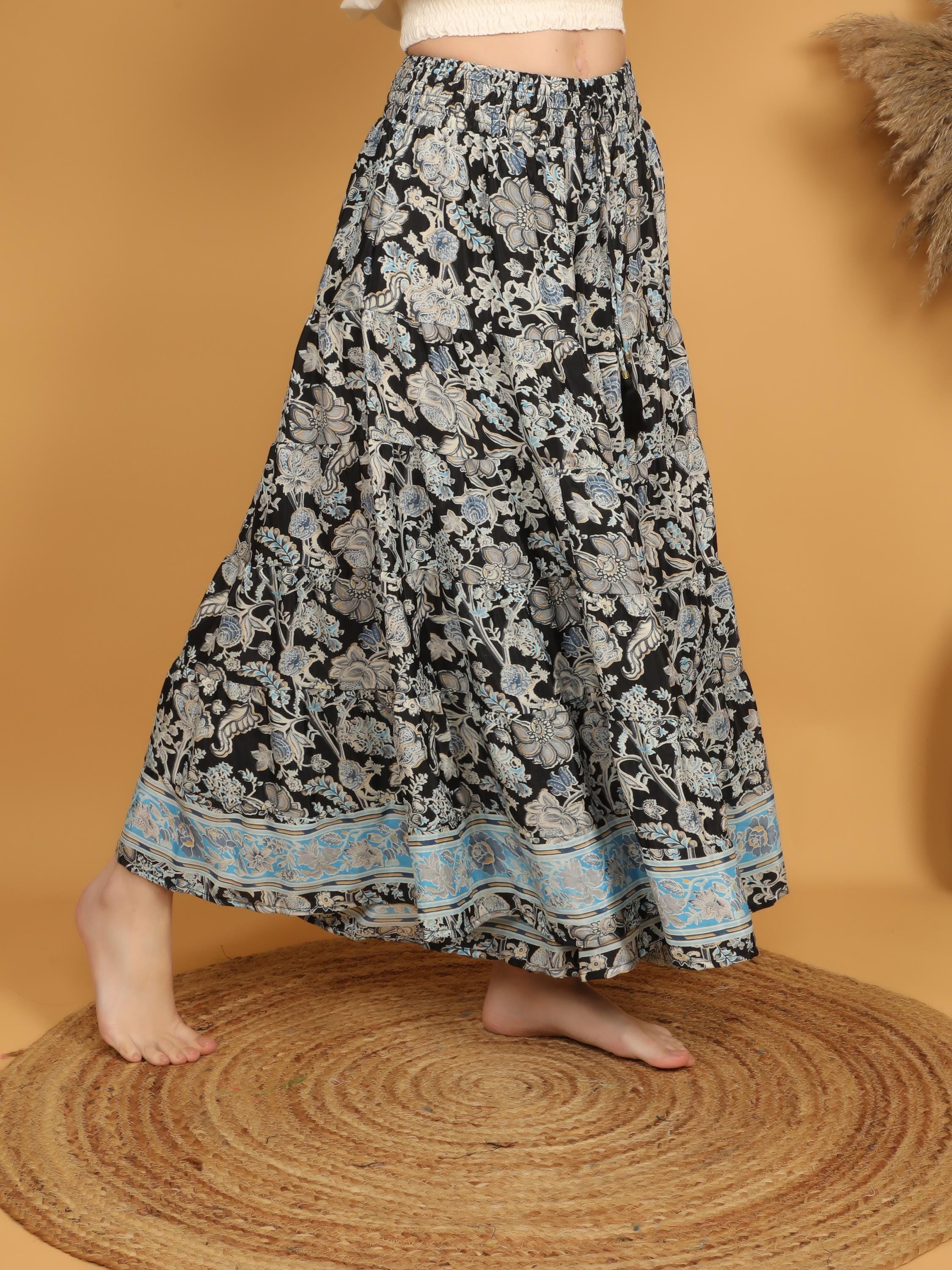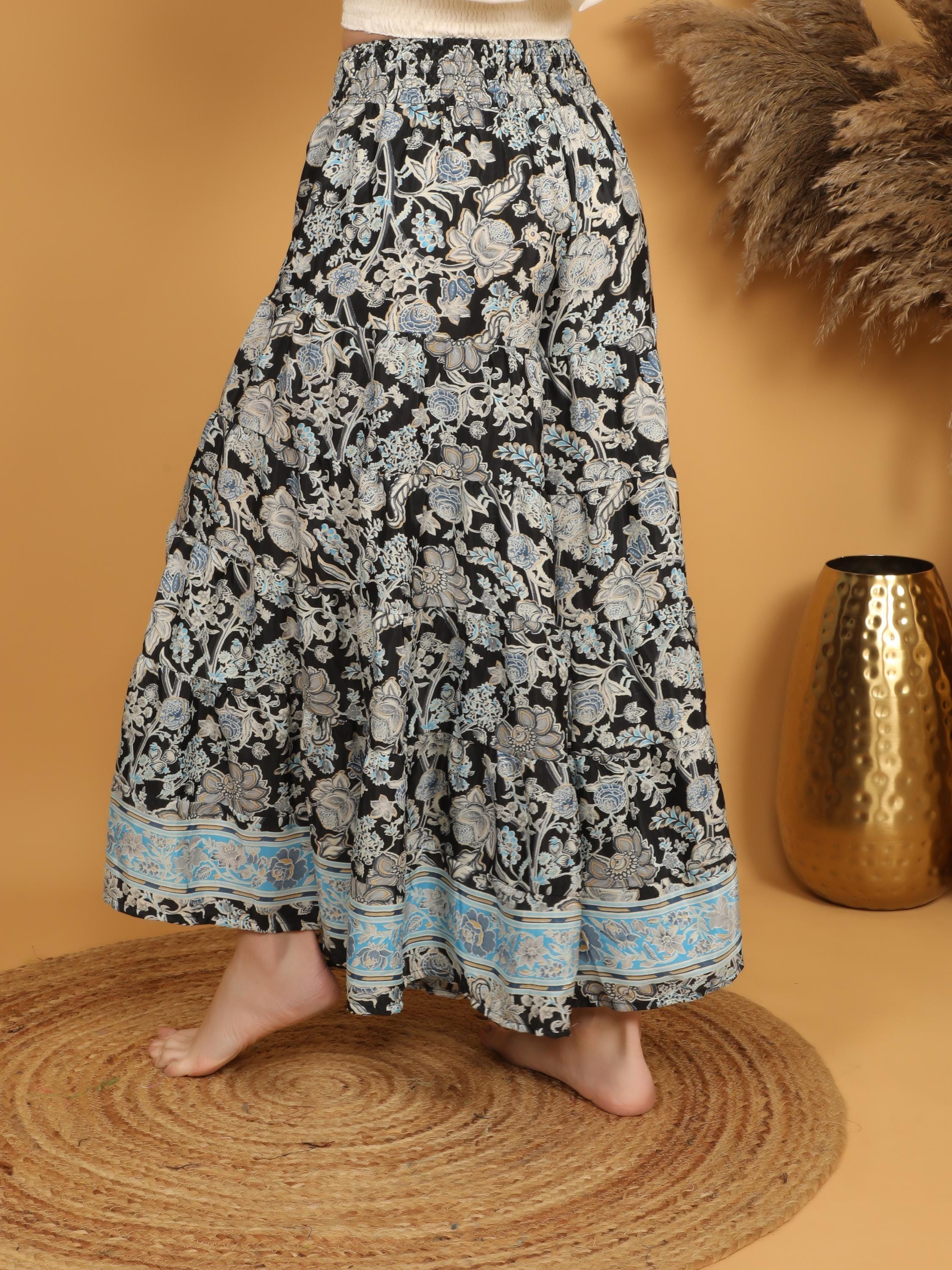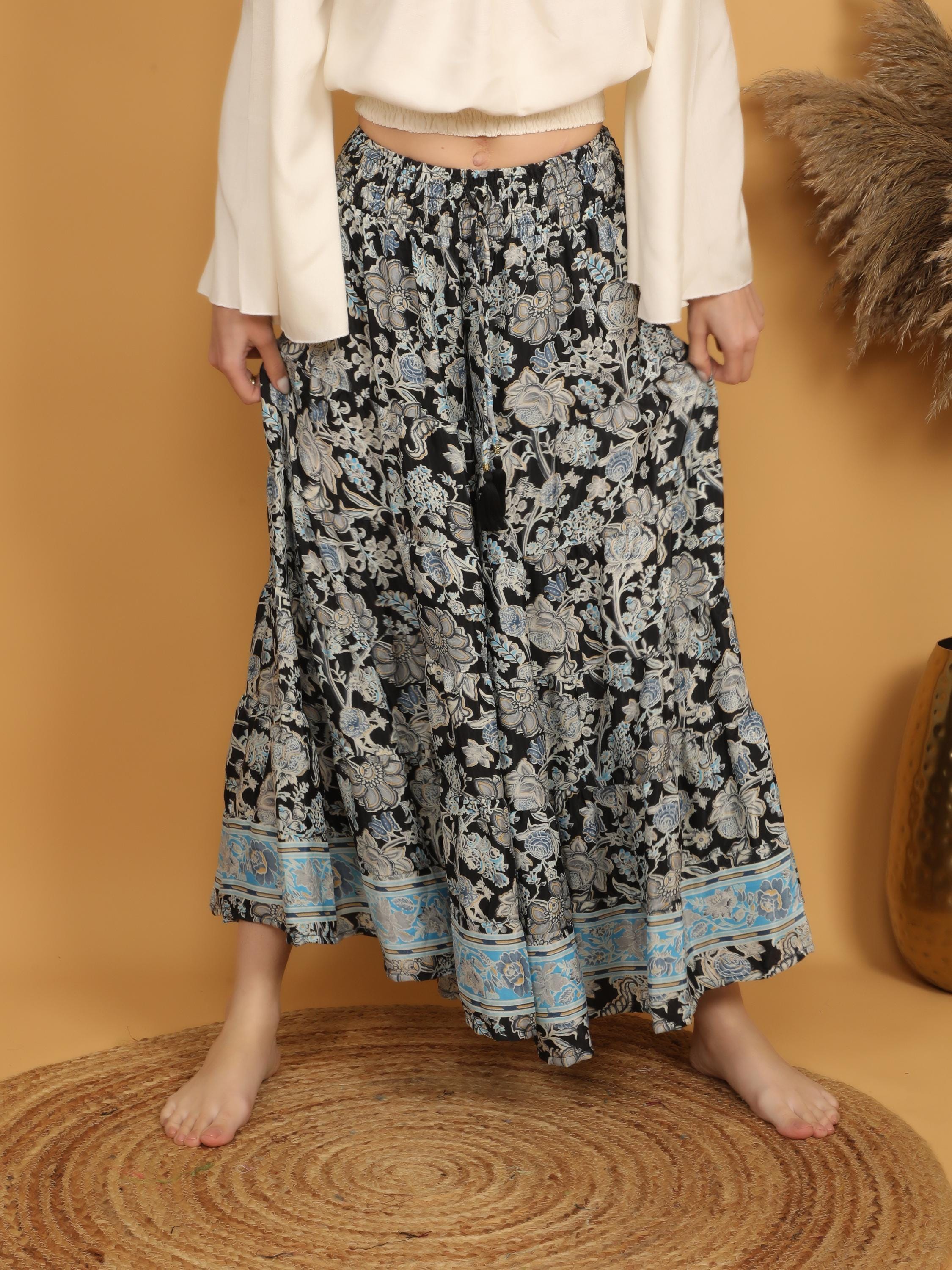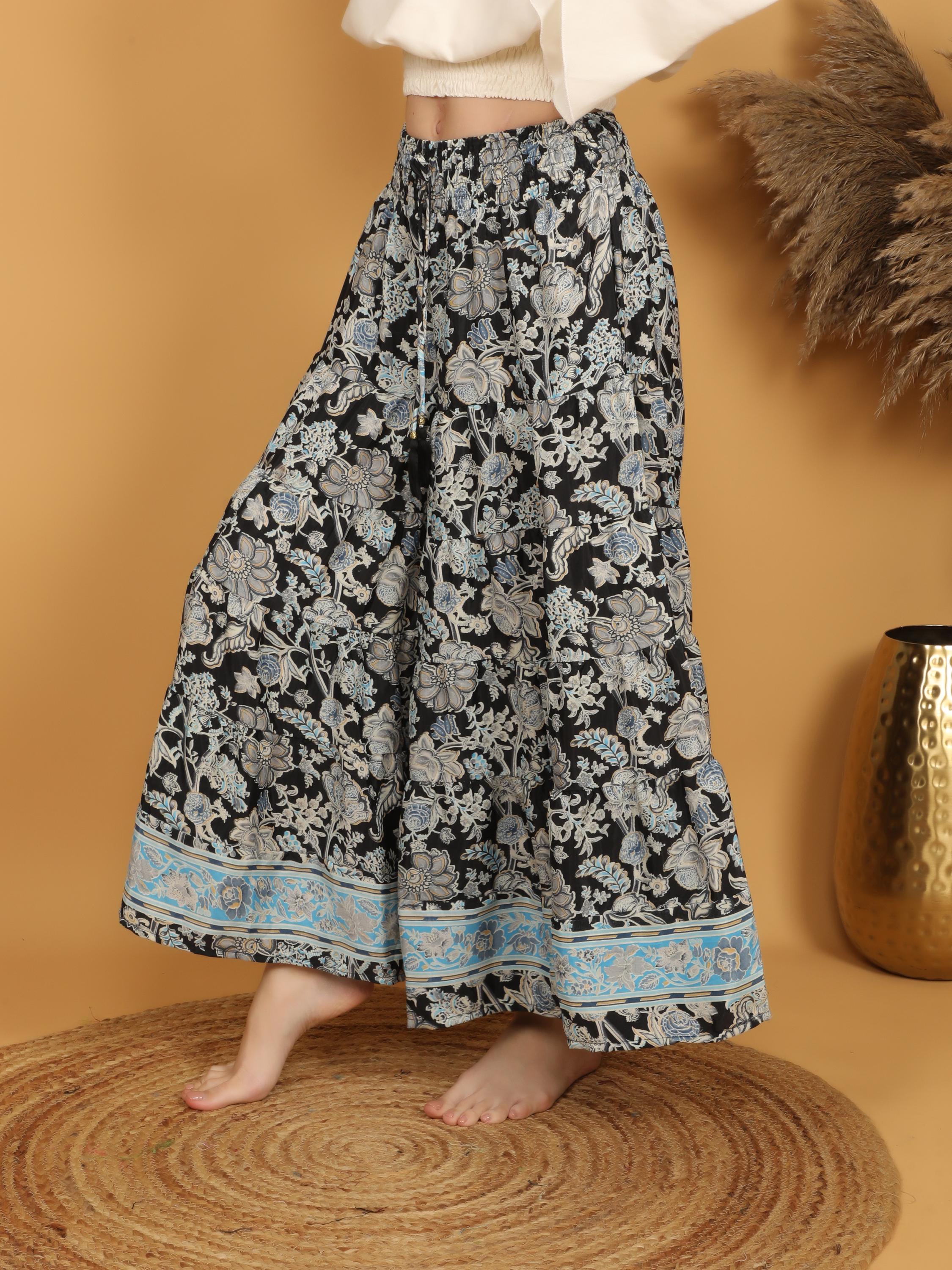 Step into effortless bohemian elegance with these flowy wide leg trousers featuring a striking black base adorned with an intricate floral print. The delicate mix of soft beige and muted blue motifs creates a beautiful contrast, while the detailed blue border at the hem adds a refined, eye-catching finish.