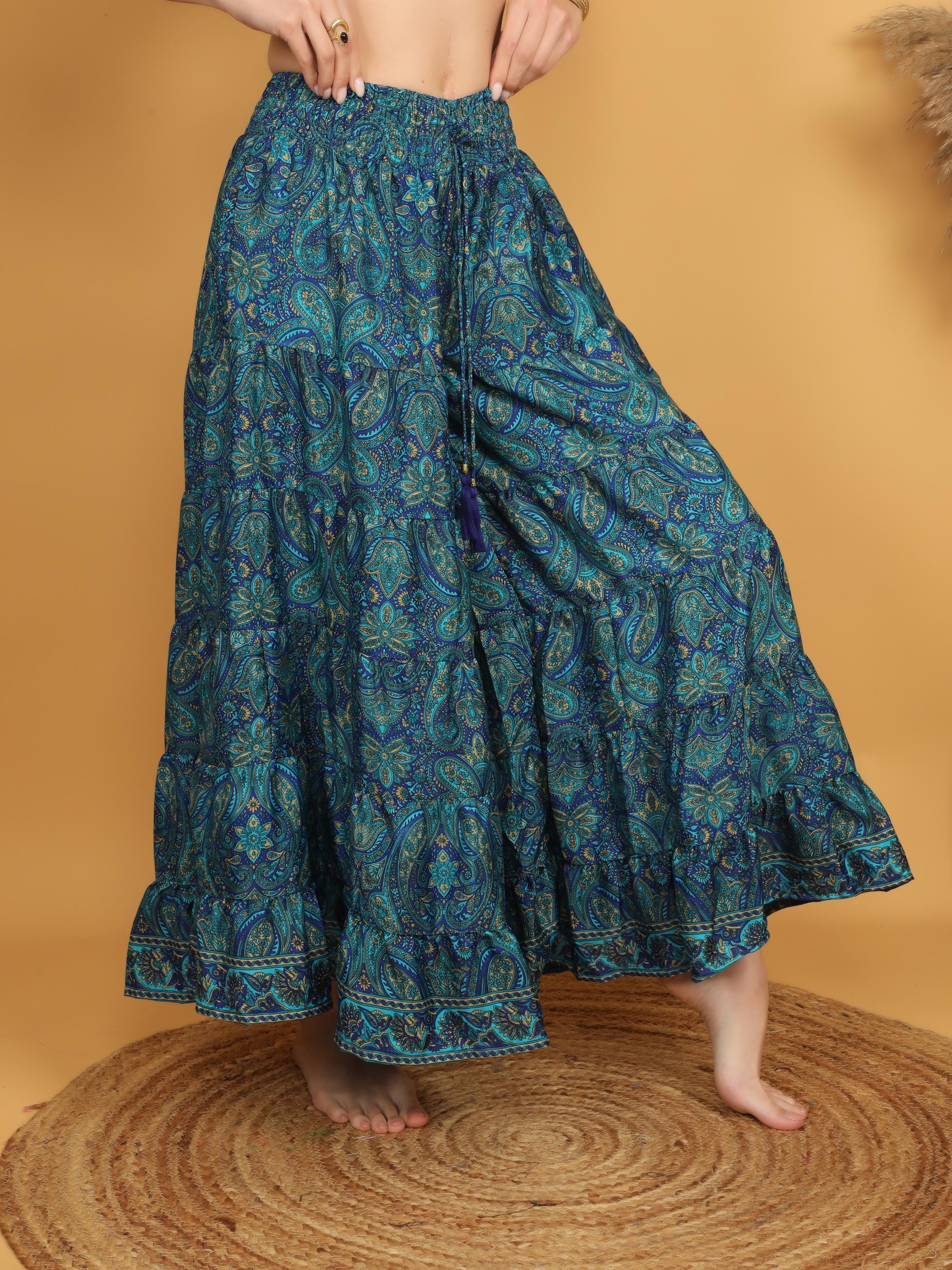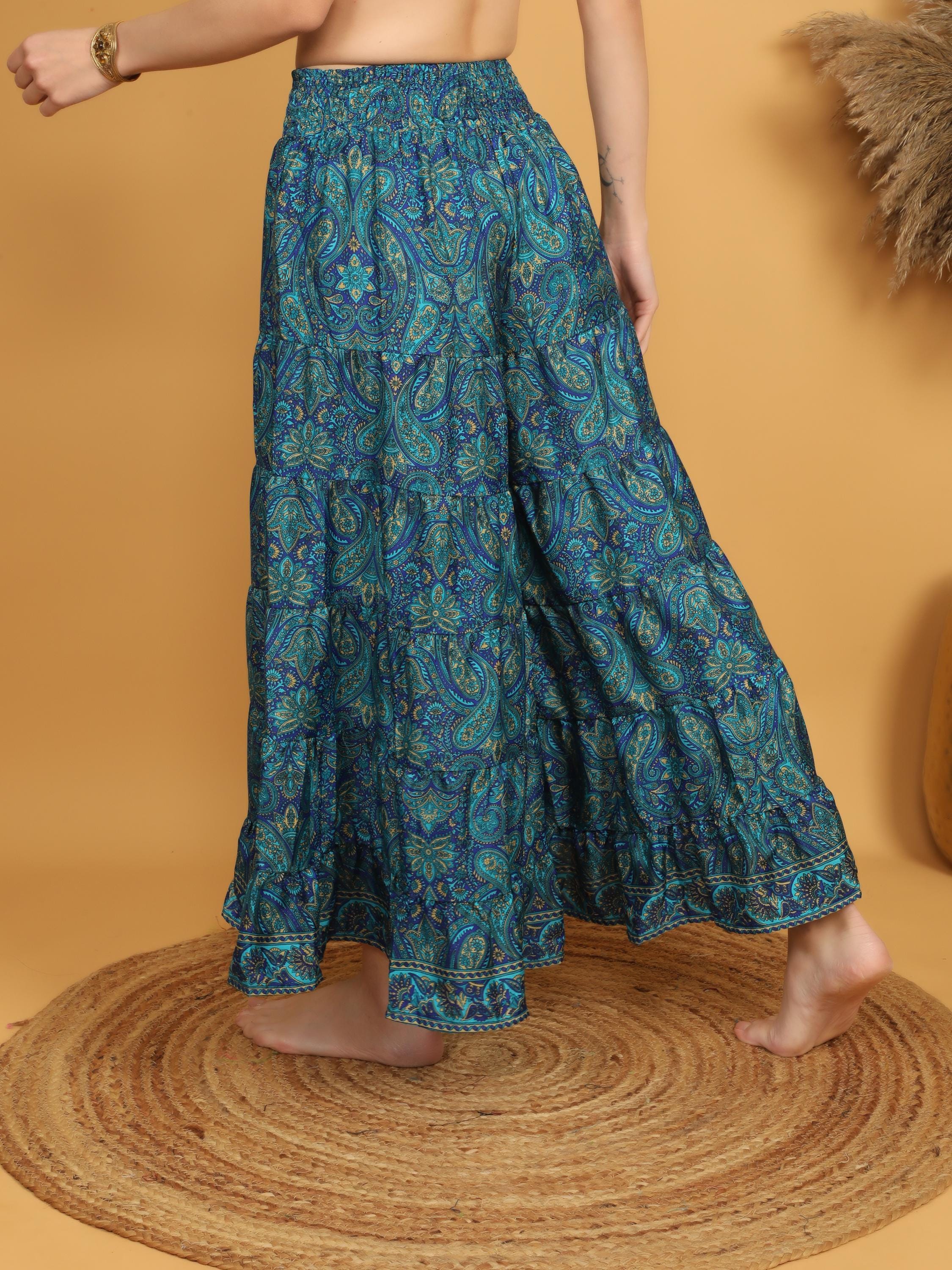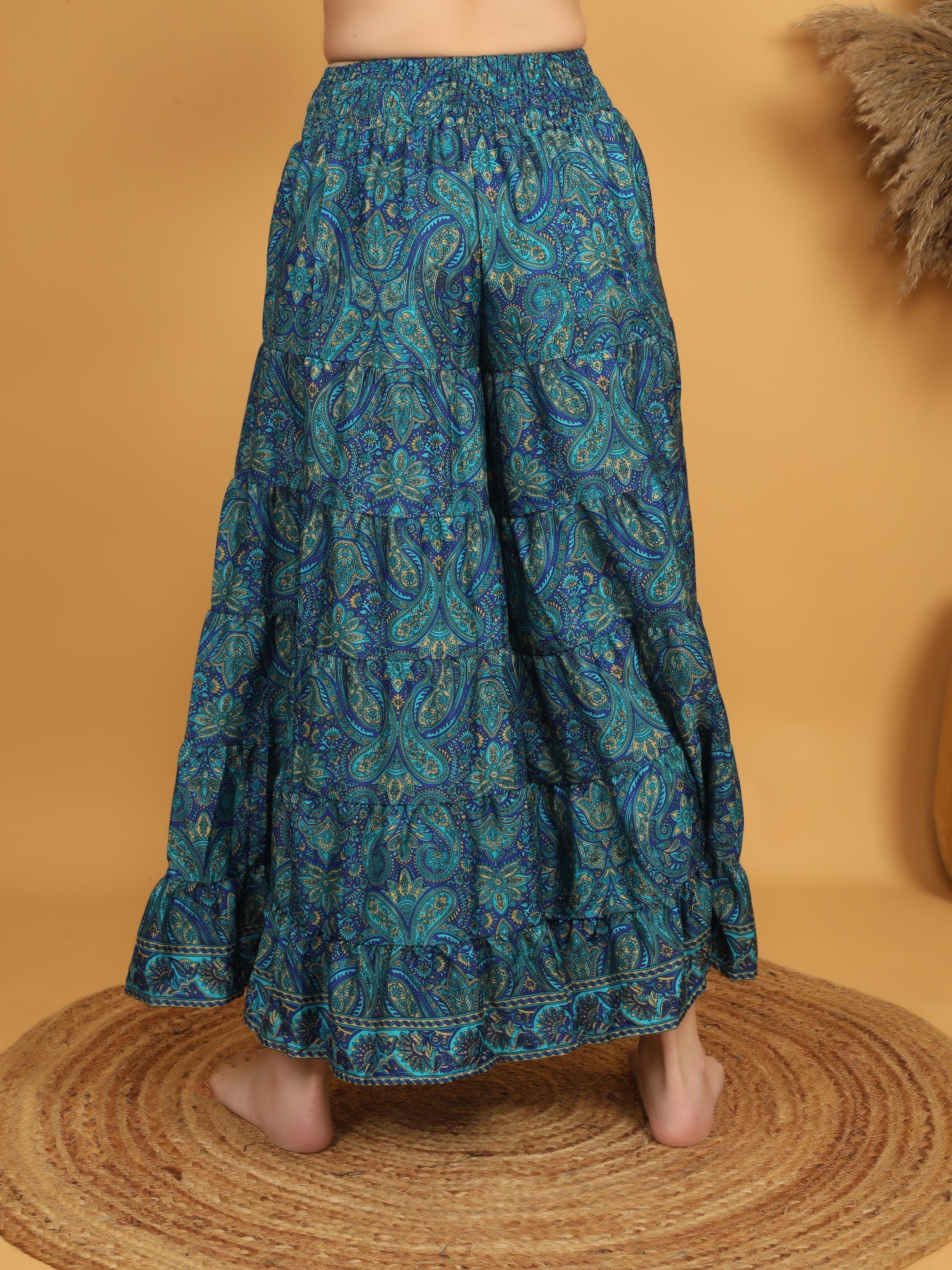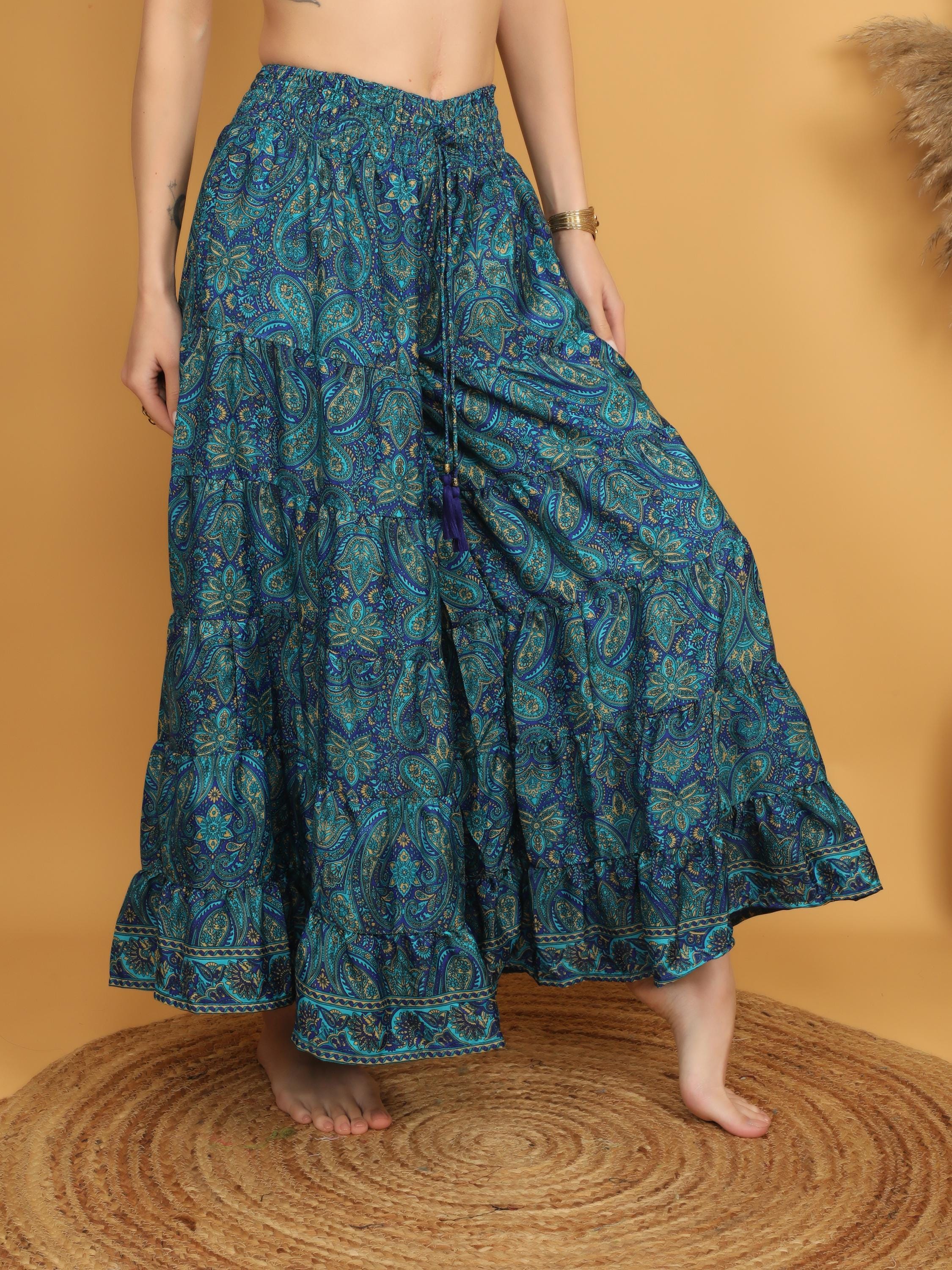 Made from soft, lightweight polyester, the fabric drapes beautifully and creates a graceful silhouette with every step. The rich teal blue base is decorated with intricate paisley motifs in layered tones of turquoise, deep blue, and subtle earthy accents, giving the piece a vibrant and artistic boho character.