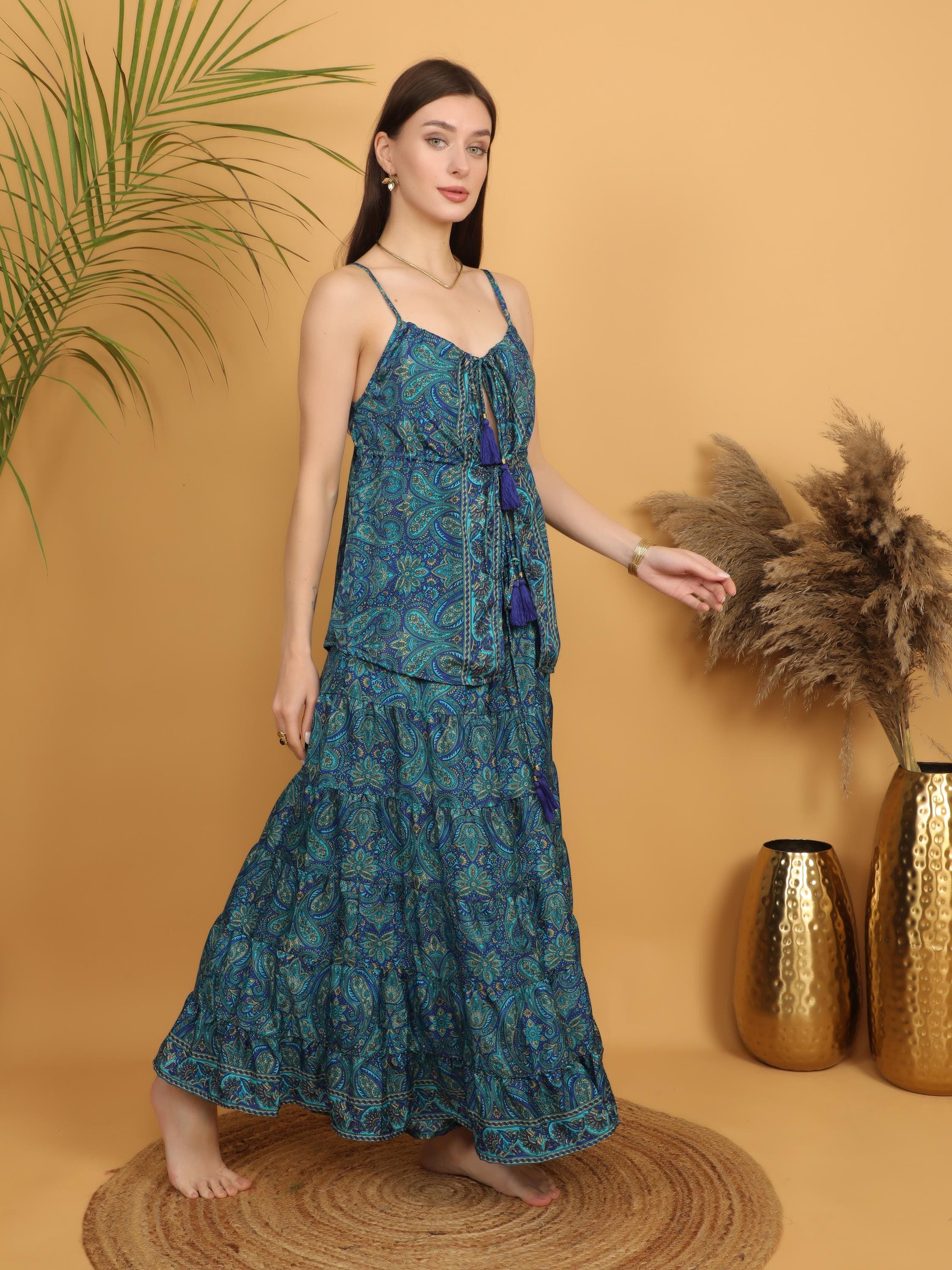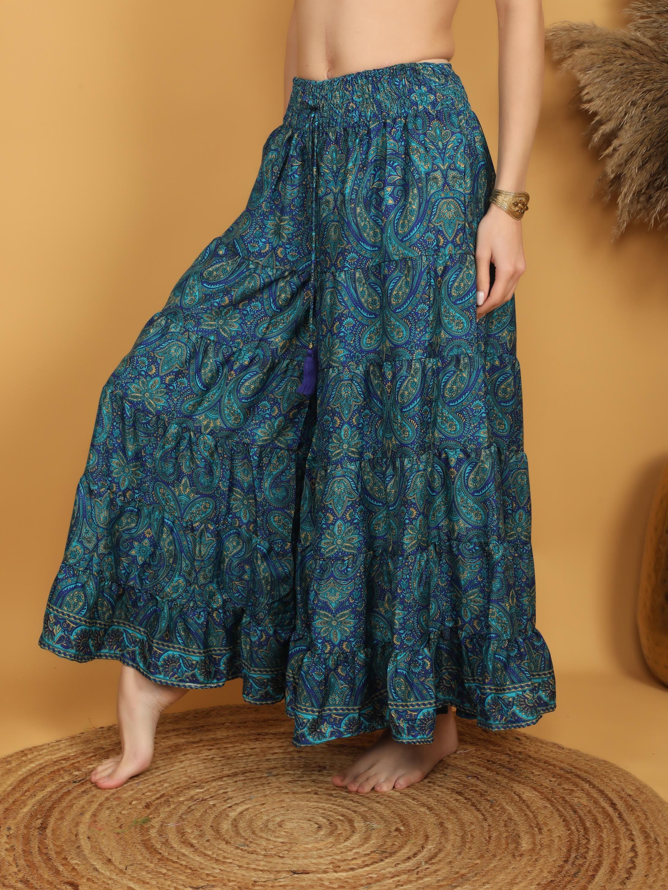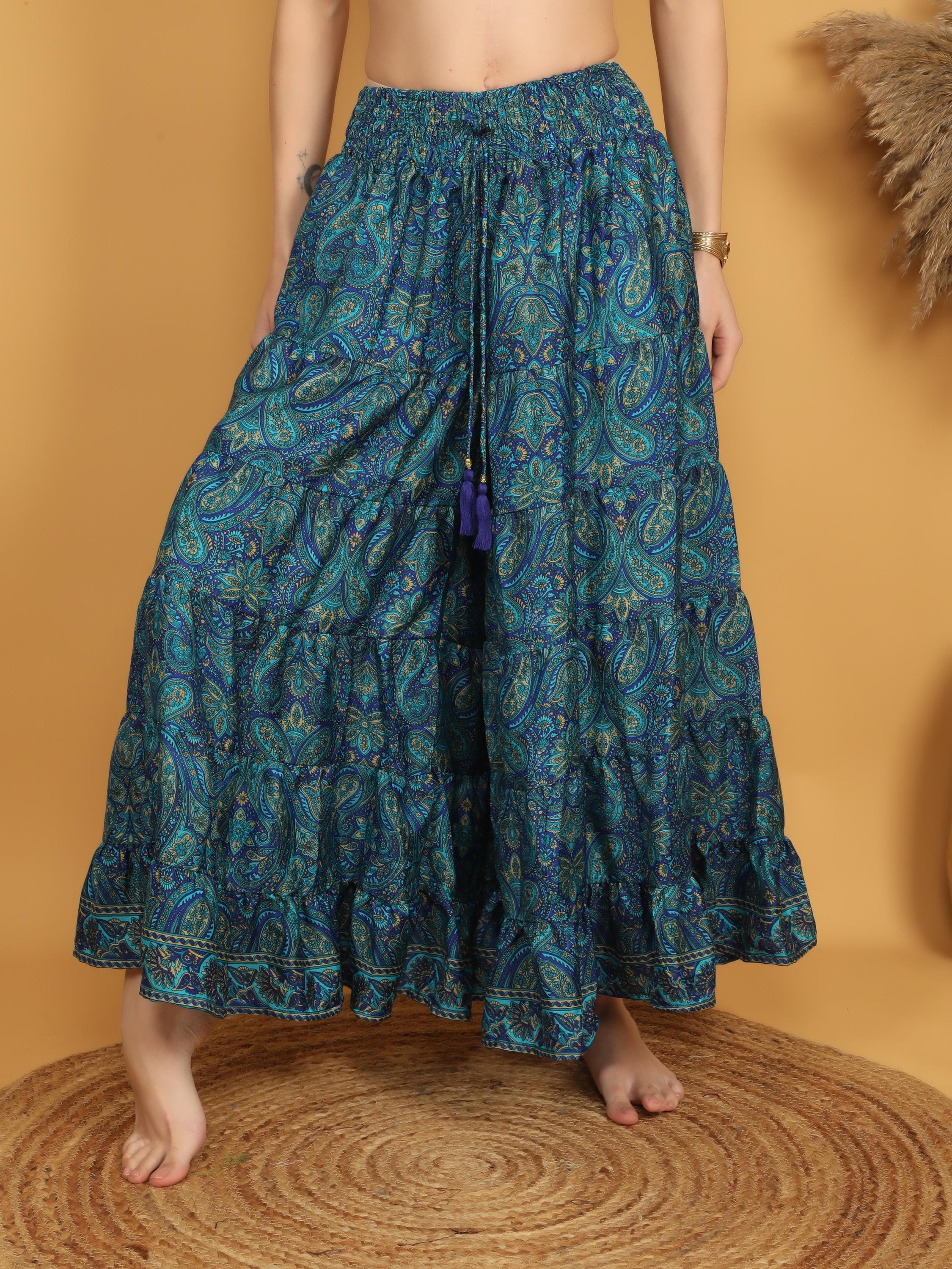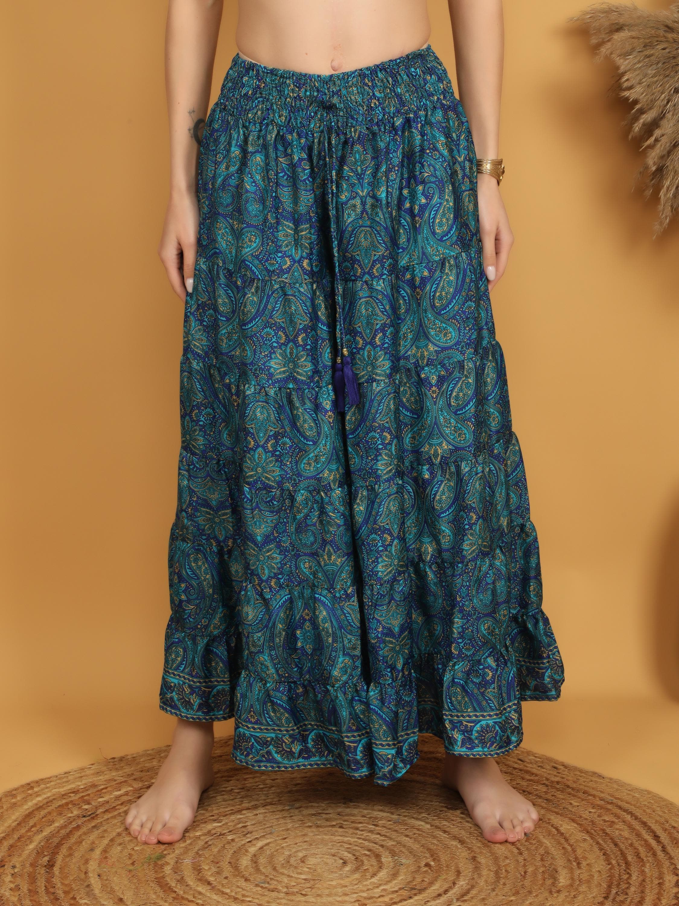 Made from soft, lightweight polyester, the fabric drapes beautifully and creates a graceful silhouette with every step. The rich teal blue base is decorated with intricate paisley motifs in layered tones of turquoise, deep blue, and subtle earthy accents, giving the piece a vibrant and artistic boho character.
