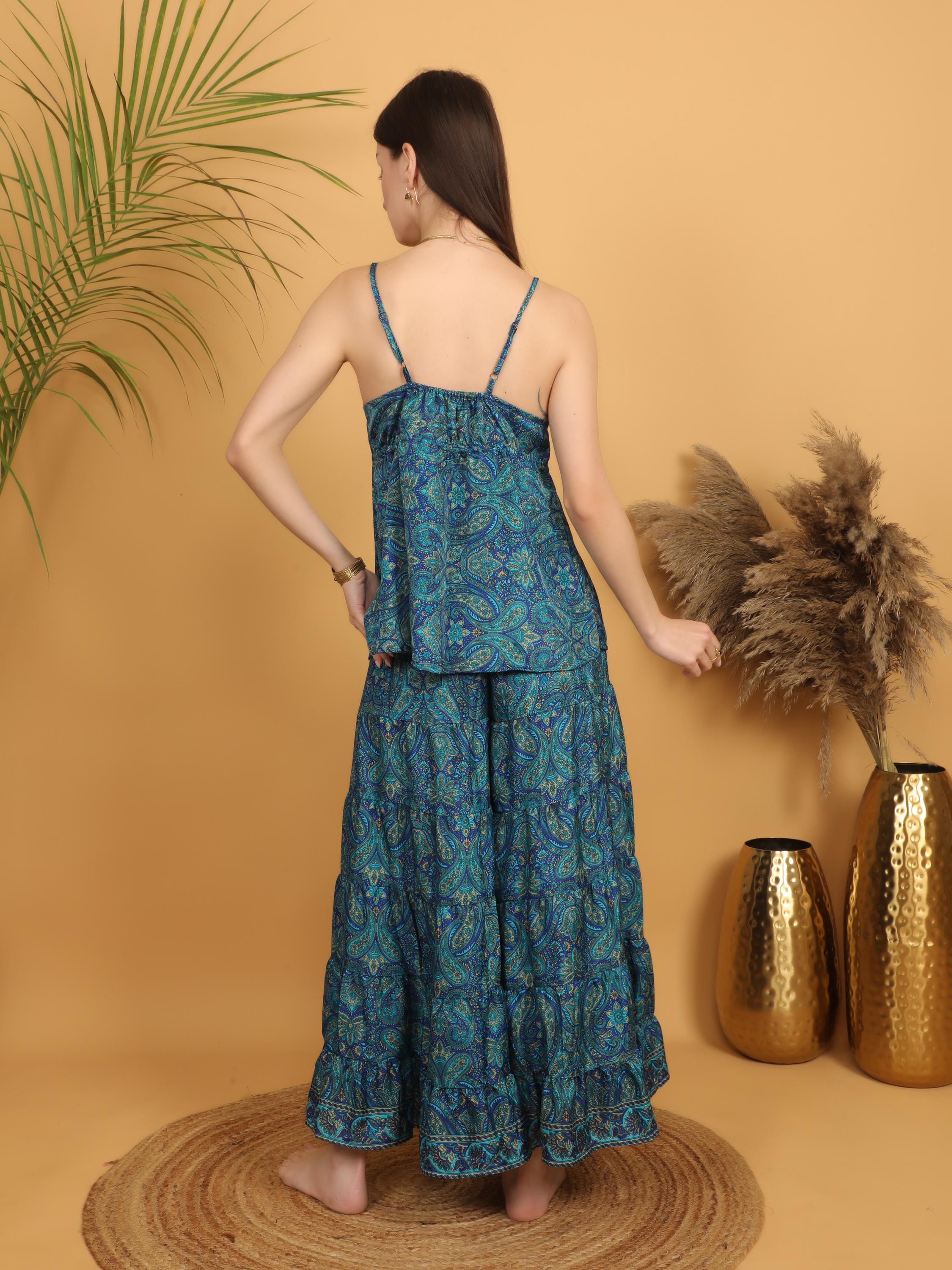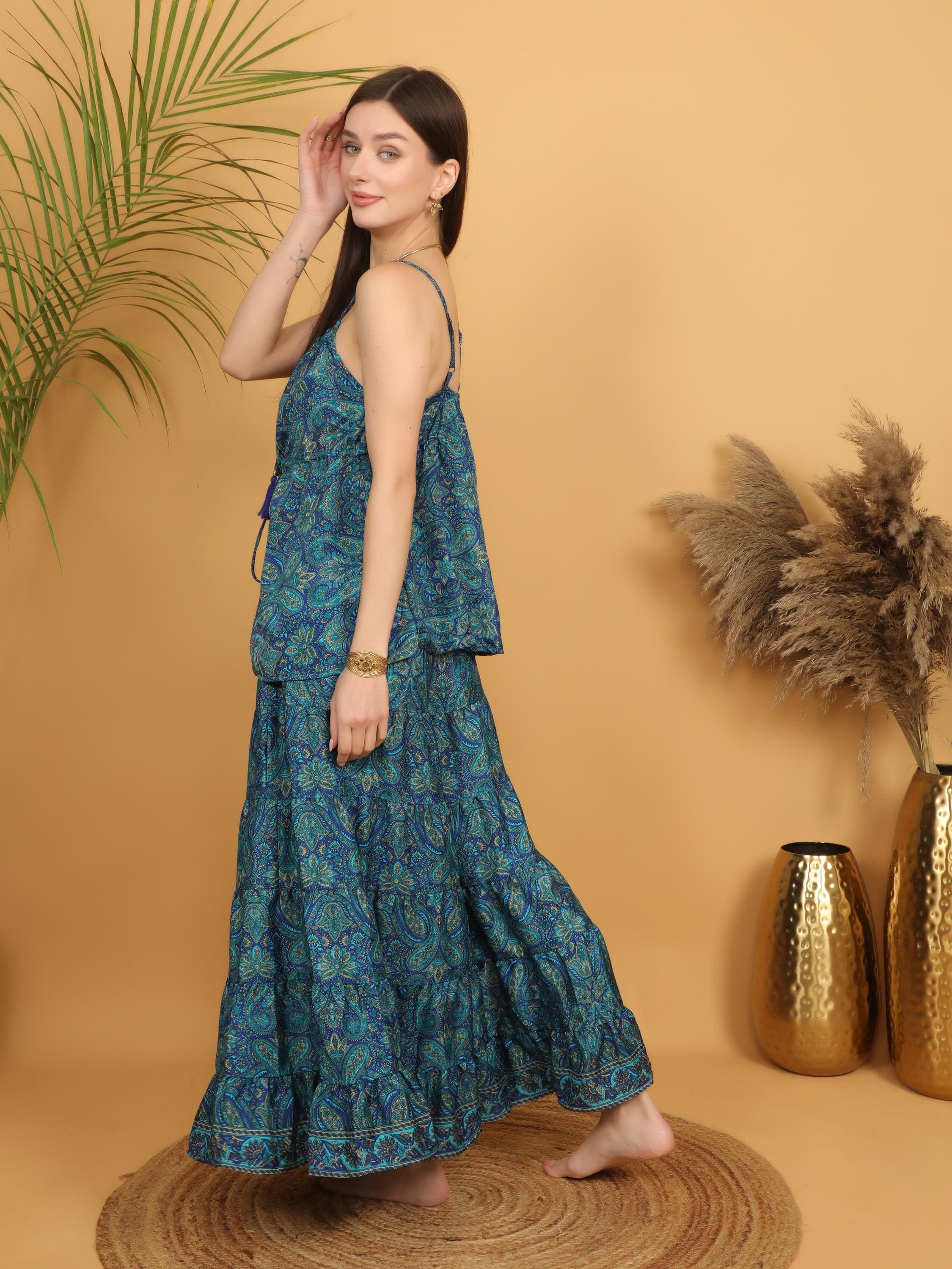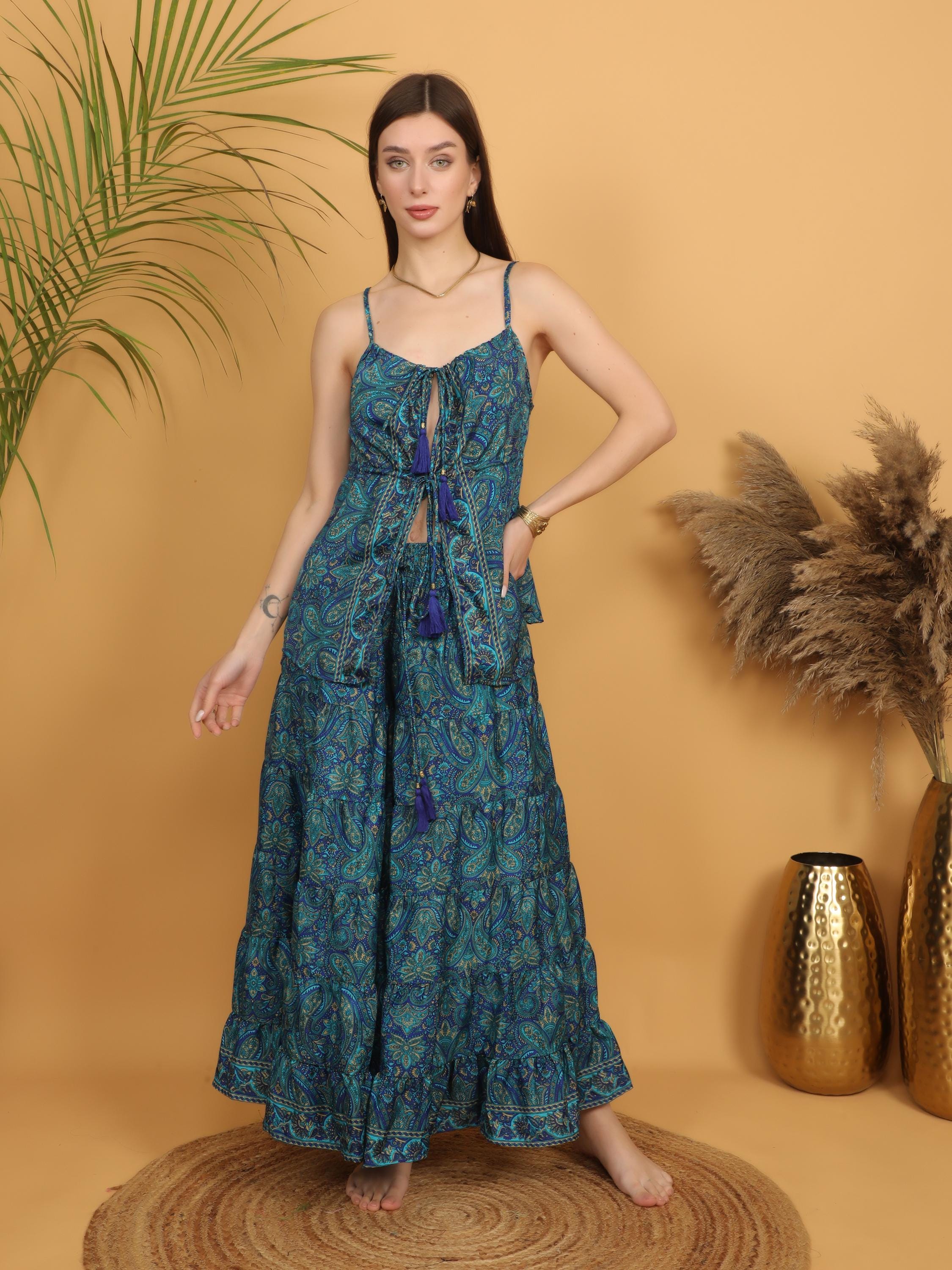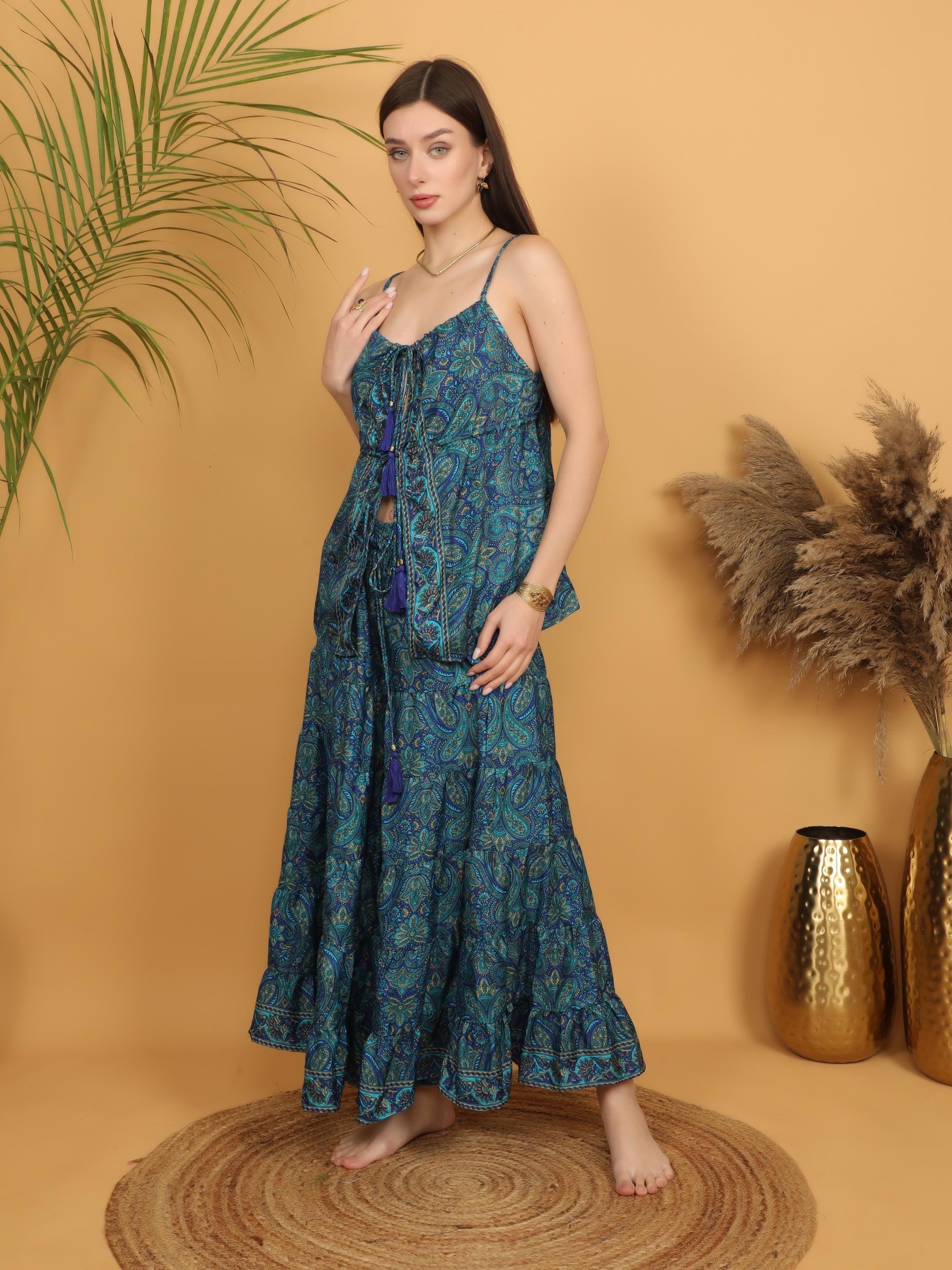 Made from soft, lightweight polyester, the fabric drapes beautifully and creates a graceful silhouette with every step. The rich teal blue base is decorated with intricate paisley motifs in layered tones of turquoise, deep blue, and subtle earthy accents, giving the piece a vibrant and artistic boho character.