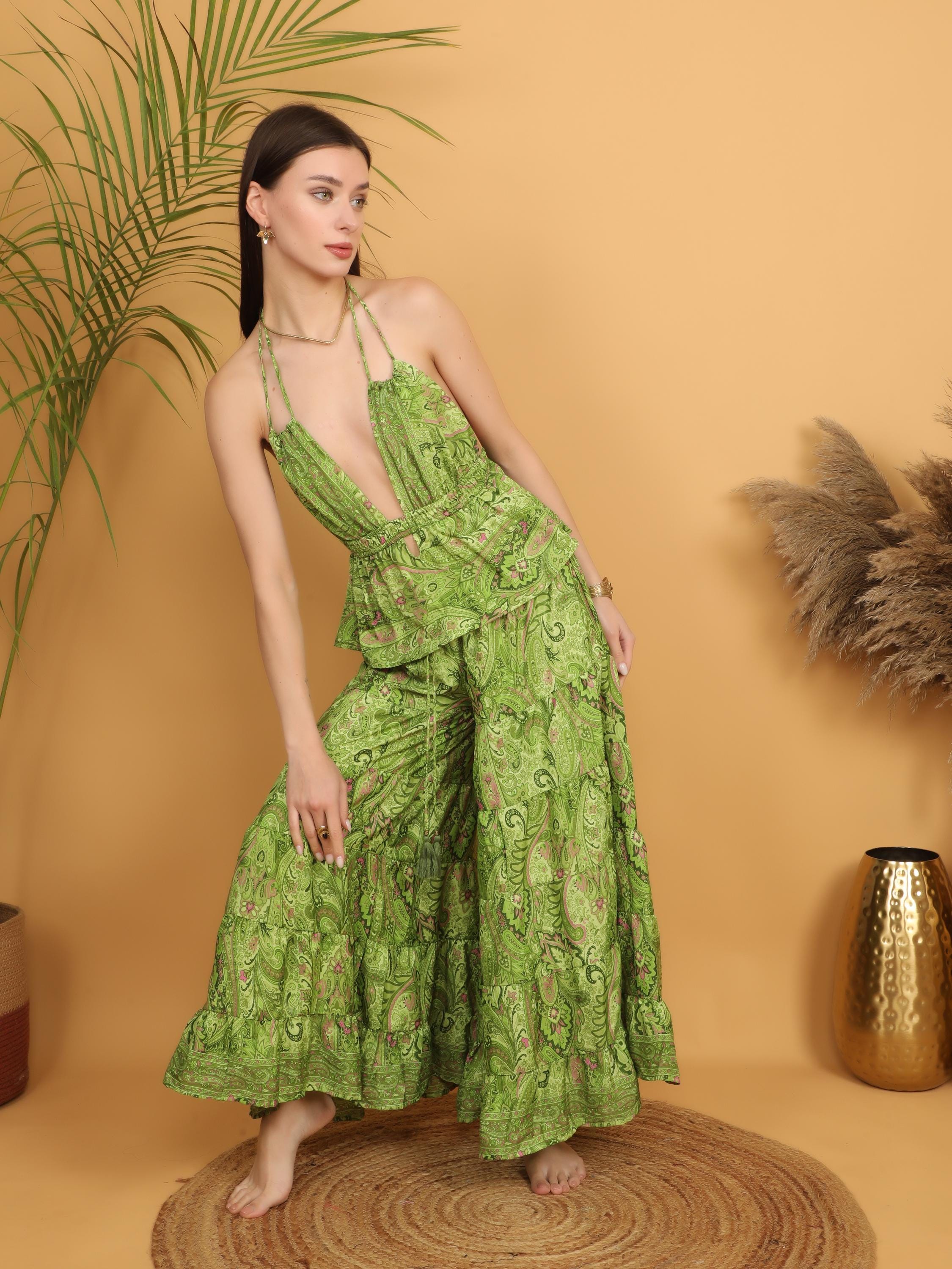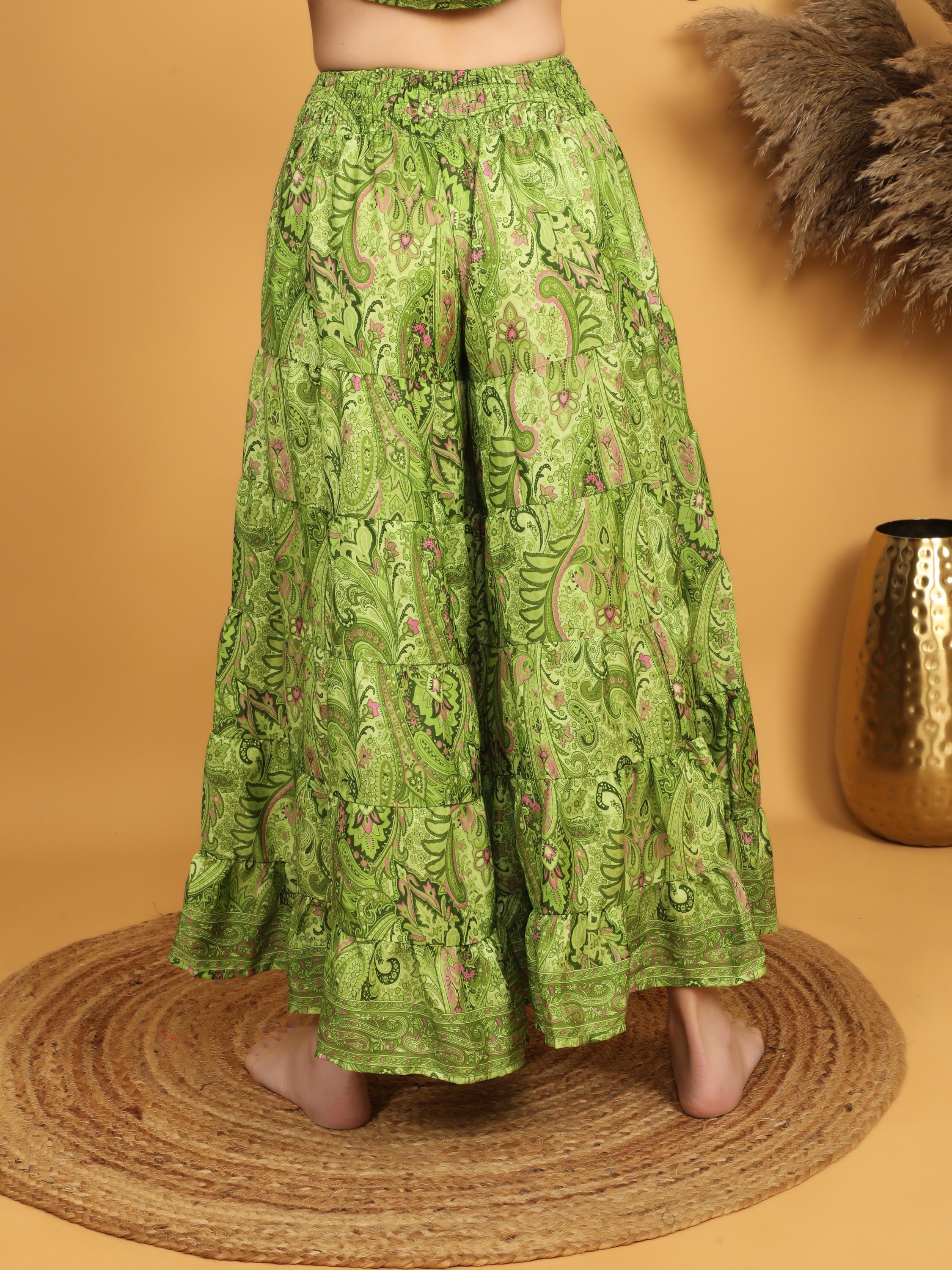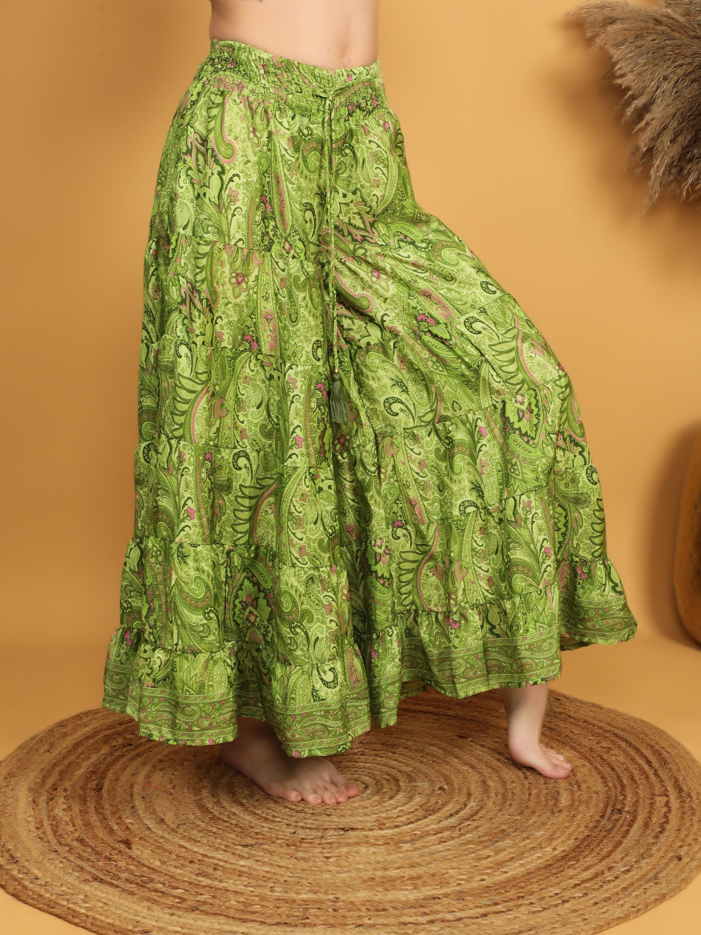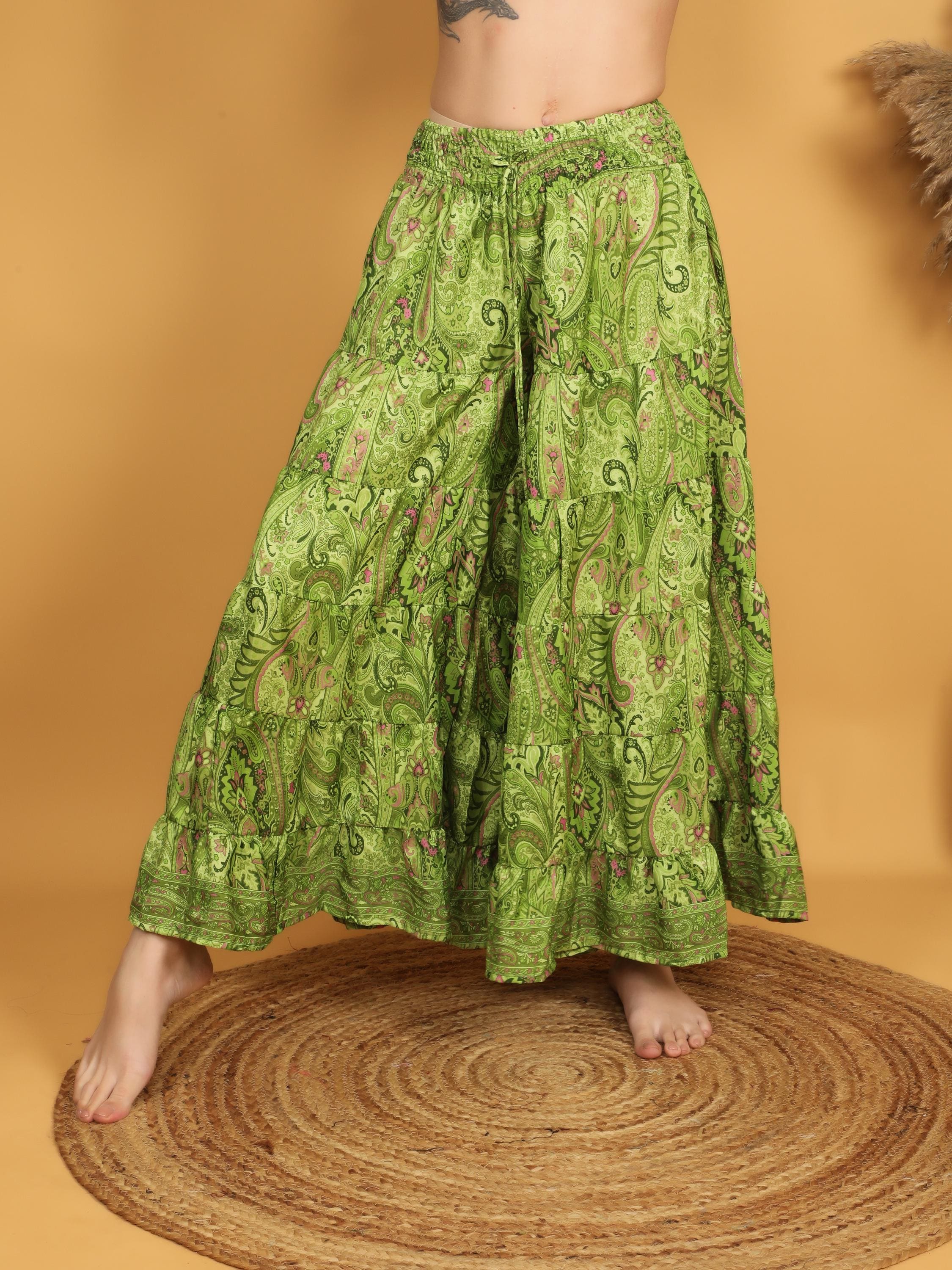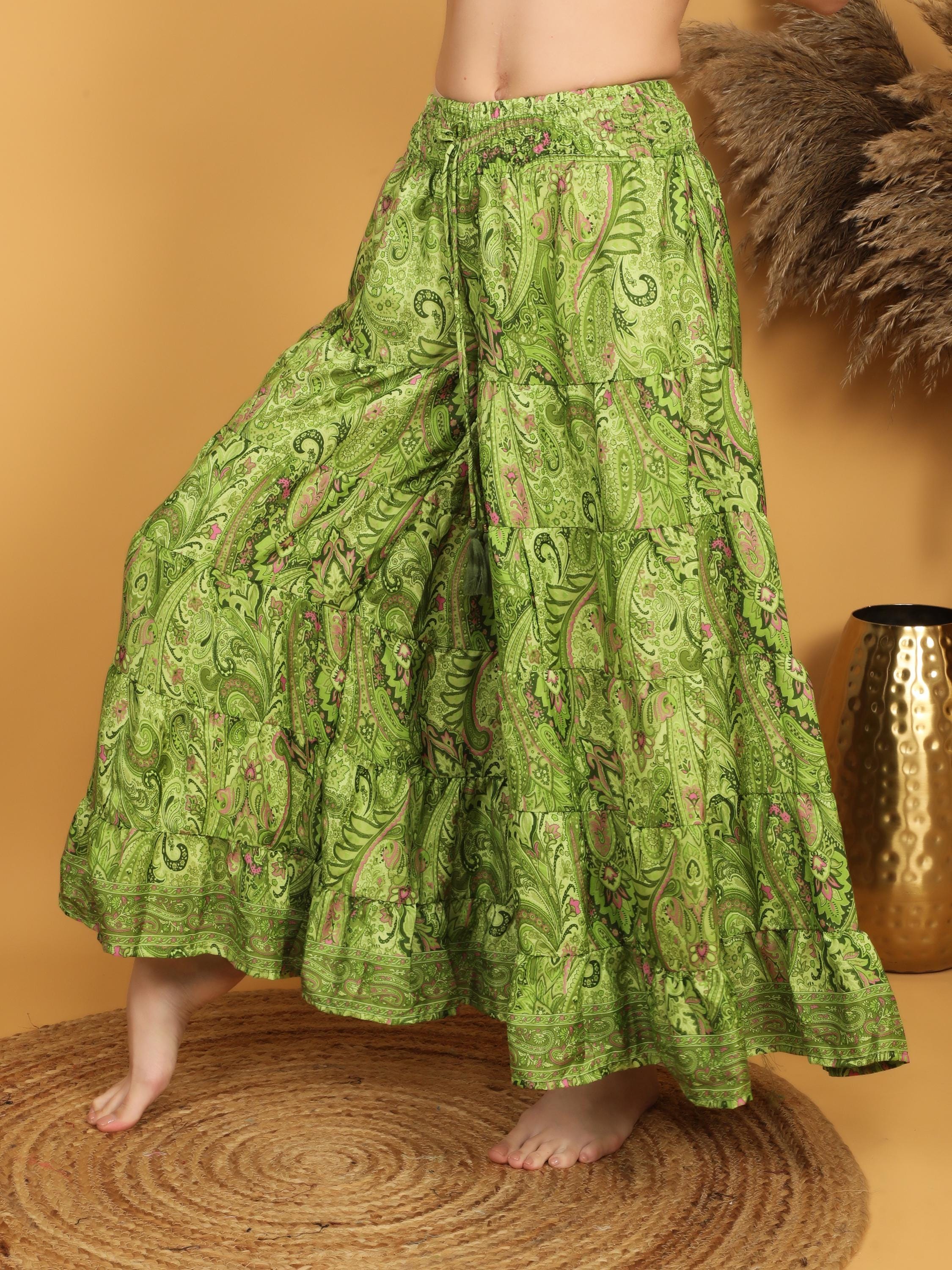 Bring vibrant energy to your wardrobe with these eye-catching green paisley palazzo pants. Designed with dramatic volume and a fluid silhouette, these trousers create beautiful movement while offering effortless comfort.