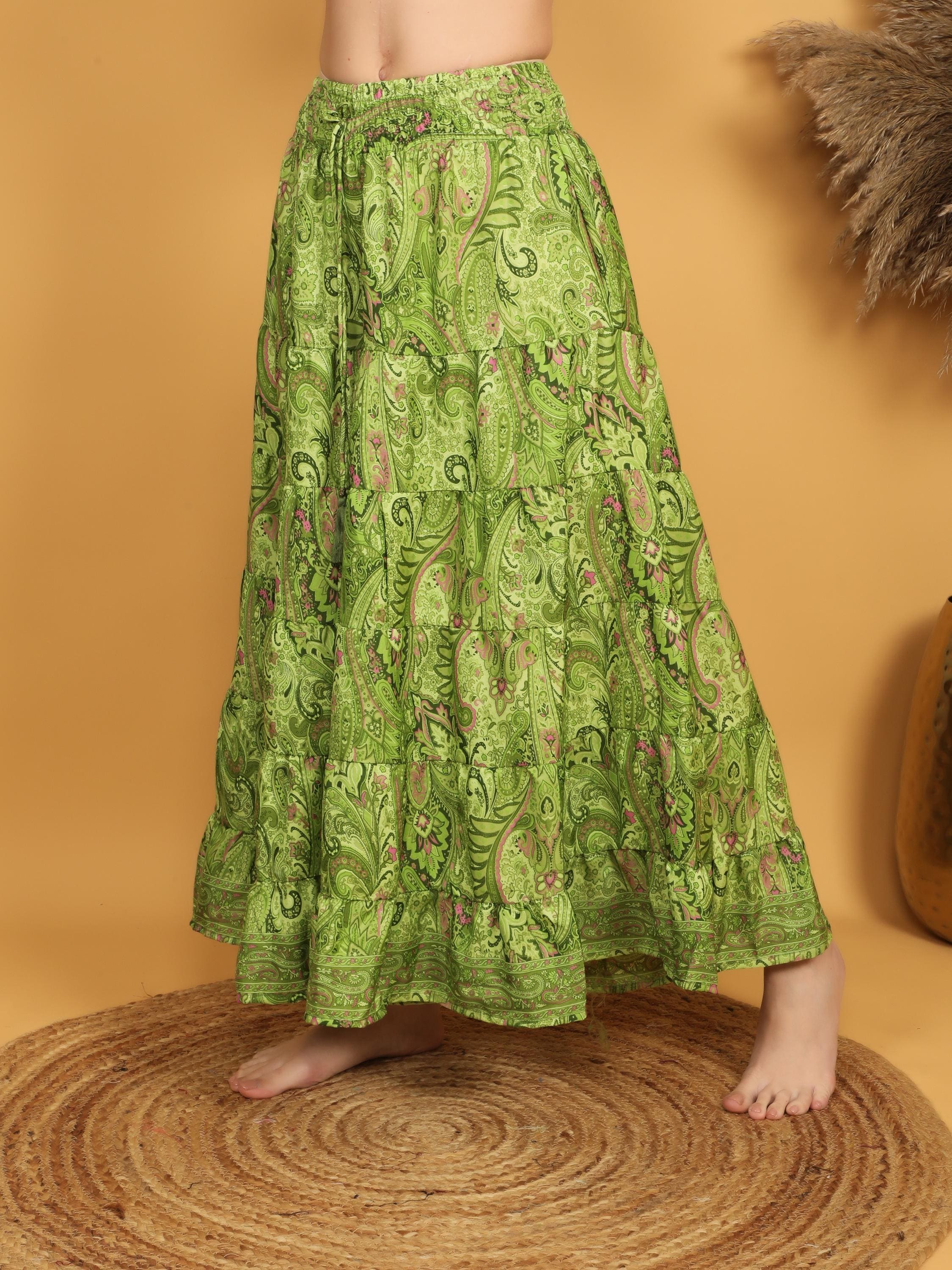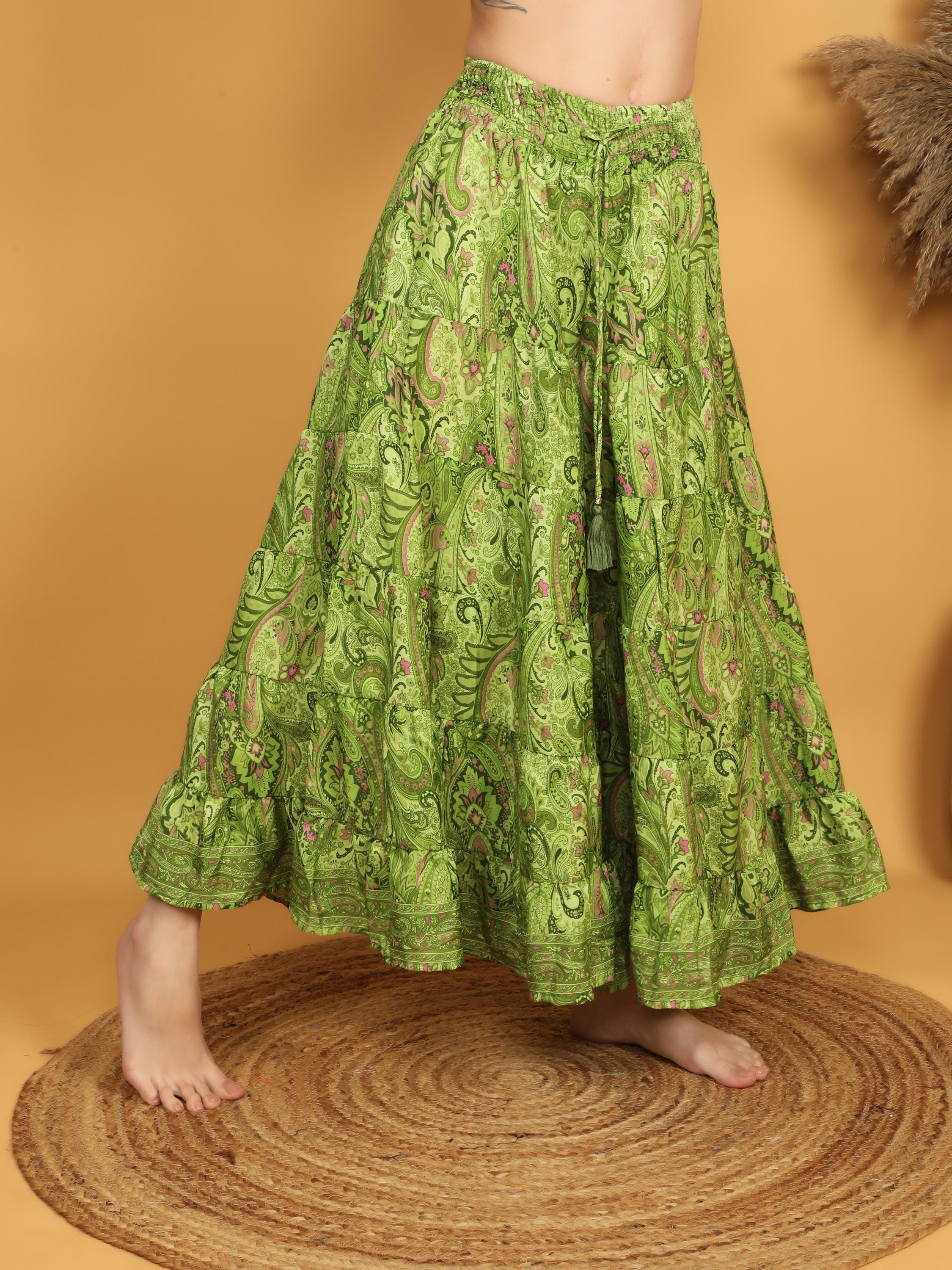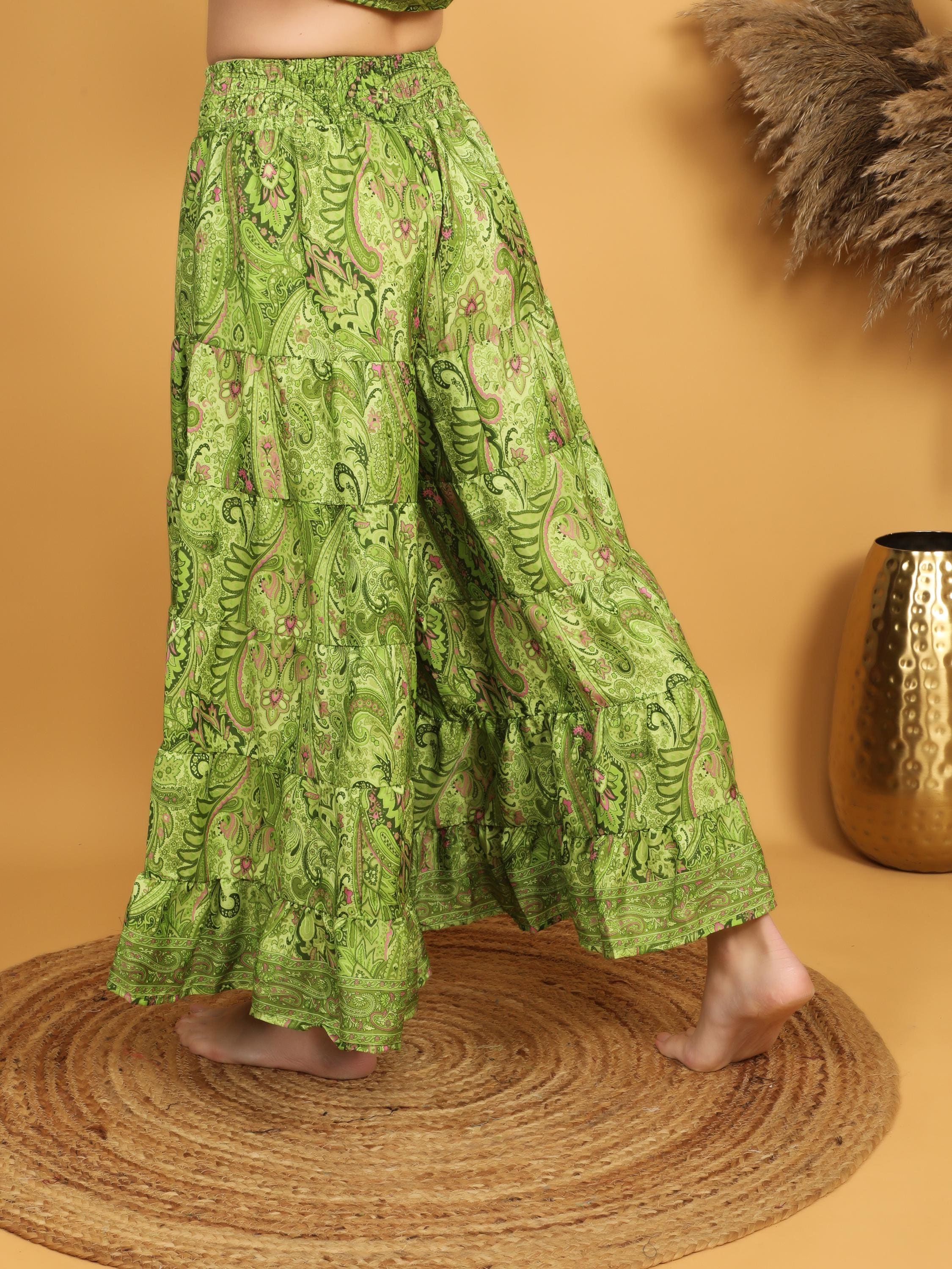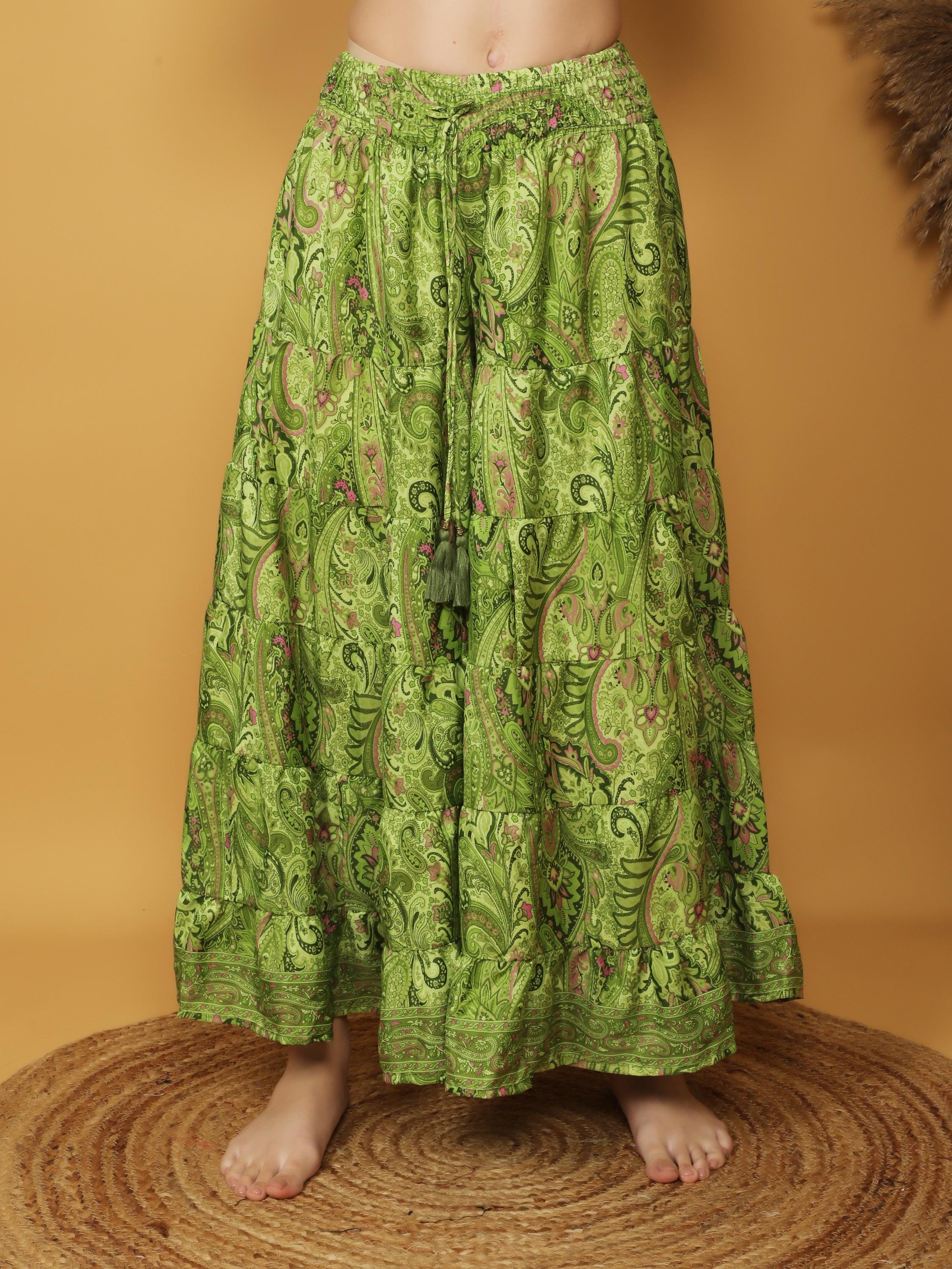 Bring vibrant energy to your wardrobe with these eye-catching green paisley palazzo pants. Designed with dramatic volume and a fluid silhouette, these trousers create beautiful movement while offering effortless comfort.