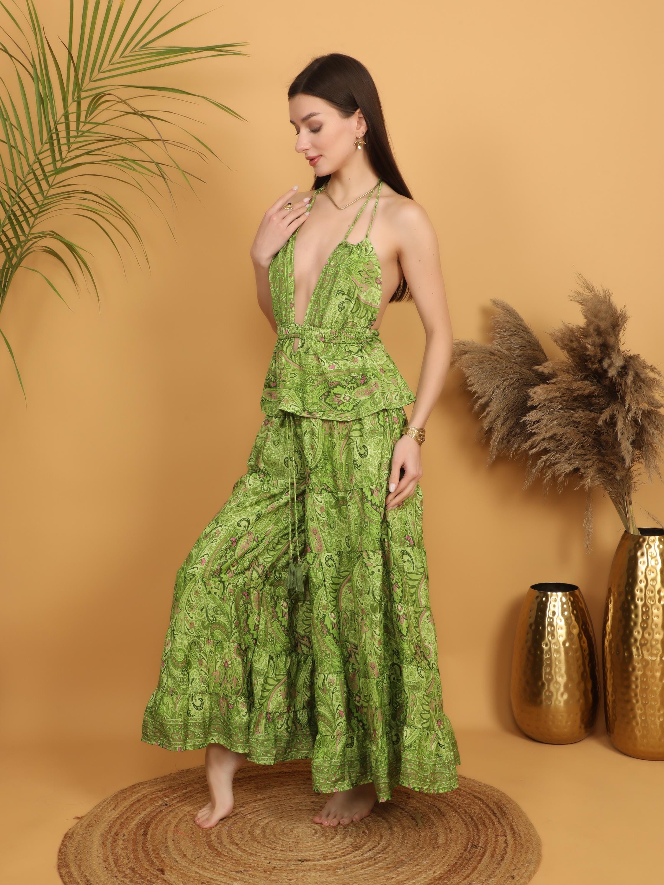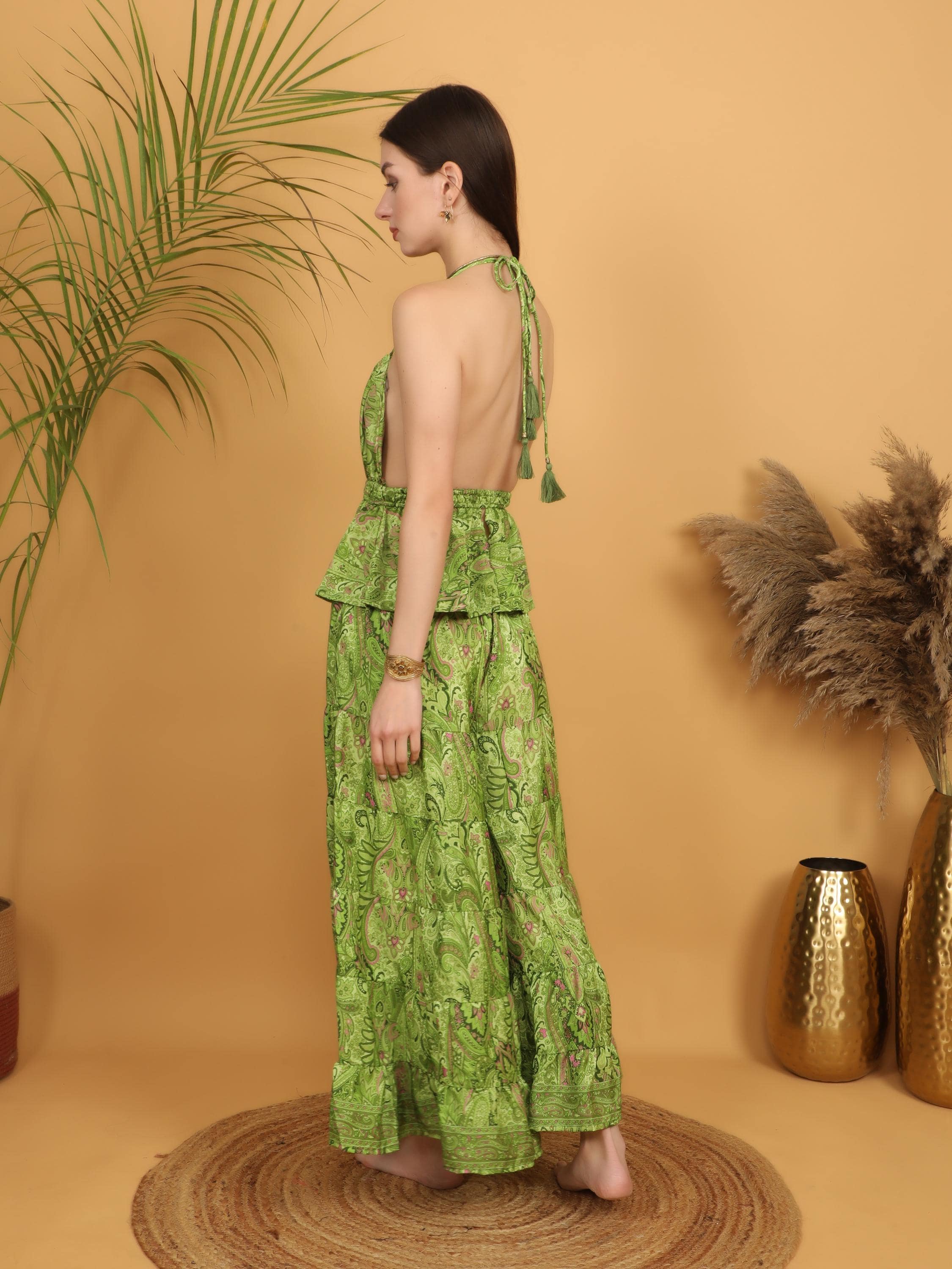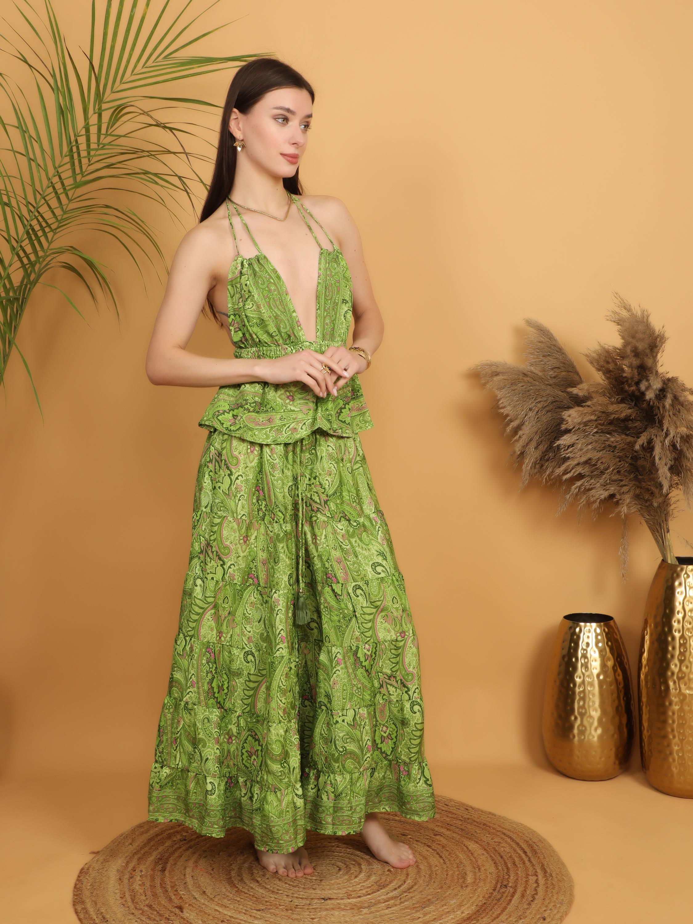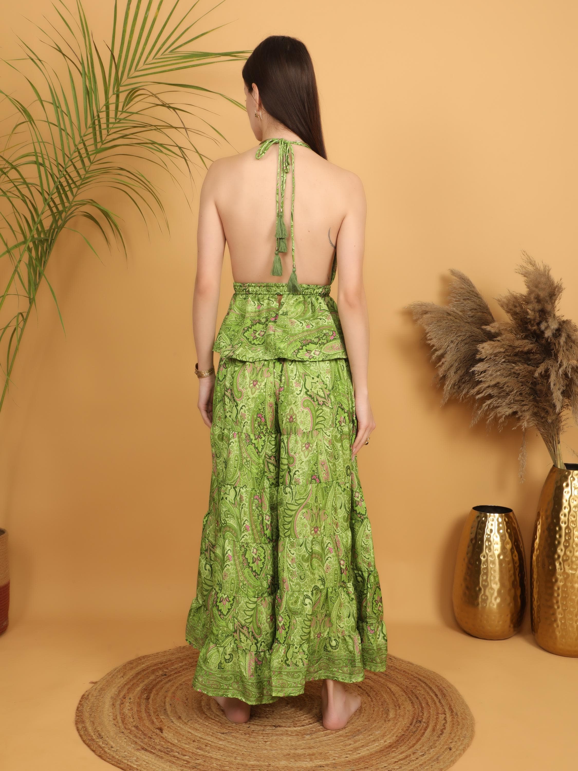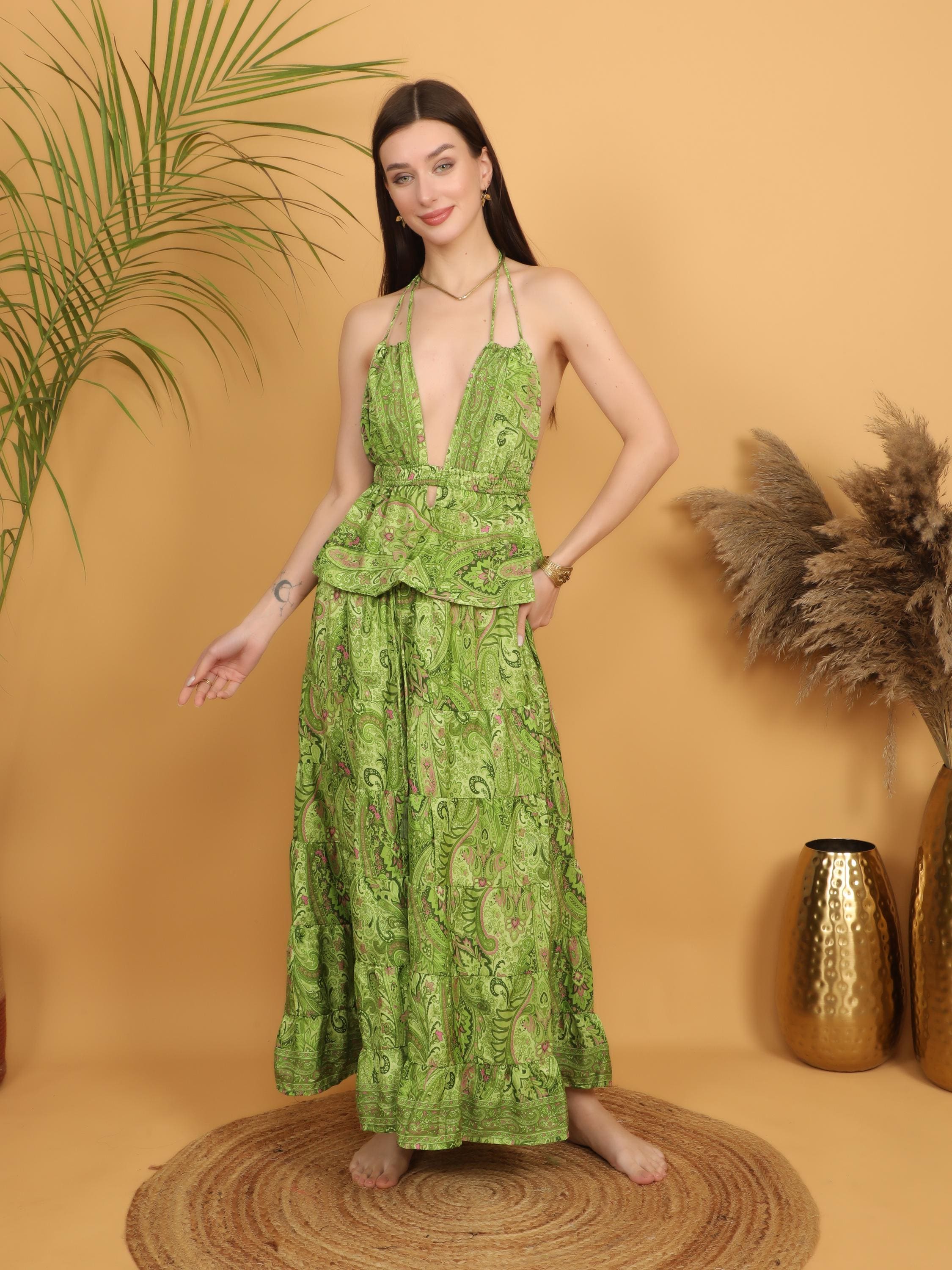 Bring vibrant energy to your wardrobe with these eye-catching green paisley palazzo pants. Designed with dramatic volume and a fluid silhouette, these trousers create beautiful movement while offering effortless comfort.