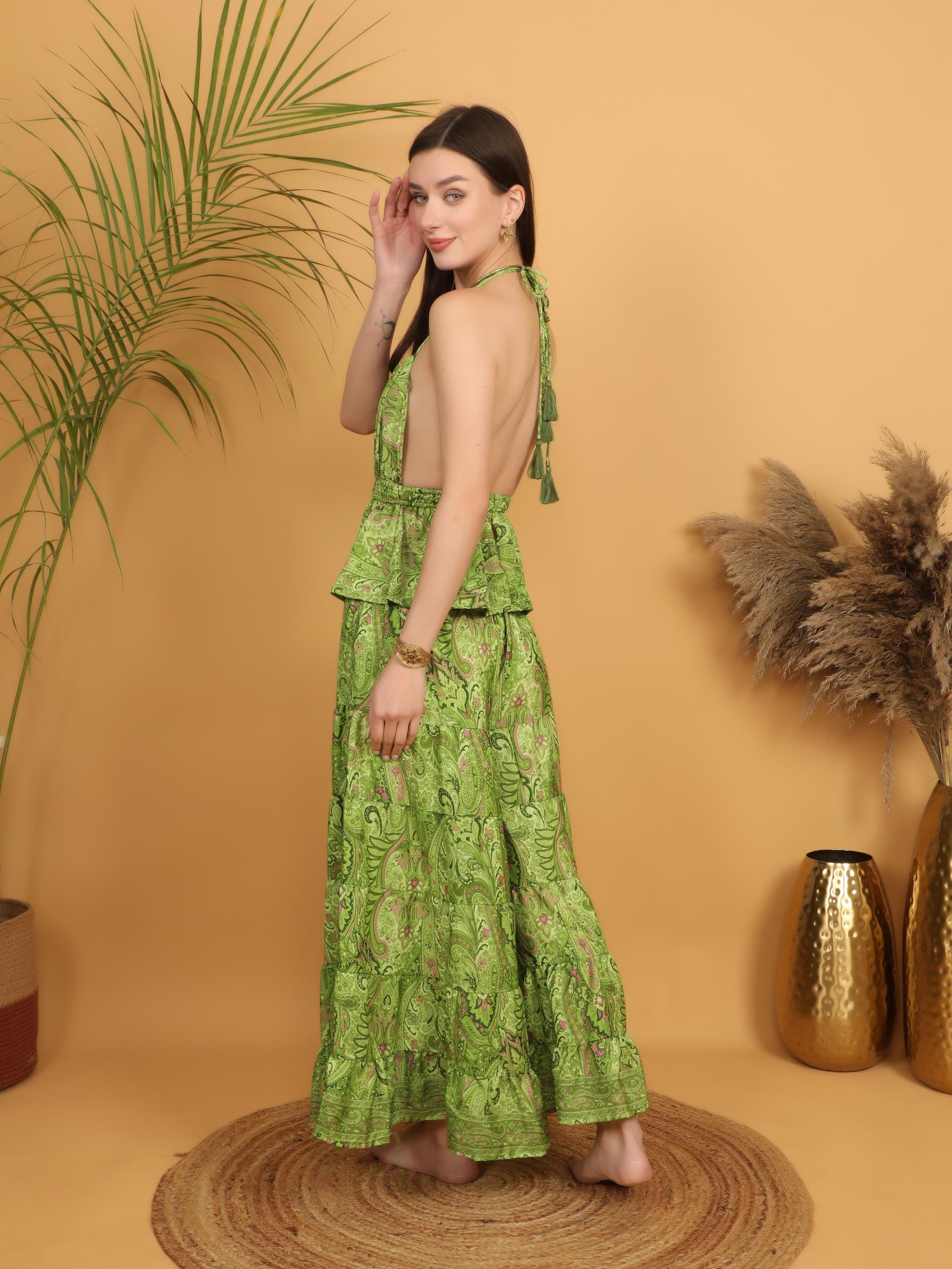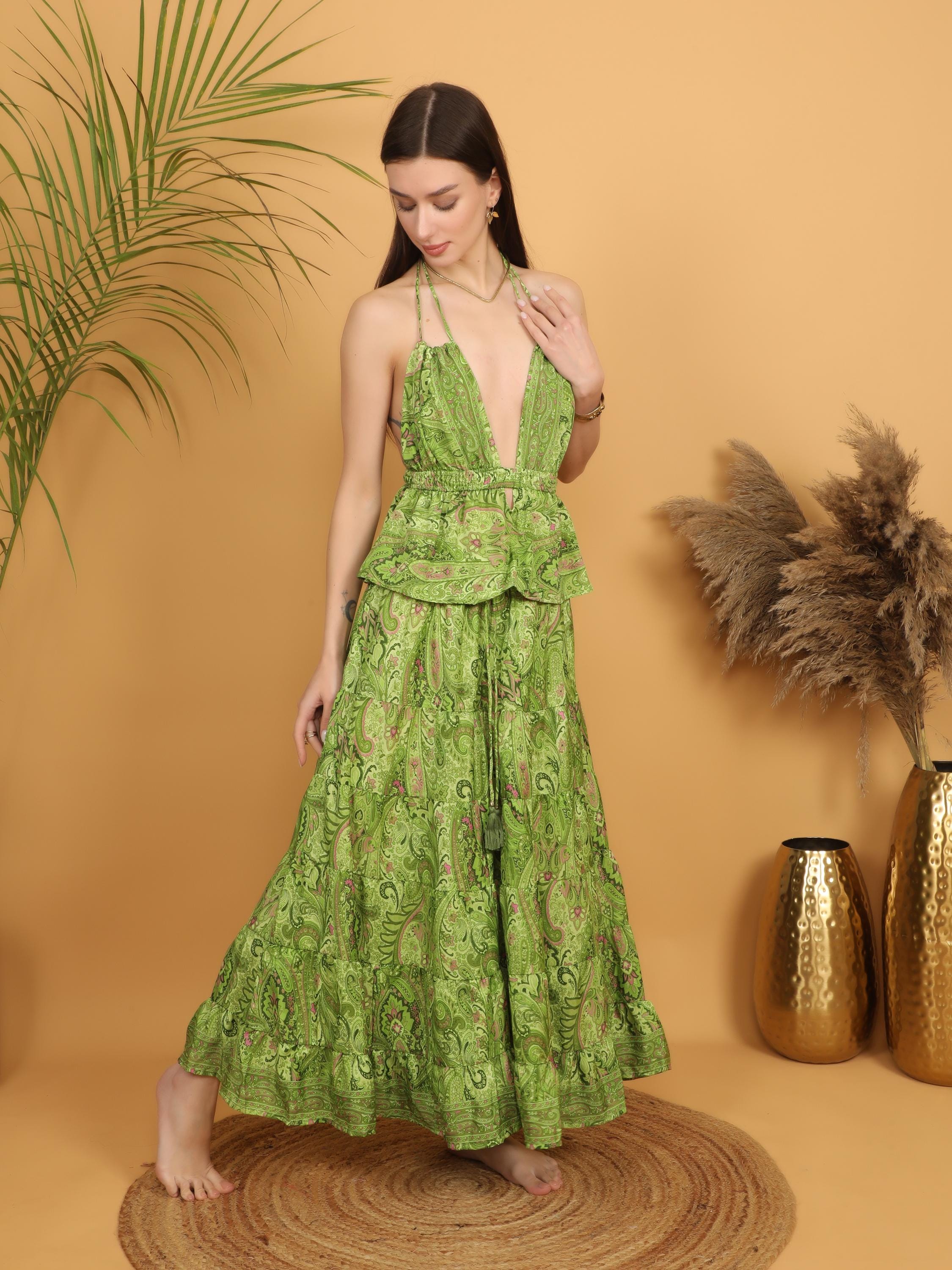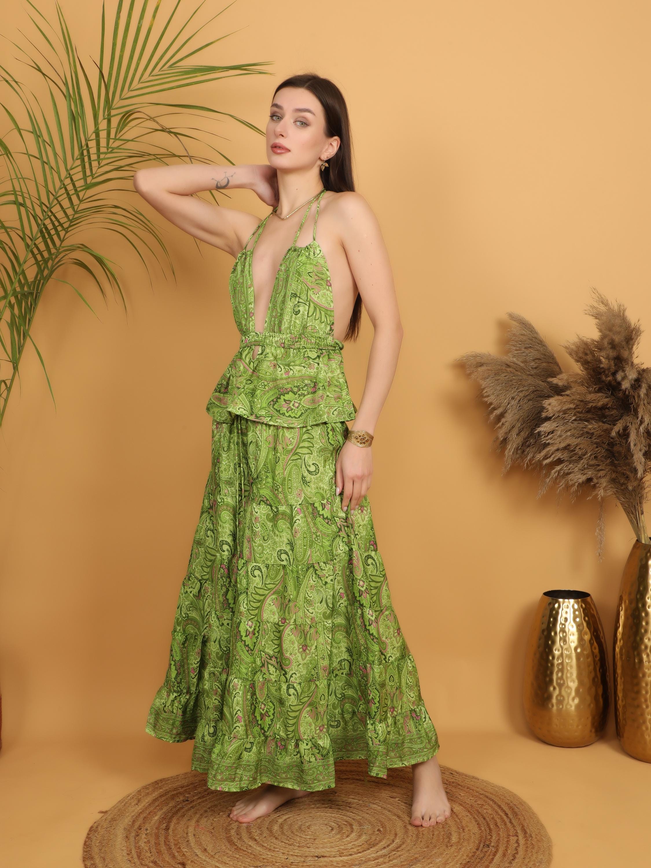 Made from lightweight, breathable polyester, the fabric drapes softly and flows with every step. The rich green base is layered with intricate paisley motifs in tonal greens and subtle pink accents, creating depth and visual interest throughout the design.