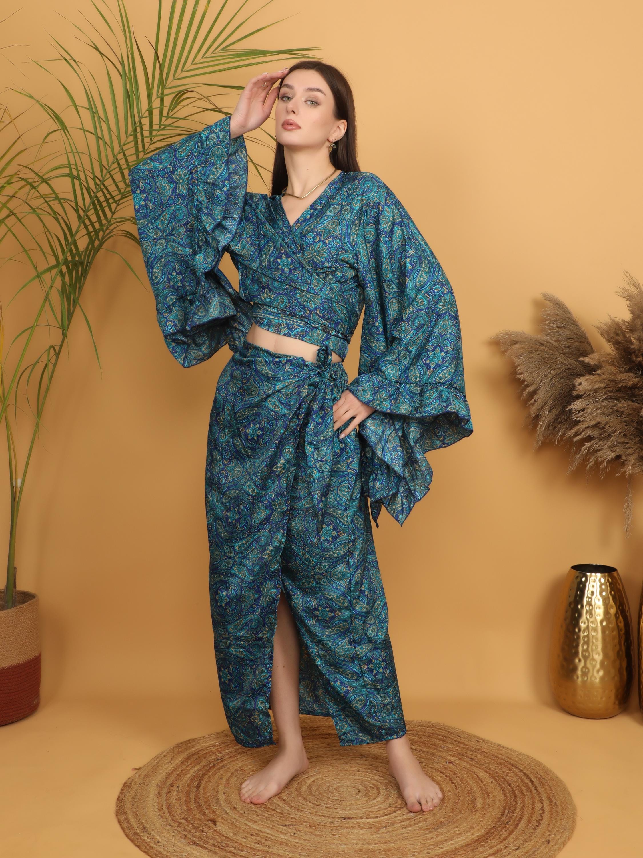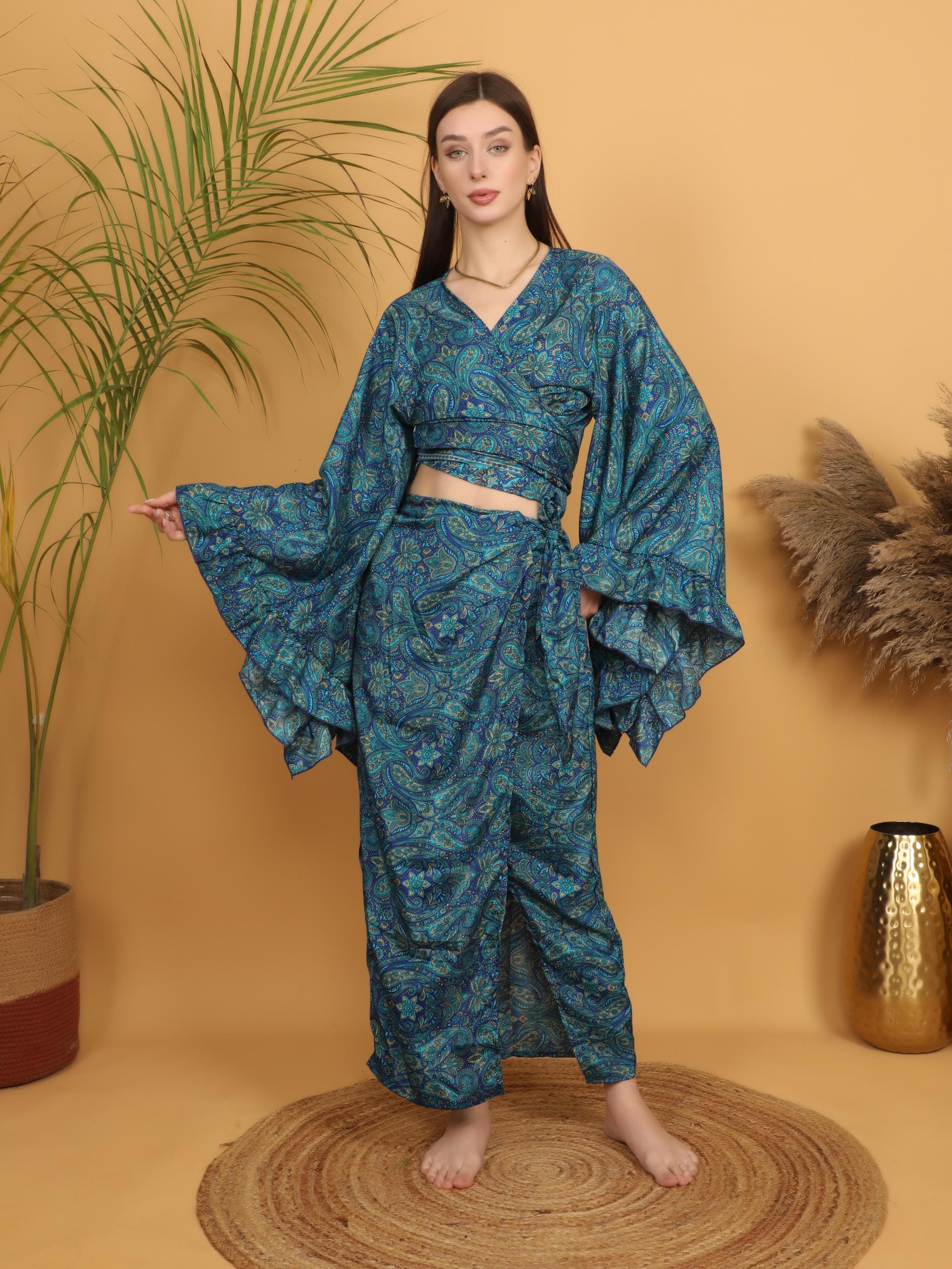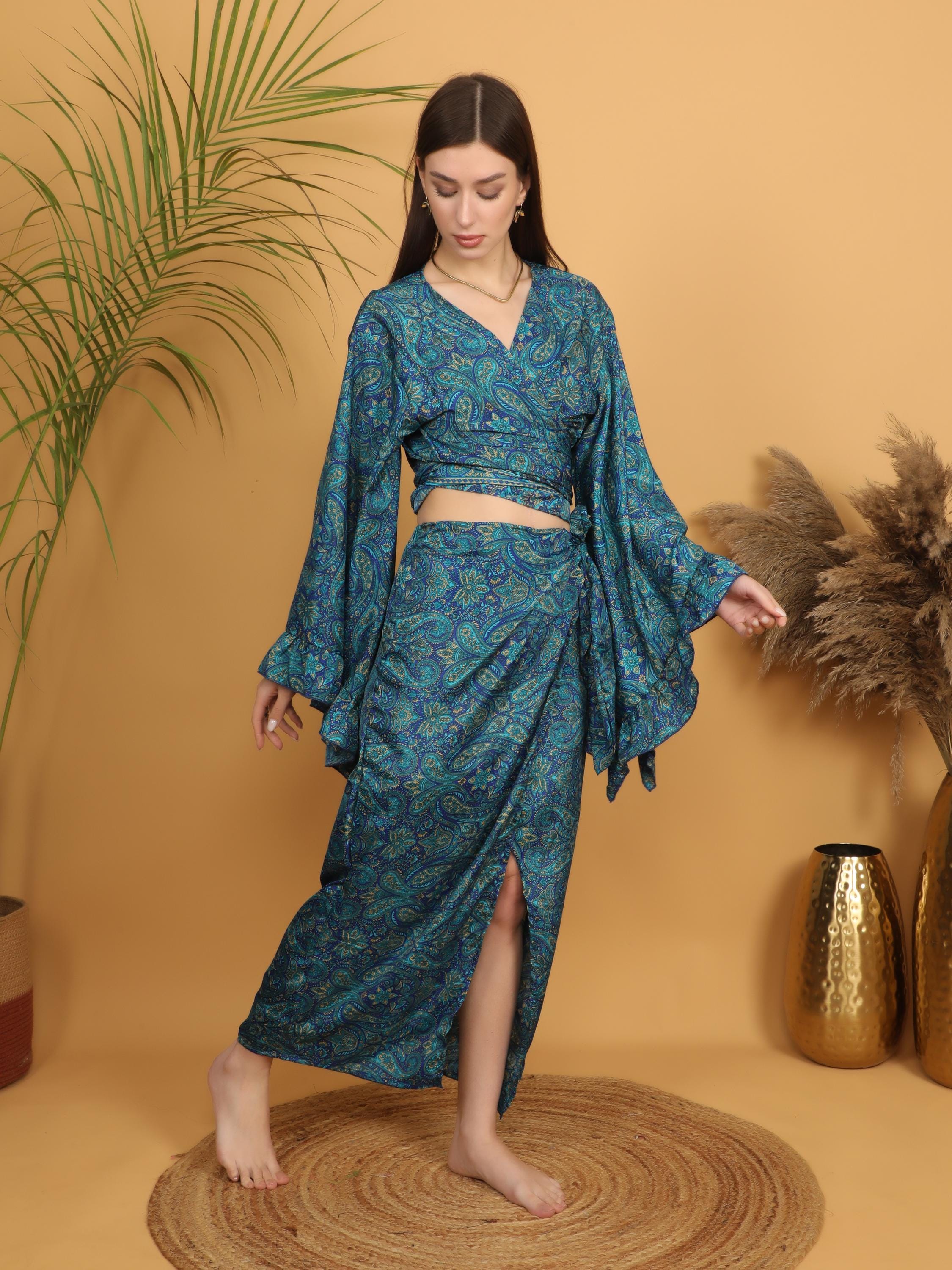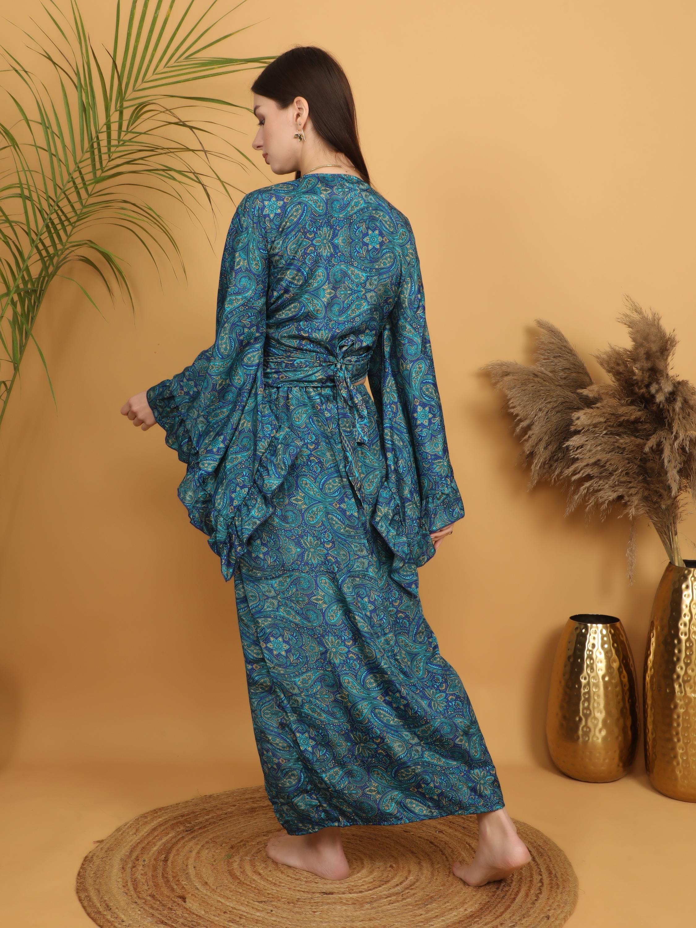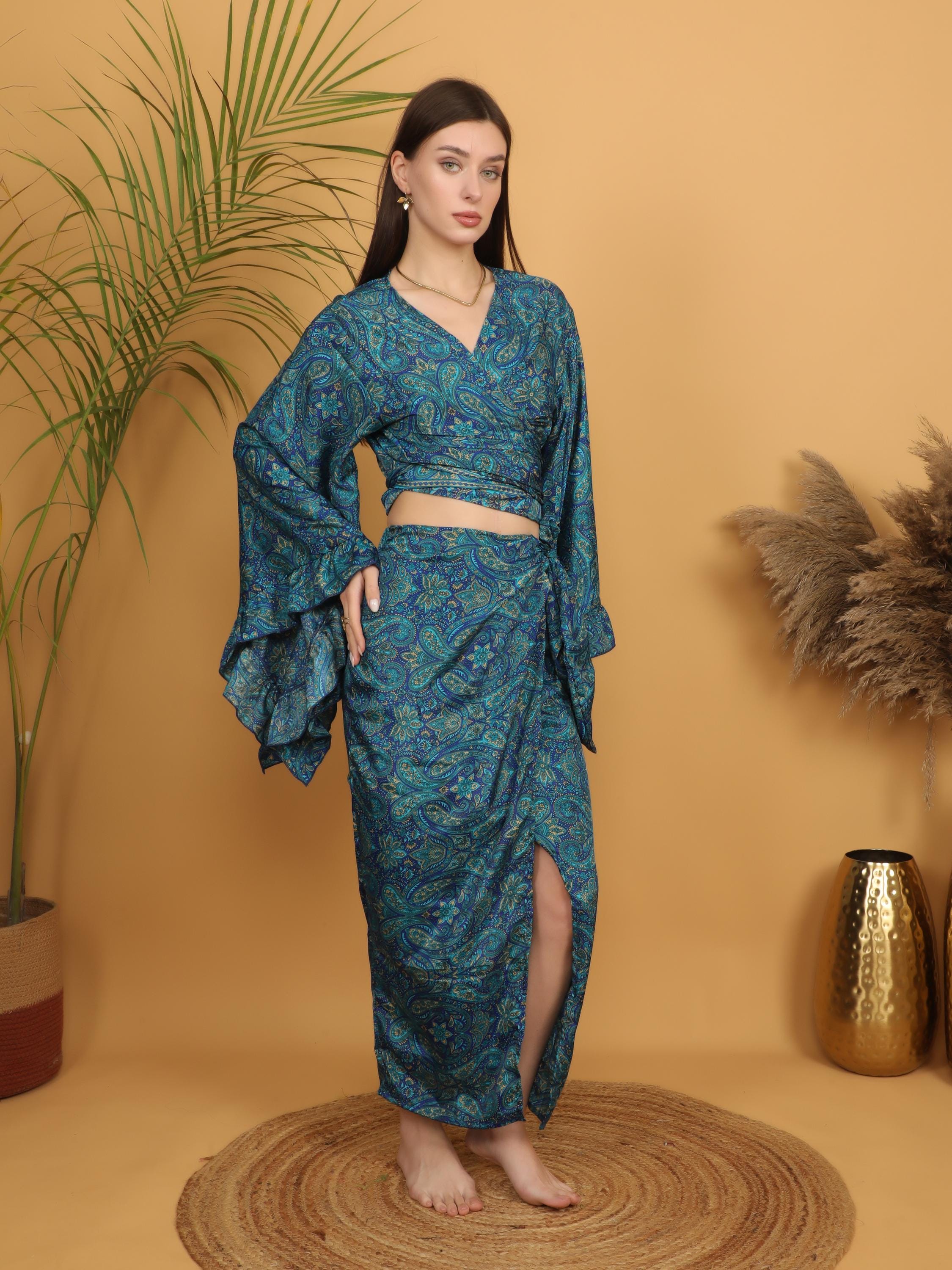 The intricate paisley motifs in layered blue tones bring depth and visual richness to the piece, making it an eye-catching addition to any boho wardrobe.