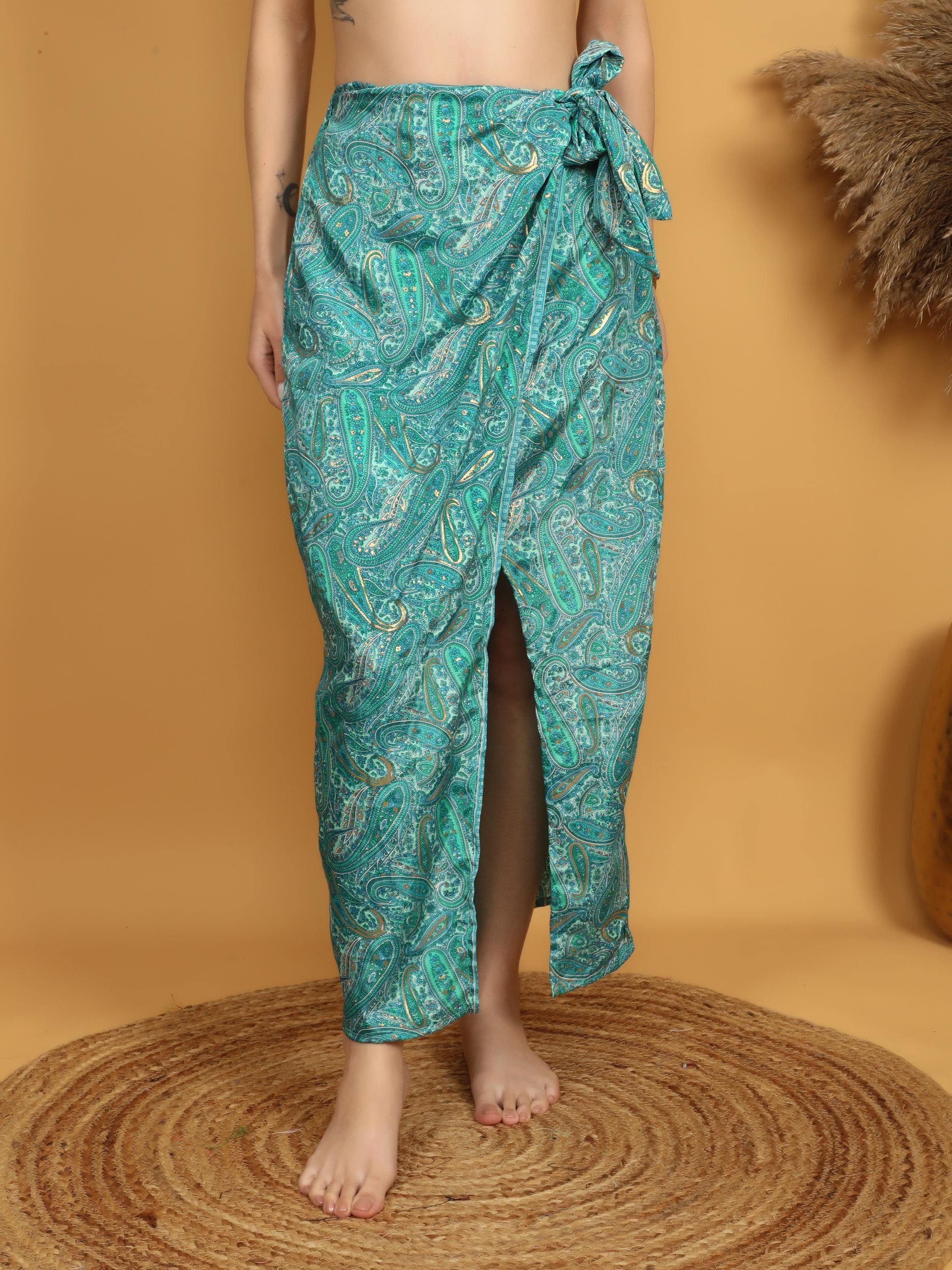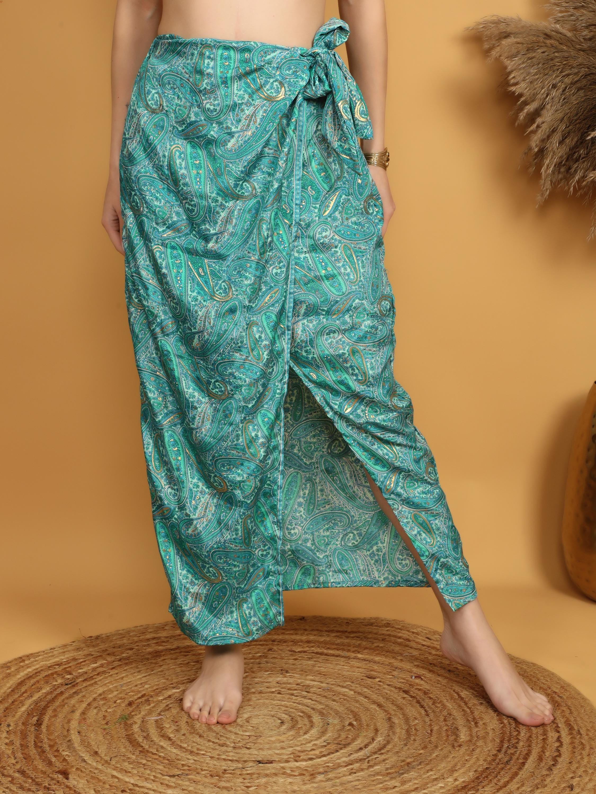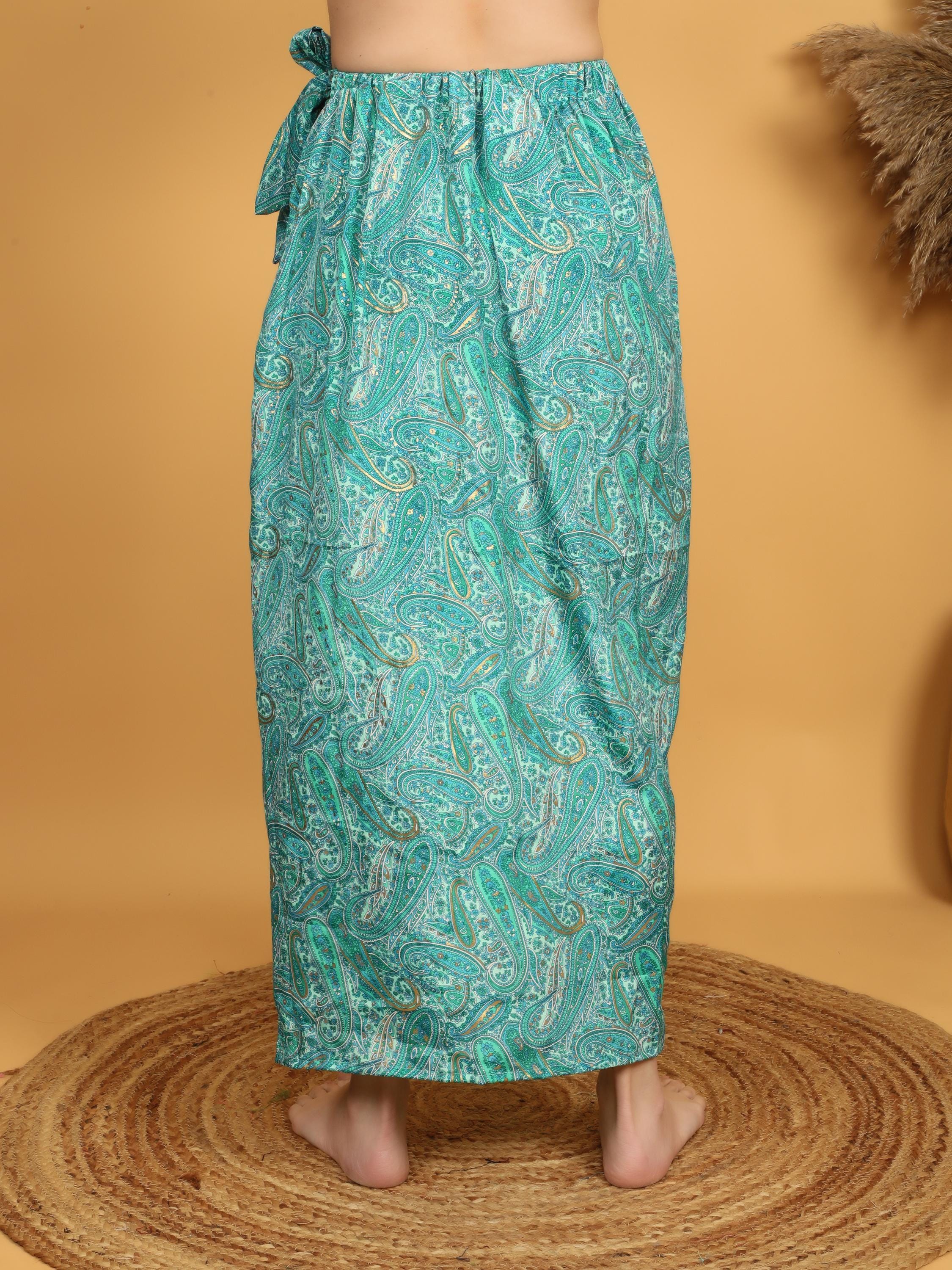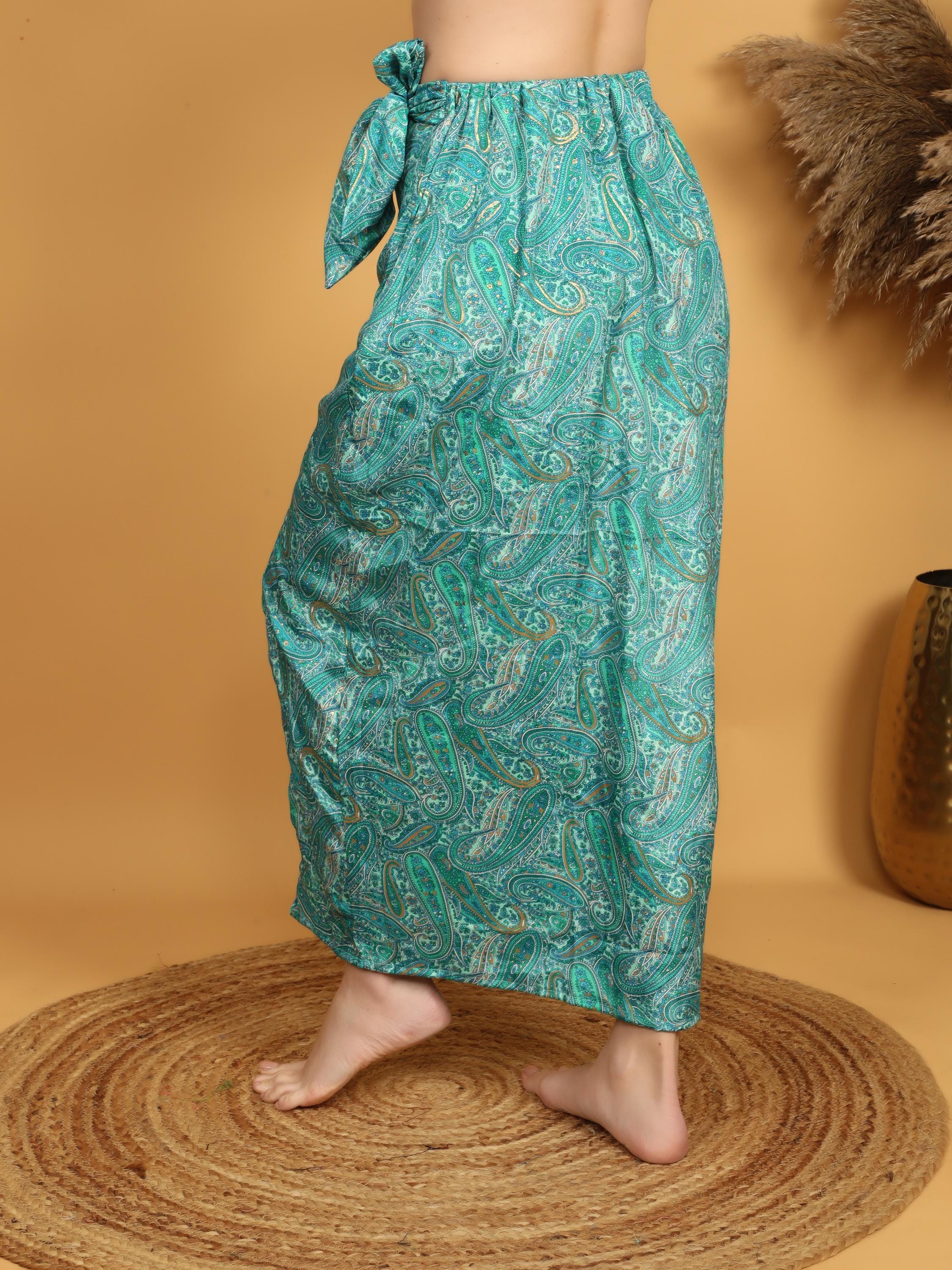 This flowing bohemian maxi skirt features a vibrant turquoise and green paisley print enhanced with delicate golden highlights that subtly illuminate the intricate pattern. The rich mix of teal, turquoise, and soft green tones creates a lively and artistic look inspired by traditional boho textiles.