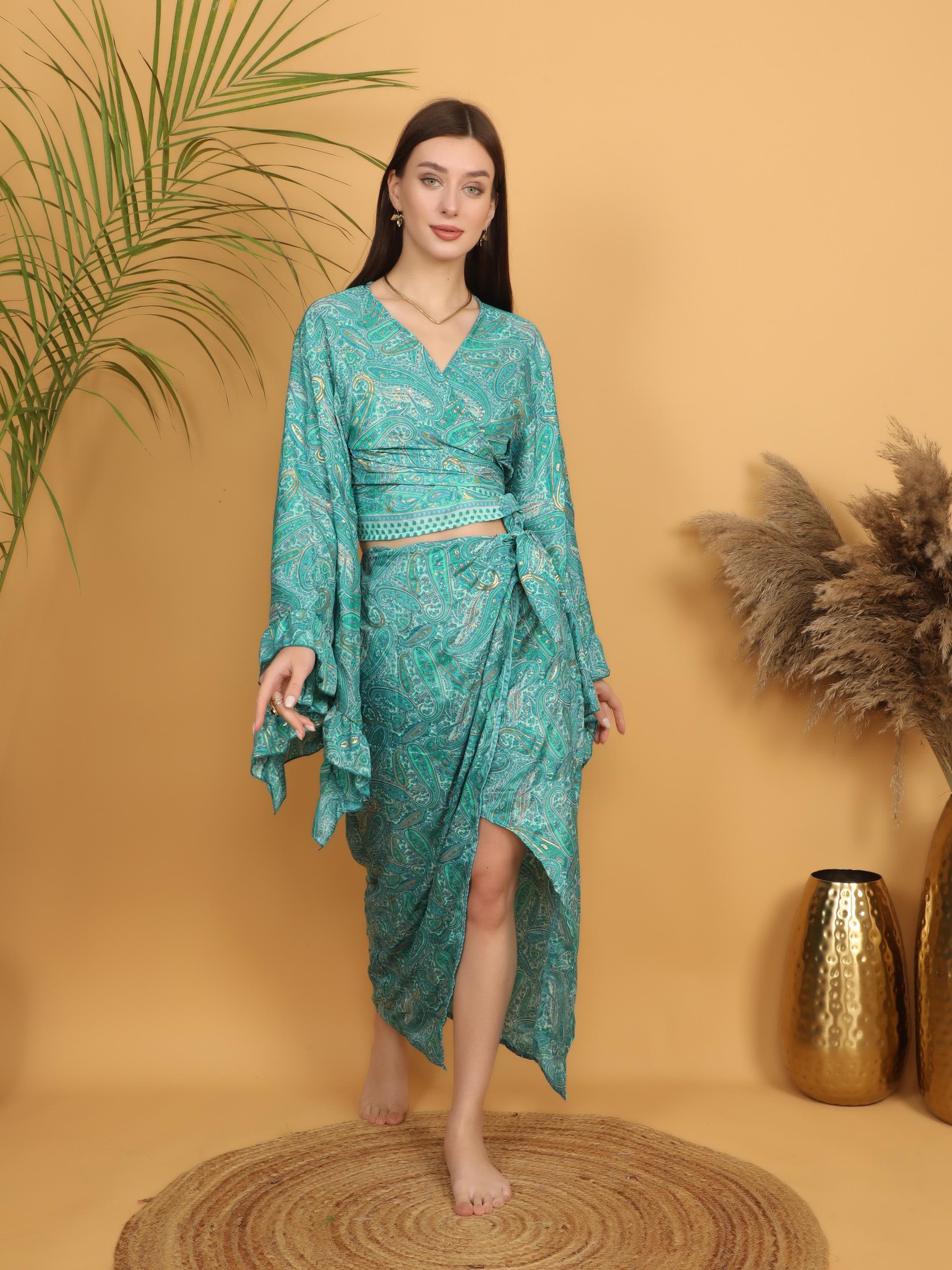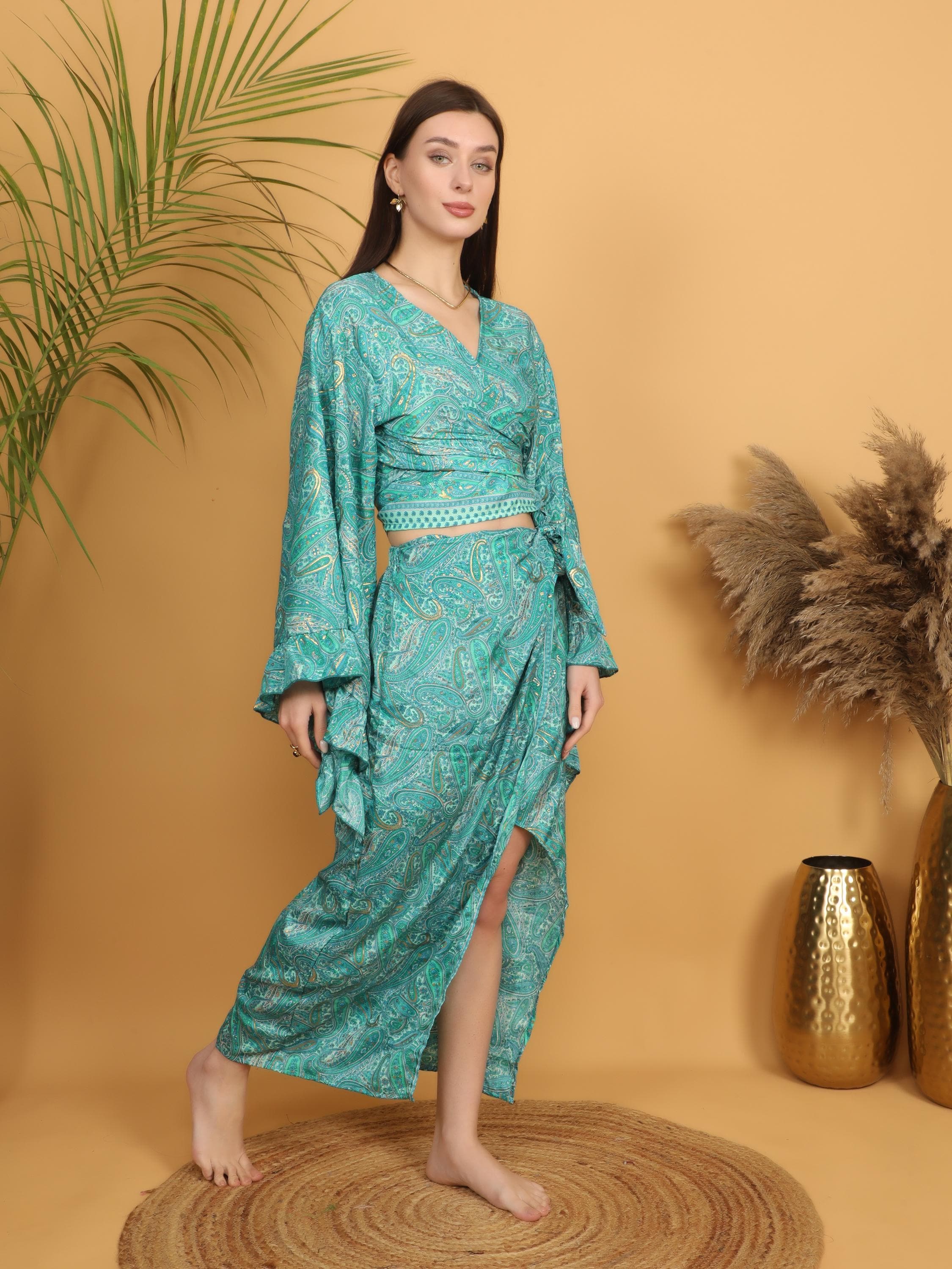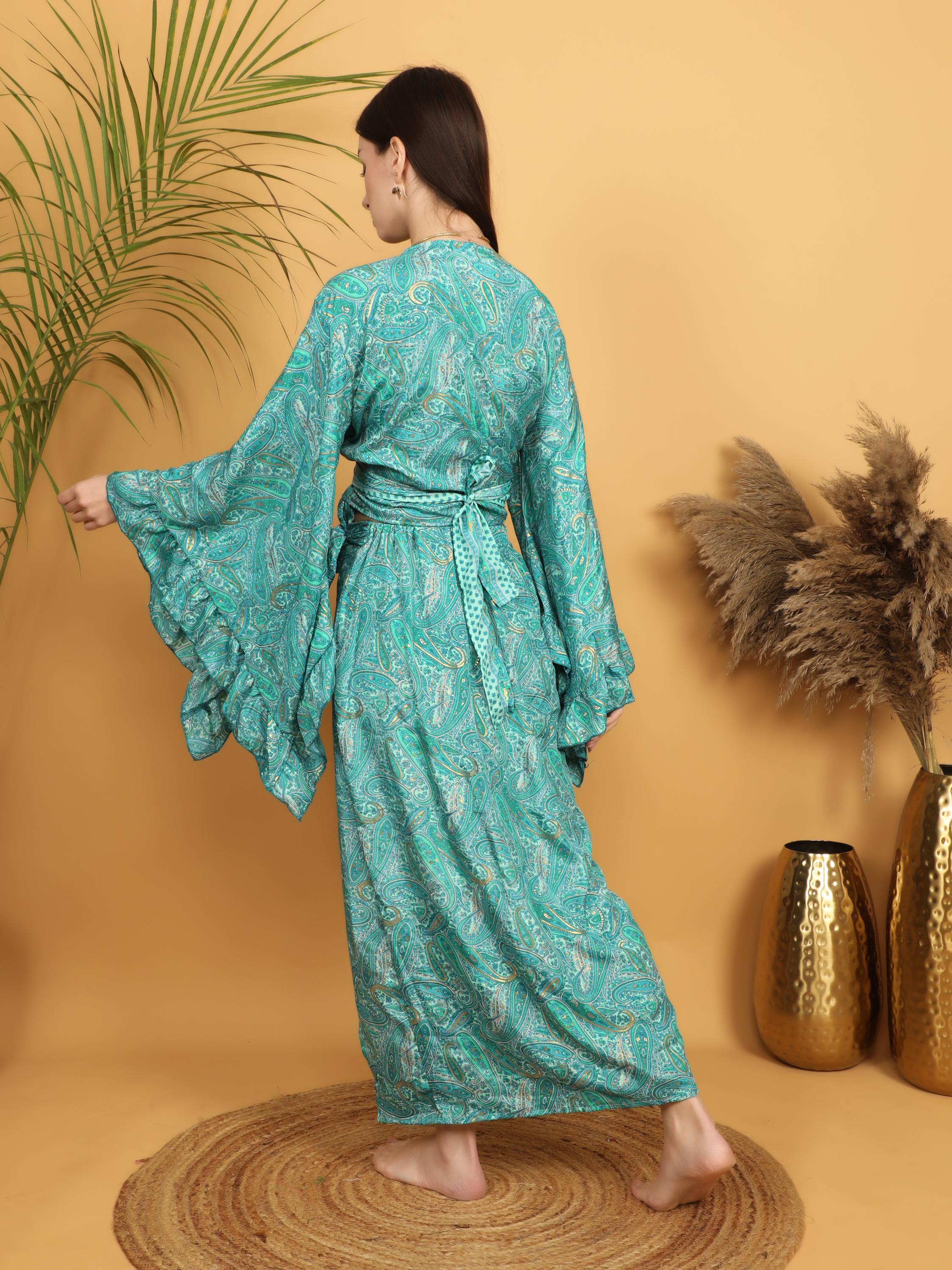 This flowing bohemian maxi skirt features a vibrant turquoise and green paisley print enhanced with delicate golden highlights that subtly illuminate the intricate pattern. The rich mix of teal, turquoise, and soft green tones creates a lively and artistic look inspired by traditional boho textiles.