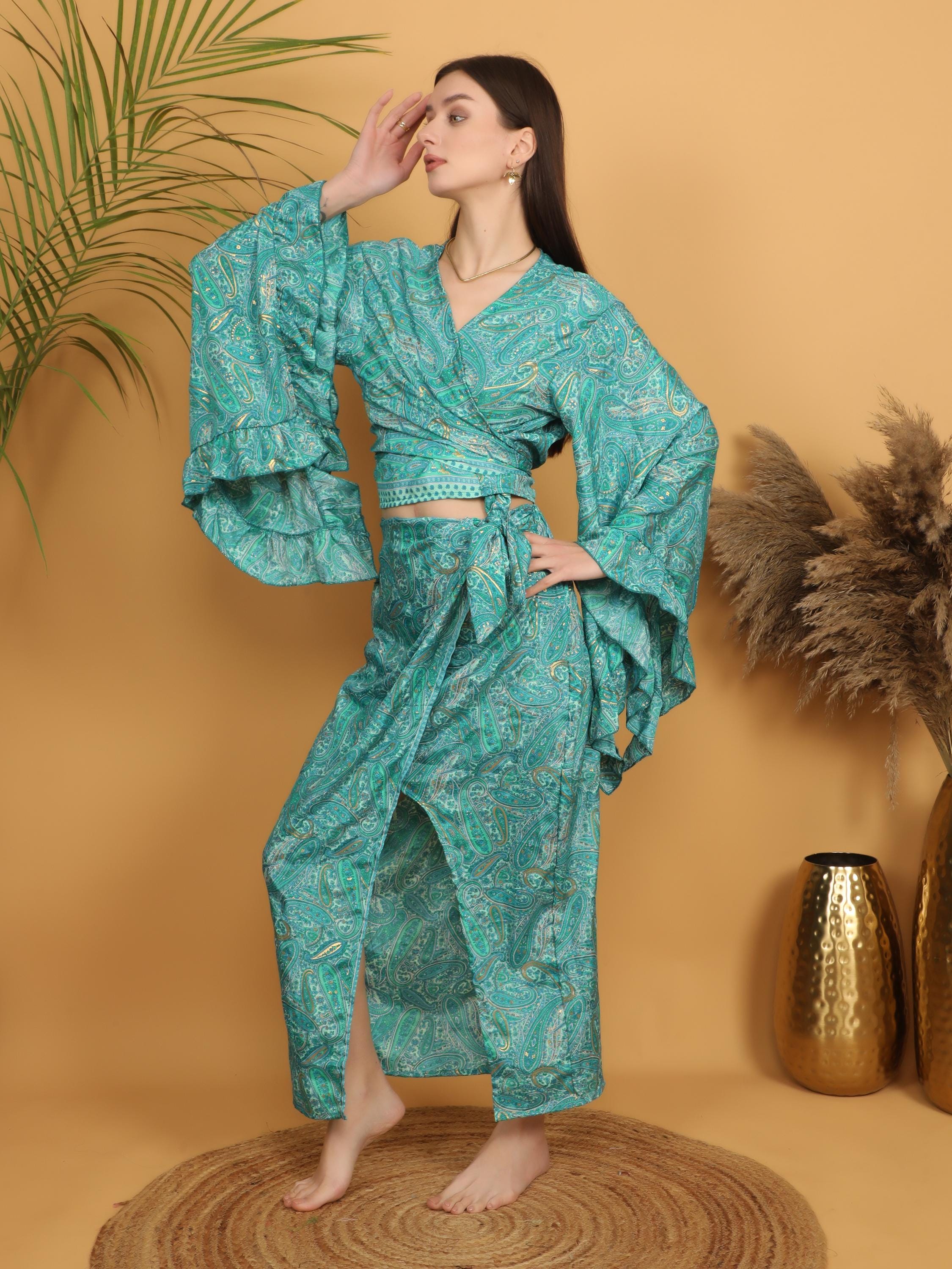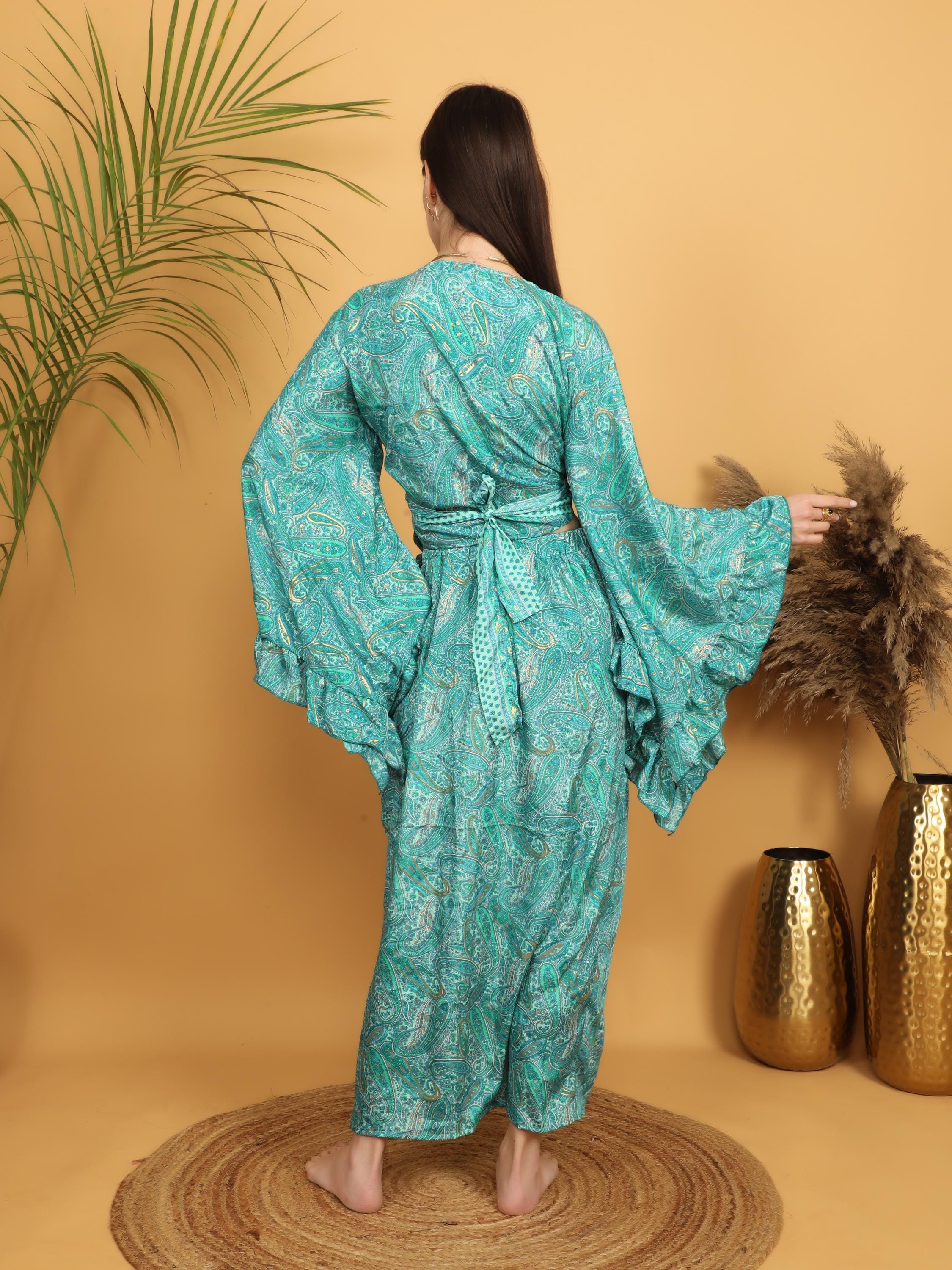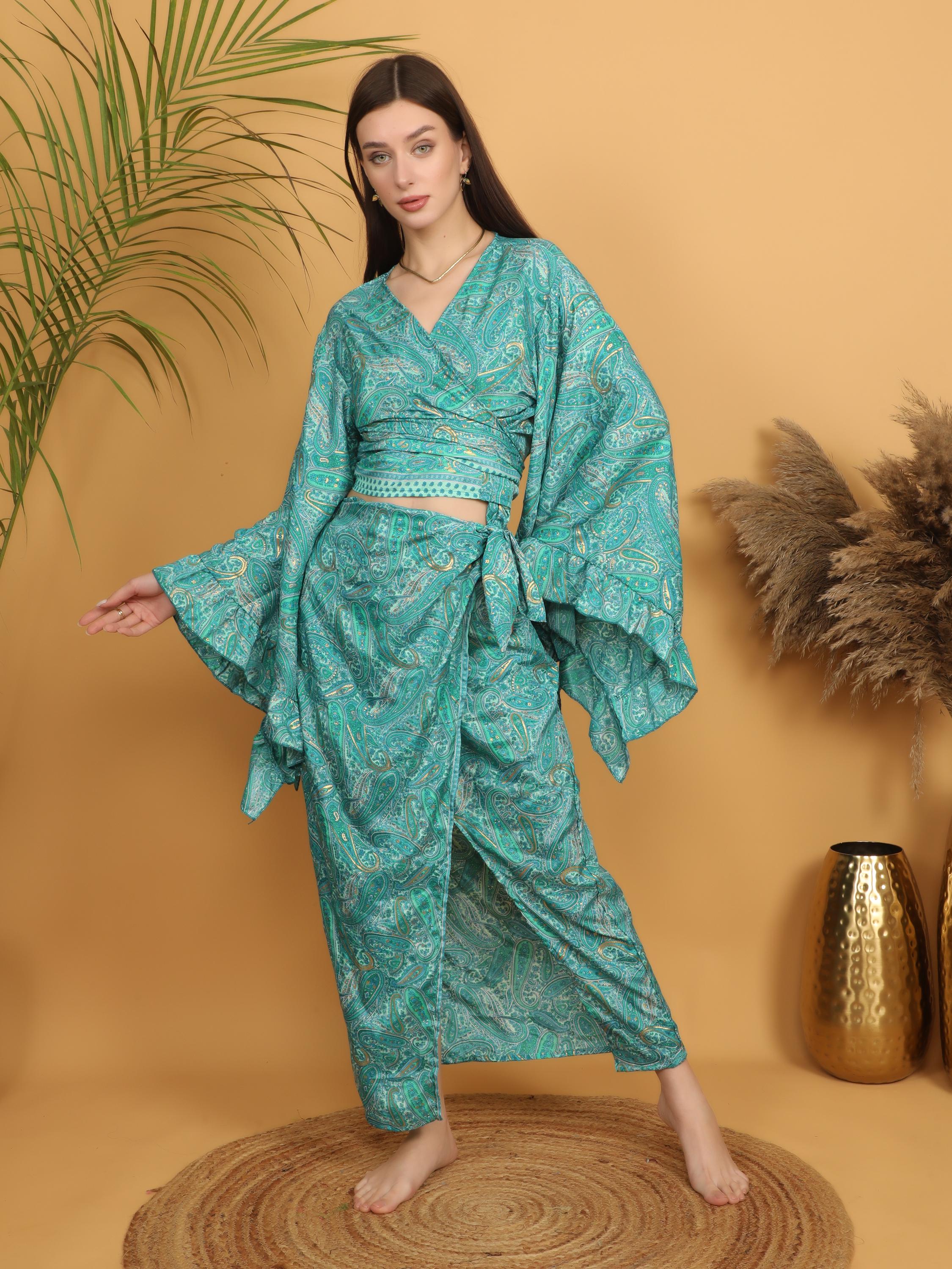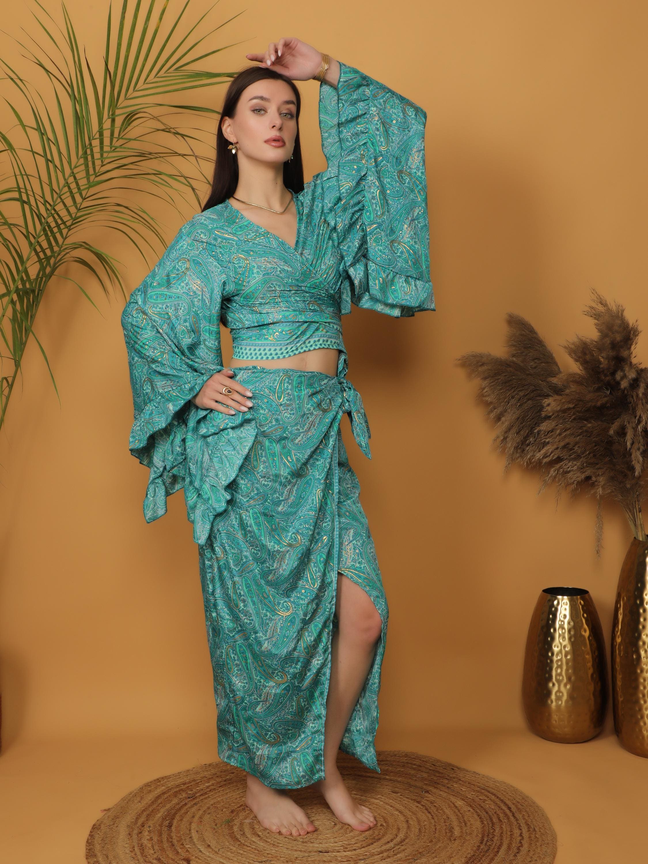 This flowing bohemian maxi skirt features a vibrant turquoise and green paisley print enhanced with delicate golden highlights that subtly illuminate the intricate pattern. The rich mix of teal, turquoise, and soft green tones creates a lively and artistic look inspired by traditional boho textiles.