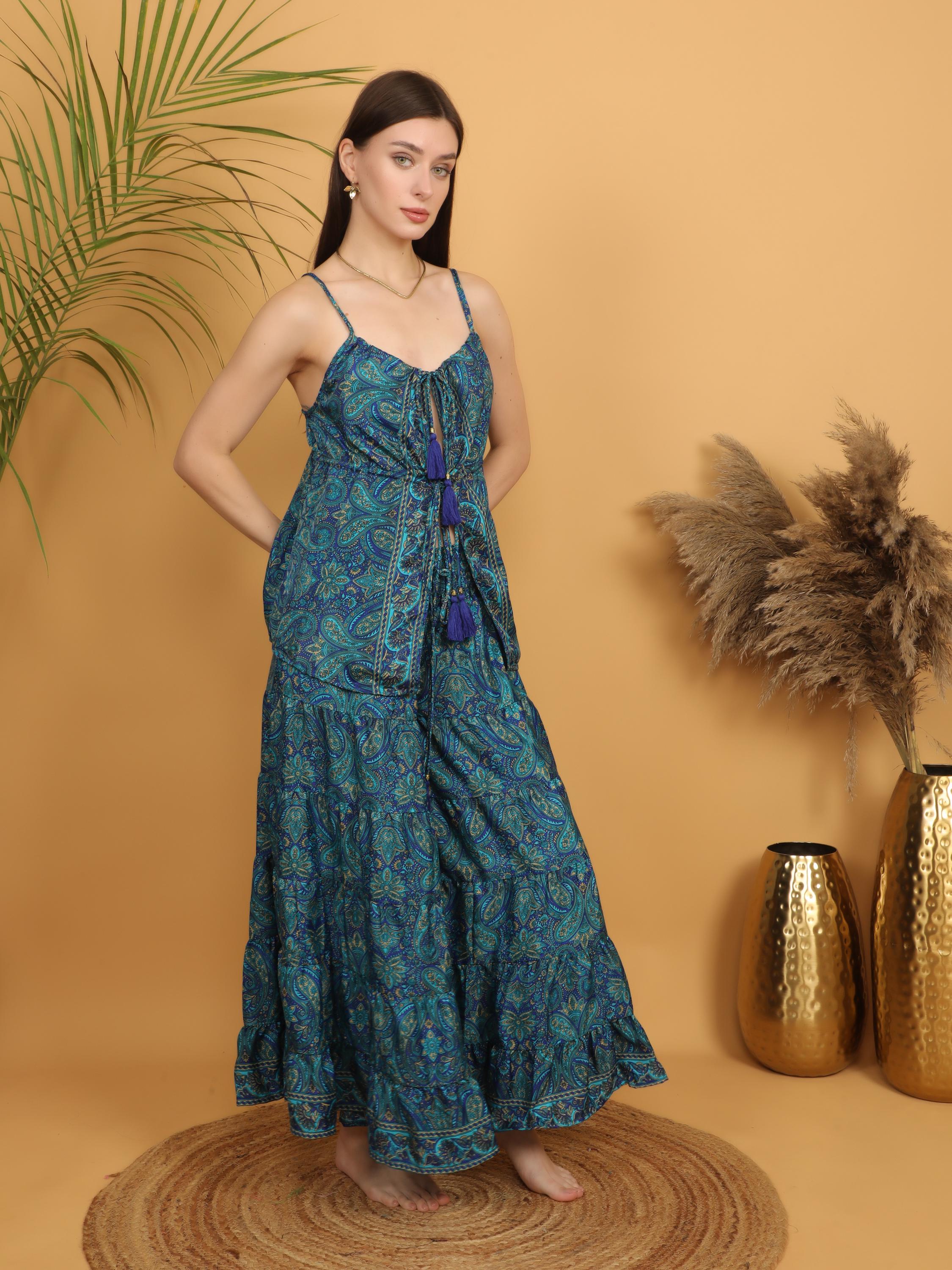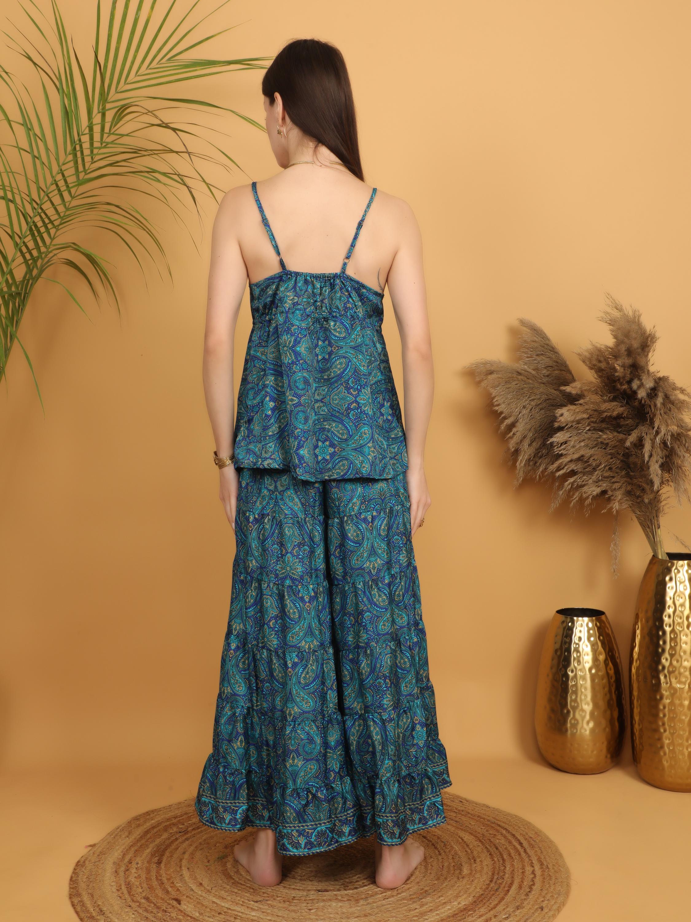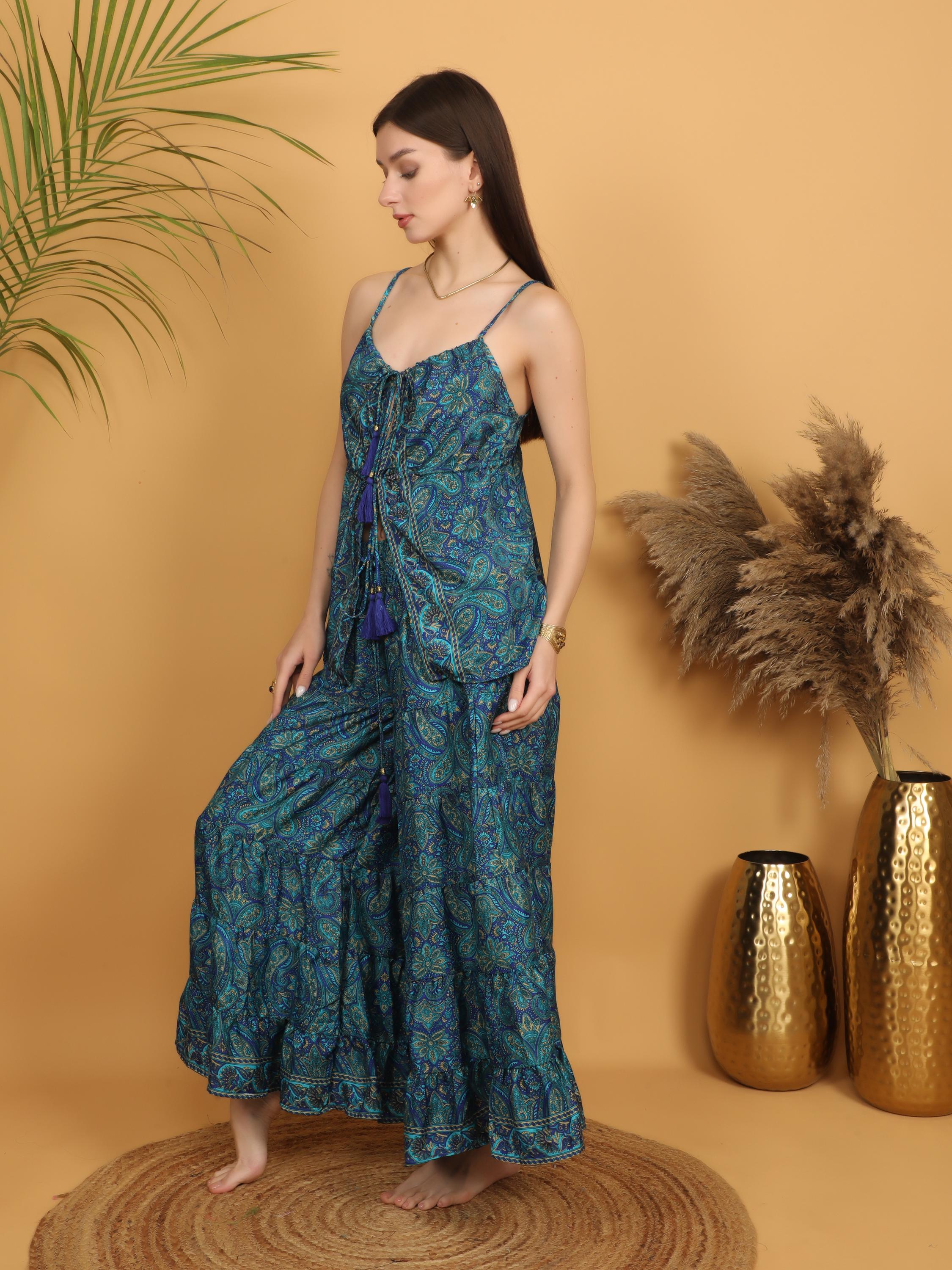 The beautiful paisley pattern combines rich shades of turquoise, teal, and deep blue, creating a vibrant textile design inspired by classic bohemian fashion. The lightweight flowing fabric drapes softly on the body and moves naturally, giving this top a relaxed and feminine silhouette.