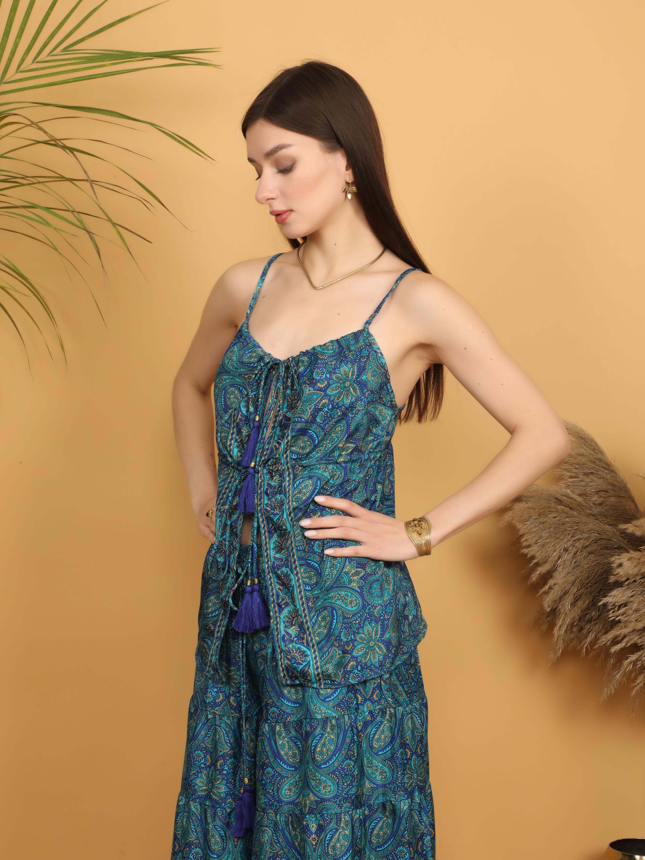 Boho paisley cami top for women featuring an elegant turquoise paisley print, delicate spaghetti straps, and adjustable tassel ties for a customizable fit. This relaxed bohemian camisole blends comfort and style, making it a perfect piece for effortless boho outfits.