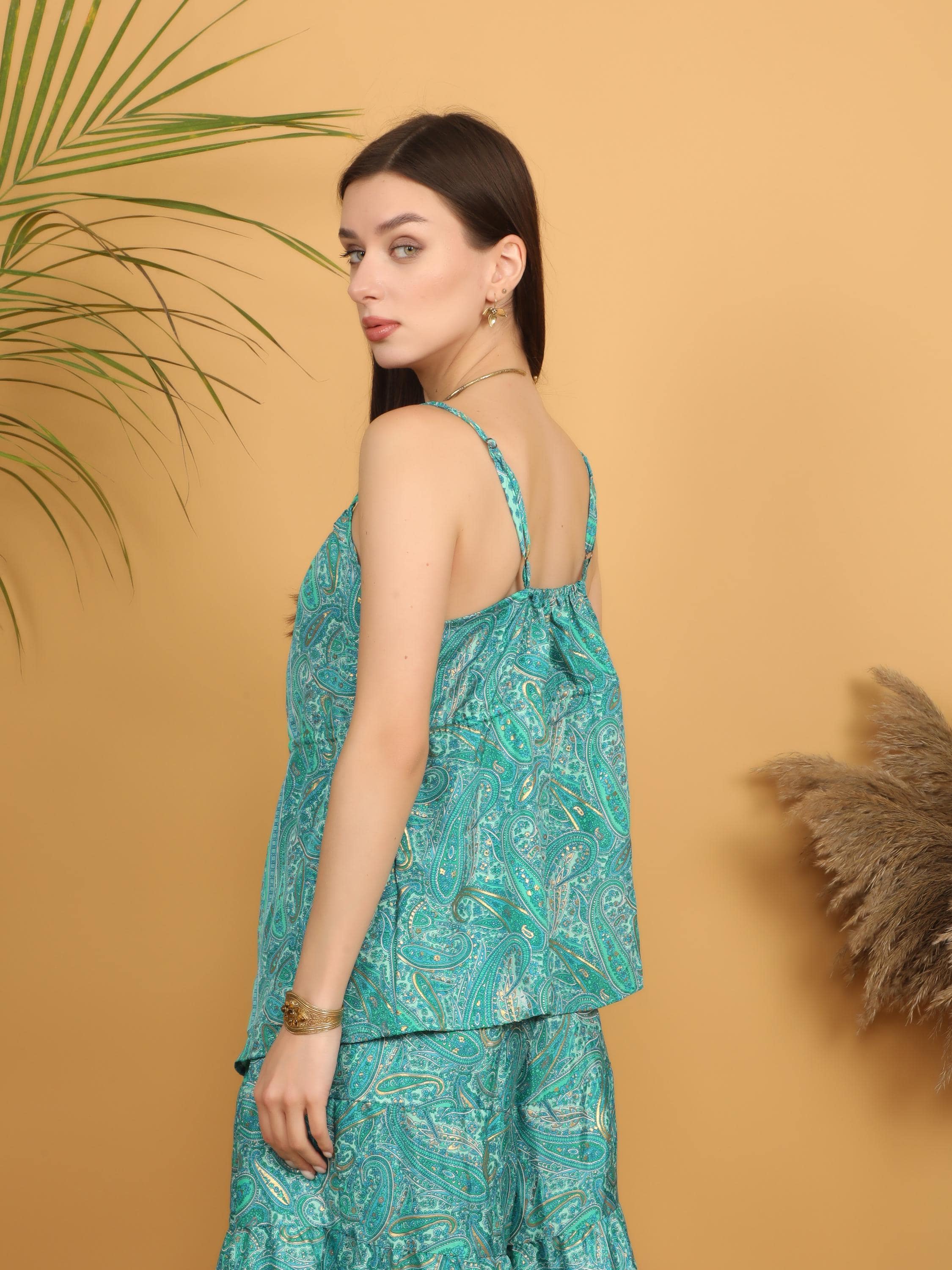 The panelled print design mixes intricate paisley motifs with small geometric patterns, creating visual depth and a rich textile character. The turquoise tones combined with the gold highlighted accents give the top a vibrant yet elegant bohemian aesthetic.